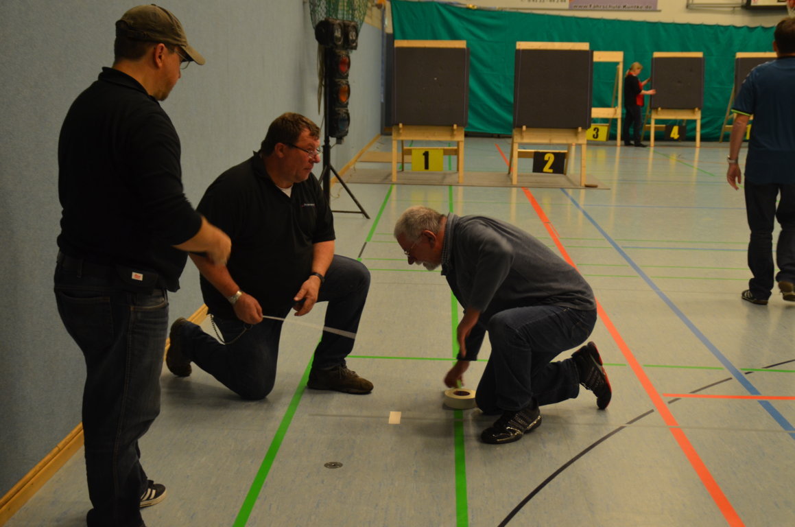 Vorbereitung zur Meisterschaft Die große Halle der KGST in Tornesch hatten wir für diese Meisterschaft gebucht. So galt es am Vortag der Meisterschaft diese Halle mit den erforderlichen 27 Scheiben samt Ständern, dem Sicherheits-Fangnetz, der Ampelanlage usw. ... auszustatten. |