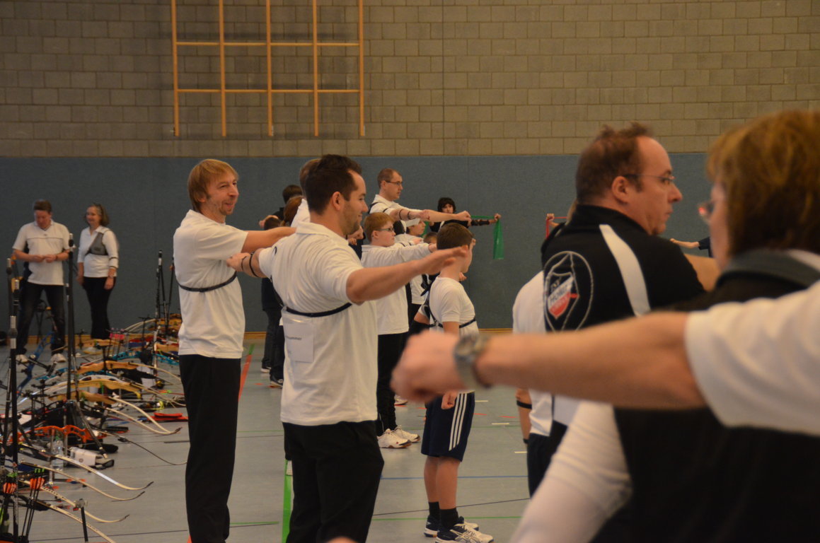 Jörn und Jan sahen sich jeden Bogen und das Zubehör wie z.B. die Pfeile an, ob auch alles regelkonform ist. Alke Windel, Trainerin vom TSV Holm übernahm das Kommando für das gemeinsame Aufwärmen in großer Runde. Die Jugend und ein Teil der erwachsenen Schützen machten mit. |