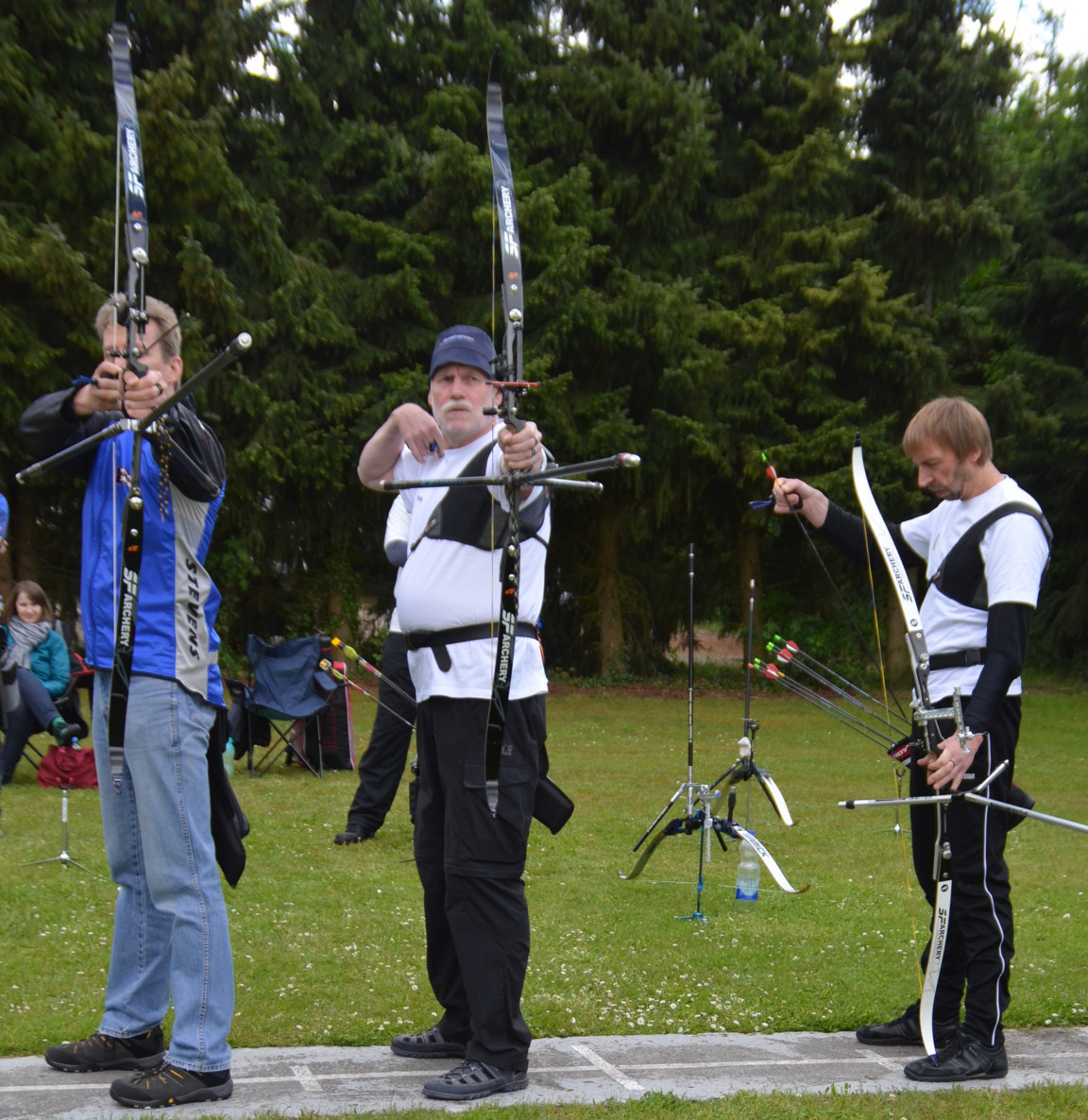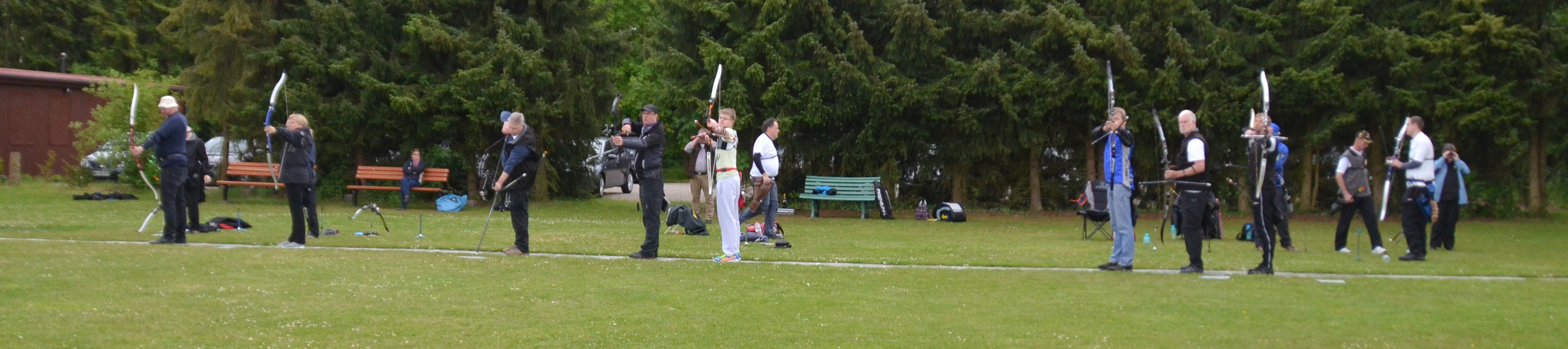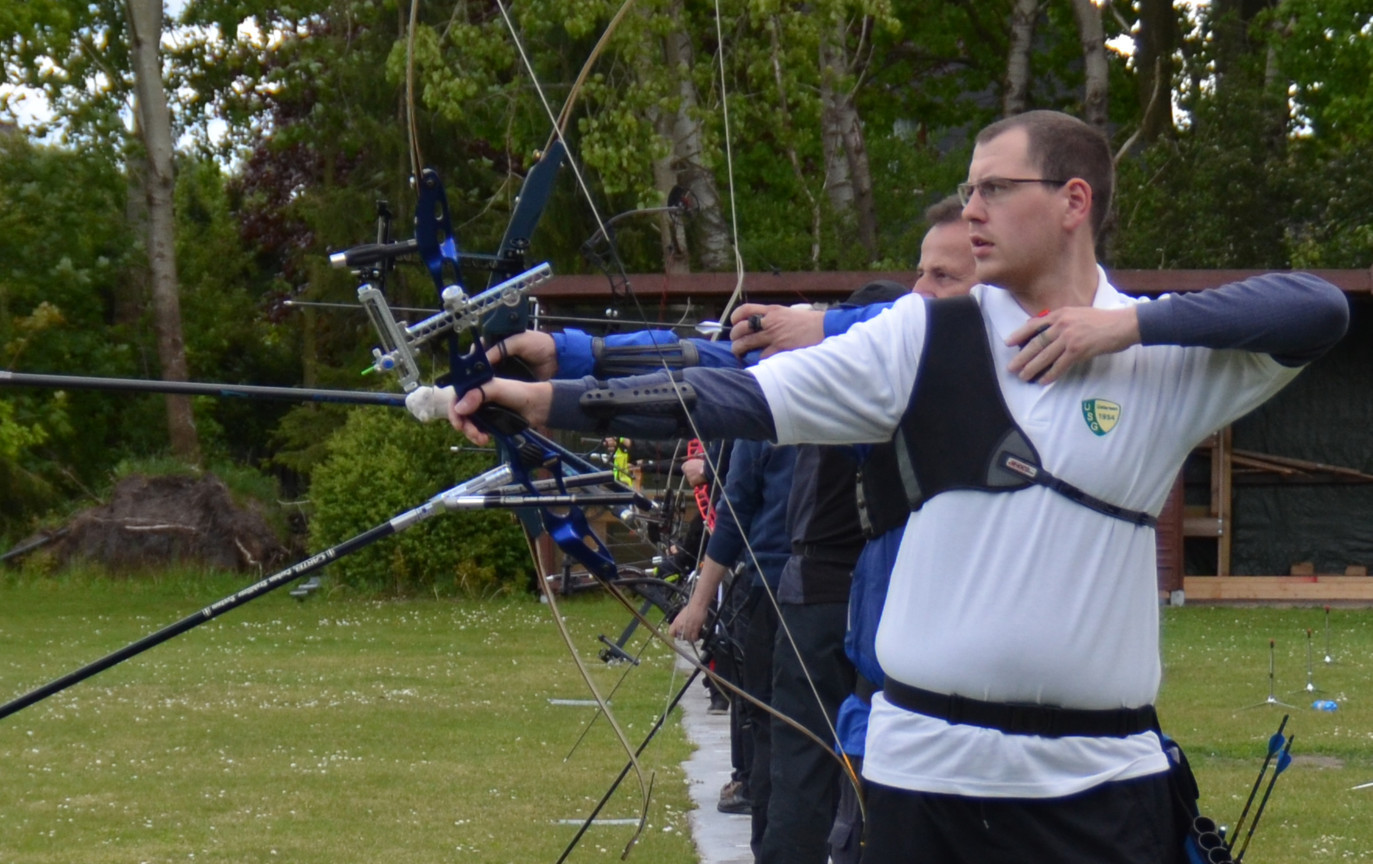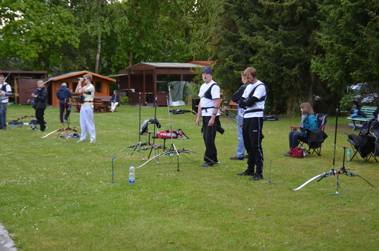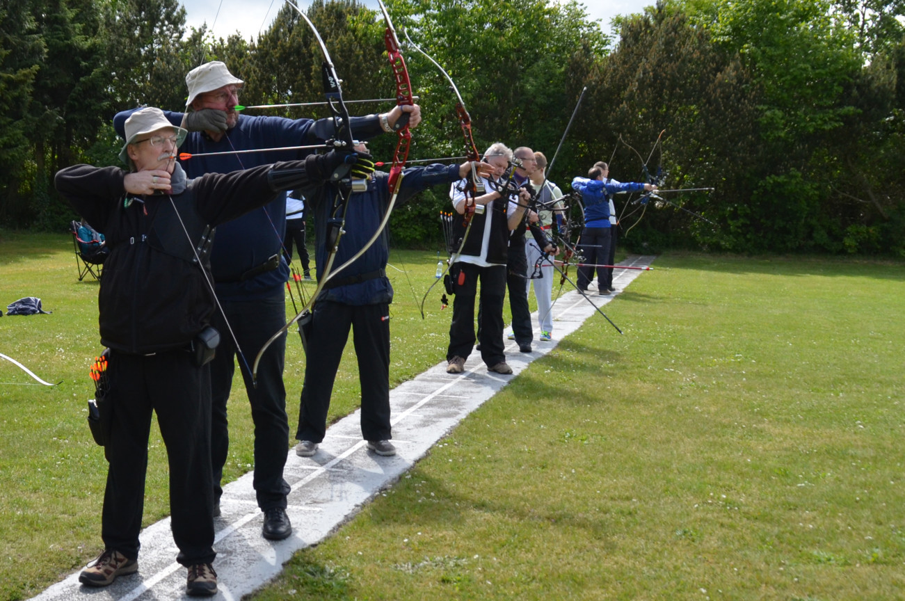 Peter V. und Manfred Sch. versuchen sich mal als Blankschützen, um an der VM teilnehmen zu können, obwohl sie eigentlich Compound- bzw. Recurve-Schützen sind.