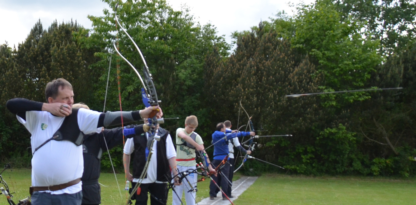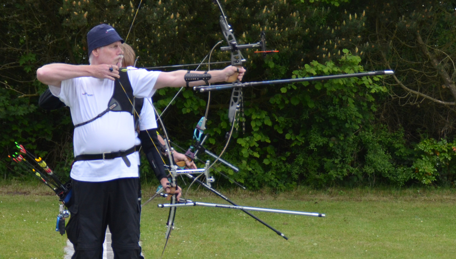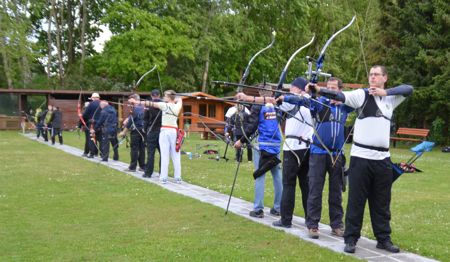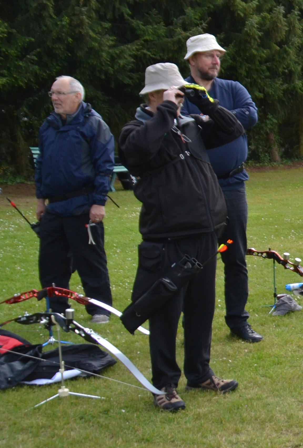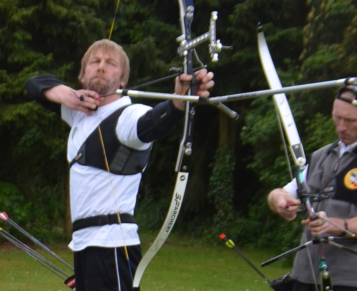 Peter V. und Manfred Sch. versuchen sich mal als Blankschützen, um an der VM teilnehmen zu können, obwohl sie eigentlich Compound- bzw. Recurve-Schützen sind.