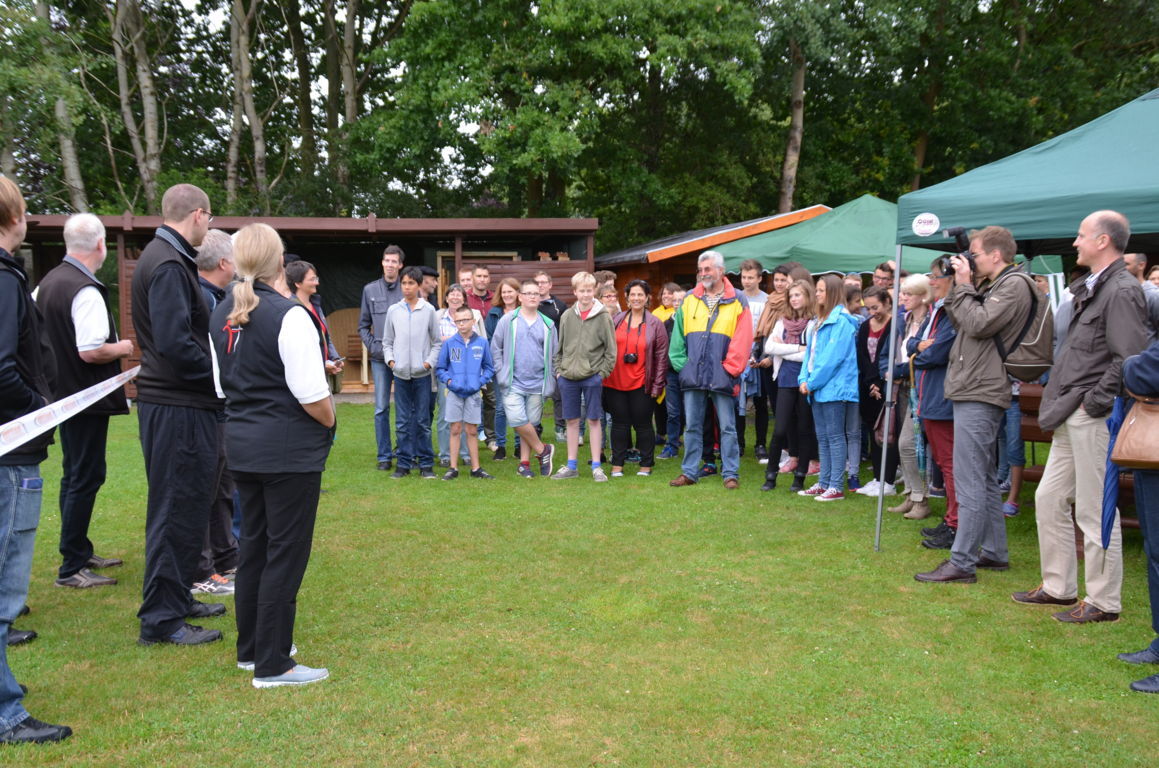 Mit einem herzlichen 'Bonjour' konnte Sonntag, den 19. Juli 2015, Thomas Pingel nachmittags 67 Franzosen aus dem Dorf Challes im nordwestlichen Frankreich auf unserer Bogensportanlage begrüßen. Etliche Heidgrabenern begleiteten die französischen Gäste, die erst am Vormittag angereist waren. Im Rahmen einer Städtepartnerschaft zwischen Challes und Heidgraben finden regelmäßig gegenseitige Besuche statt. Die Gastgeber organisieren für diese Besuchswoche ein abwechslungsreiches Programm, das wir mit dem Bogenschießen-Kennenlernen gerne unterstützt haben. |