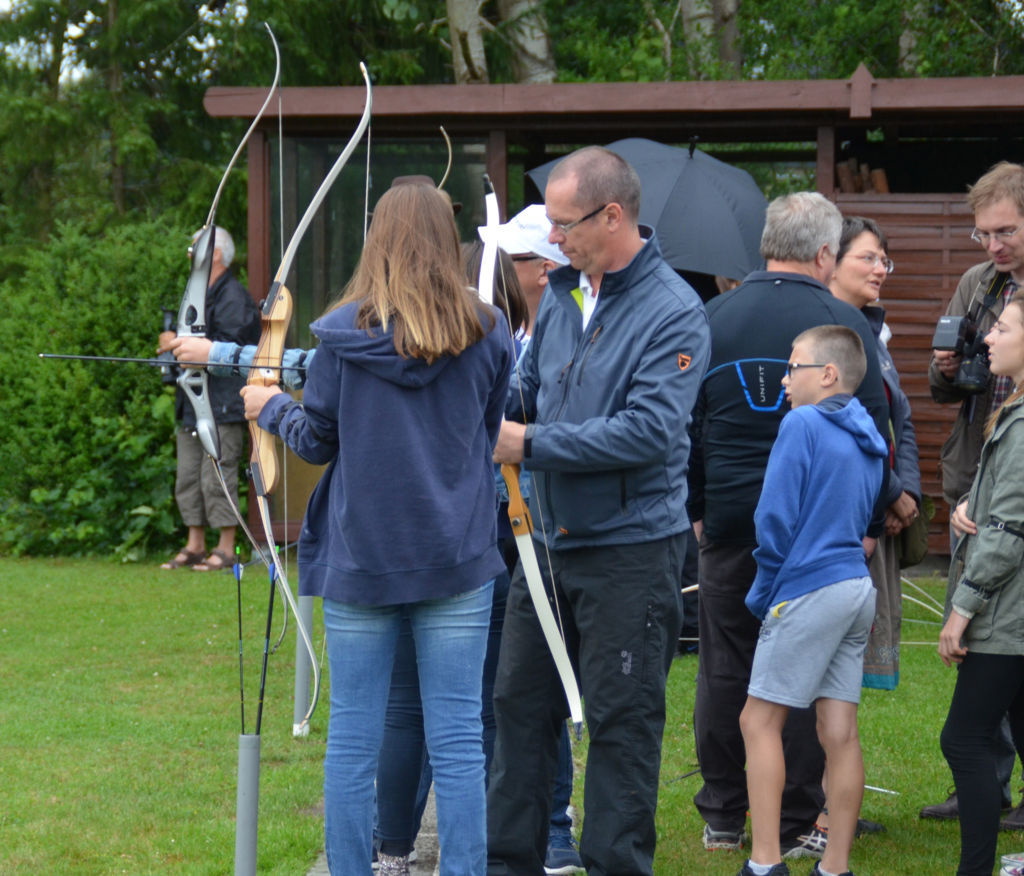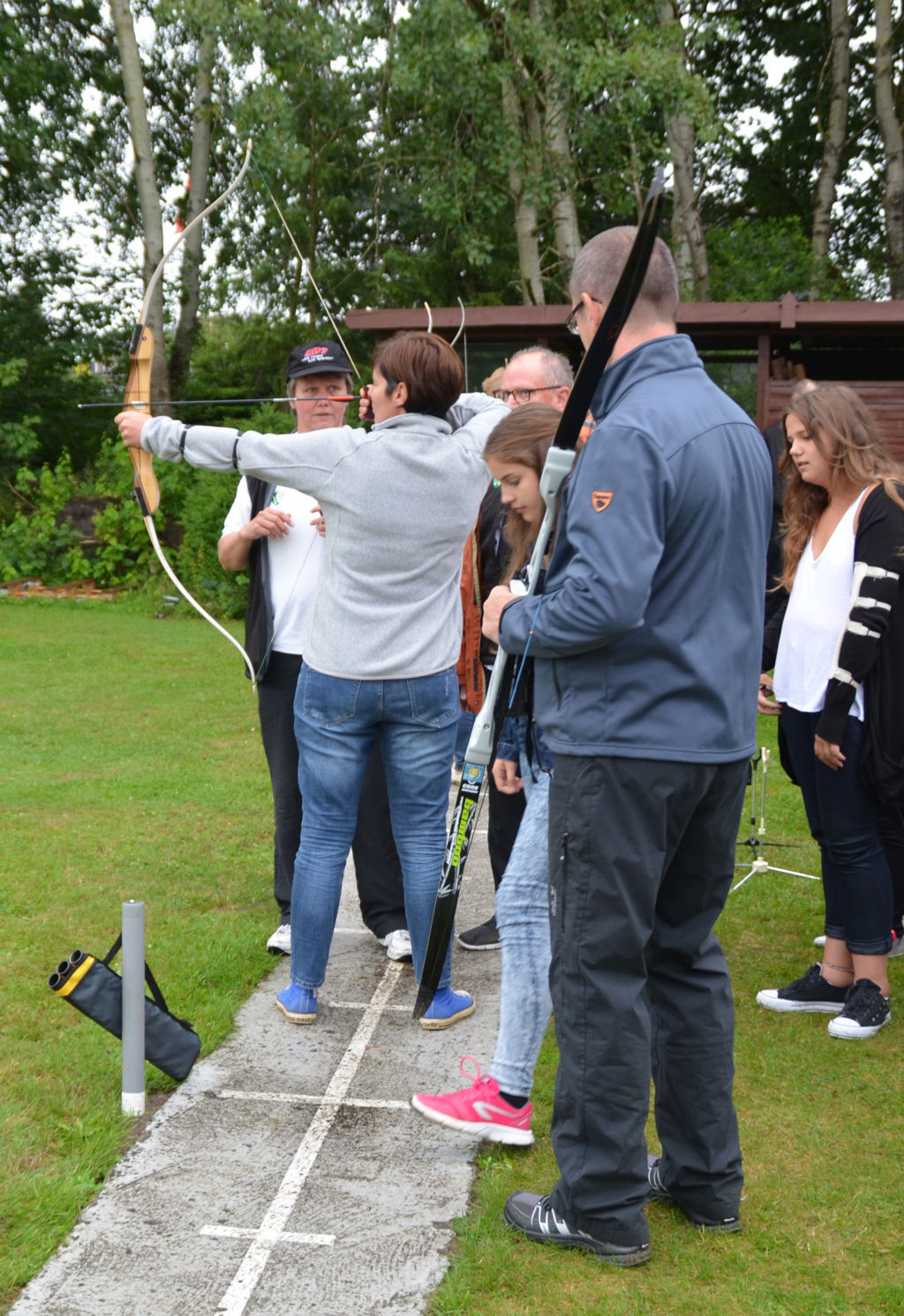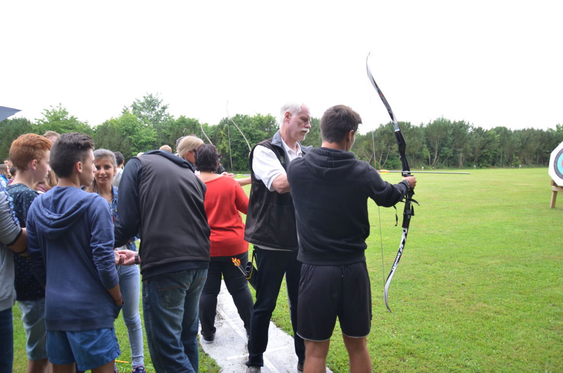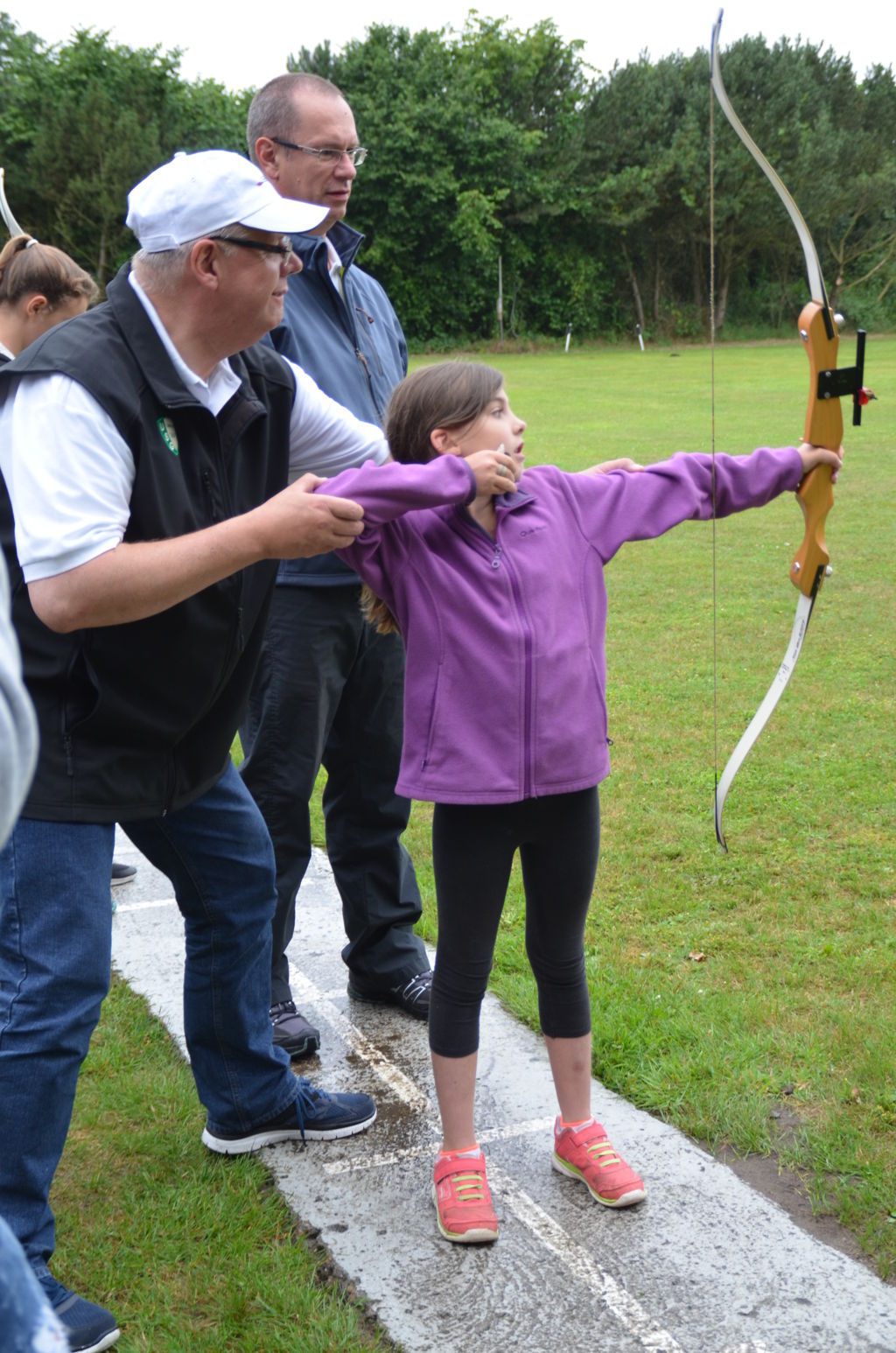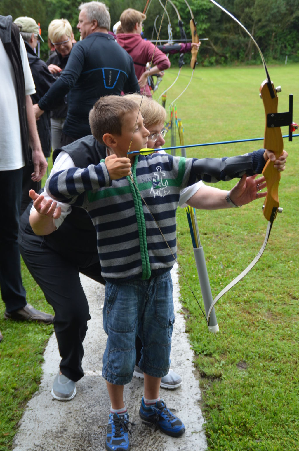 Auf die Frage, wer nicht das Bogenschießen probieren will, meldete sich kaum einer. So konnte Jeder, ob Klein oder Groß, mal sein Geschick unter Beweis stellen. |