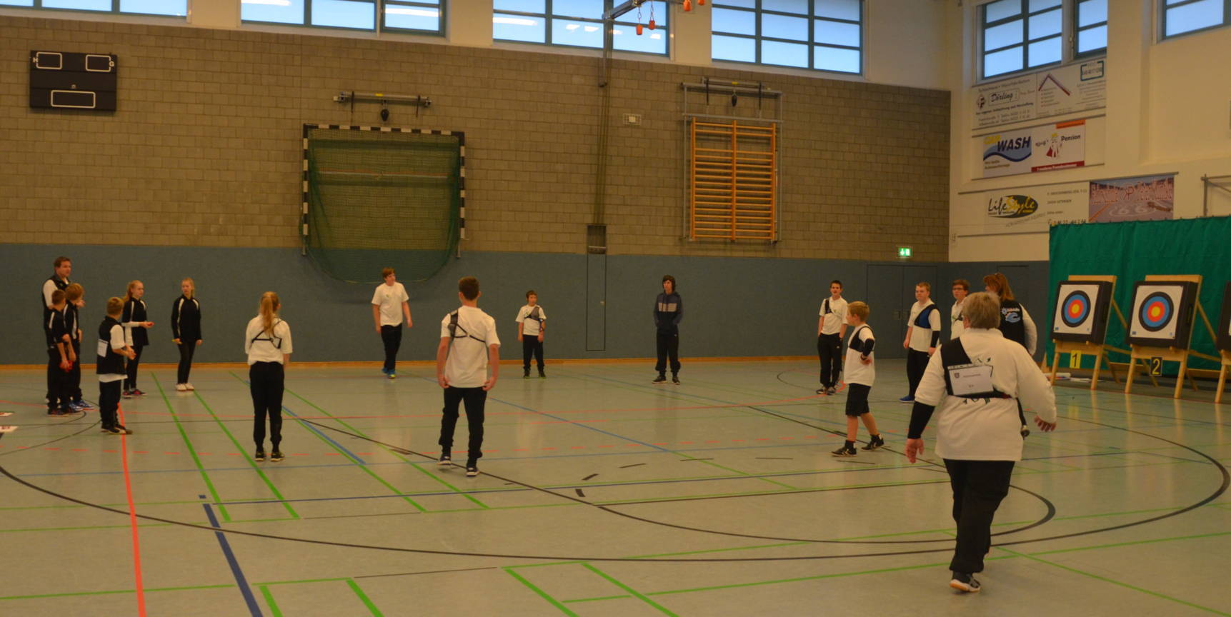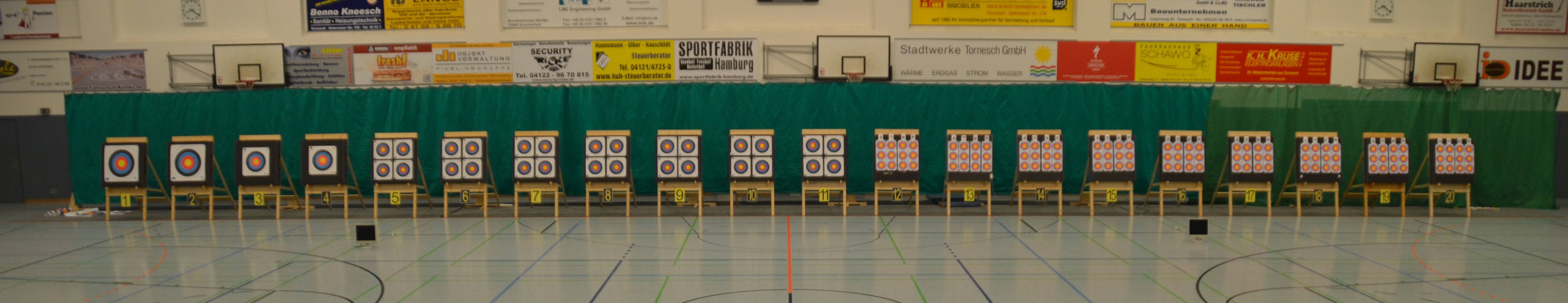 Bereits am Vortag war die Halle vorbereitet und 20 Ständer und Scheiben, Netze usw. aus unserer Trainingshalle und der Bogenhütte herübergebracht worden. Alles war ausgerichtet und die Schießlinie abgeklebt worden. Als Ampelanlage sollte uns eine neue Technik helfen, die der TSV Holm zur Verfügung stellte.