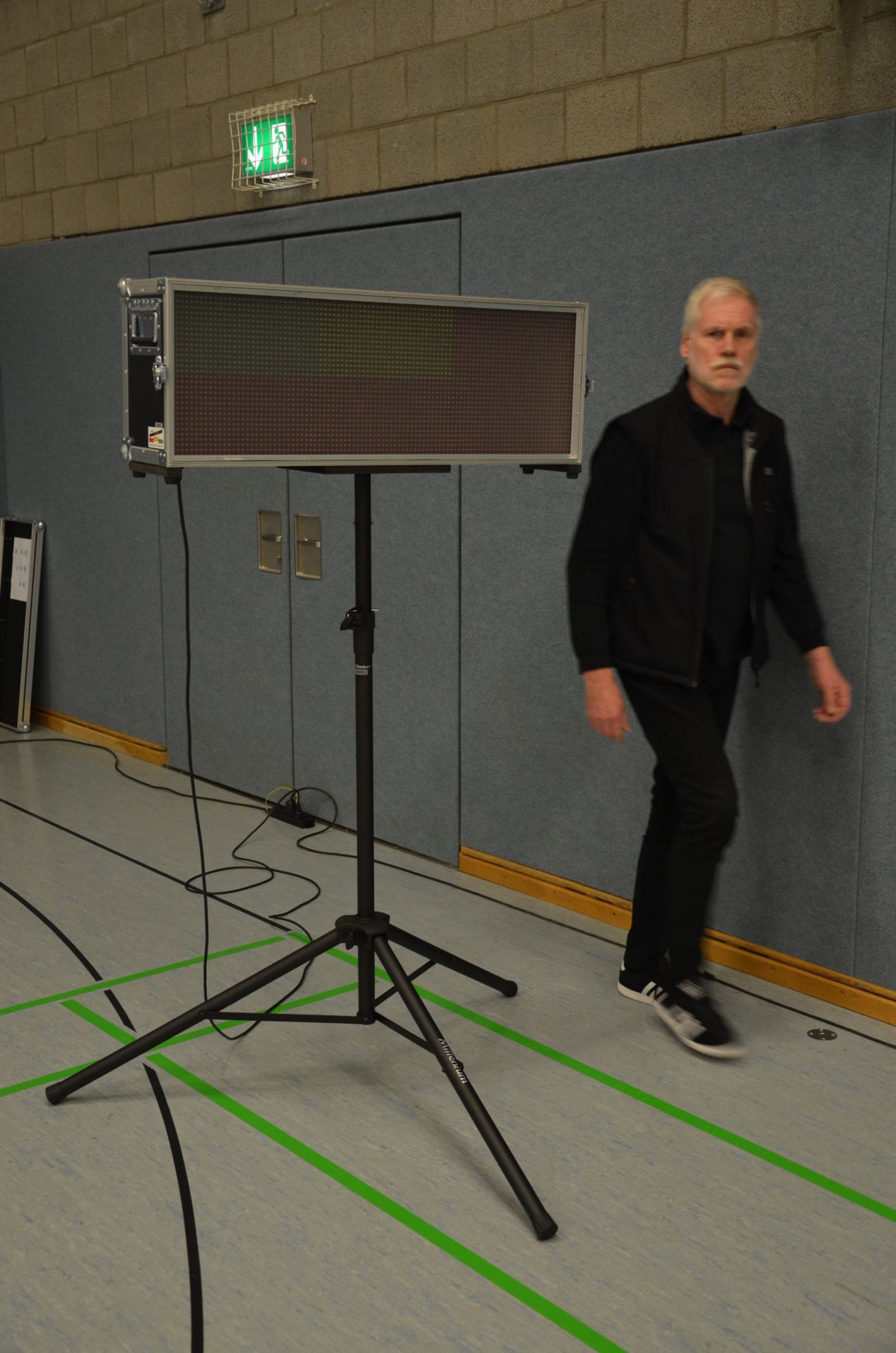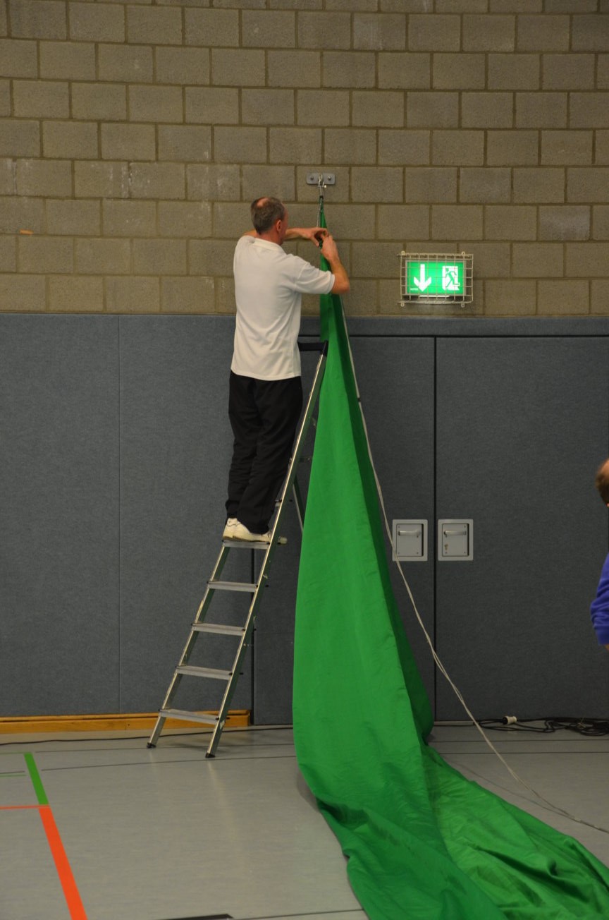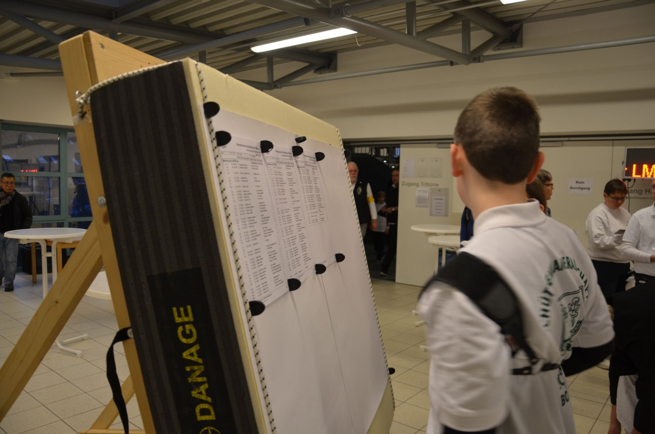Neben den zwei Ampeln in der Halle selber hatten wir die dritte Ampel im Vorraum aufgestellt. Dort konnte mittels Lauftexte Informationen zur Begrüßung, die Dauer der Pause usw. angezeigt werden. Zum frühen Abend erfolgte die Abnahme des Aufbaues durch die Kampfrichter. |