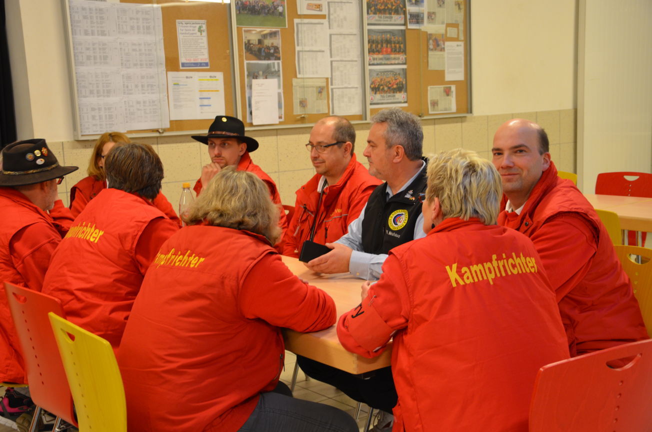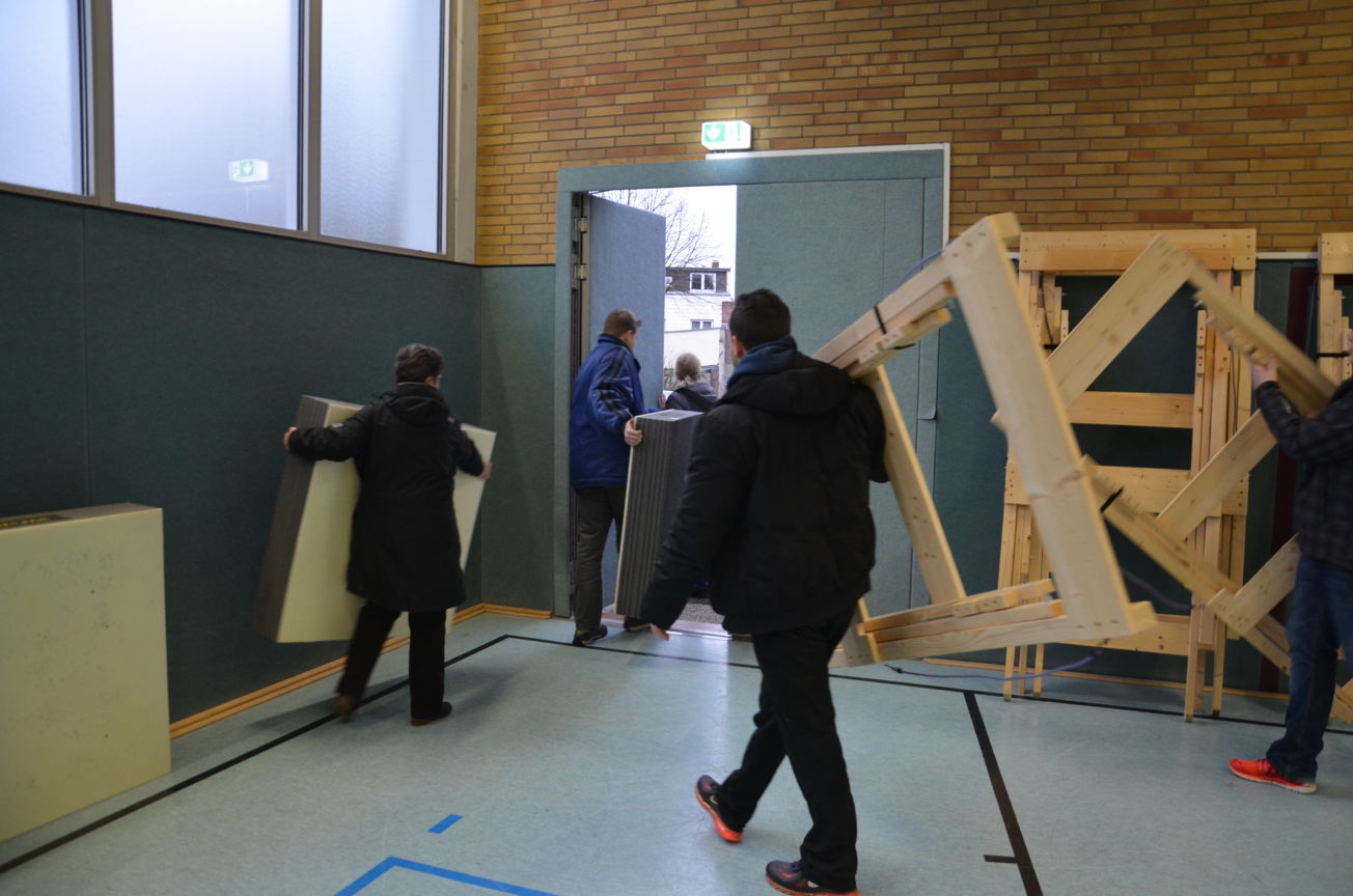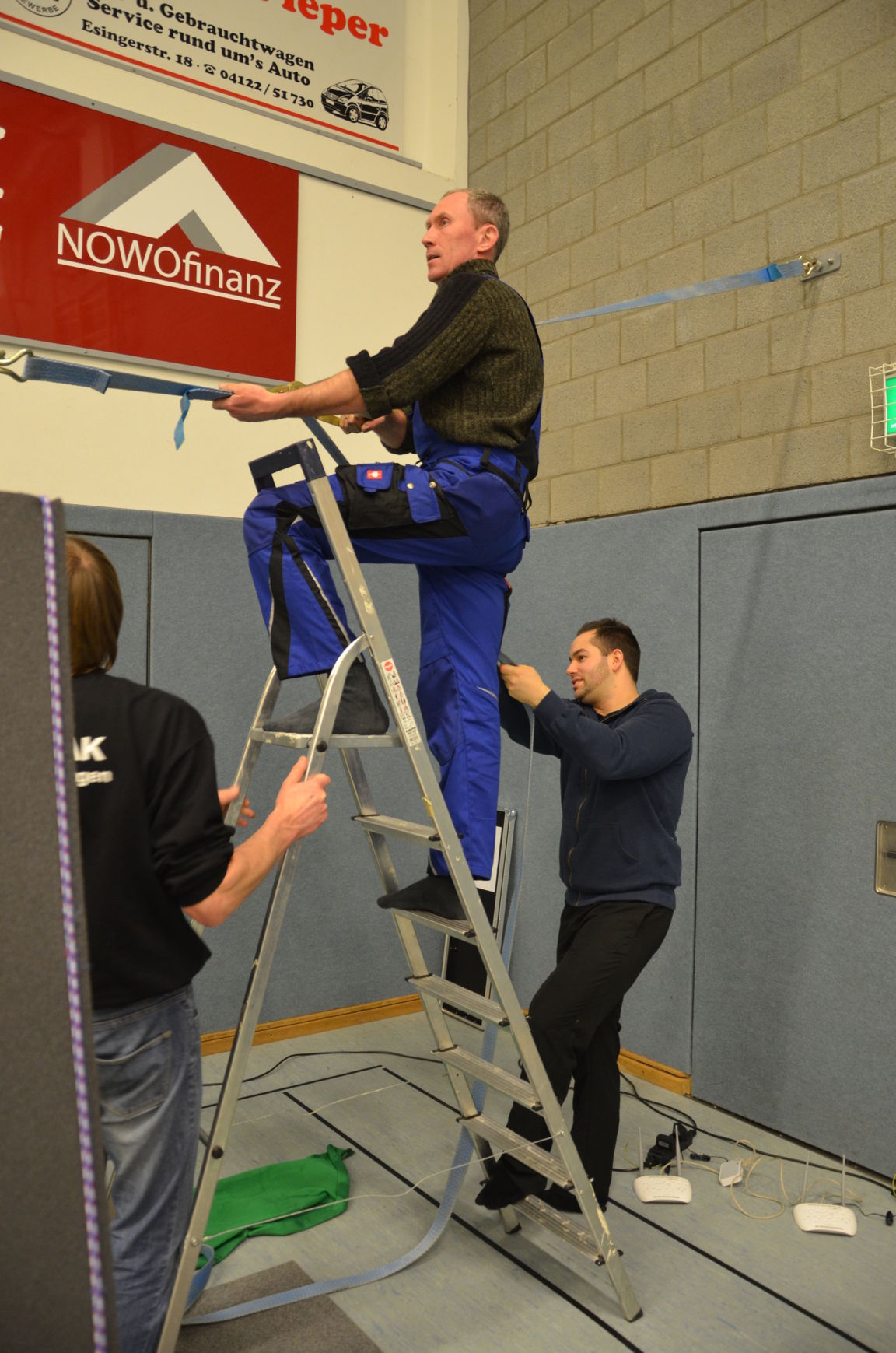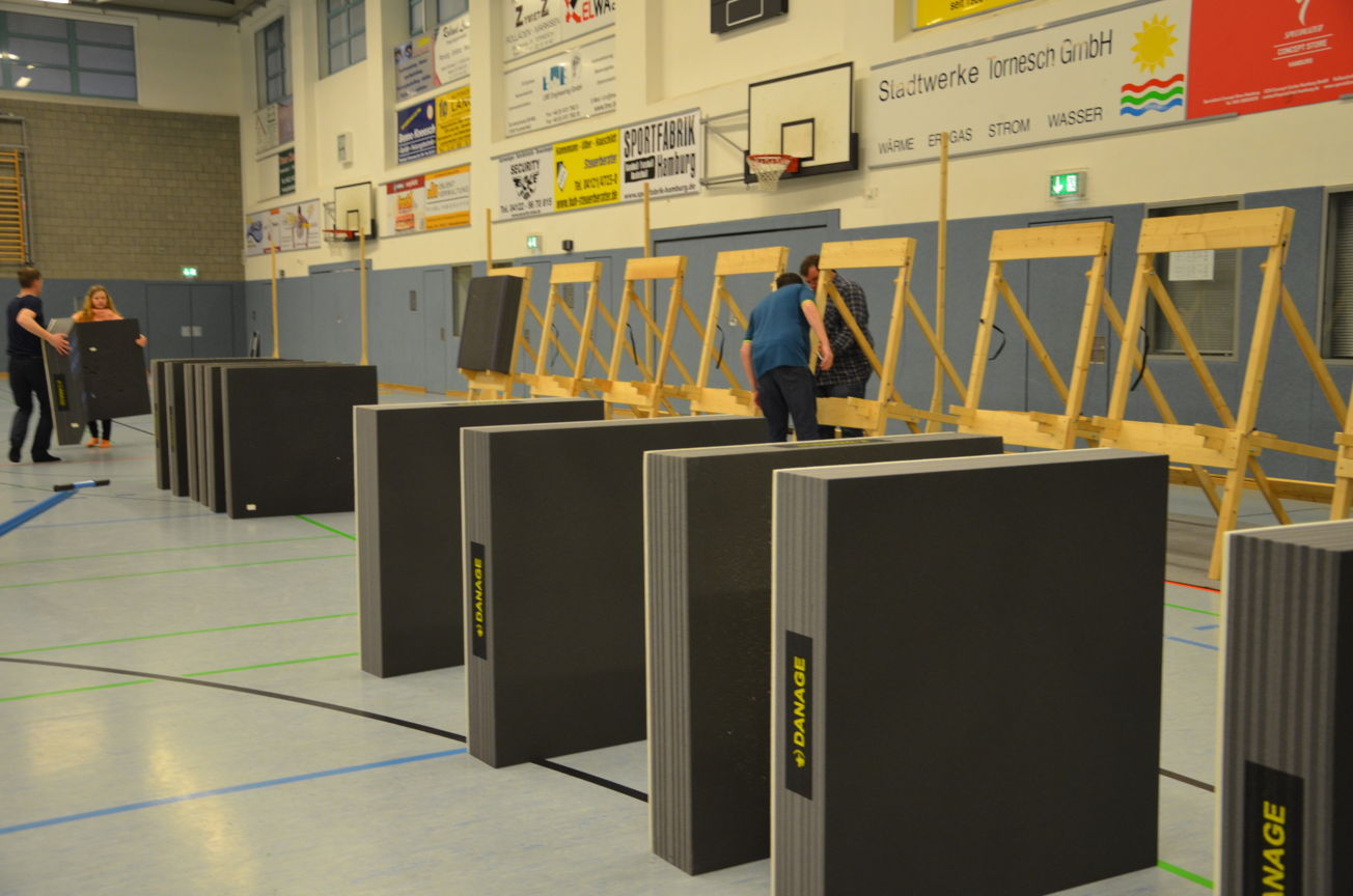Neben den zwei Ampeln in der Halle selber hatten wir die dritte Ampel im Vorraum aufgestellt. Dort konnte mittels Lauftexte Informationen zur Begrüßung, die Dauer der Pause usw. angezeigt werden. Zum frühen Abend erfolgte die Abnahme des Aufbaues durch die Kampfrichter. |