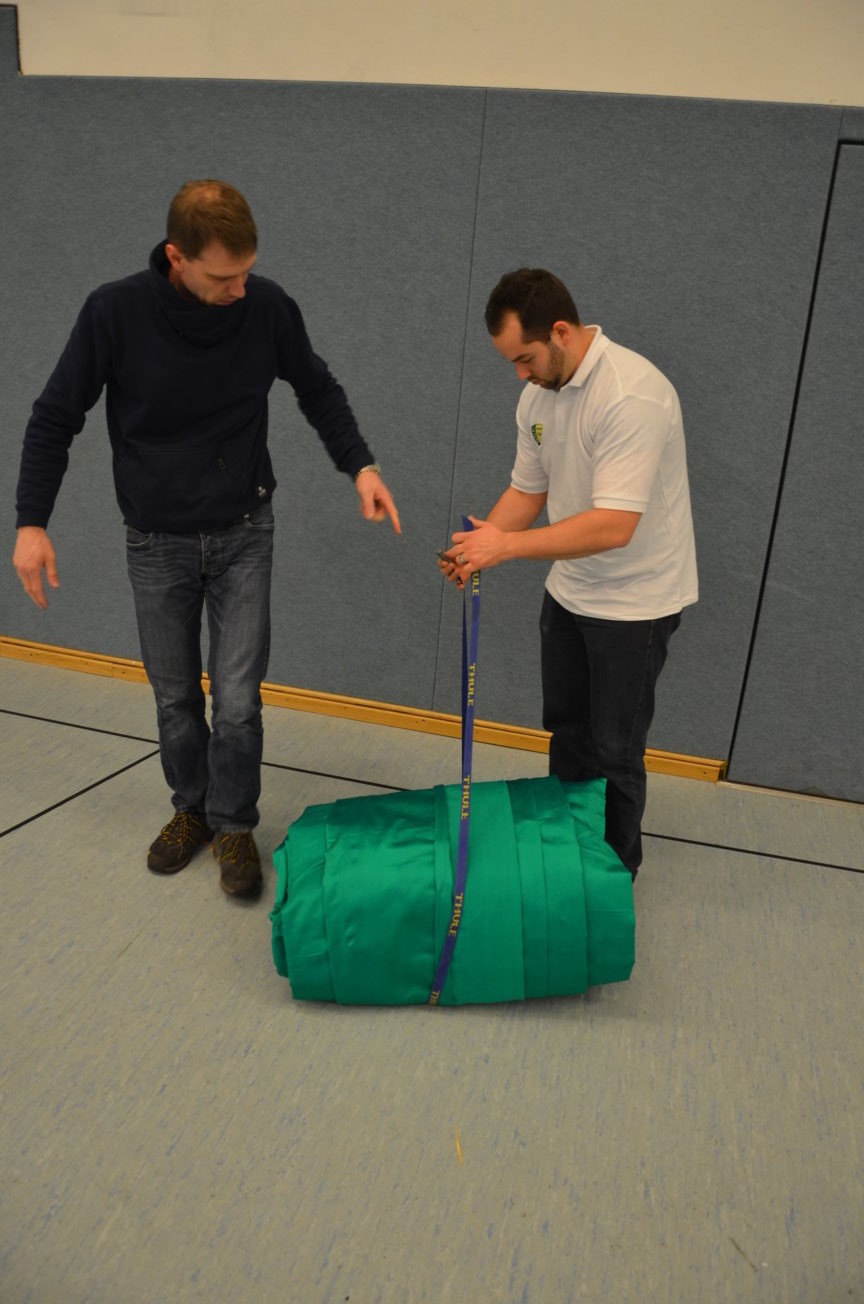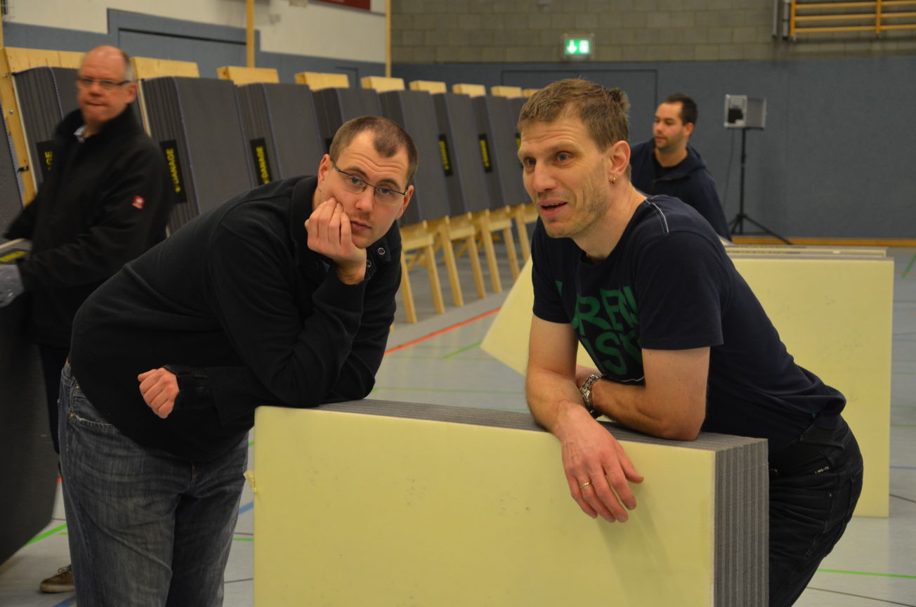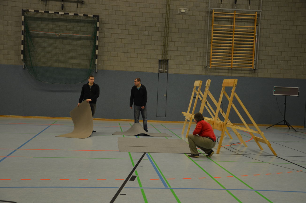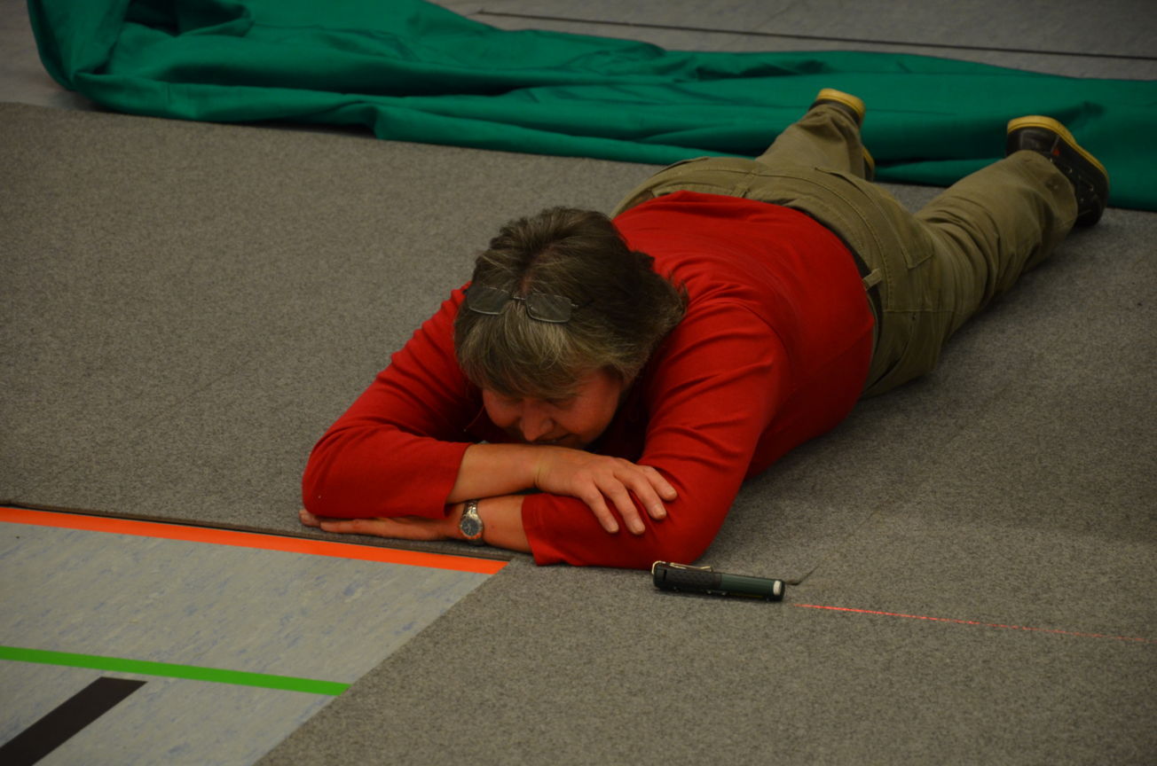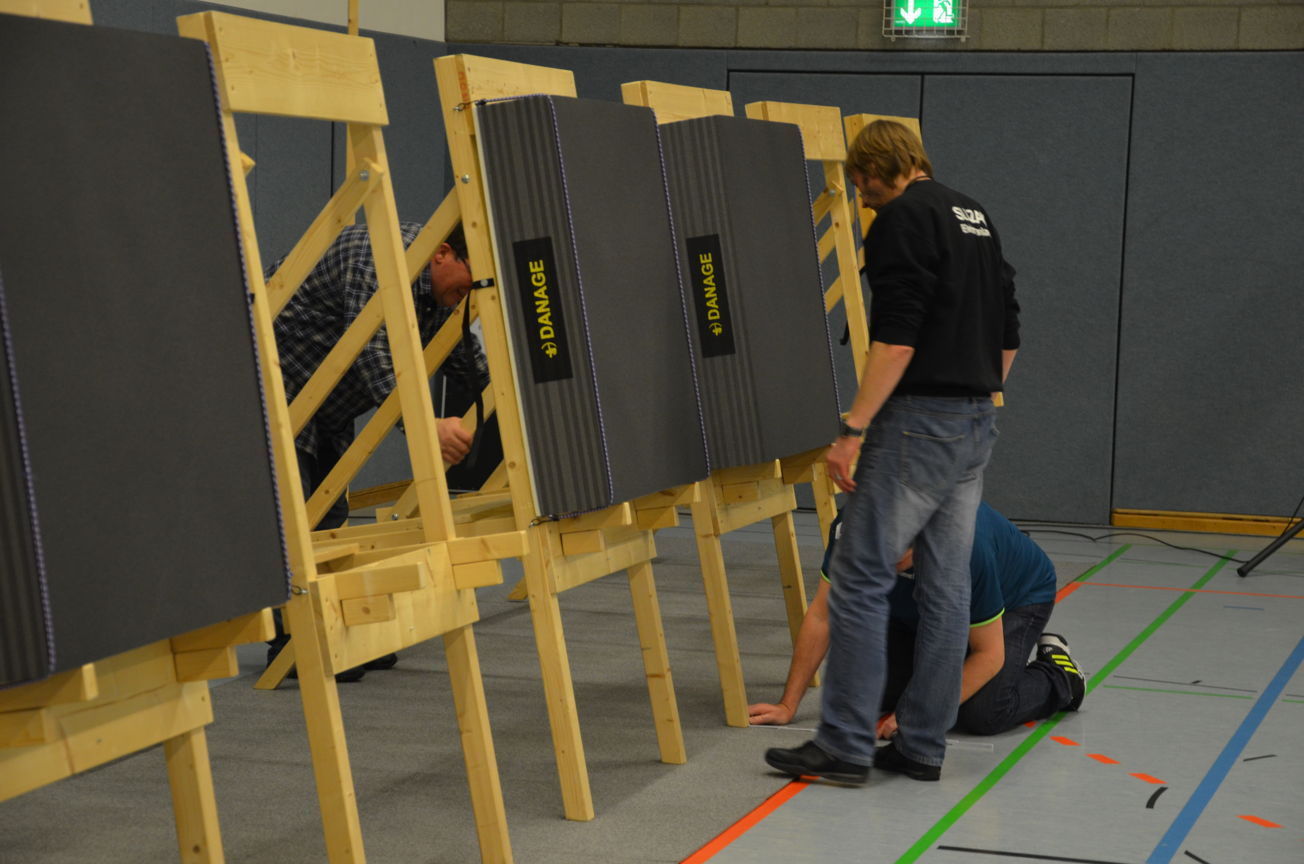 | Routiniert wurden die Matten unter den Scheibenständern ausgelegt, die Scheiben ausgerichtet, die Netze aufgehängt und die Schießlinie sowie die weiteren Linien abgeklebt. |