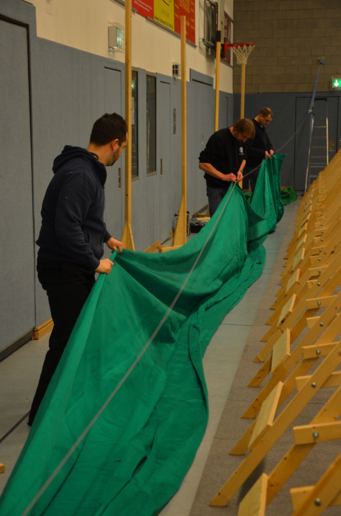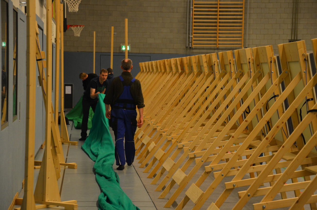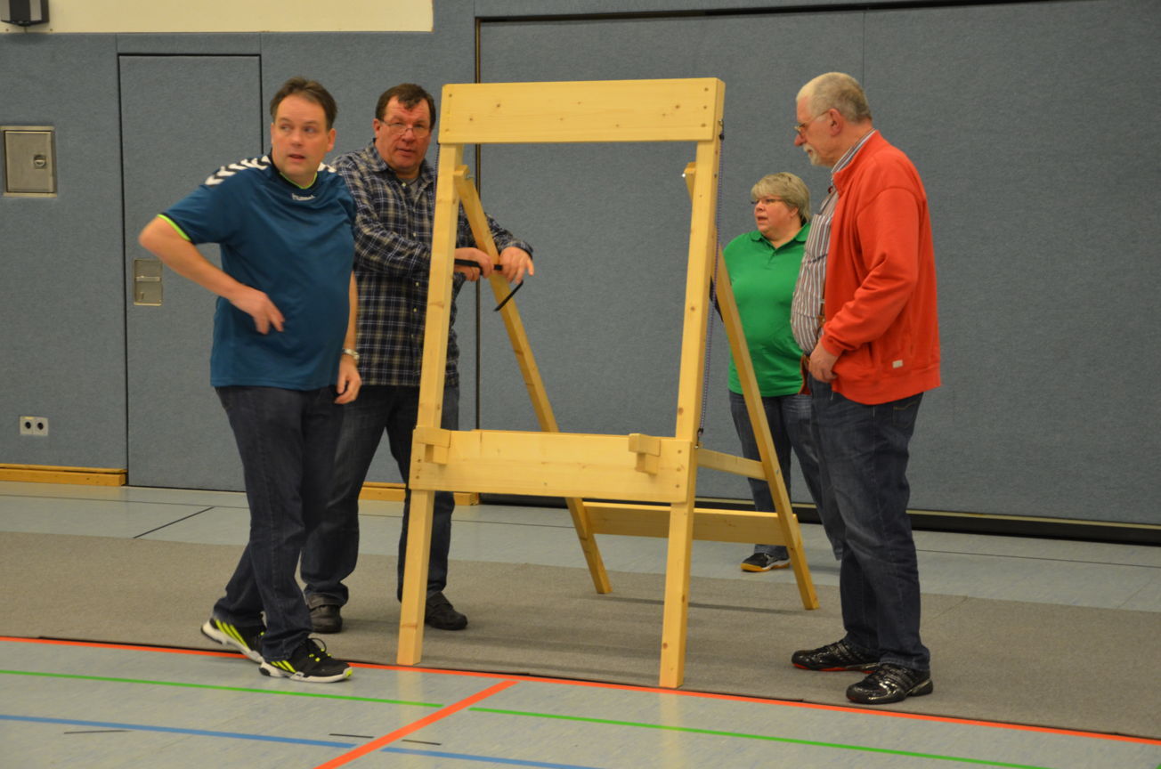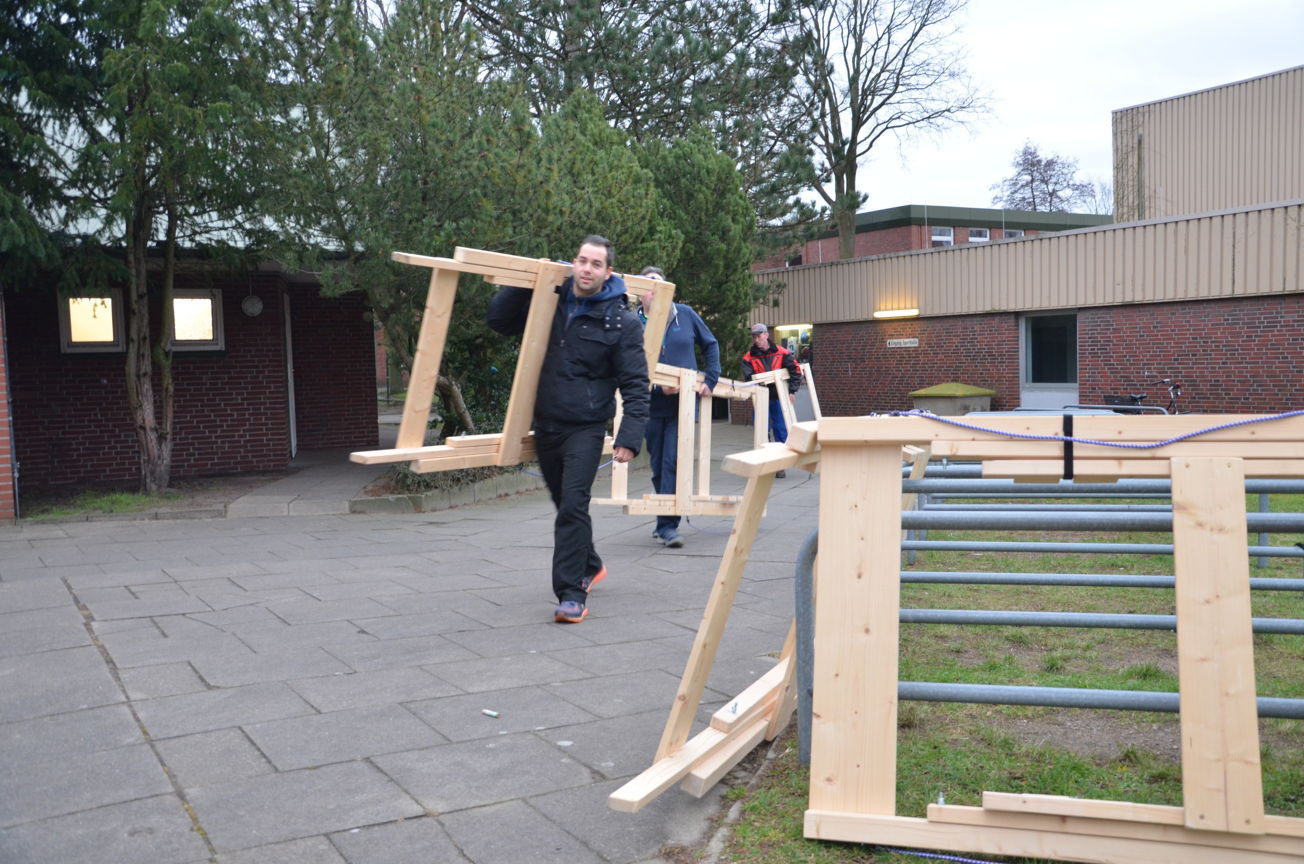 | Routiniert wurden die Matten unter den Scheibenständern ausgelegt, die Scheiben ausgerichtet, die Netze aufgehängt und die Schießlinie sowie die weiteren Linien abgeklebt. |