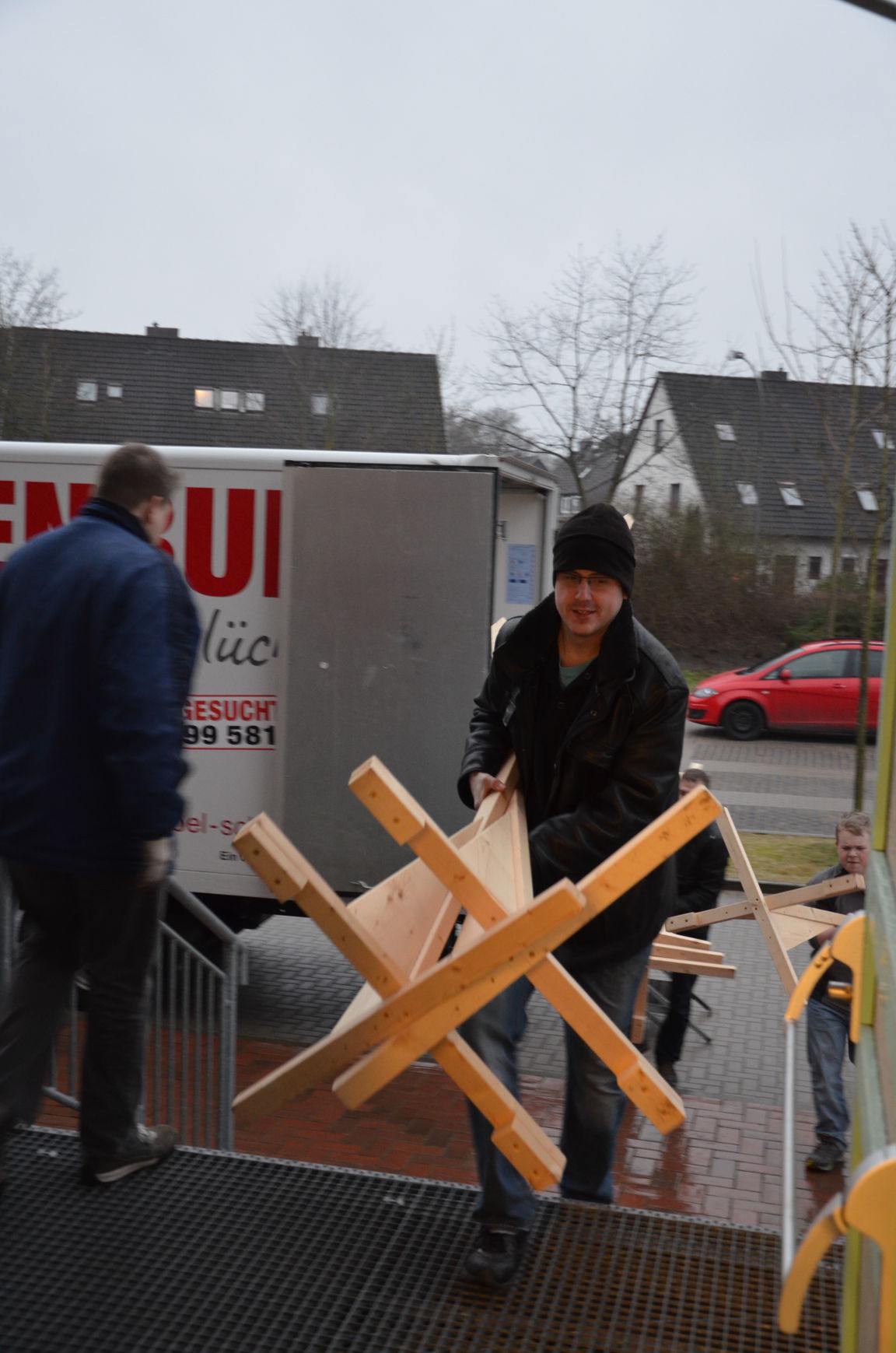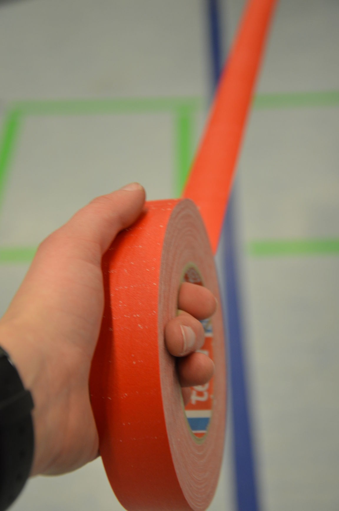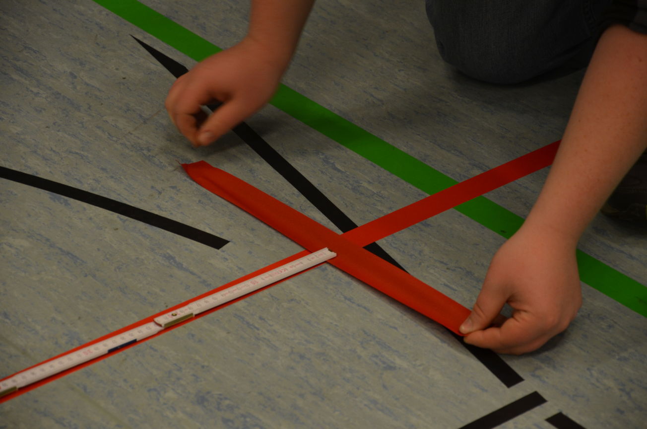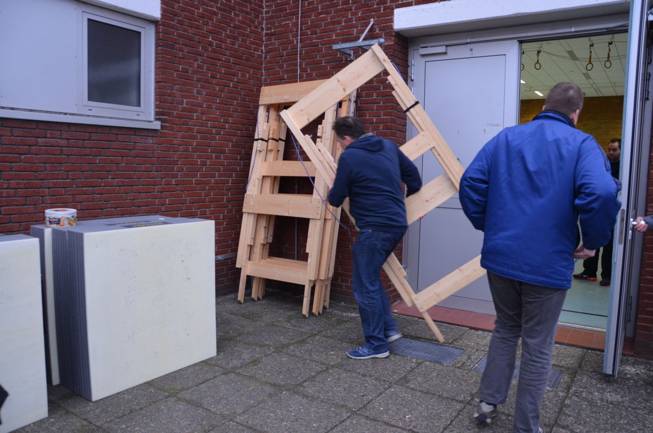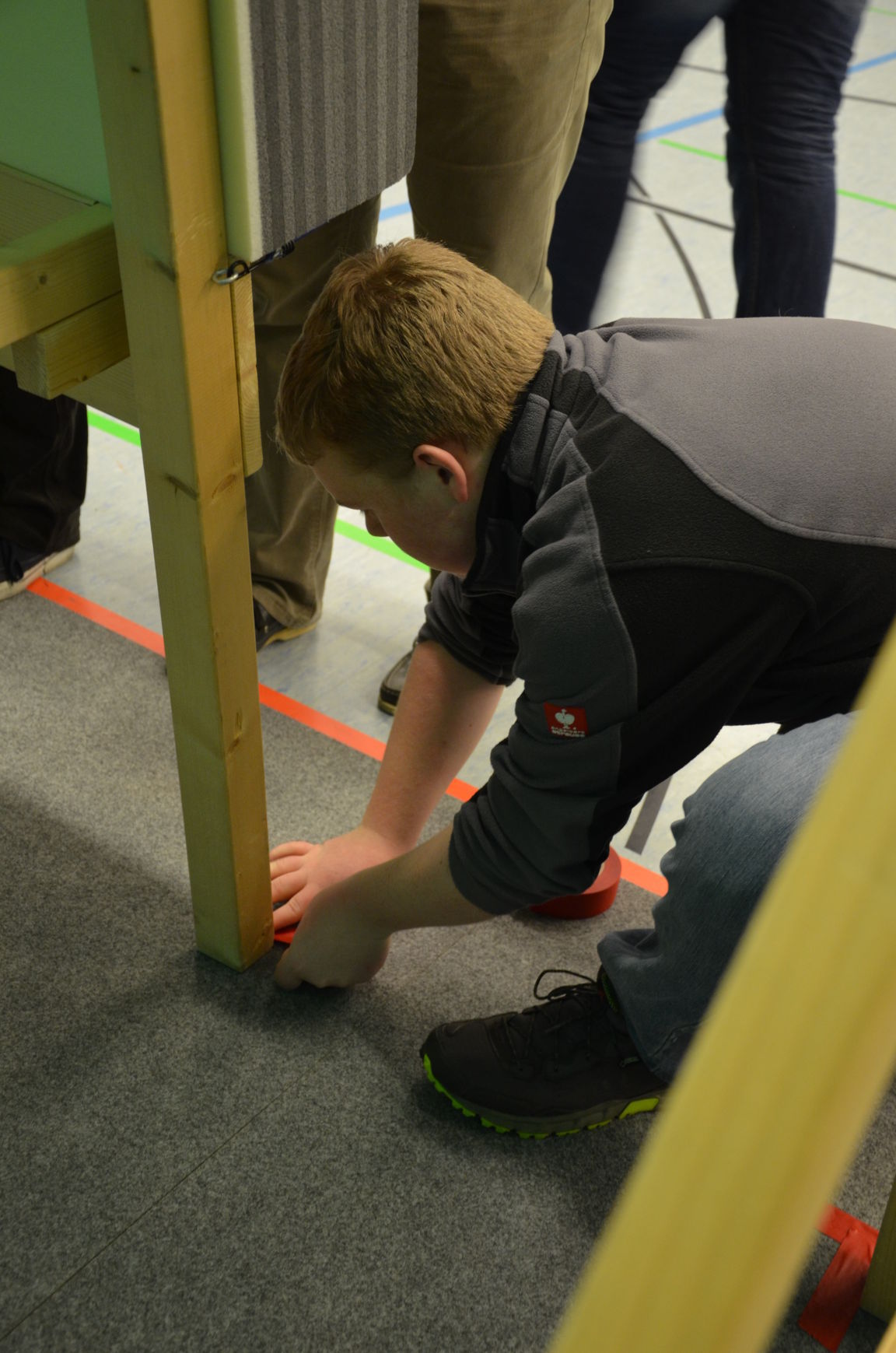 | Routiniert wurden die Matten unter den Scheibenständern ausgelegt, die Scheiben ausgerichtet, die Netze aufgehängt und die Schießlinie sowie die weiteren Linien abgeklebt. |