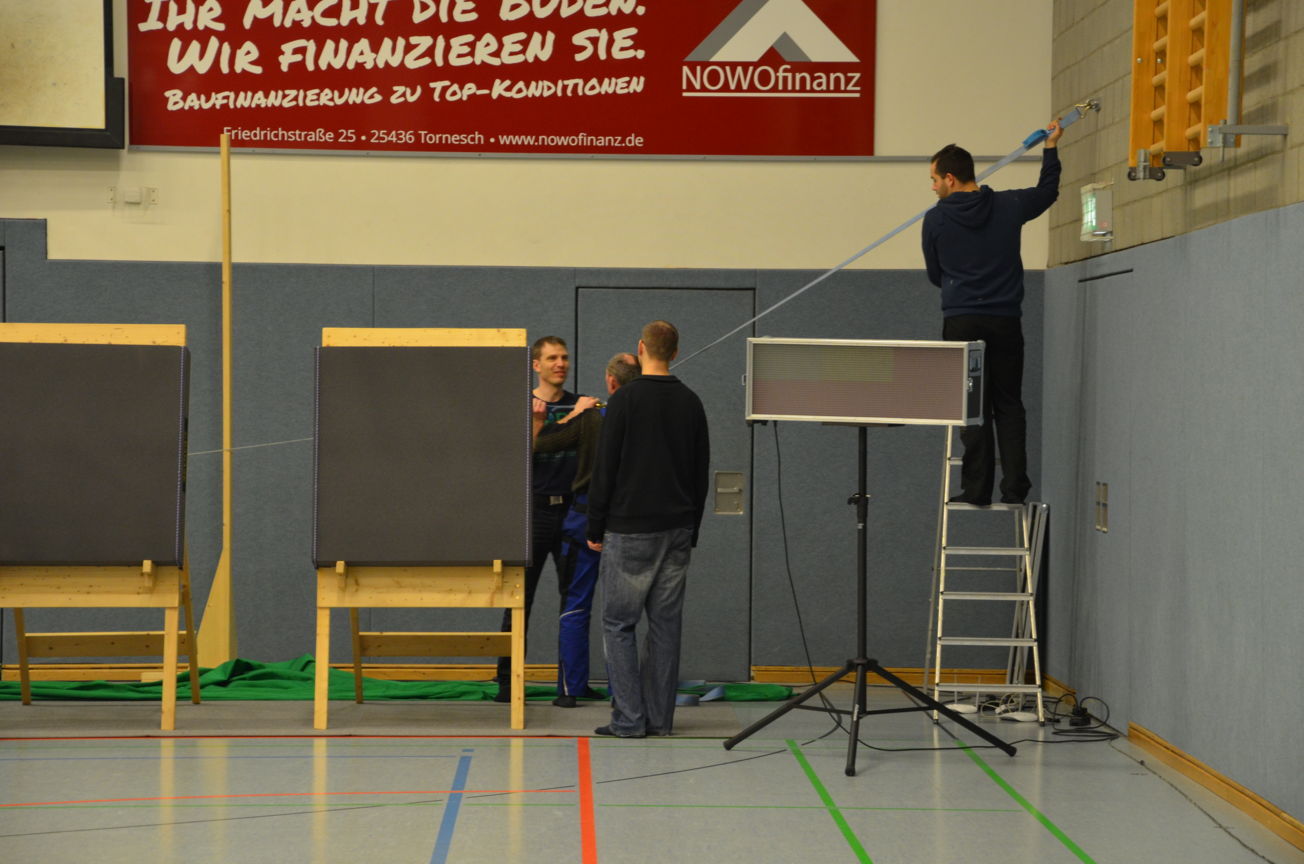 Nach 2013 war unser Verein dieses Jahr wieder beauftragt, die Ausrichtung der Landesmeisterschaft Halle für den NDSB Schleswig-Holstein zu organisieren. Bereits im November hatten wir zur Kreismeisterschaft die Software 'PureContest' mit Monitoren als Ersatz für unsere alte Ampelanlage eingesetzt. Aber schon lange hatten wir mit den beiden Nachbarvereinen, dem TSV Holm und der Elmshorner SchG überlegt, gemeinsam eine neue Ampelanlage anzuschaffen. Mitte Januar war es dann soweit: wir konnten die Ampelboxen in Empfang nehmen. Andreas Dähne (bogenampel.de) hat diese Ampelboxen entwickelt und gebaut und genau auf die Software 'PureContest' abgestimmt, die von Edmund Korffmann programmiert wurde (purecontest.de). Beide sind selber Bogensportler und das merkt man. Hier sind viele Kleinigkeiten und Feinheiten berücksichtigt, was vom nötigen Sachverstand der Abläufe von Bogenturnieren herrührt. Aber dazu noch später ein paar Details. |