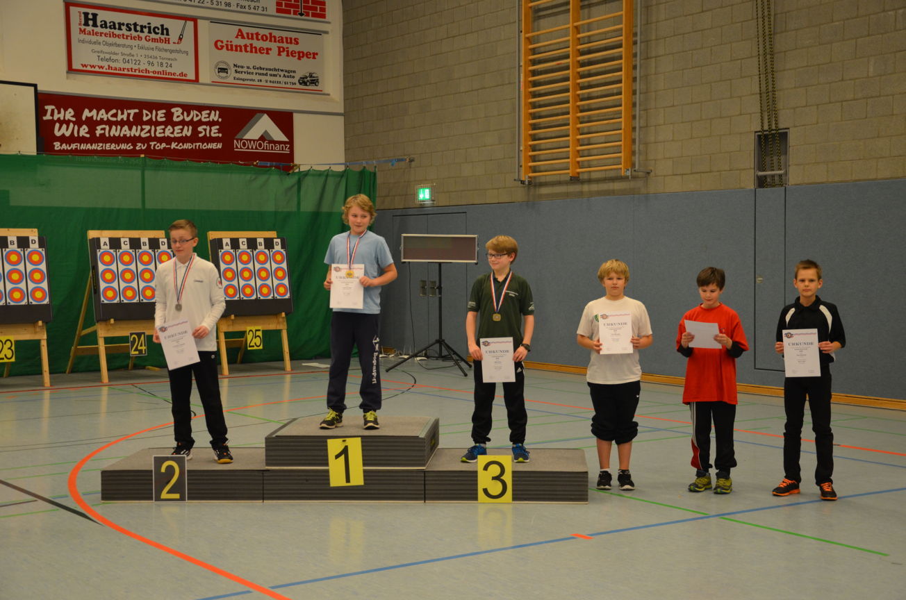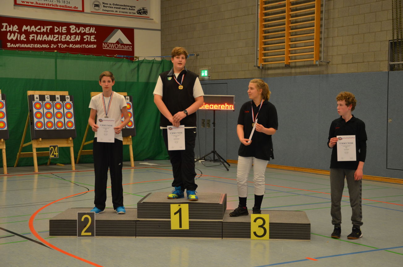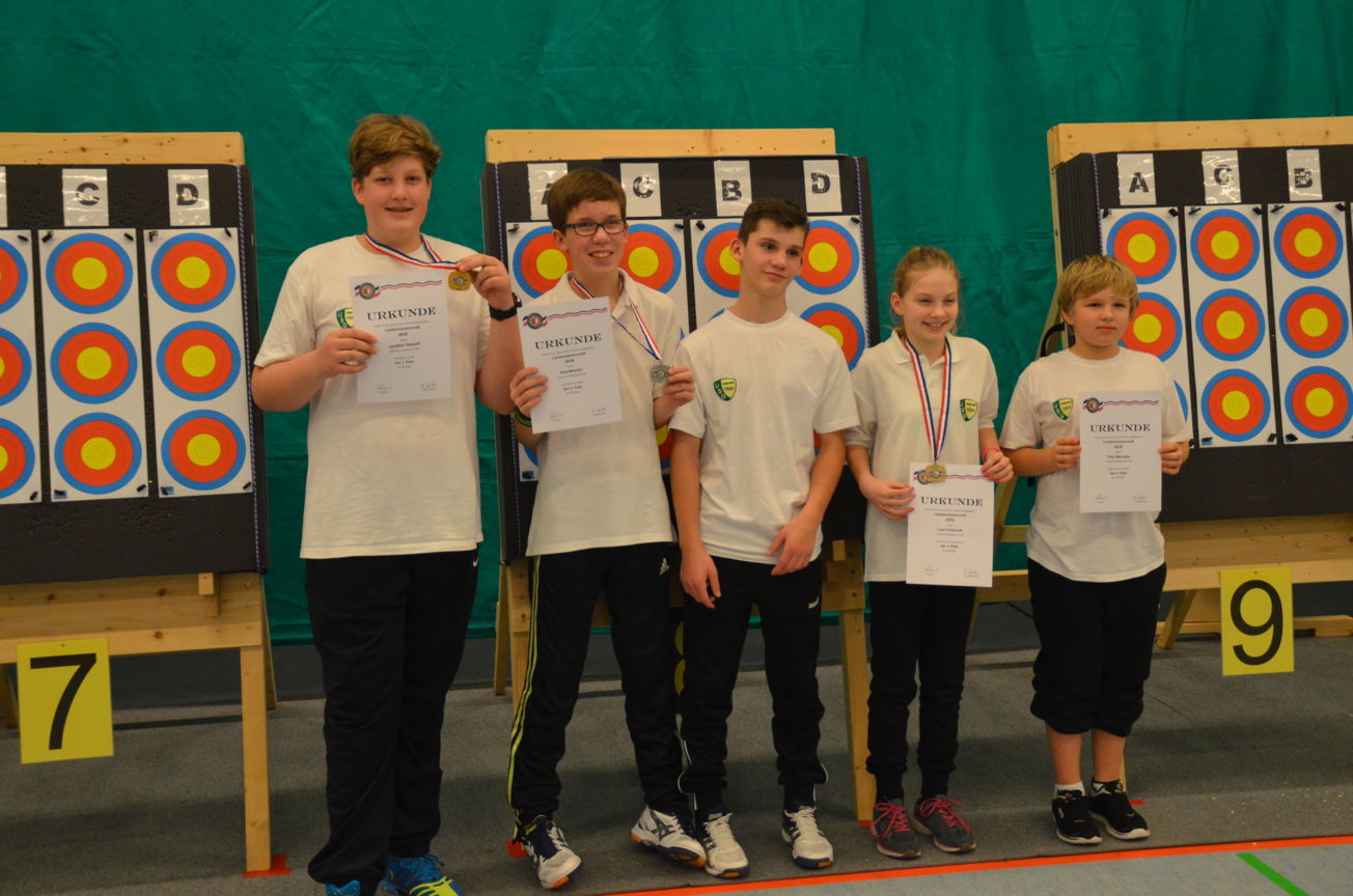 | Am Ende des ersten Wettkampftages gab es dann je einmal Gold, Silber und Bronze für die Jugend unseres Vereins. Jonathan, der erst seit wenigen Monaten Bogenschütze ist, erreichte auf Anhieb Platz 1 bei den Blankschützen der Schüler. Bei den Recurveschützen der Schüler sicherte sich Paul M. den 2. Platz und Nick den 10. Platz. Lina F. erzielte bei den Schülerinnen B Recurve den 3. Platz und Felix bei den Schülern B den 4. Platz. |