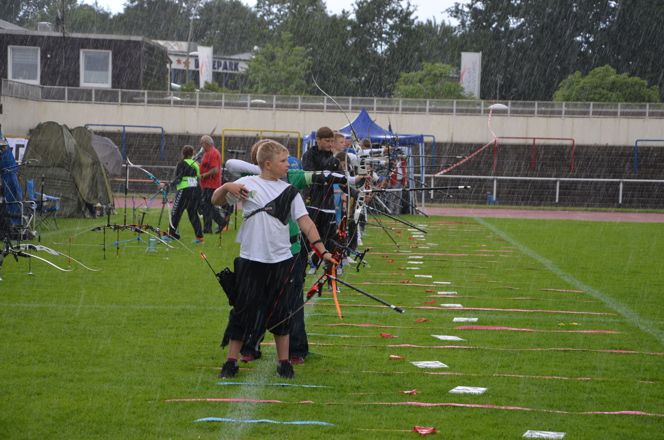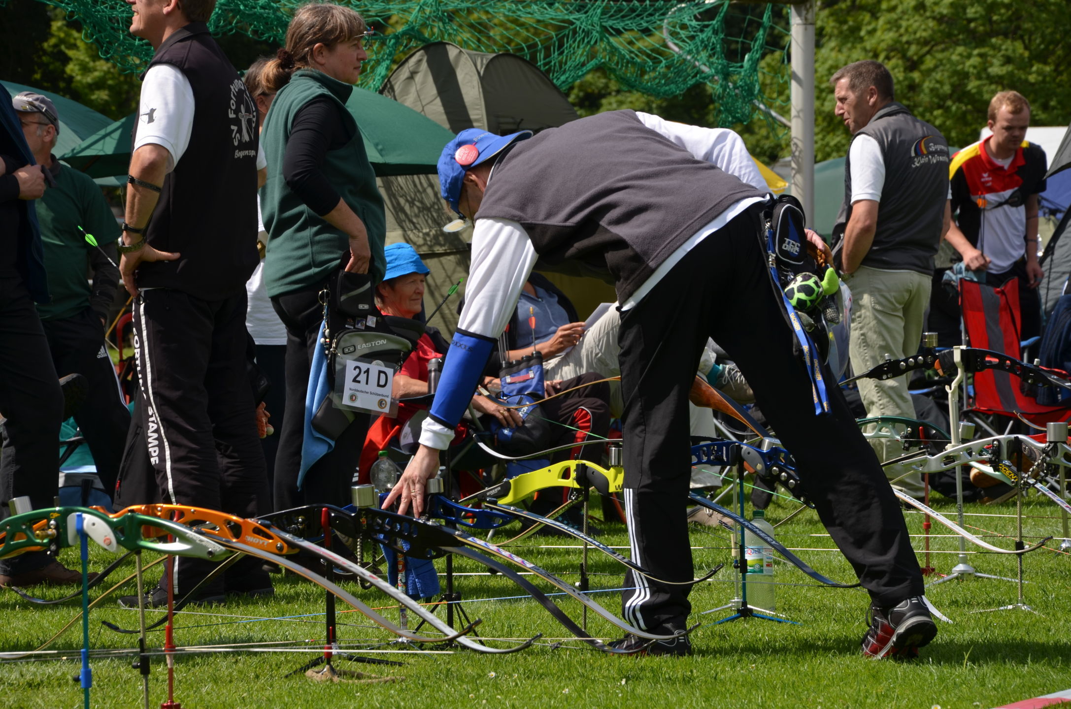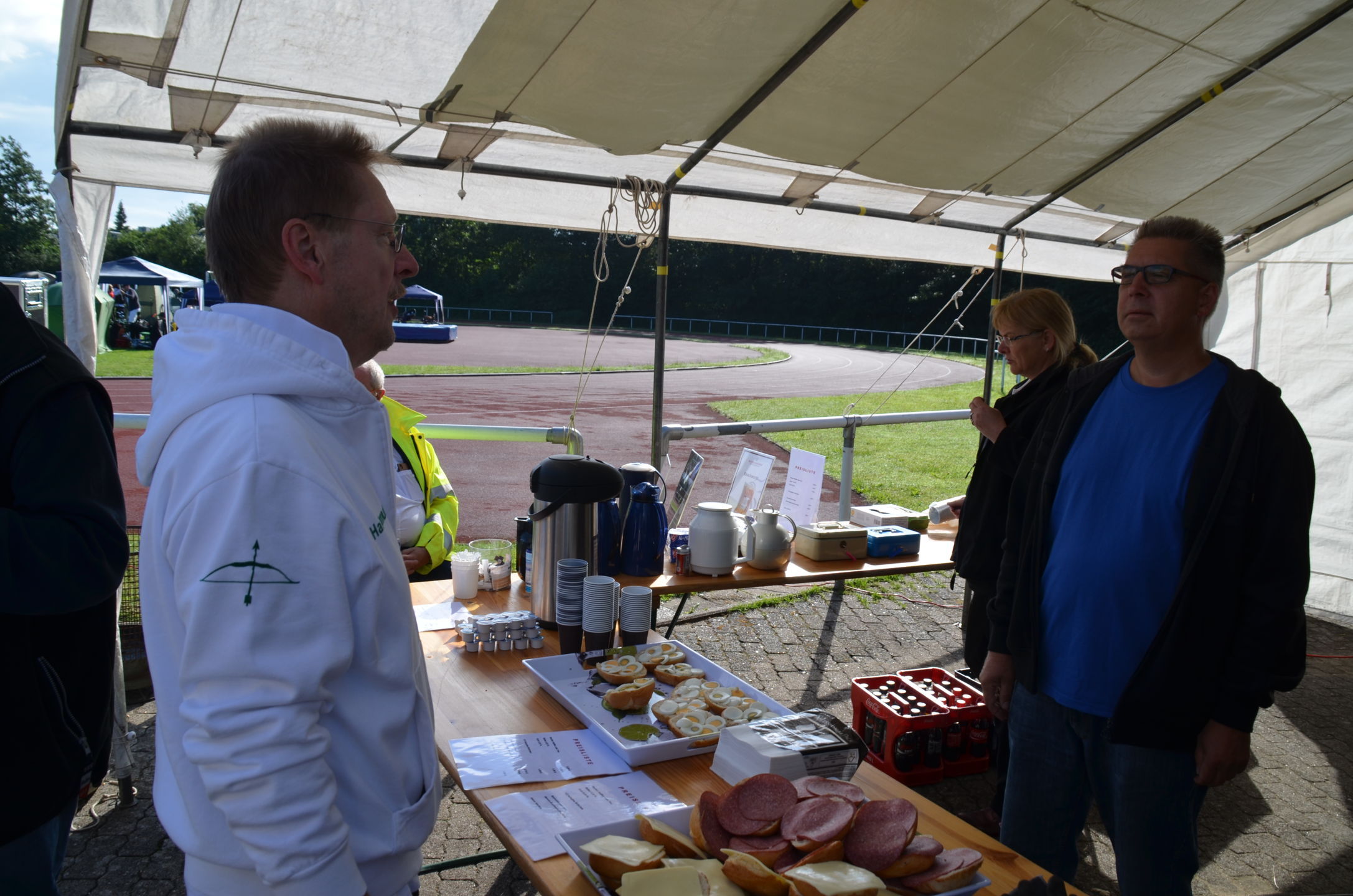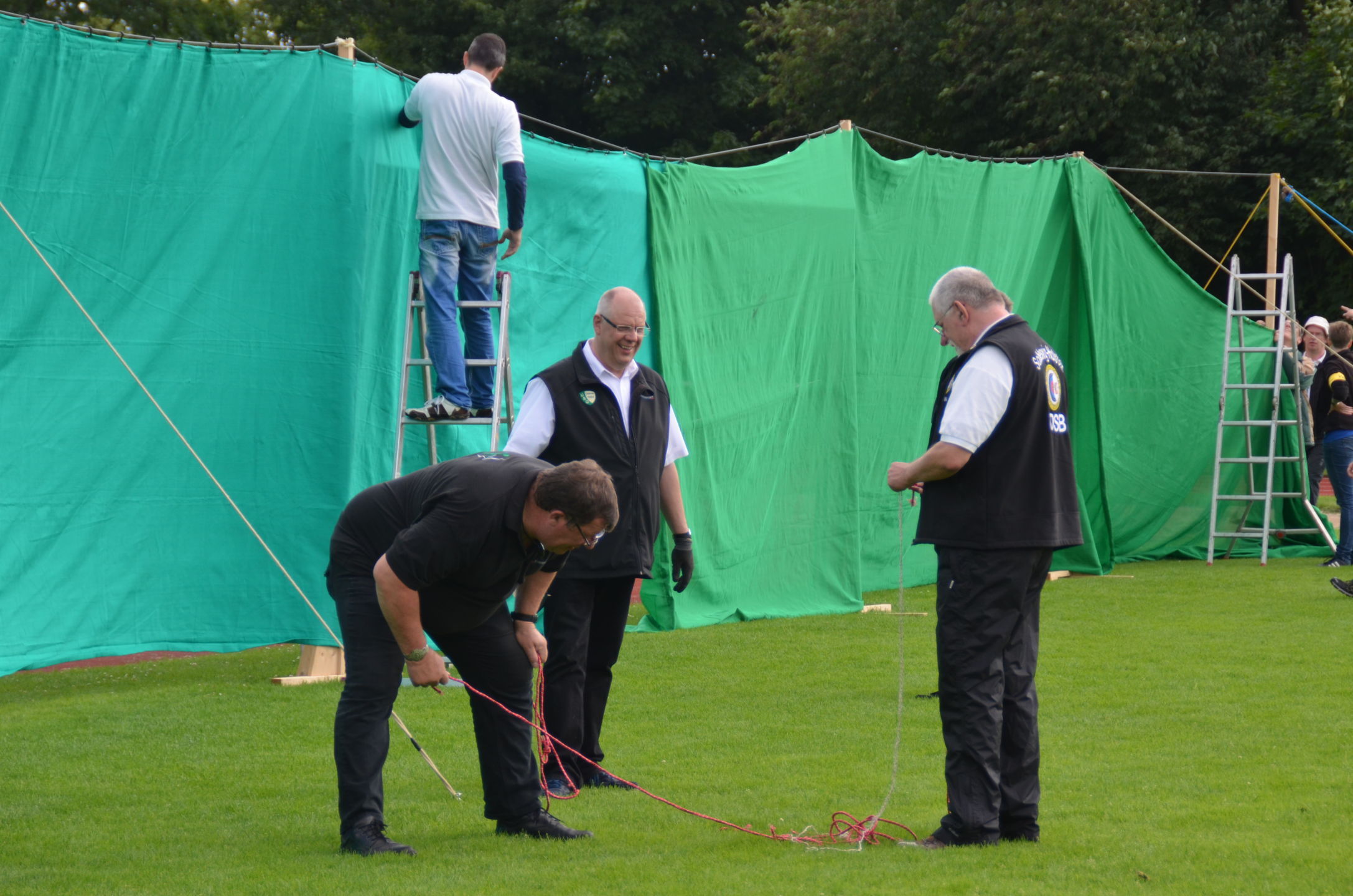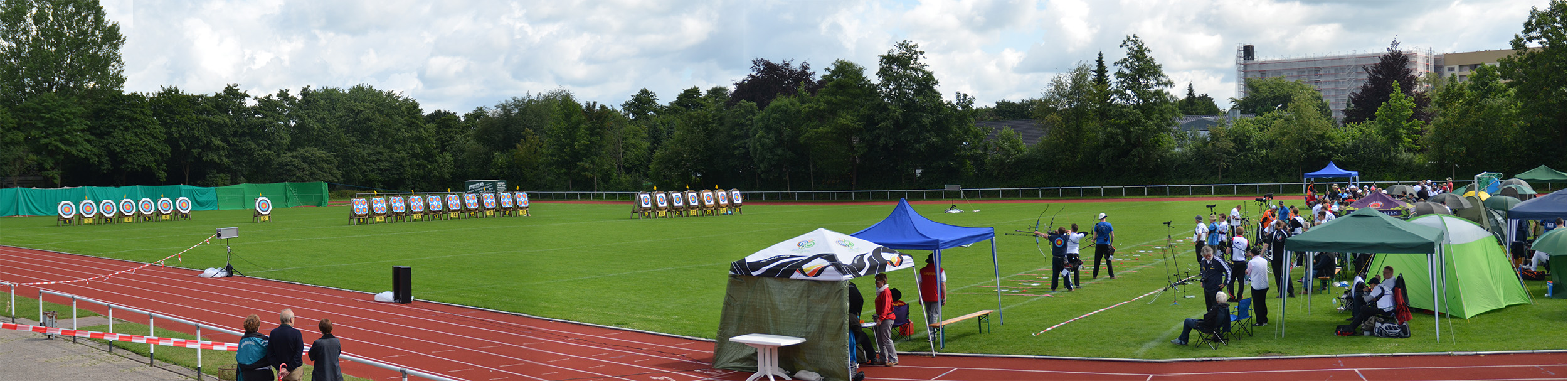 | Für die Helfer begann jeder Wettkampftag mit den Vorbereitungen um 8 Uhr: Aufstellen von Pavillons, die Installation der Ampeln und Beschallungsanlage, der Aufbau der Sicherungsnetze gegen verirrte Pfeile und natürlich die Verpflegung, Kaffee kochen und Brötchen belegen. |