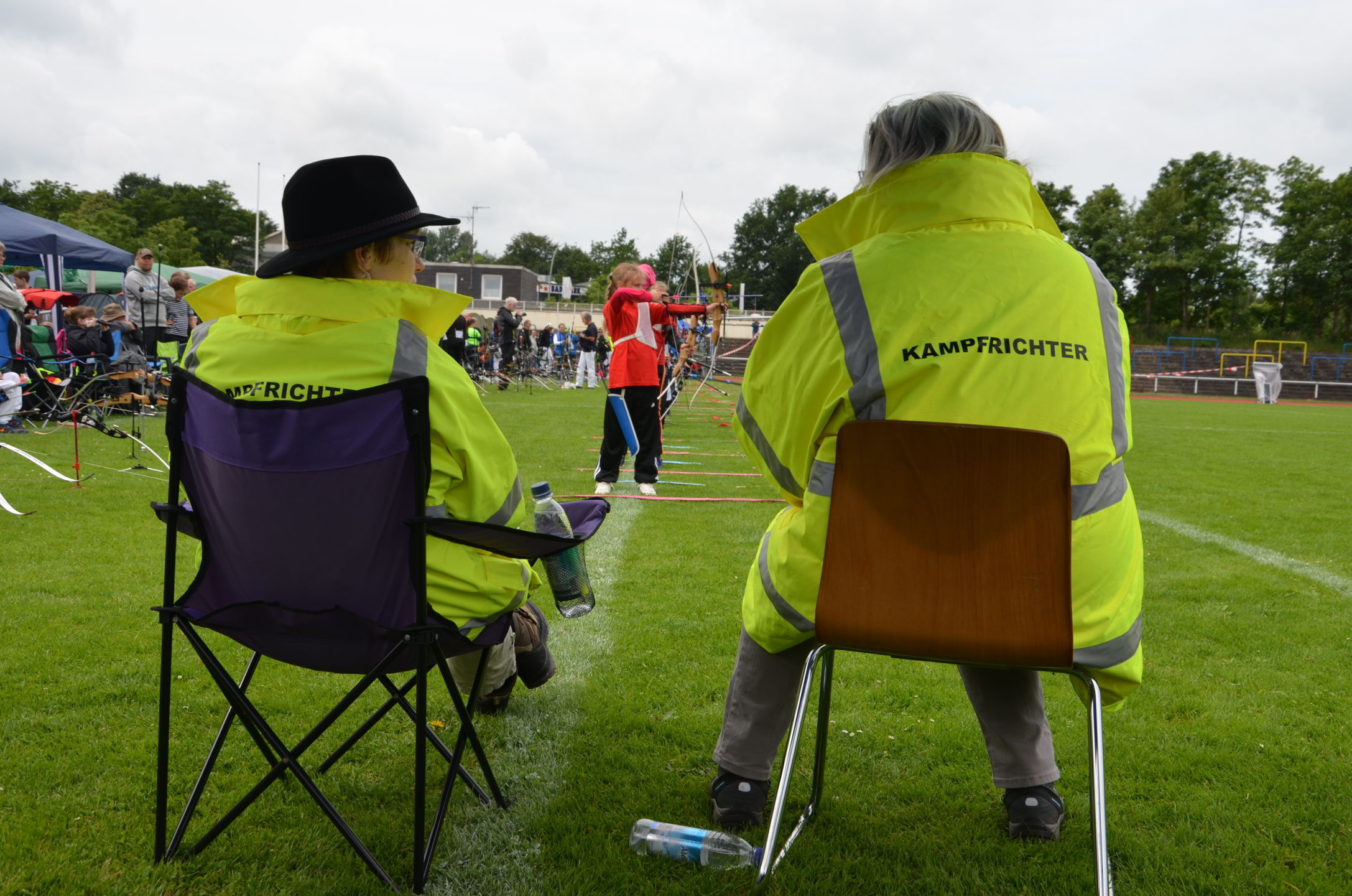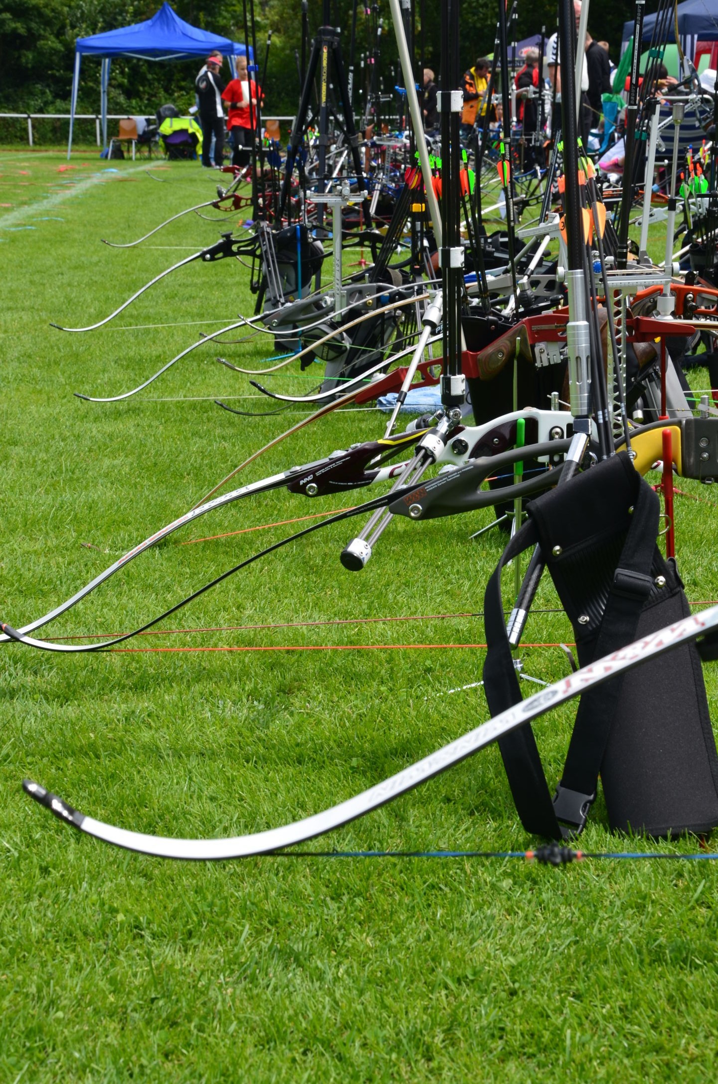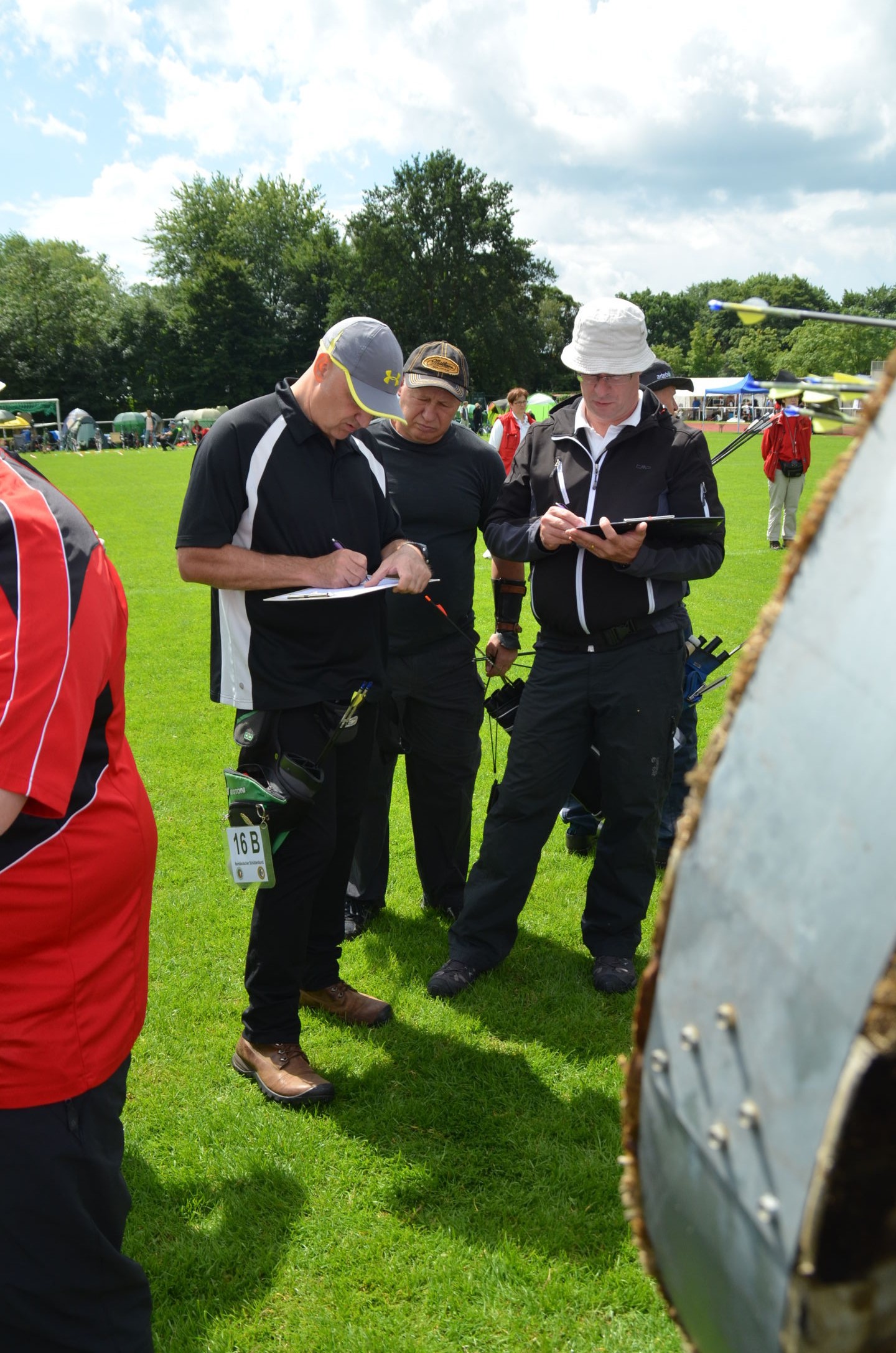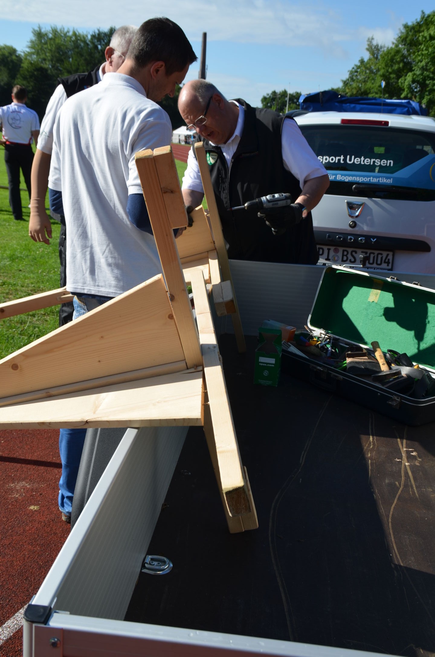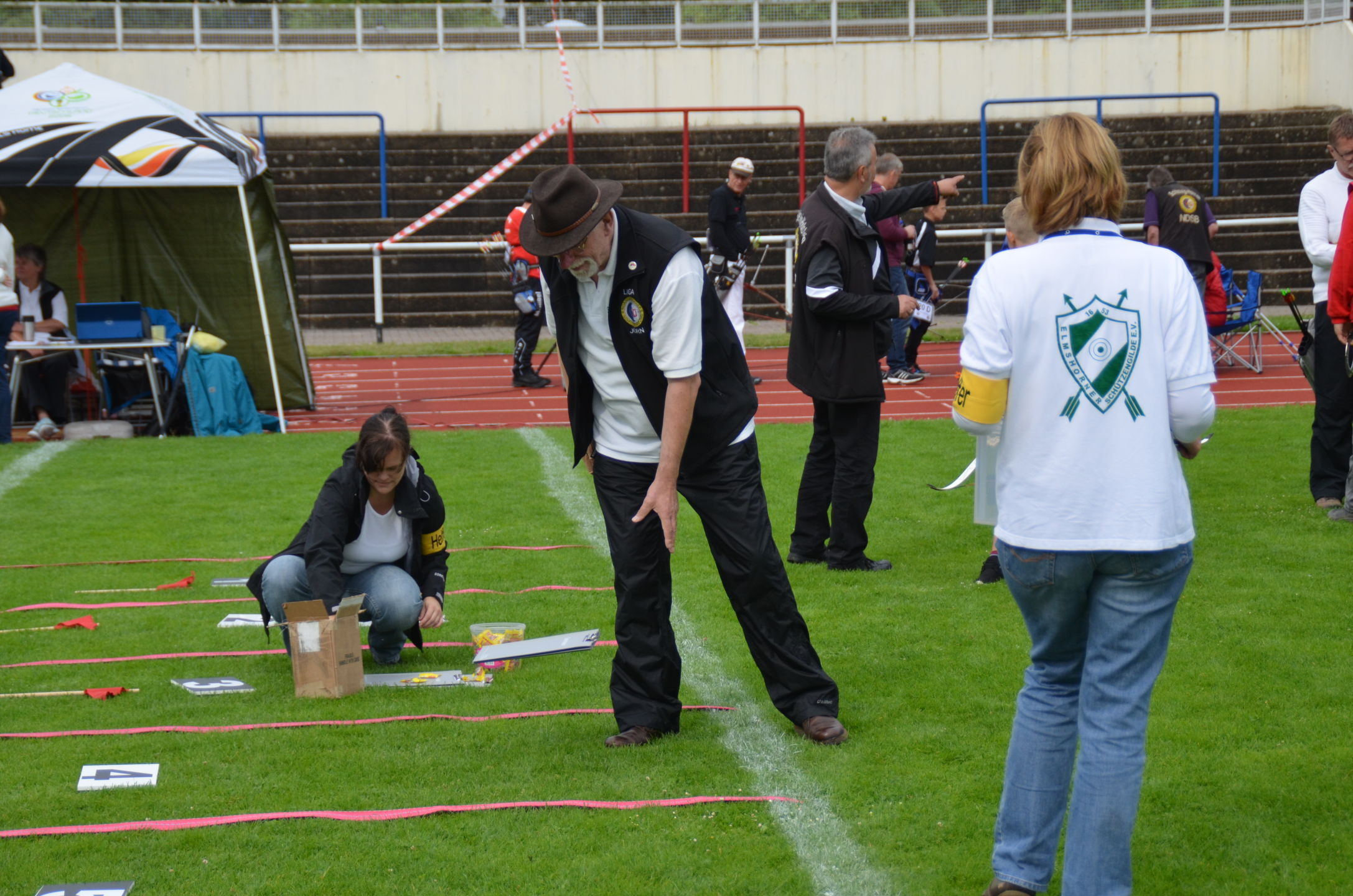 | Für die Helfer begann jeder Wettkampftag mit den Vorbereitungen um 8 Uhr: Aufstellen von Pavillons, die Installation der Ampeln und Beschallungsanlage, der Aufbau der Sicherungsnetze gegen verirrte Pfeile und natürlich die Verpflegung, Kaffee kochen und Brötchen belegen. |