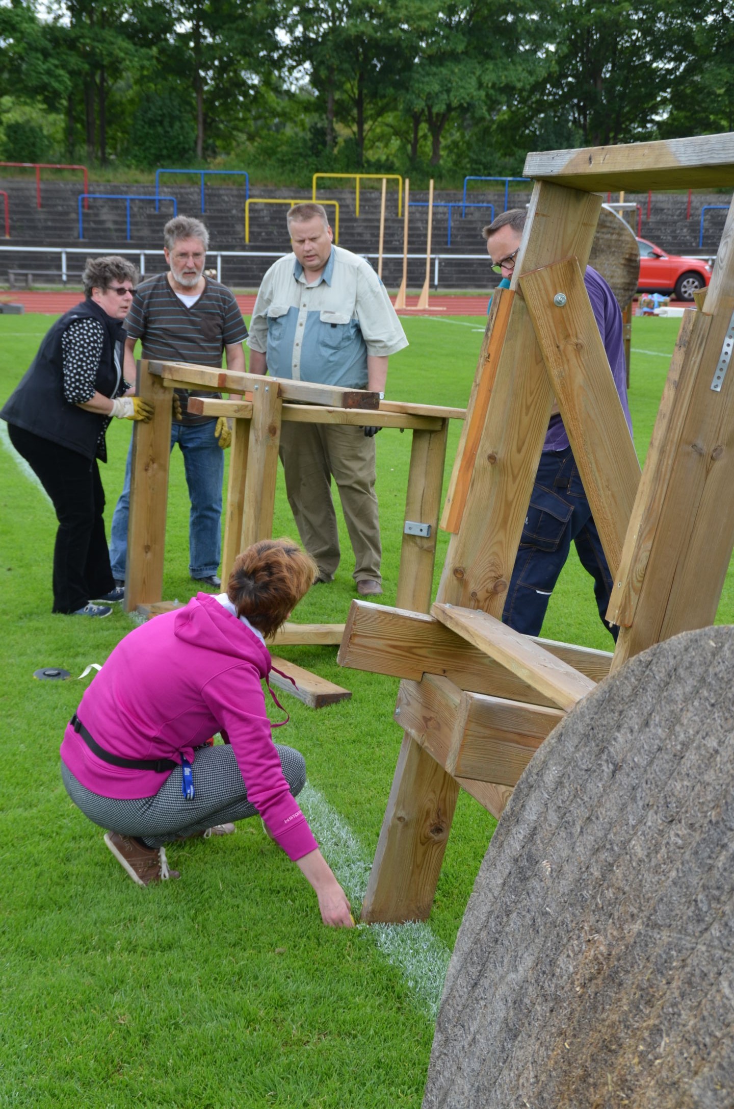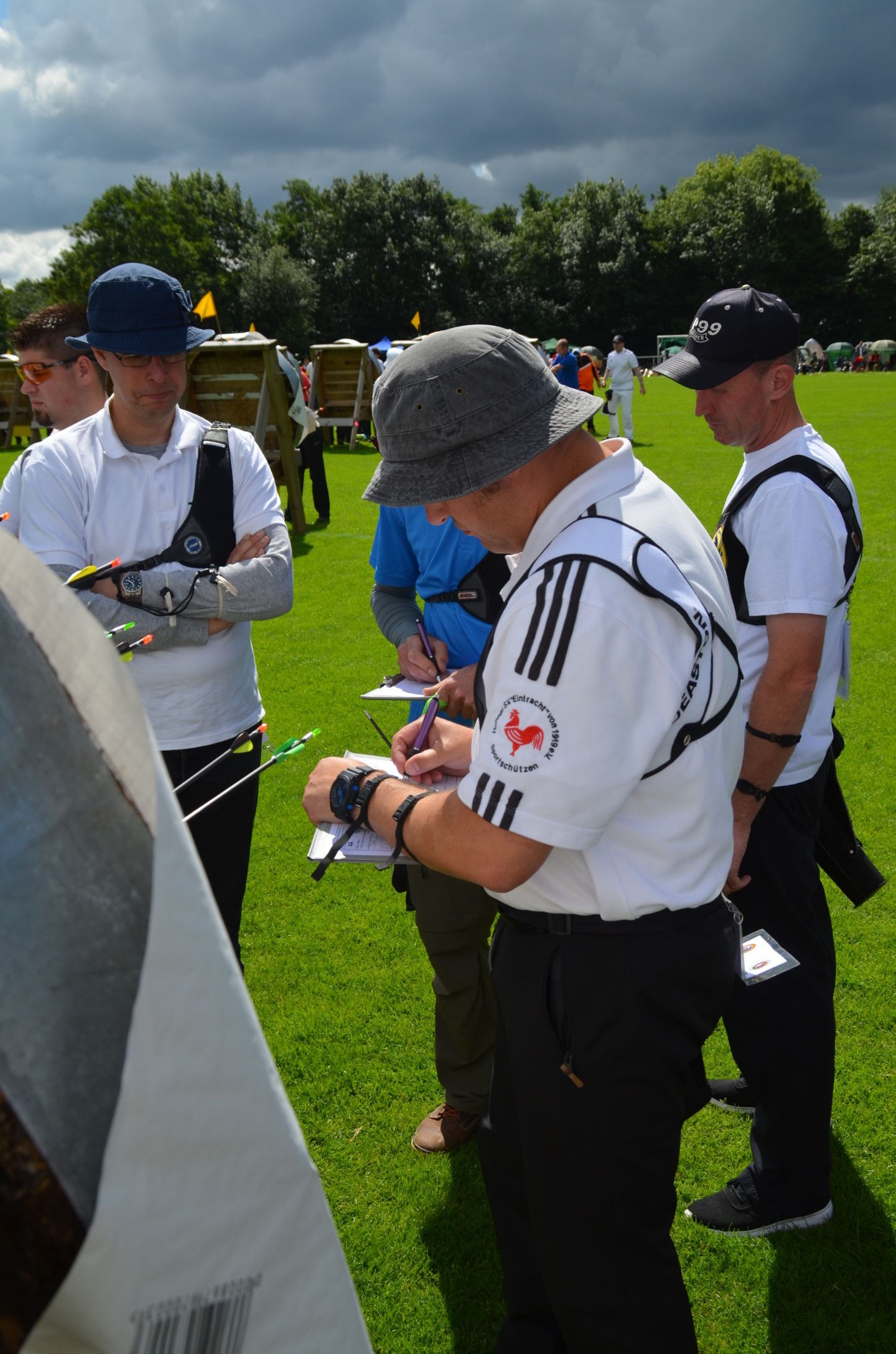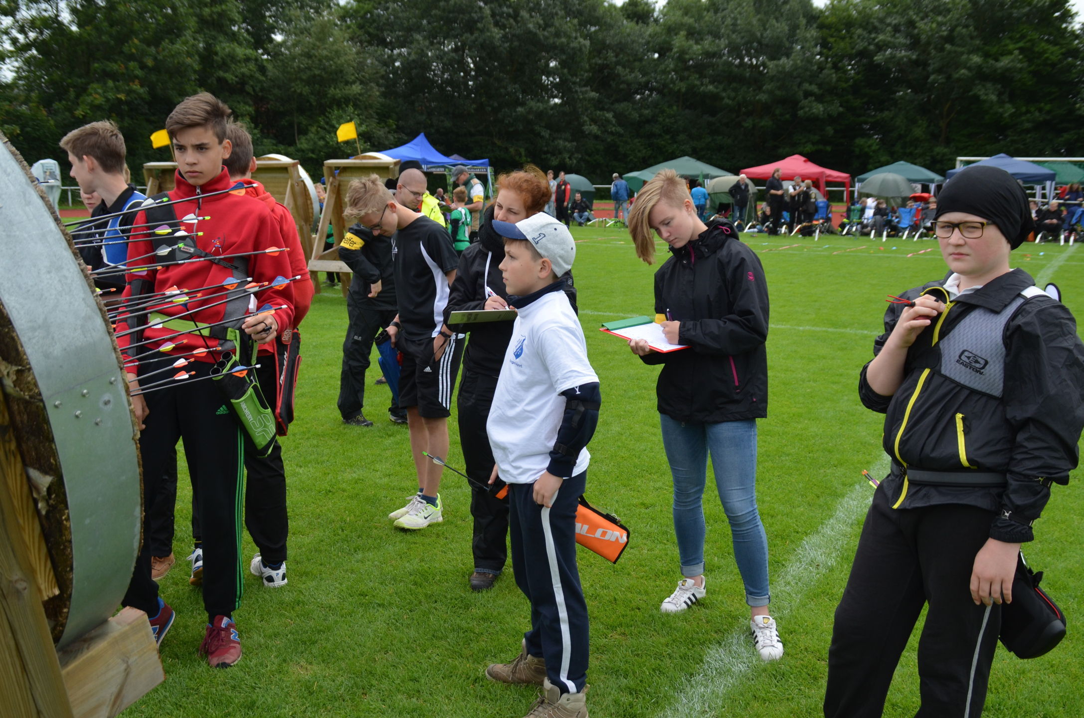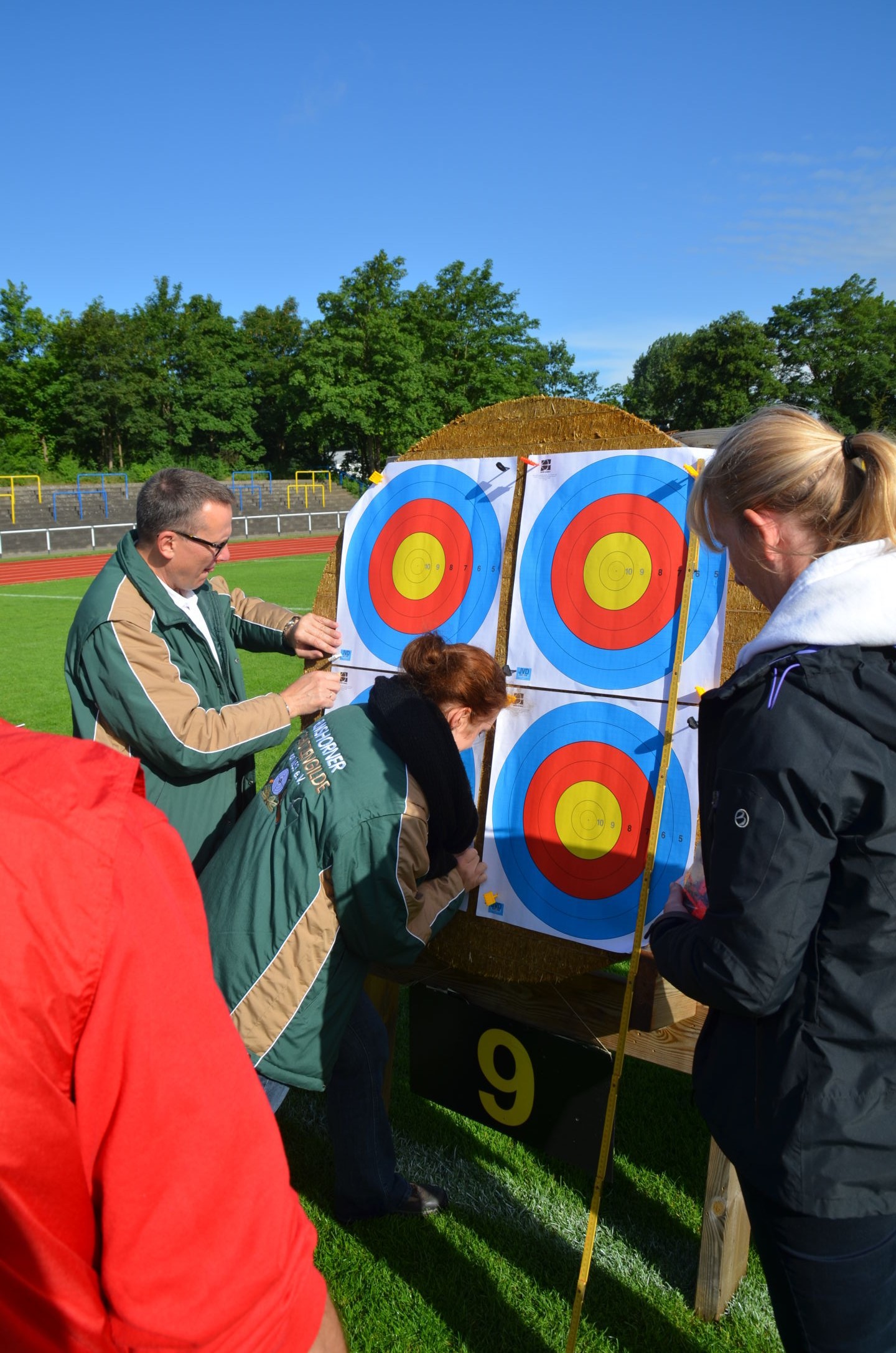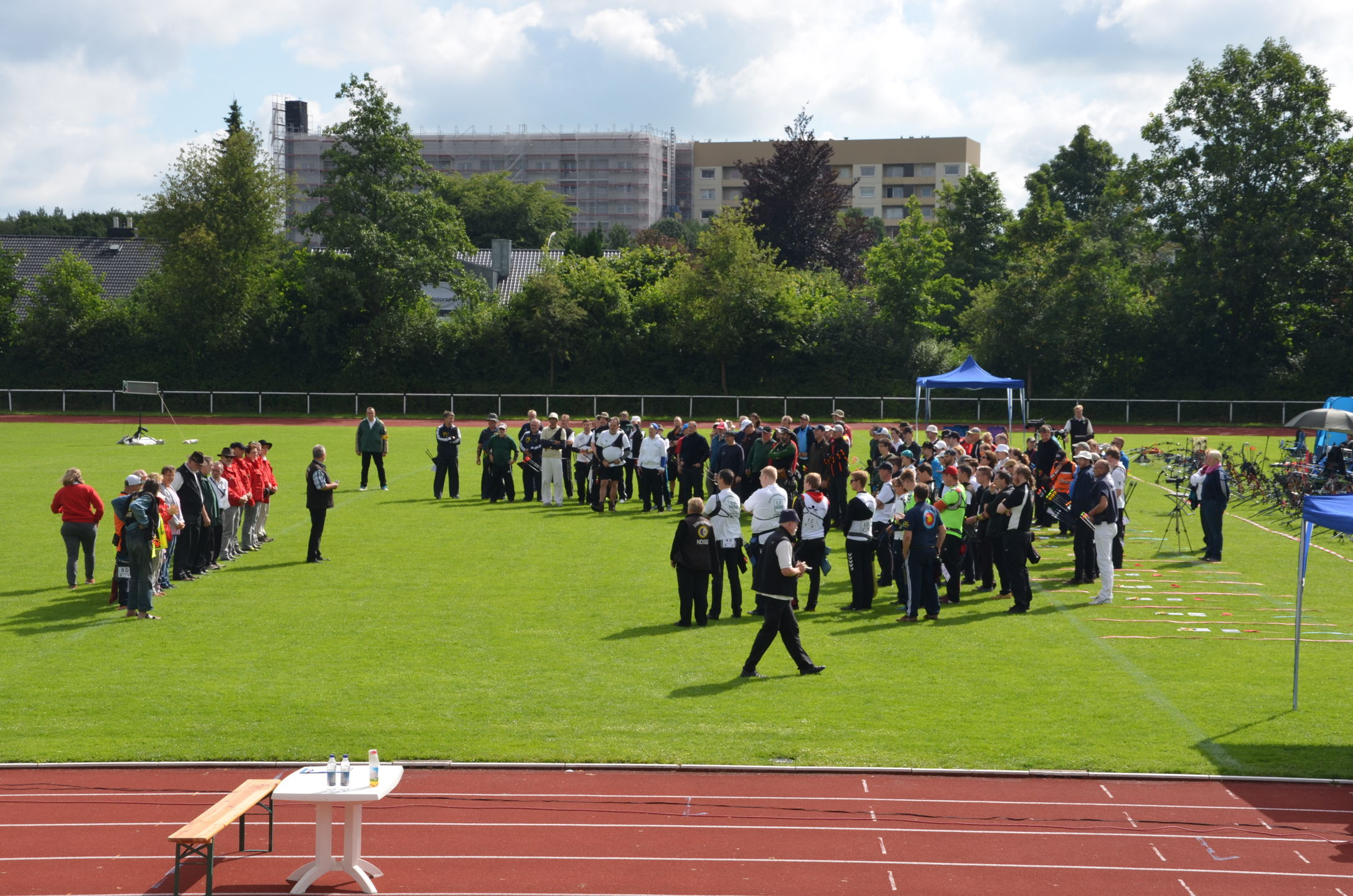 | Für die Helfer begann jeder Wettkampftag mit den Vorbereitungen um 8 Uhr: Aufstellen von Pavillons, die Installation der Ampeln und Beschallungsanlage, der Aufbau der Sicherungsnetze gegen verirrte Pfeile und natürlich die Verpflegung, Kaffee kochen und Brötchen belegen. |