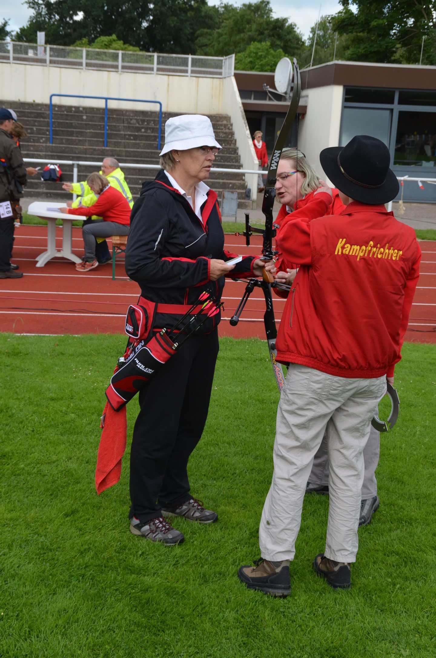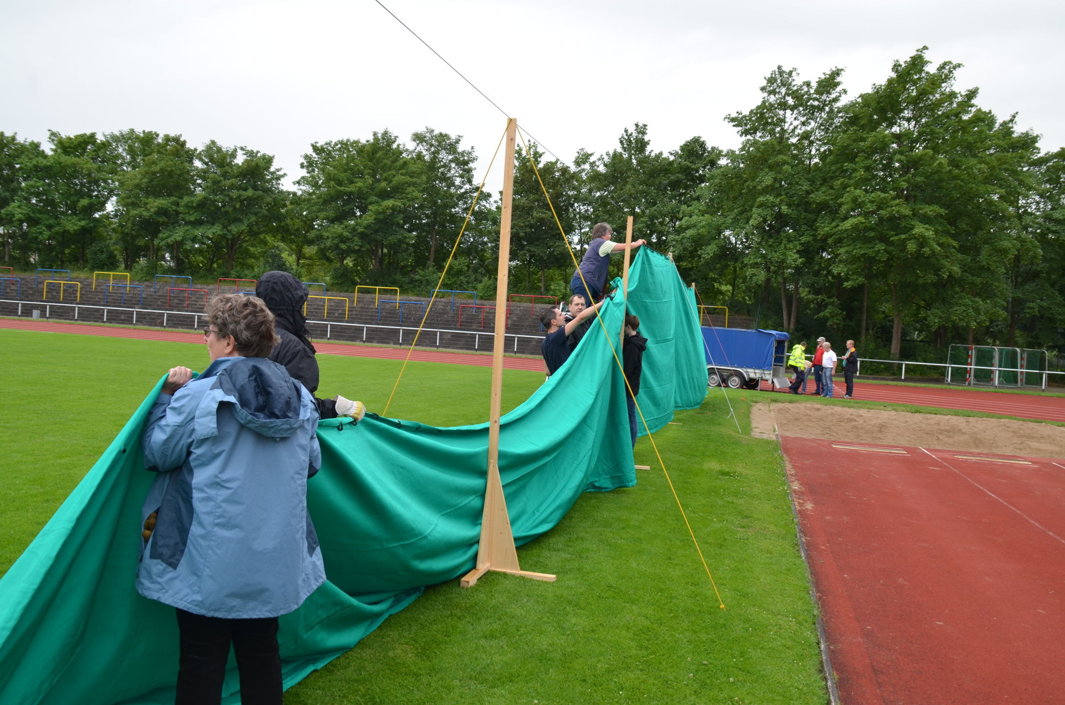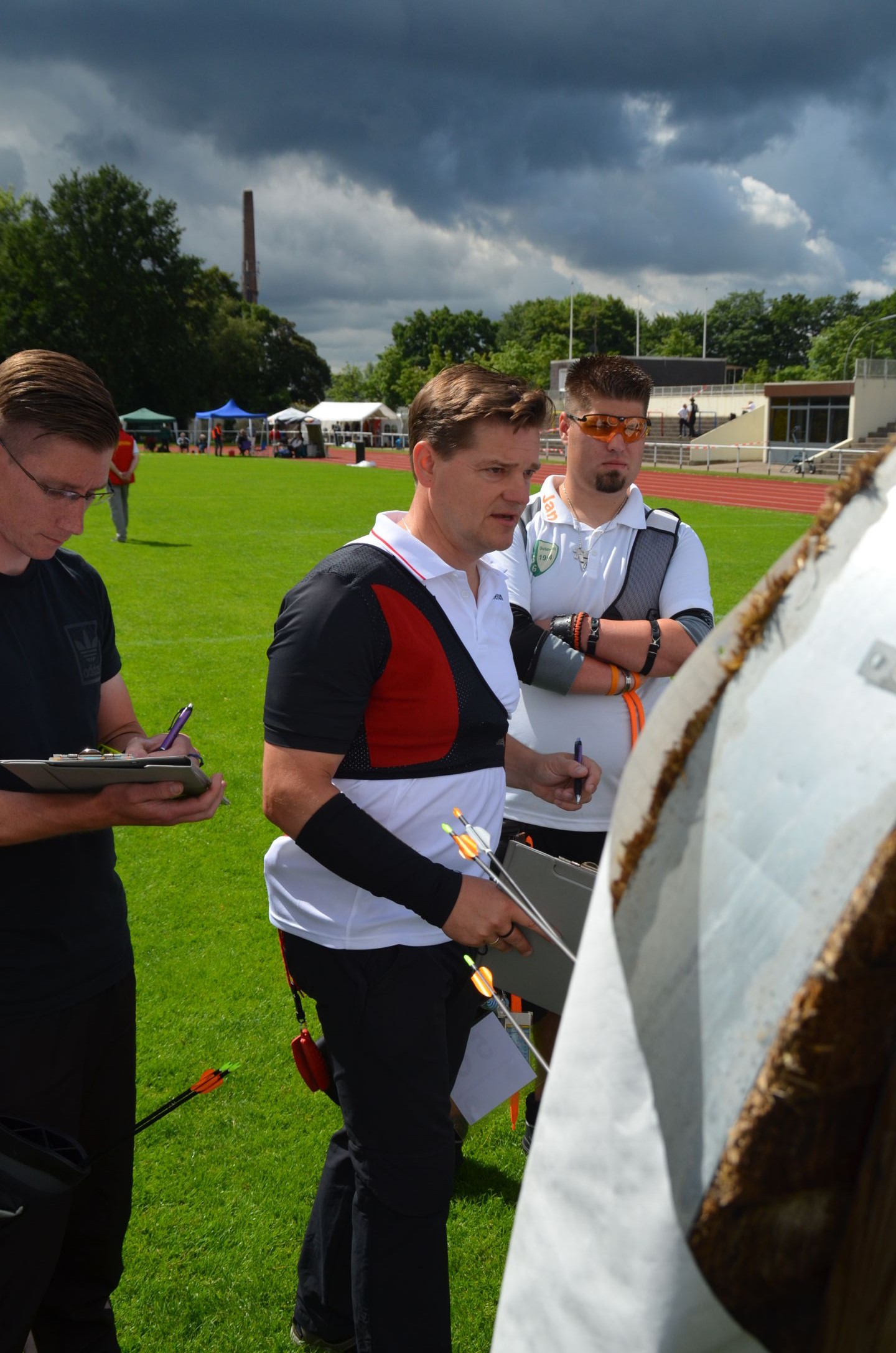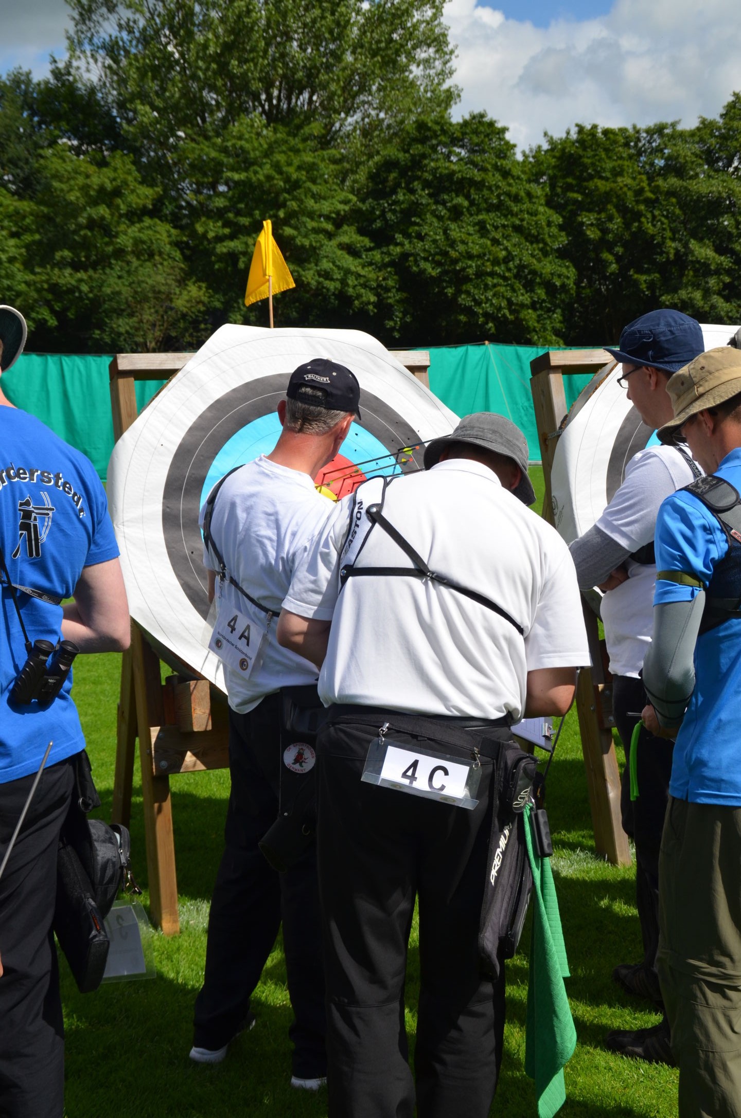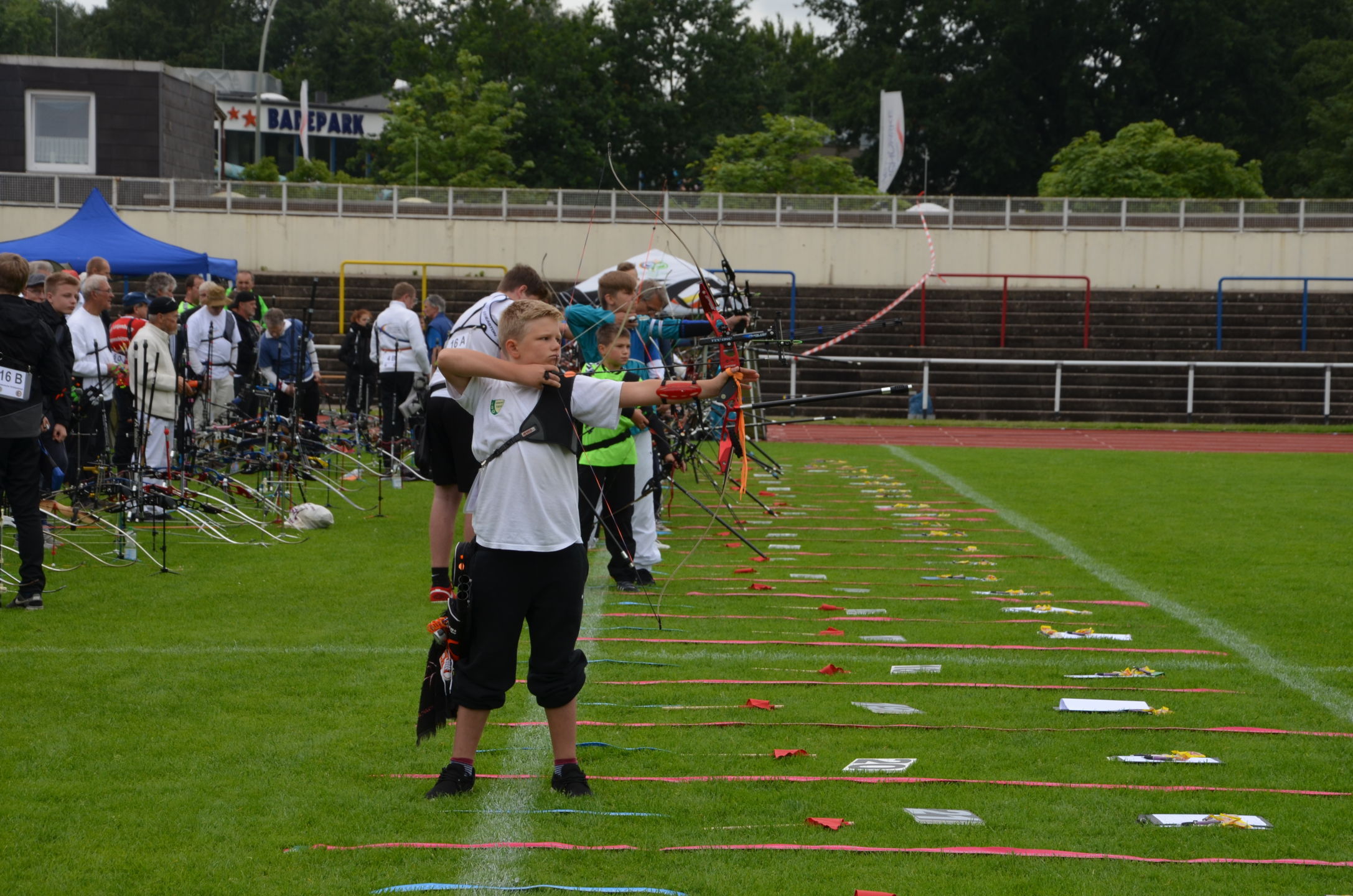 | Für die Helfer begann jeder Wettkampftag mit den Vorbereitungen um 8 Uhr: Aufstellen von Pavillons, die Installation der Ampeln und Beschallungsanlage, der Aufbau der Sicherungsnetze gegen verirrte Pfeile und natürlich die Verpflegung, Kaffee kochen und Brötchen belegen. |