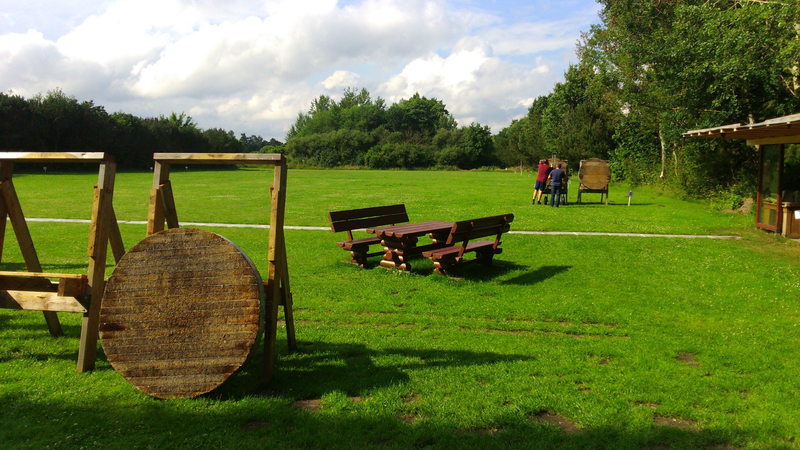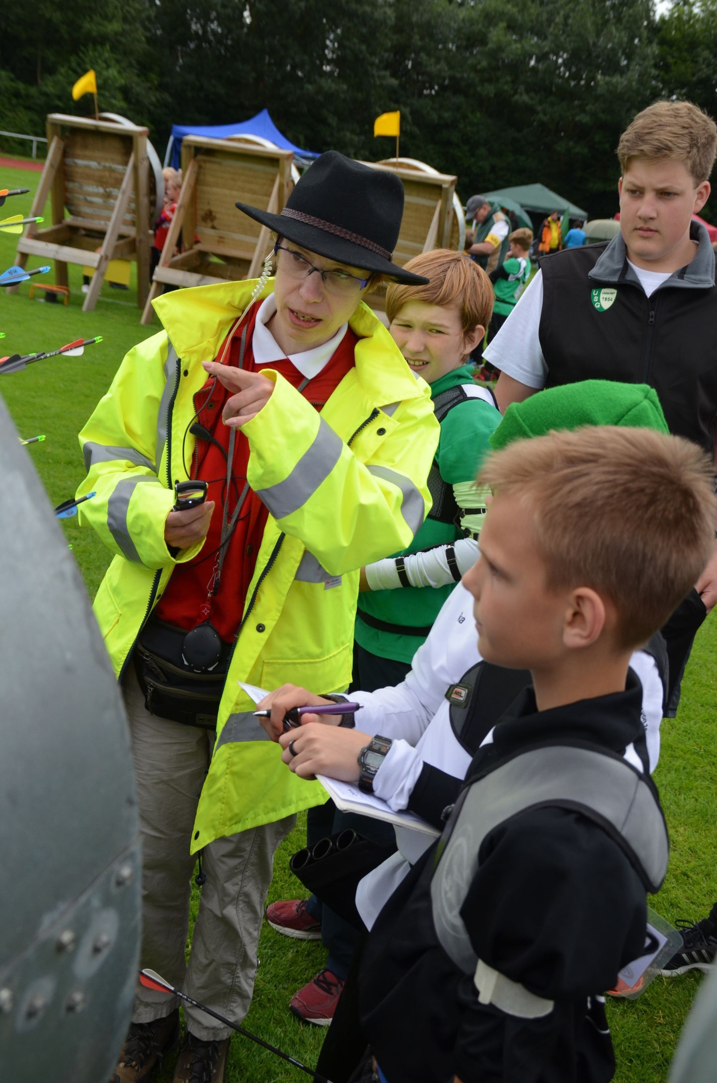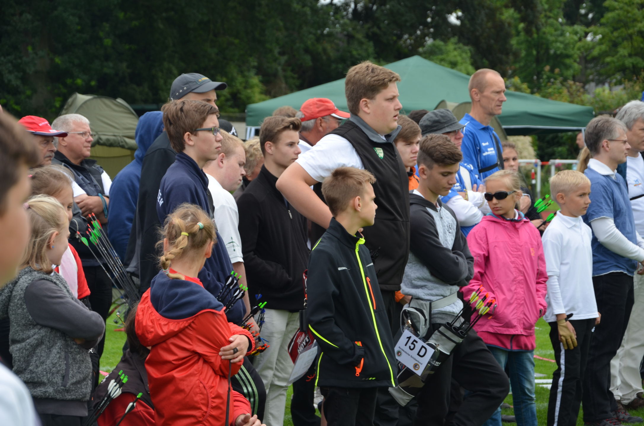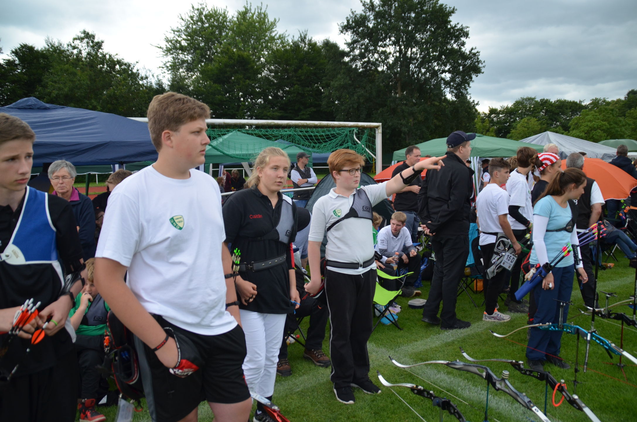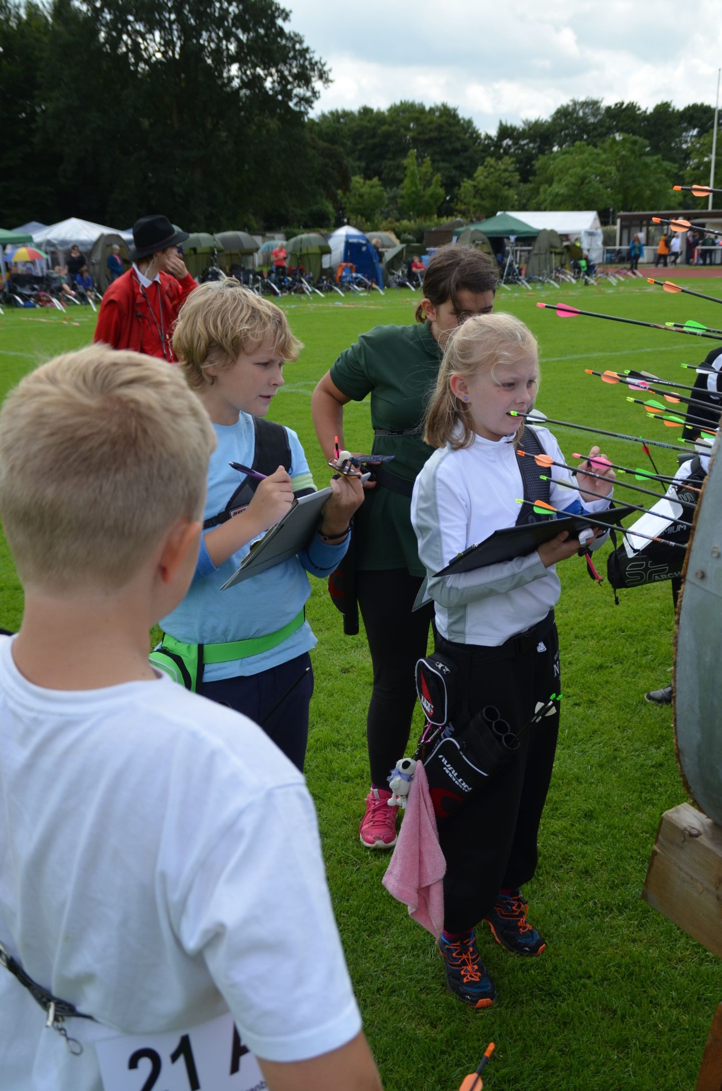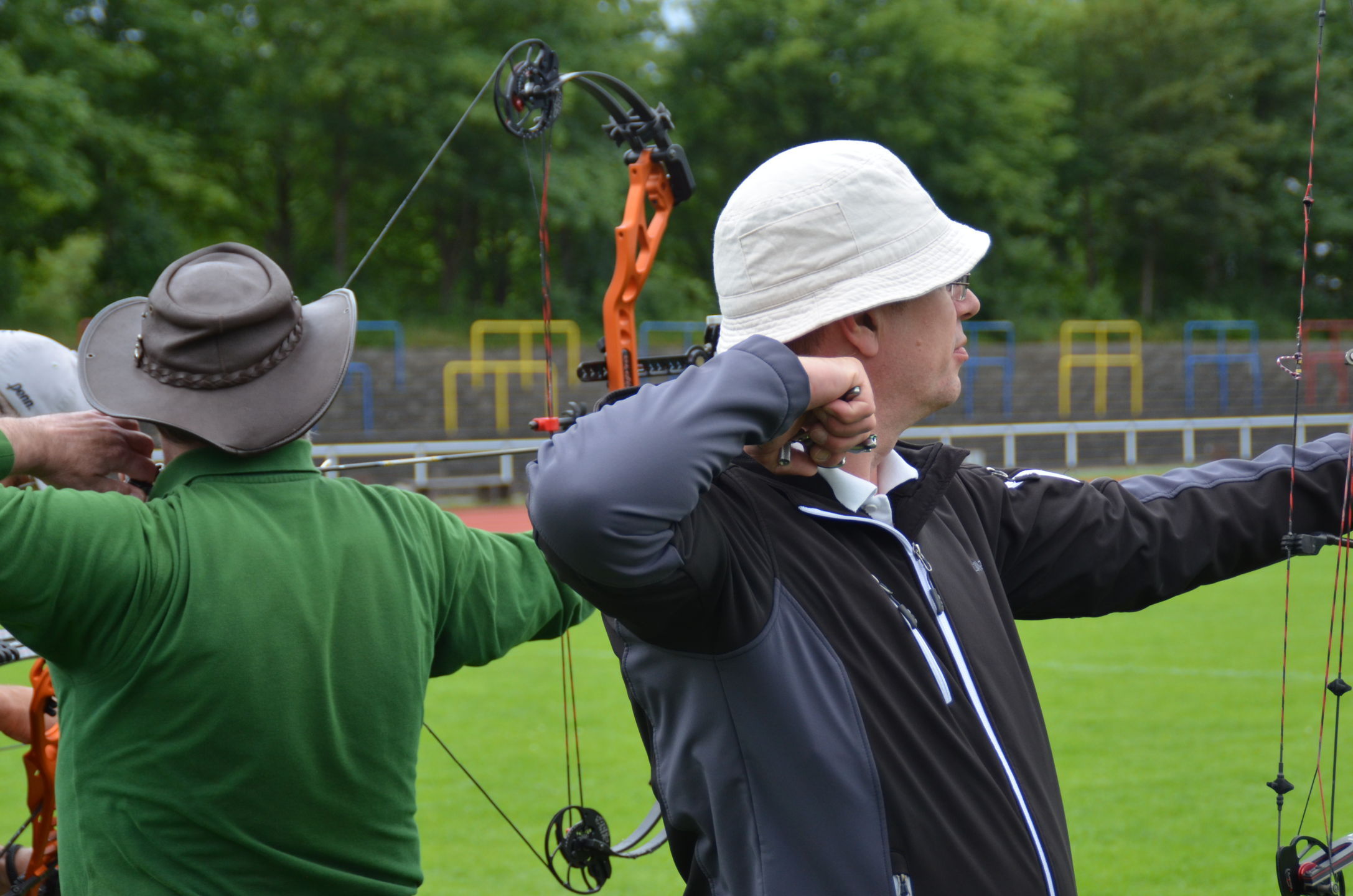 | Für die Helfer begann jeder Wettkampftag mit den Vorbereitungen um 8 Uhr: Aufstellen von Pavillons, die Installation der Ampeln und Beschallungsanlage, der Aufbau der Sicherungsnetze gegen verirrte Pfeile und natürlich die Verpflegung, Kaffee kochen und Brötchen belegen. |