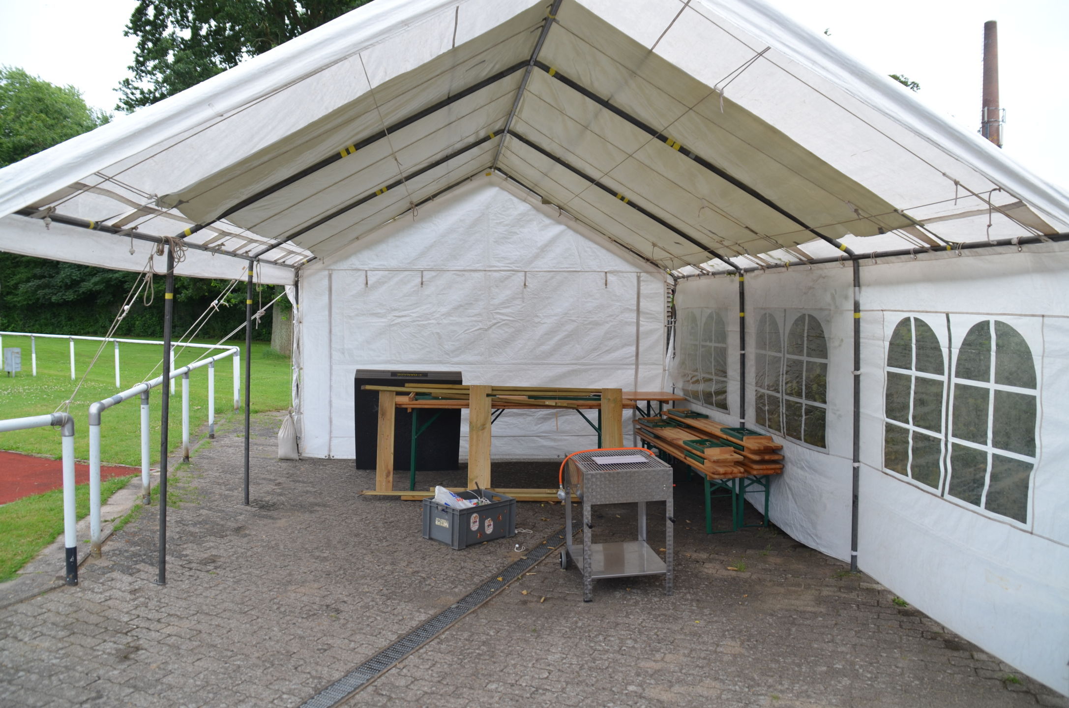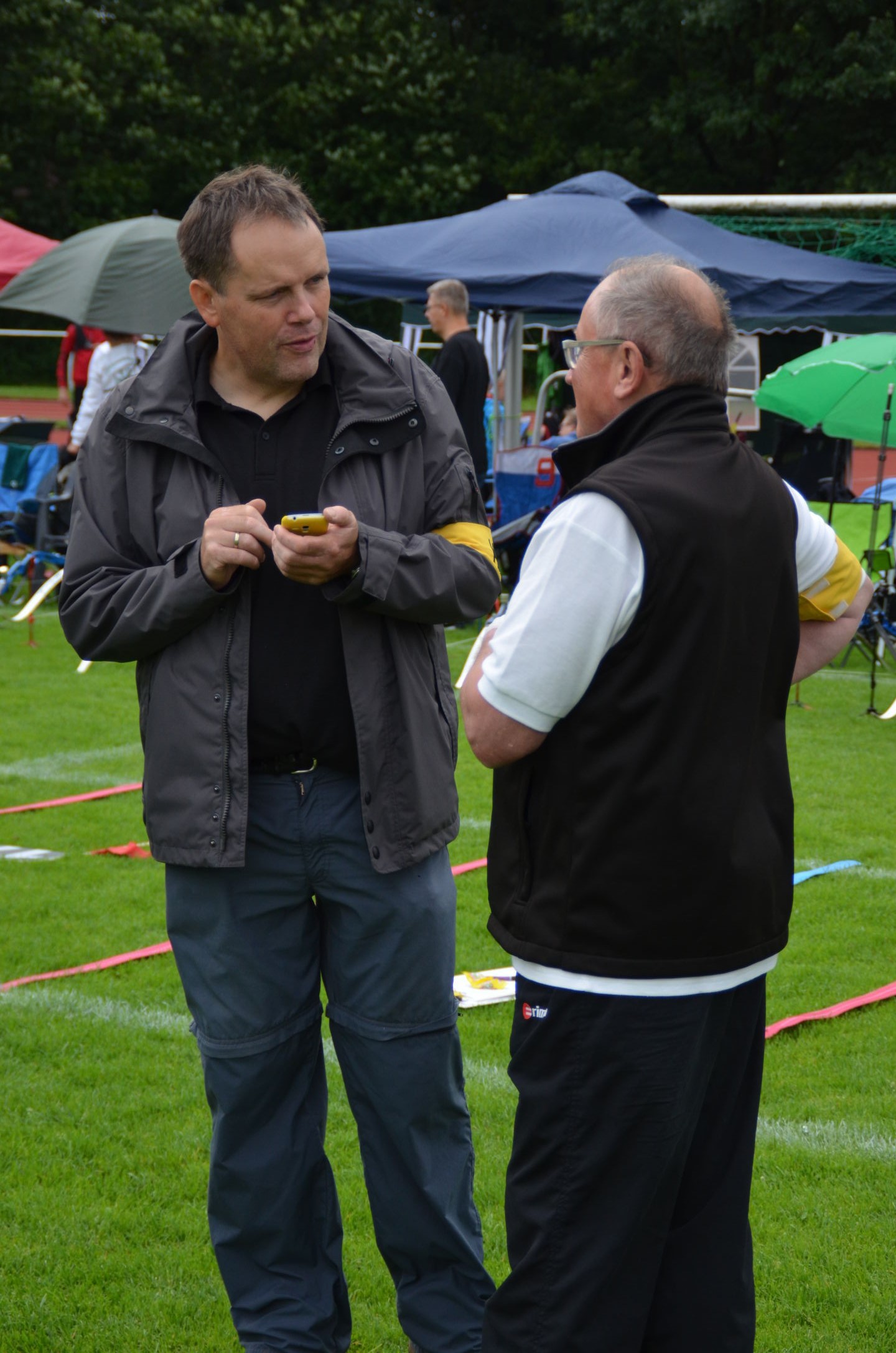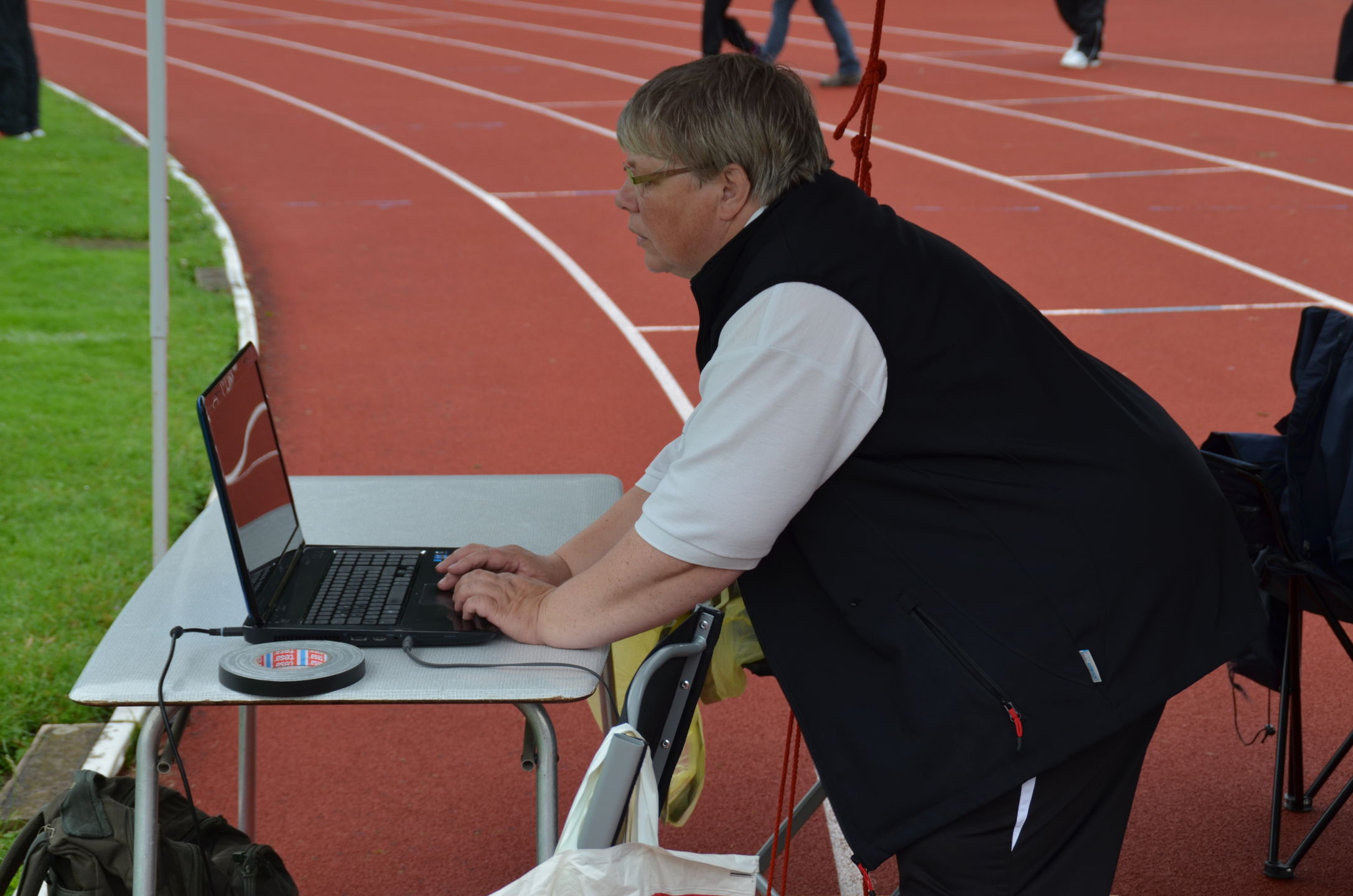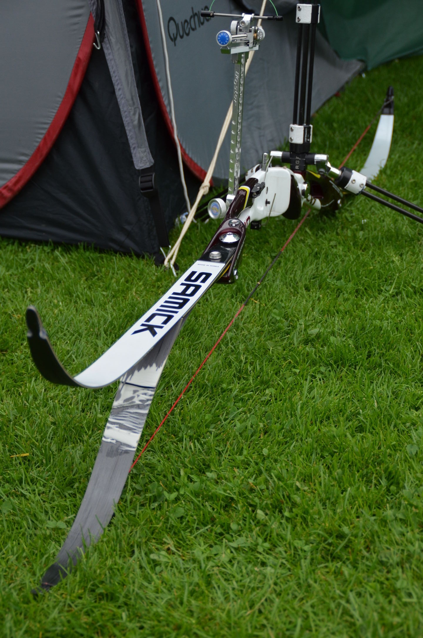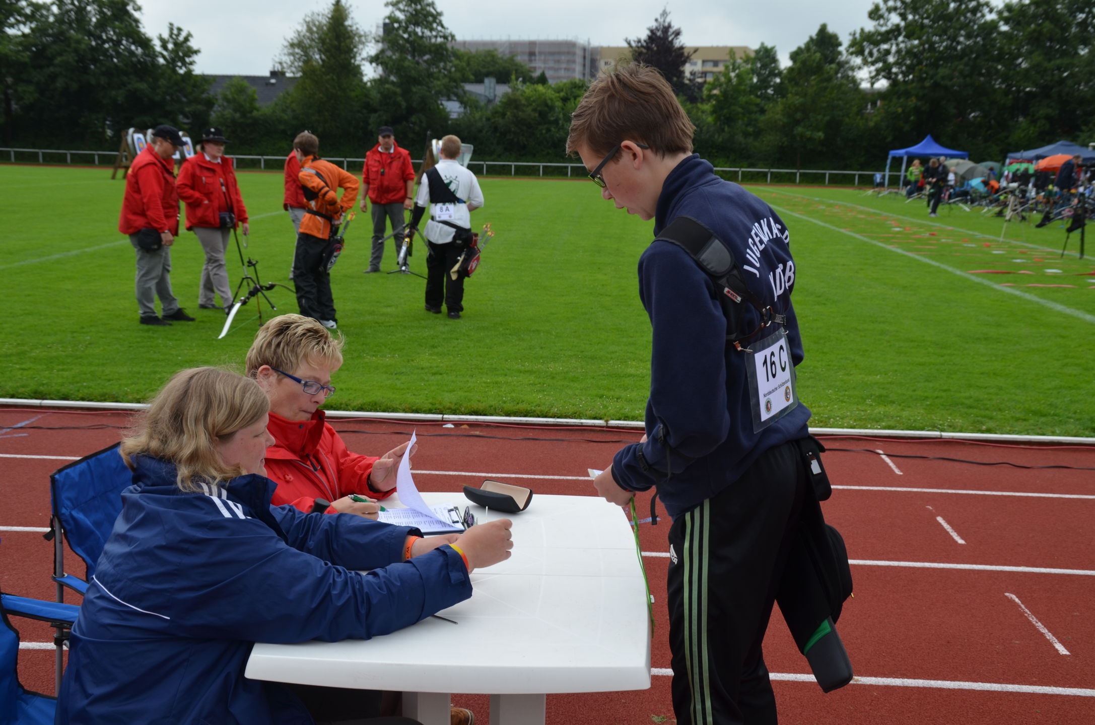 | Für die Helfer begann jeder Wettkampftag mit den Vorbereitungen um 8 Uhr: Aufstellen von Pavillons, die Installation der Ampeln und Beschallungsanlage, der Aufbau der Sicherungsnetze gegen verirrte Pfeile und natürlich die Verpflegung, Kaffee kochen und Brötchen belegen. |