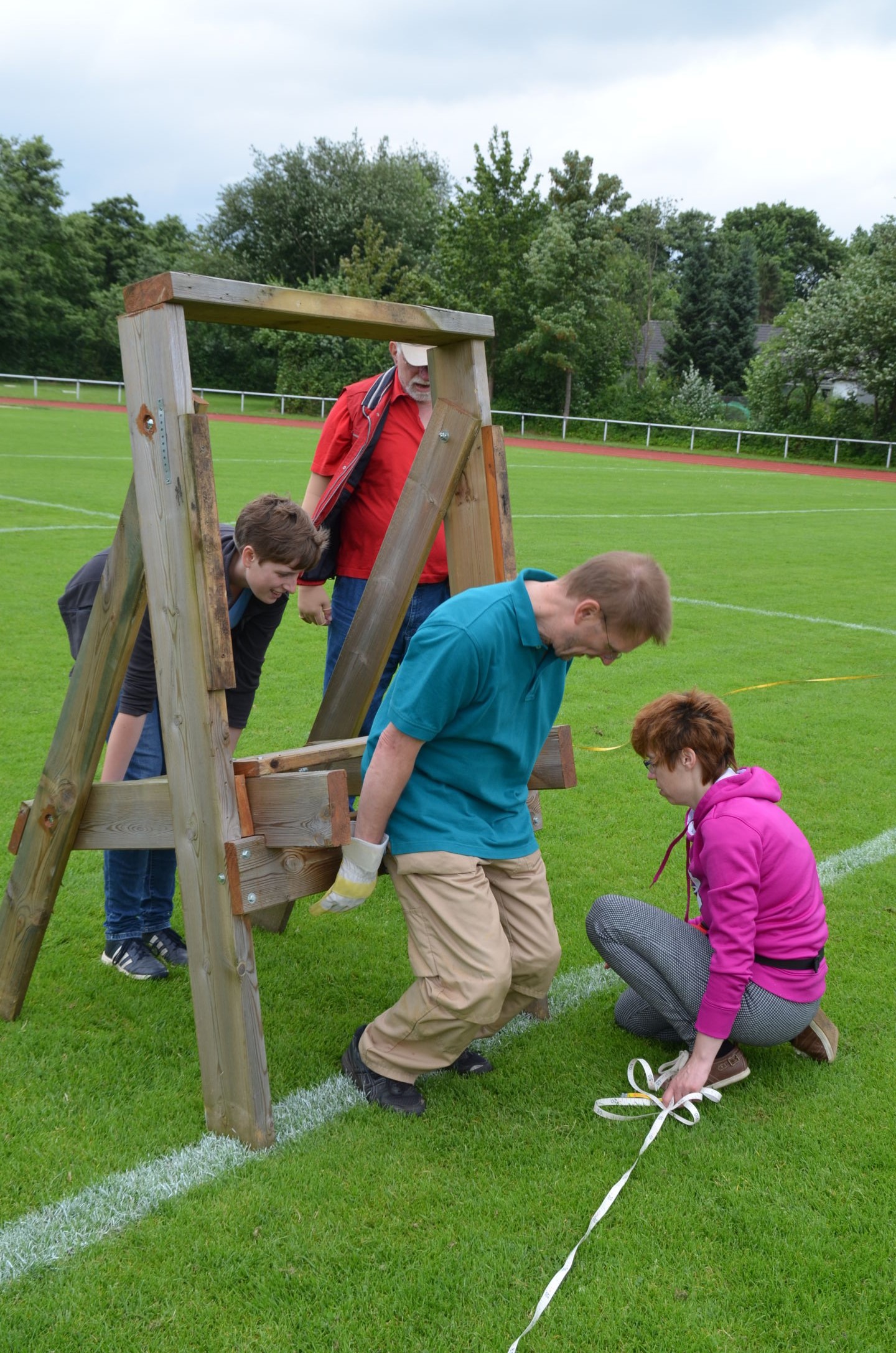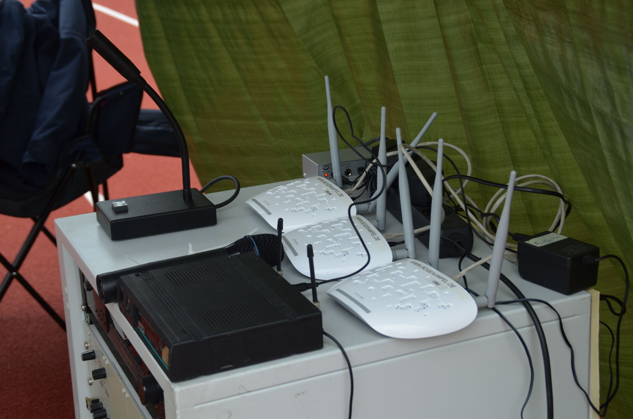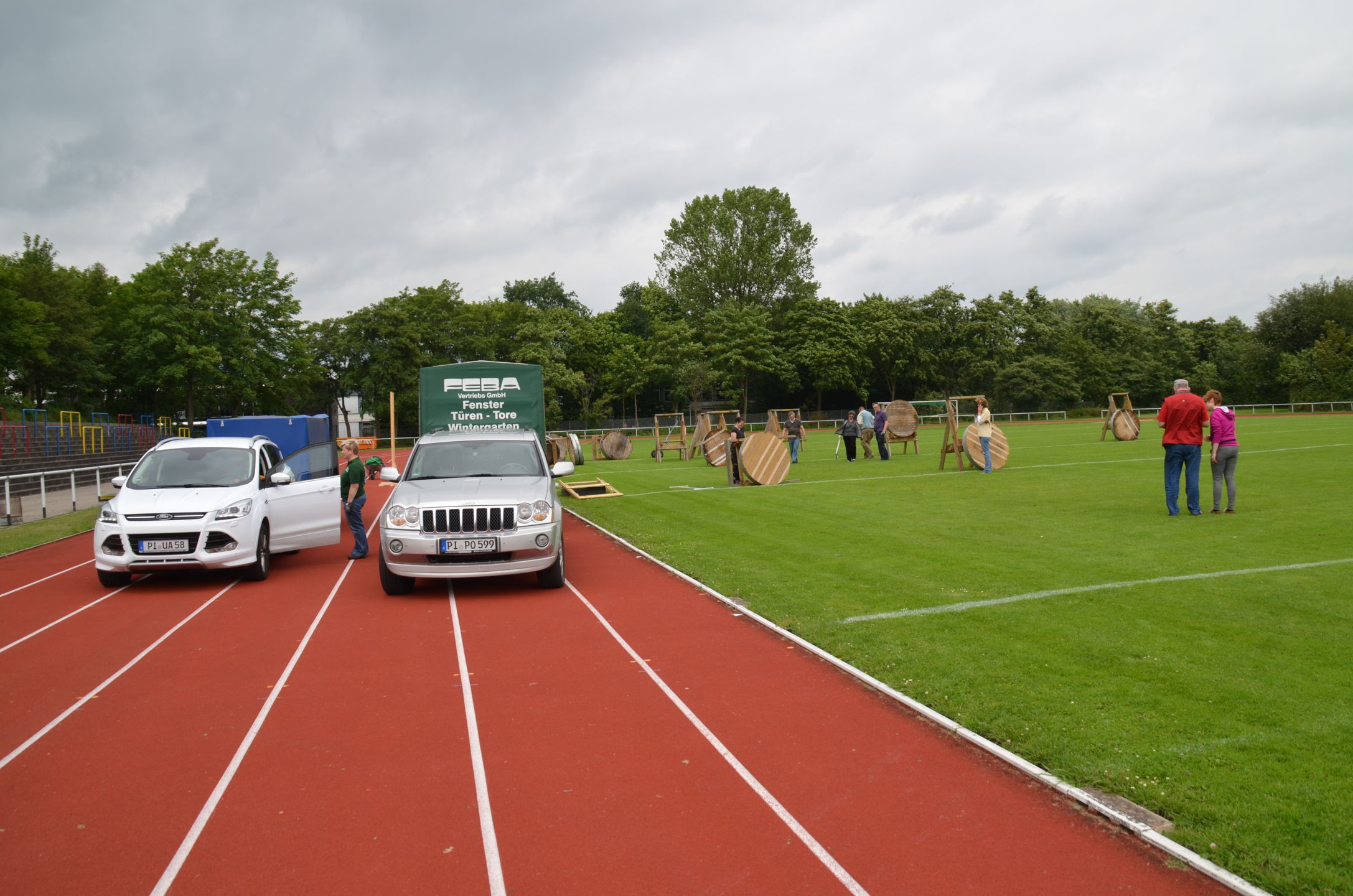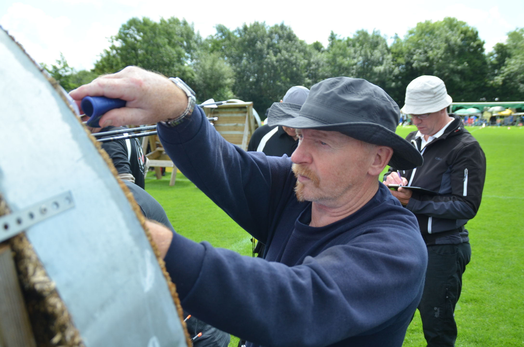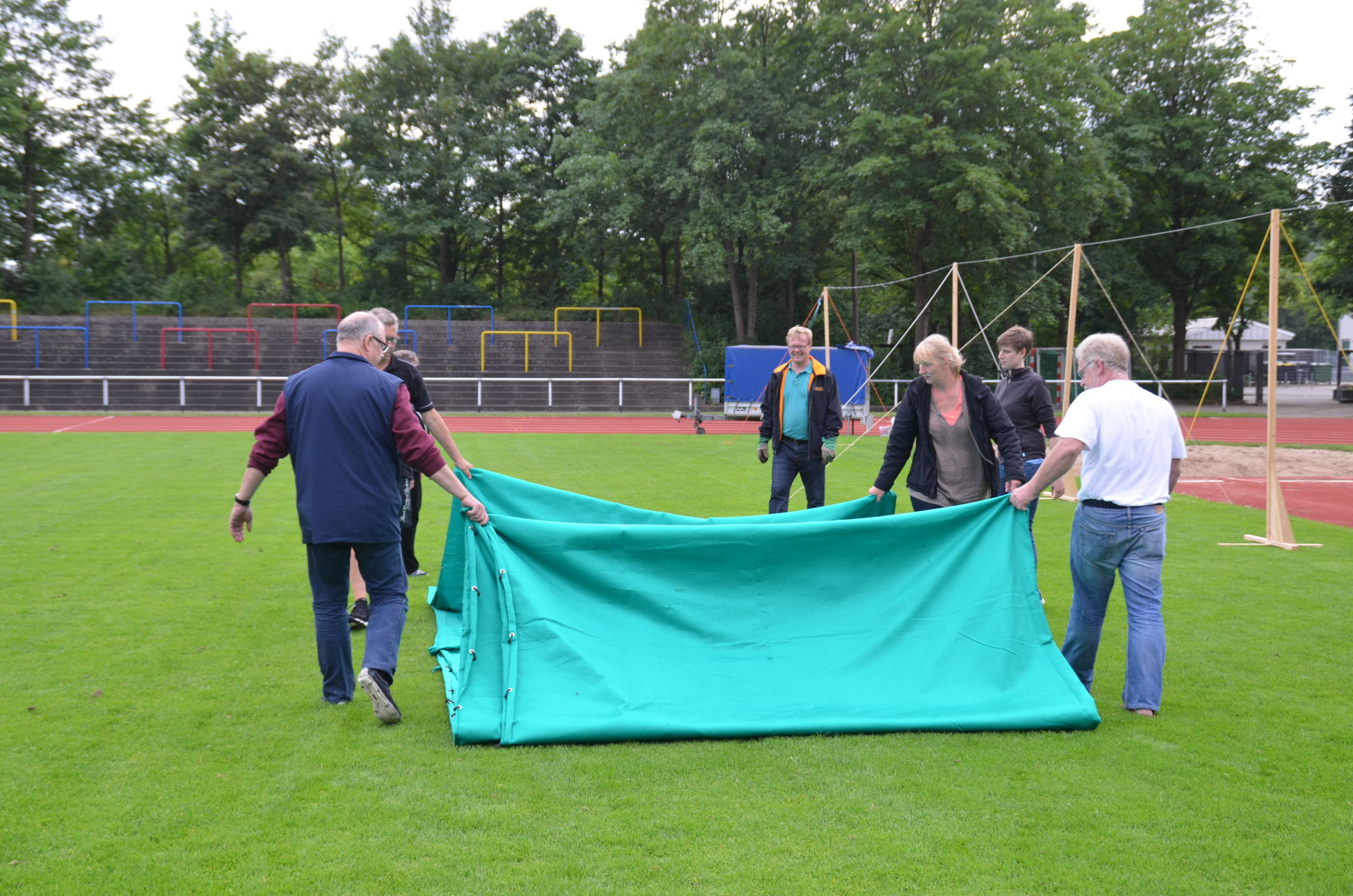 | Für die Helfer begann jeder Wettkampftag mit den Vorbereitungen um 8 Uhr: Aufstellen von Pavillons, die Installation der Ampeln und Beschallungsanlage, der Aufbau der Sicherungsnetze gegen verirrte Pfeile und natürlich die Verpflegung, Kaffee kochen und Brötchen belegen. |
