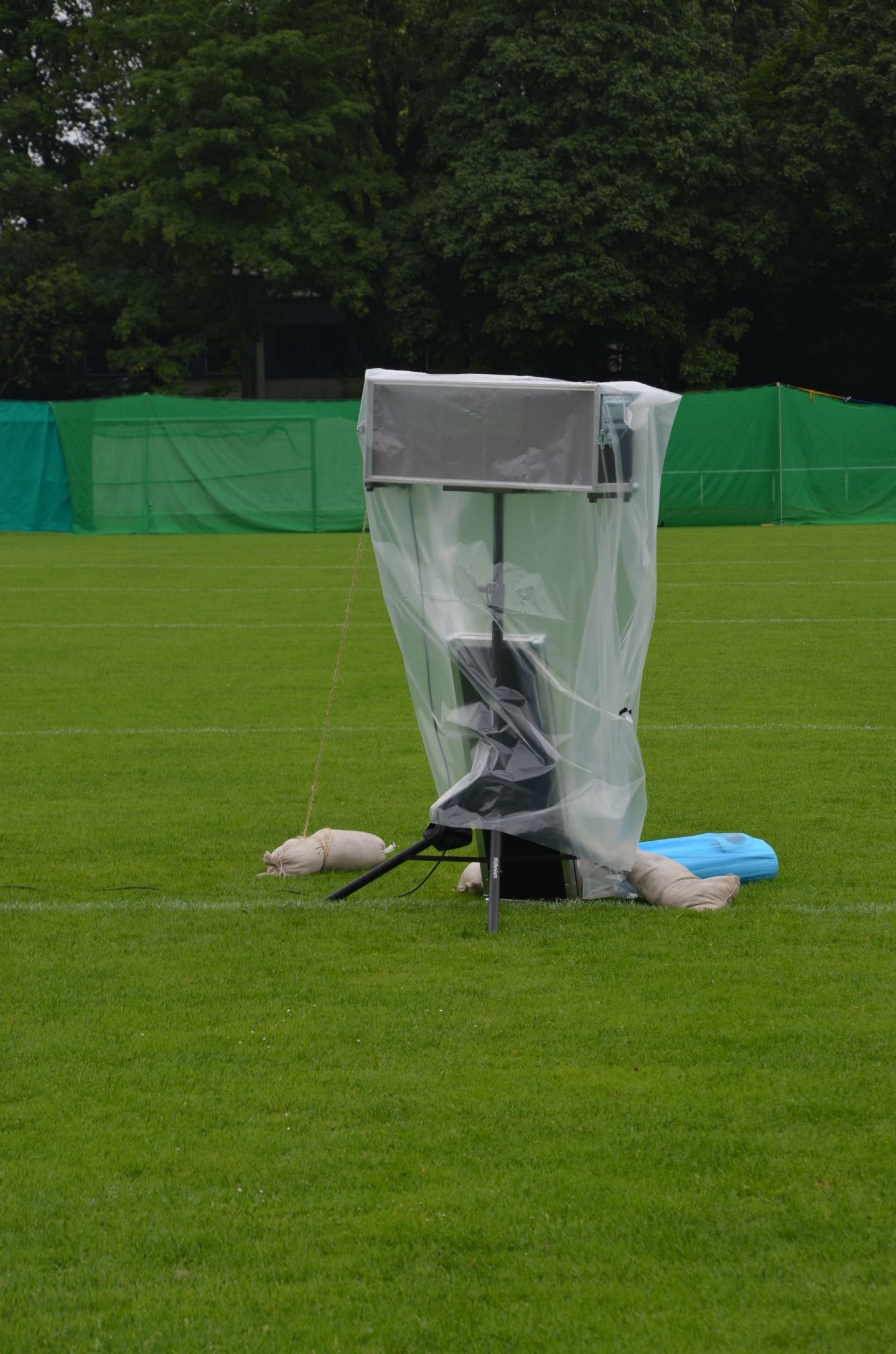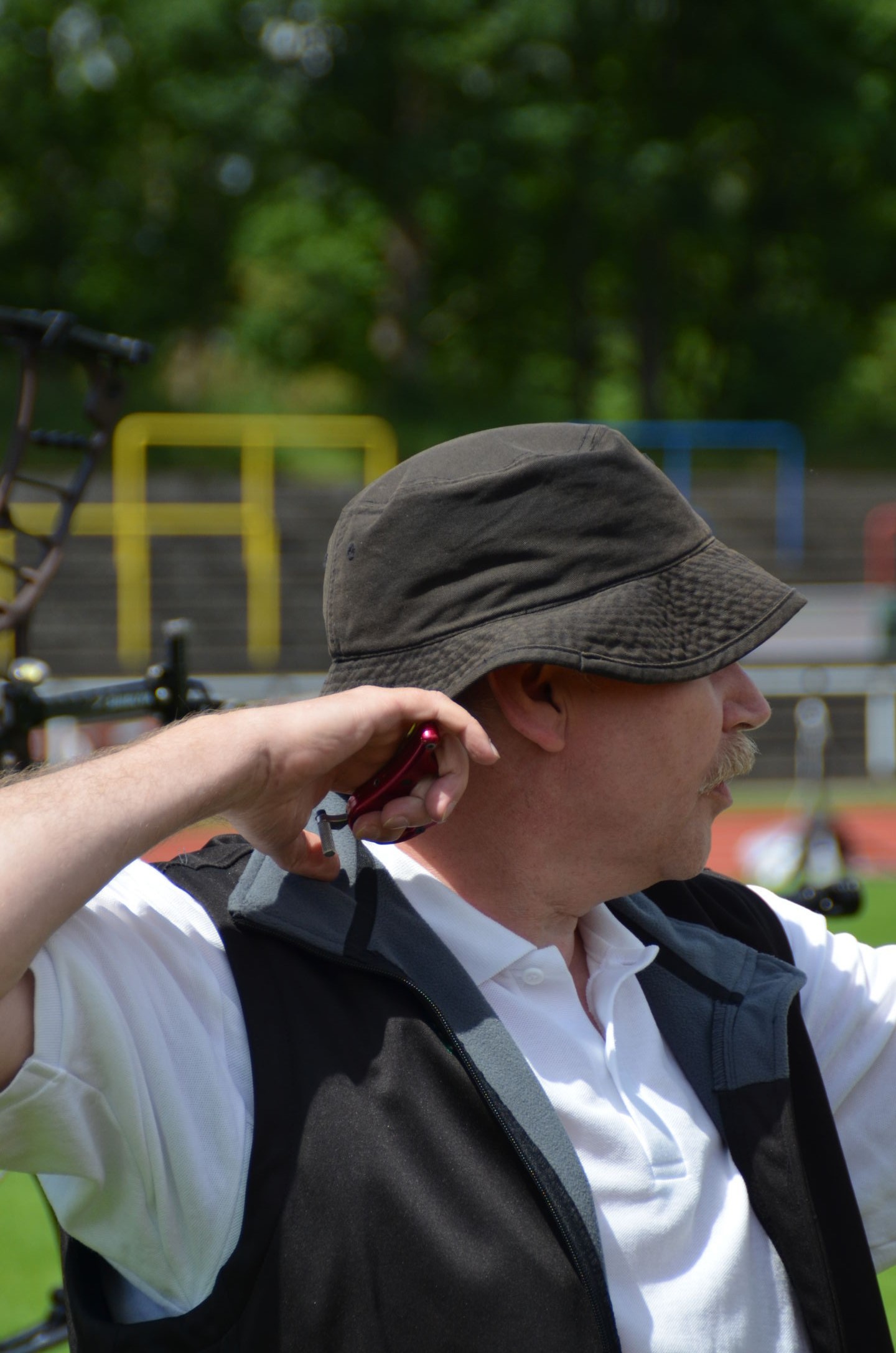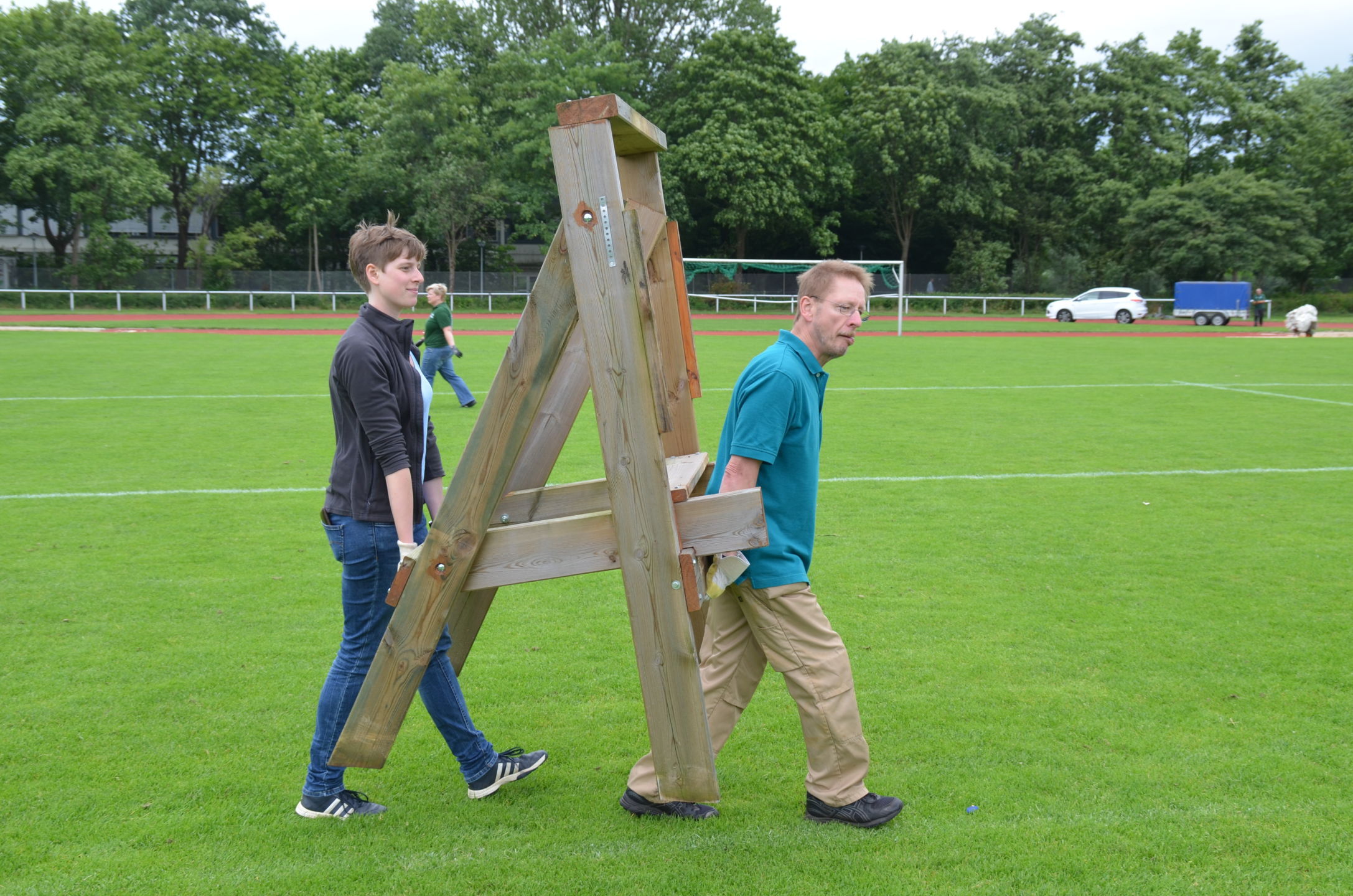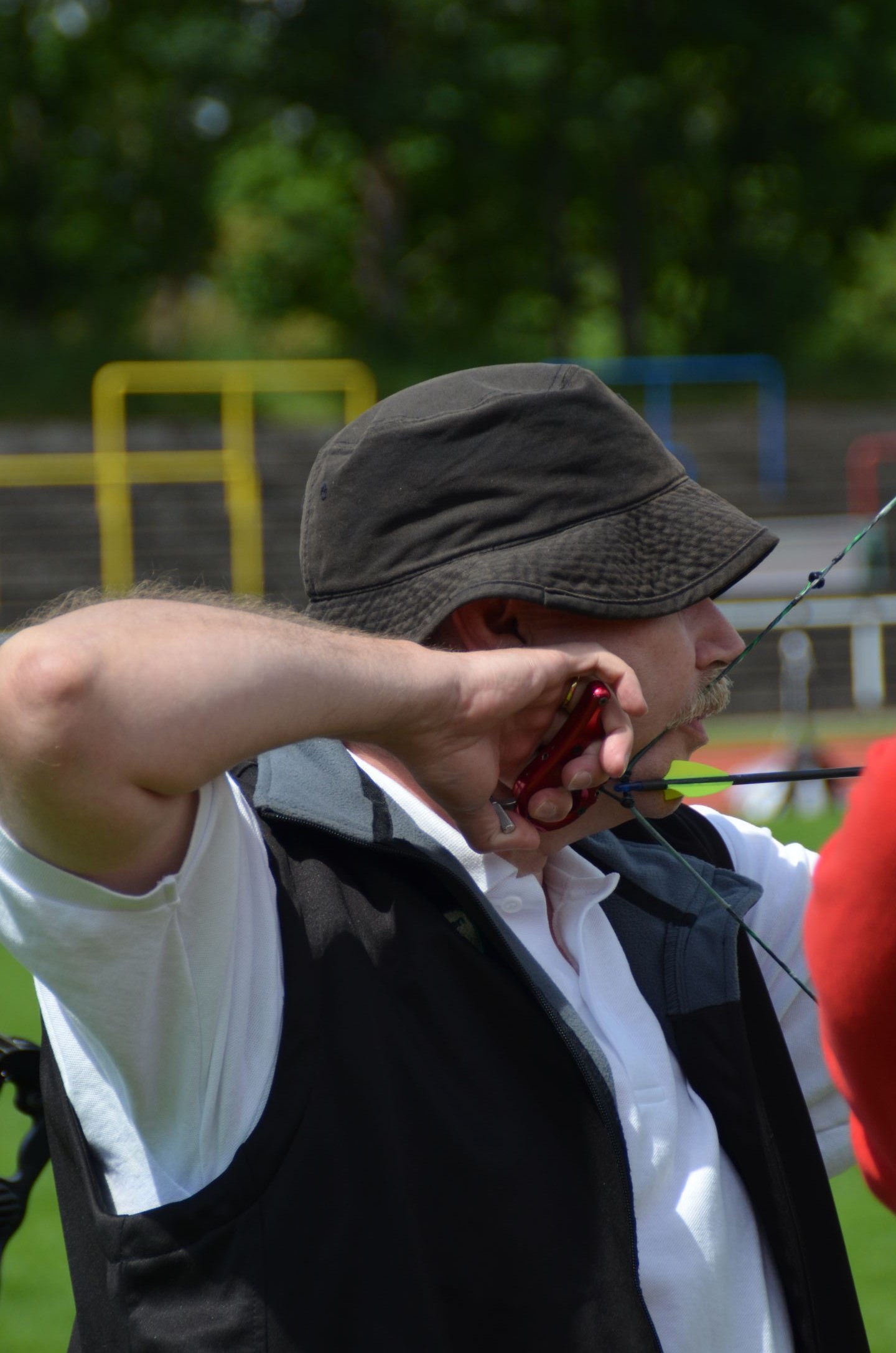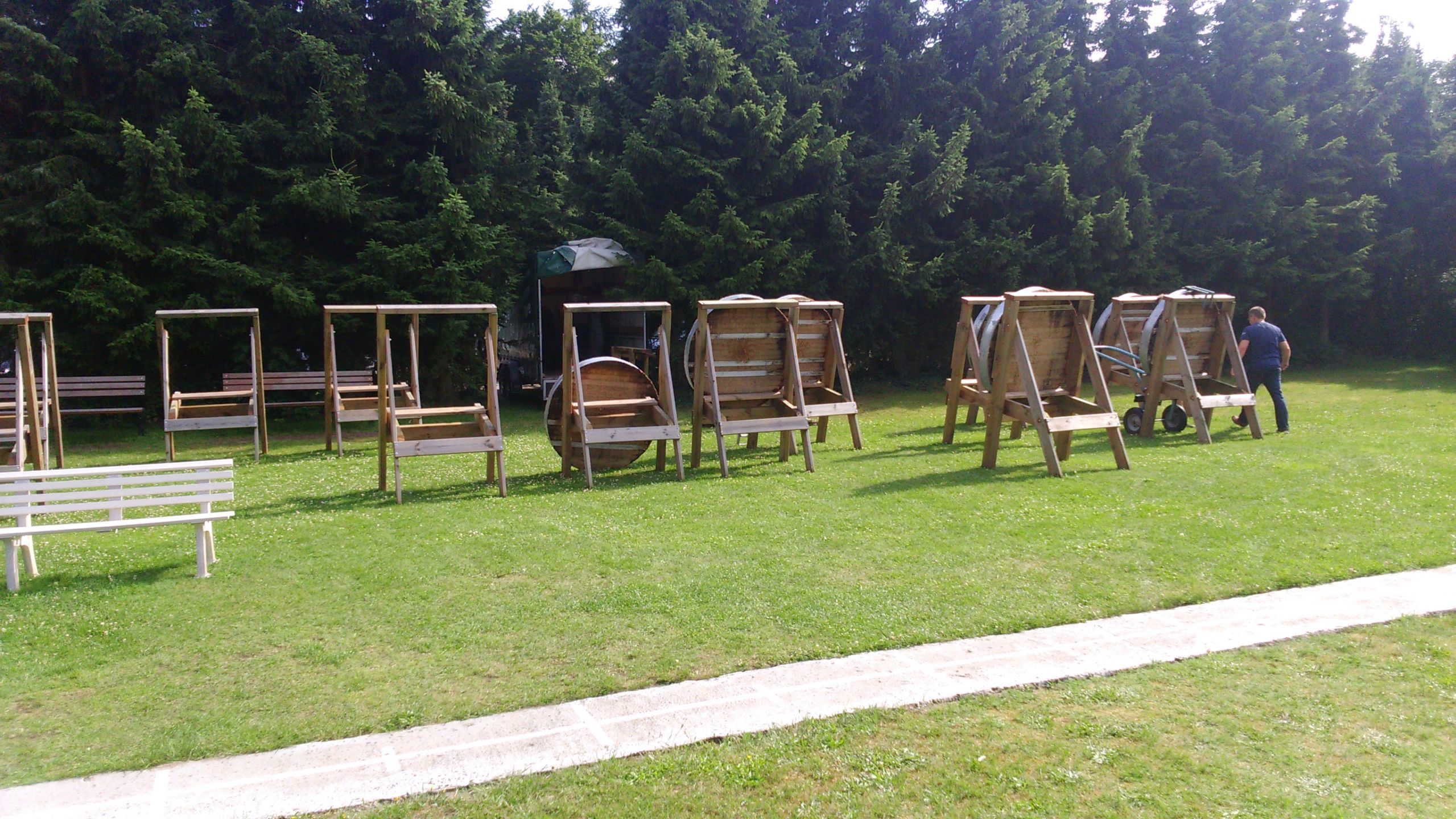 | Für die Helfer begann jeder Wettkampftag mit den Vorbereitungen um 8 Uhr: Aufstellen von Pavillons, die Installation der Ampeln und Beschallungsanlage, der Aufbau der Sicherungsnetze gegen verirrte Pfeile und natürlich die Verpflegung, Kaffee kochen und Brötchen belegen. |