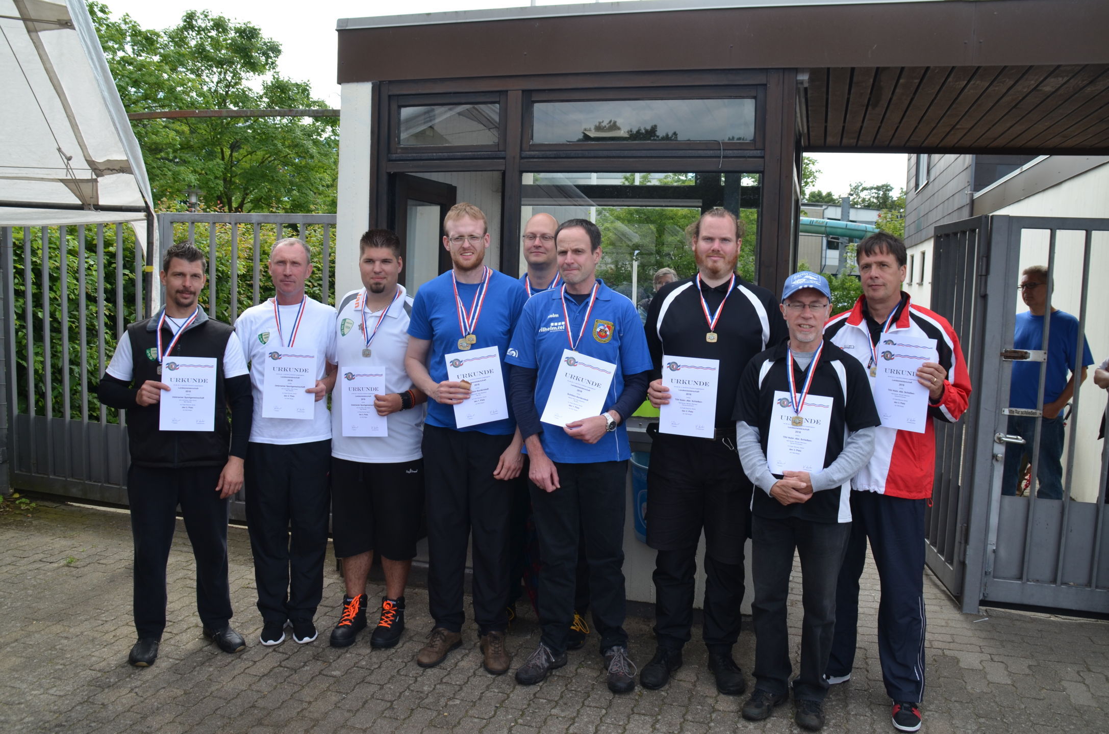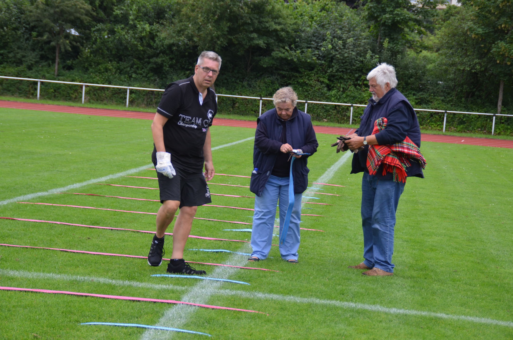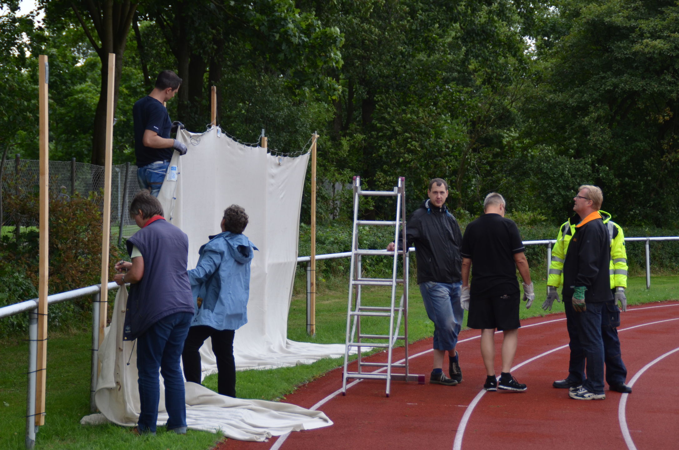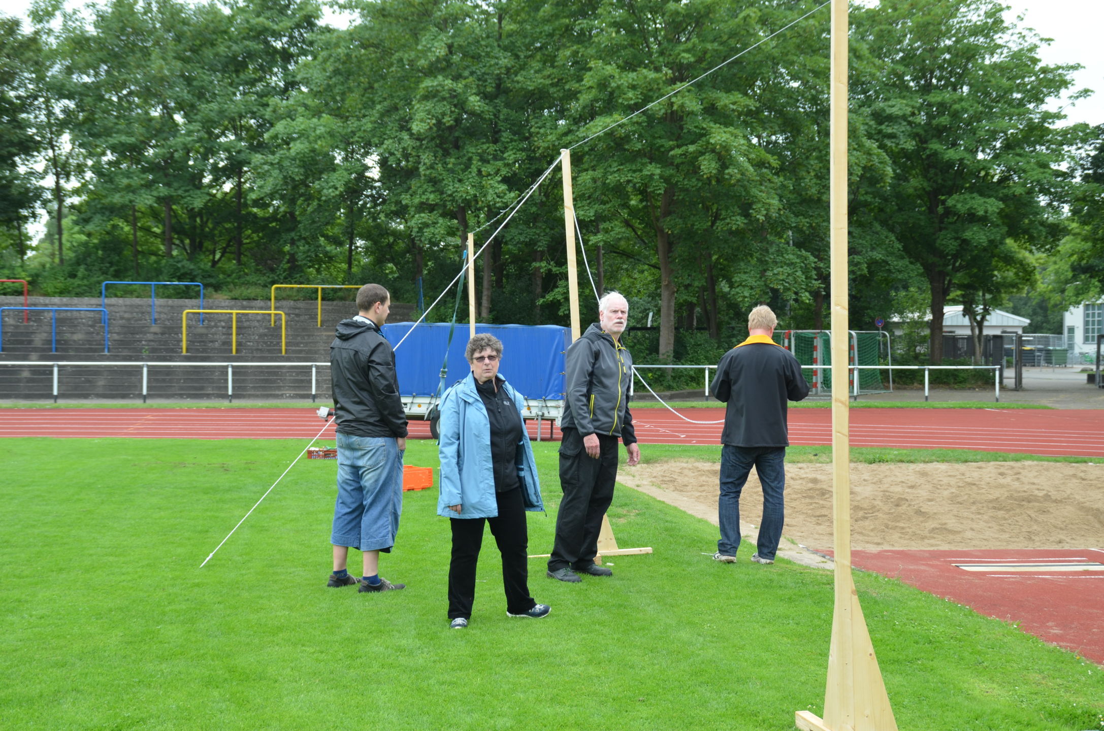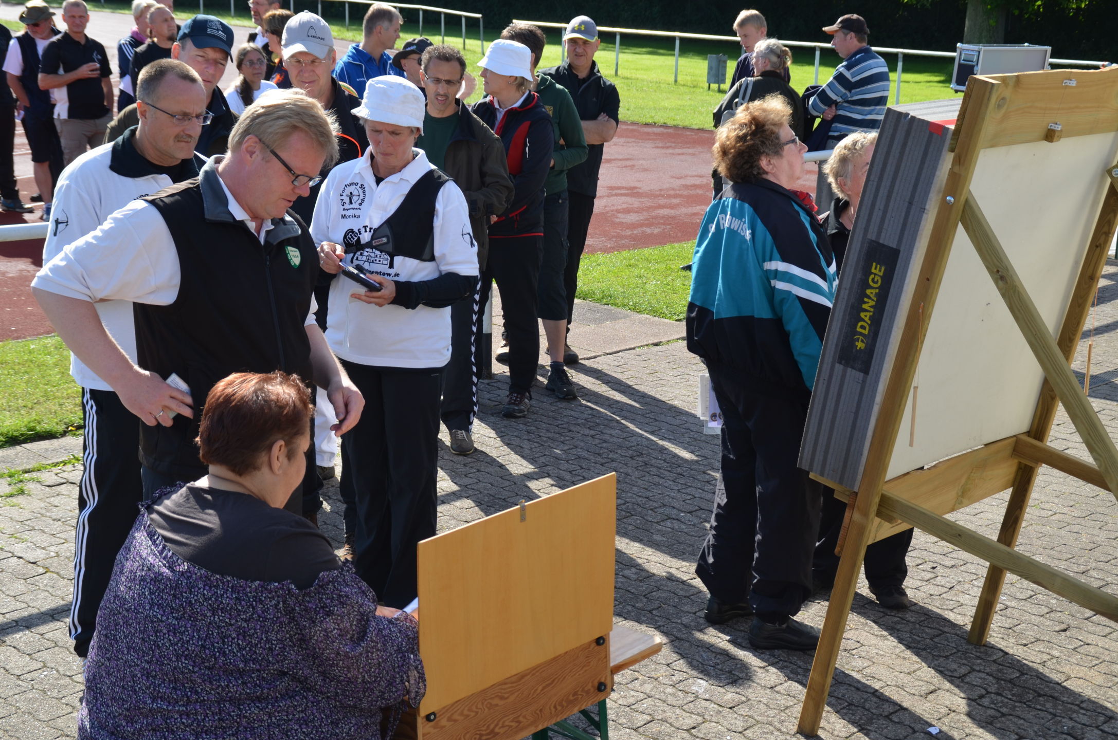 | Ab Freitag Mittag stand dann das Krückau-Stadion für den Aufbau der Scheiben, die Markierung der Schießlinie und Vorbereitung der Netzaufhängung zur Verfügung. Ab 18 Uhr konnte die Abnahme durch die verantwortlichen Kampfrichter und diesmal zusätzlich durch den technischen Delegierten des Deutschen Schützenbundes (DSB), Volker Dahm, erfolgen. Es gab keine Beanstandungen. |