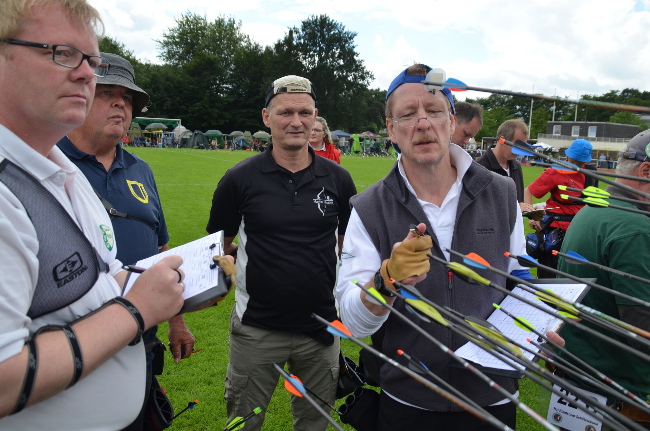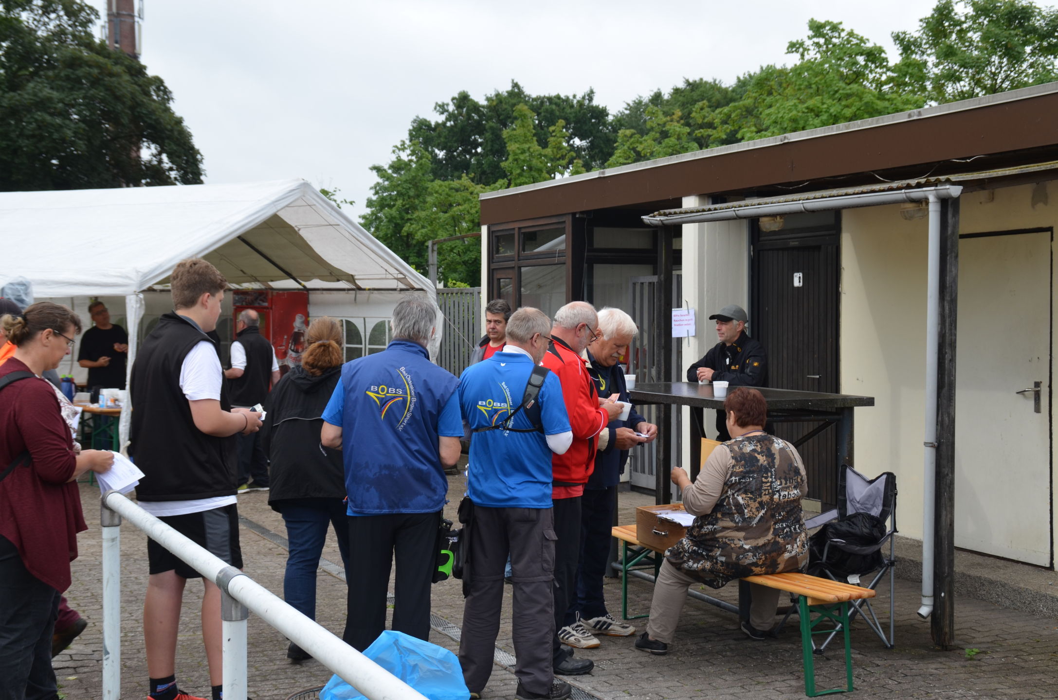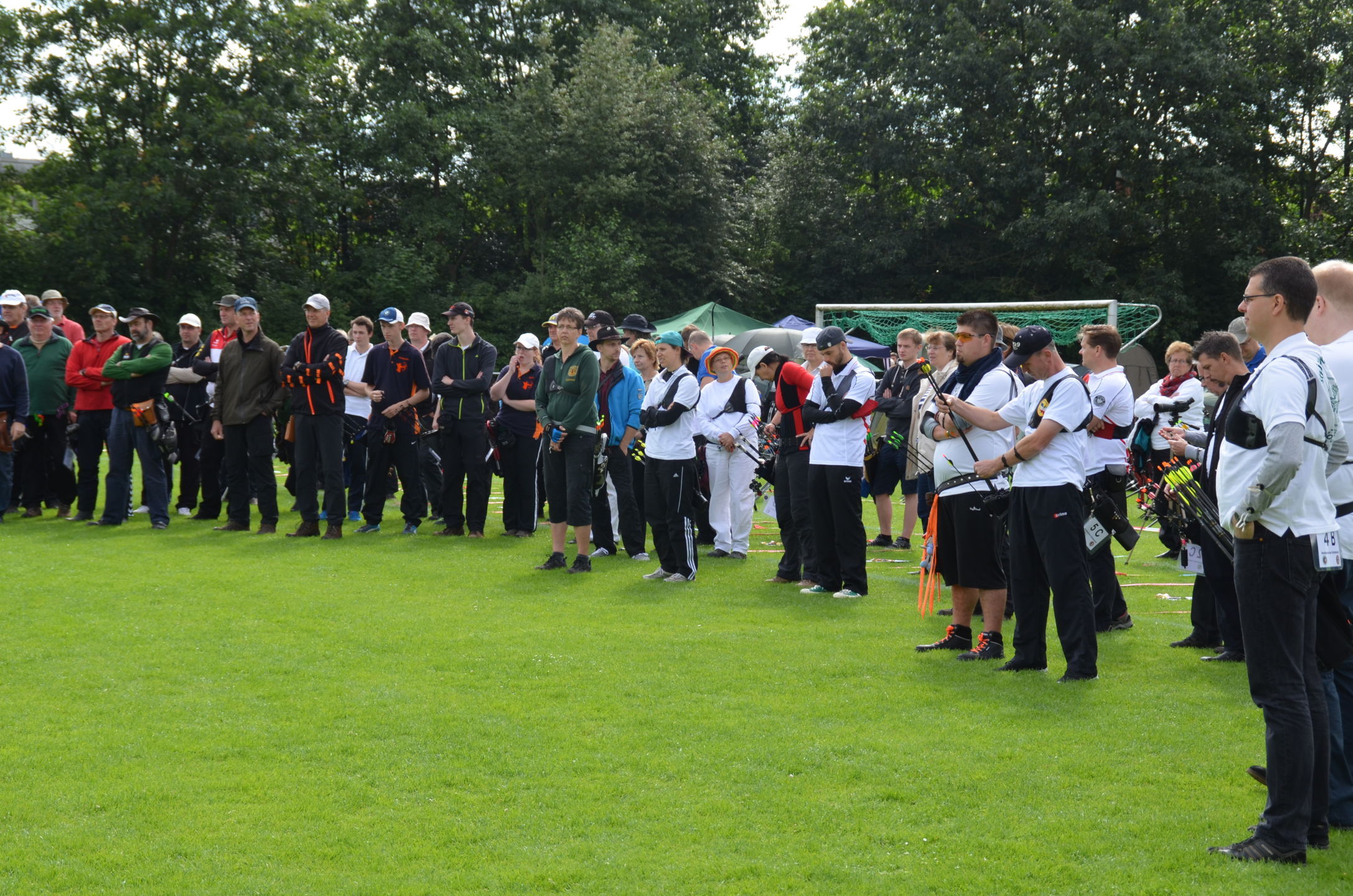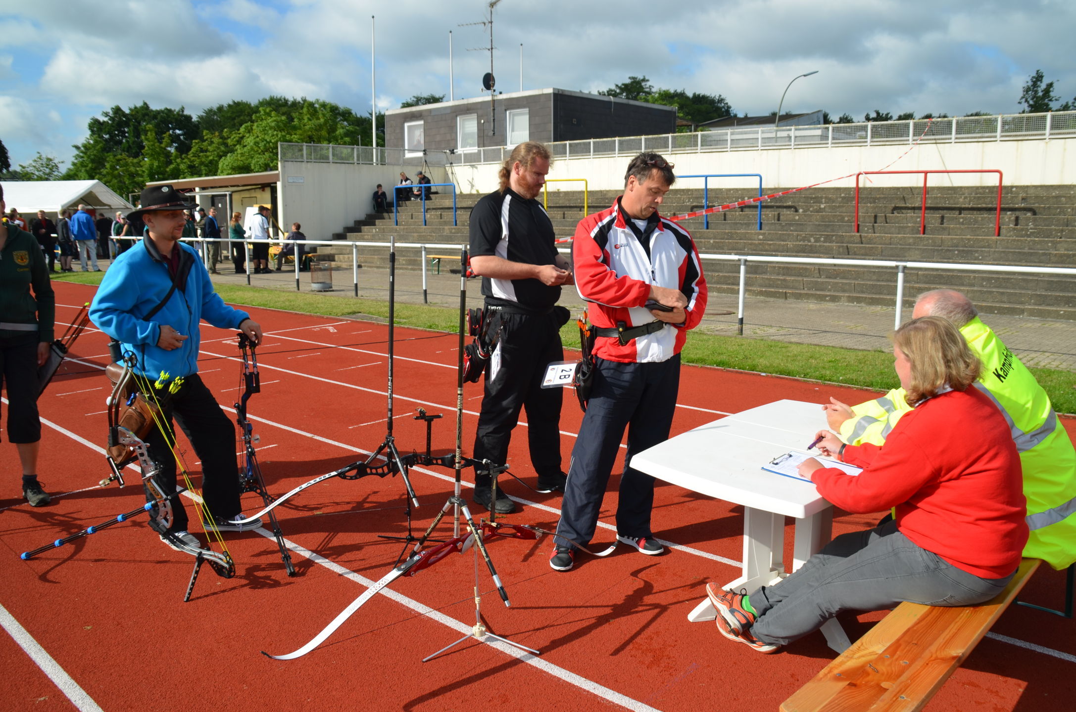 | Kurz danach trafen auch die ersten Teilnehmer ein. Ab 9 Uhr begann die Gerätekontrolle der Bögen, Pfeile etc. durch die Kampfrichter. Pünktlich um 10 Uhr fand die Begrüßung und Einweisung durch Willi Neuhaus und den übrigen 'Offiziellen' statt. |