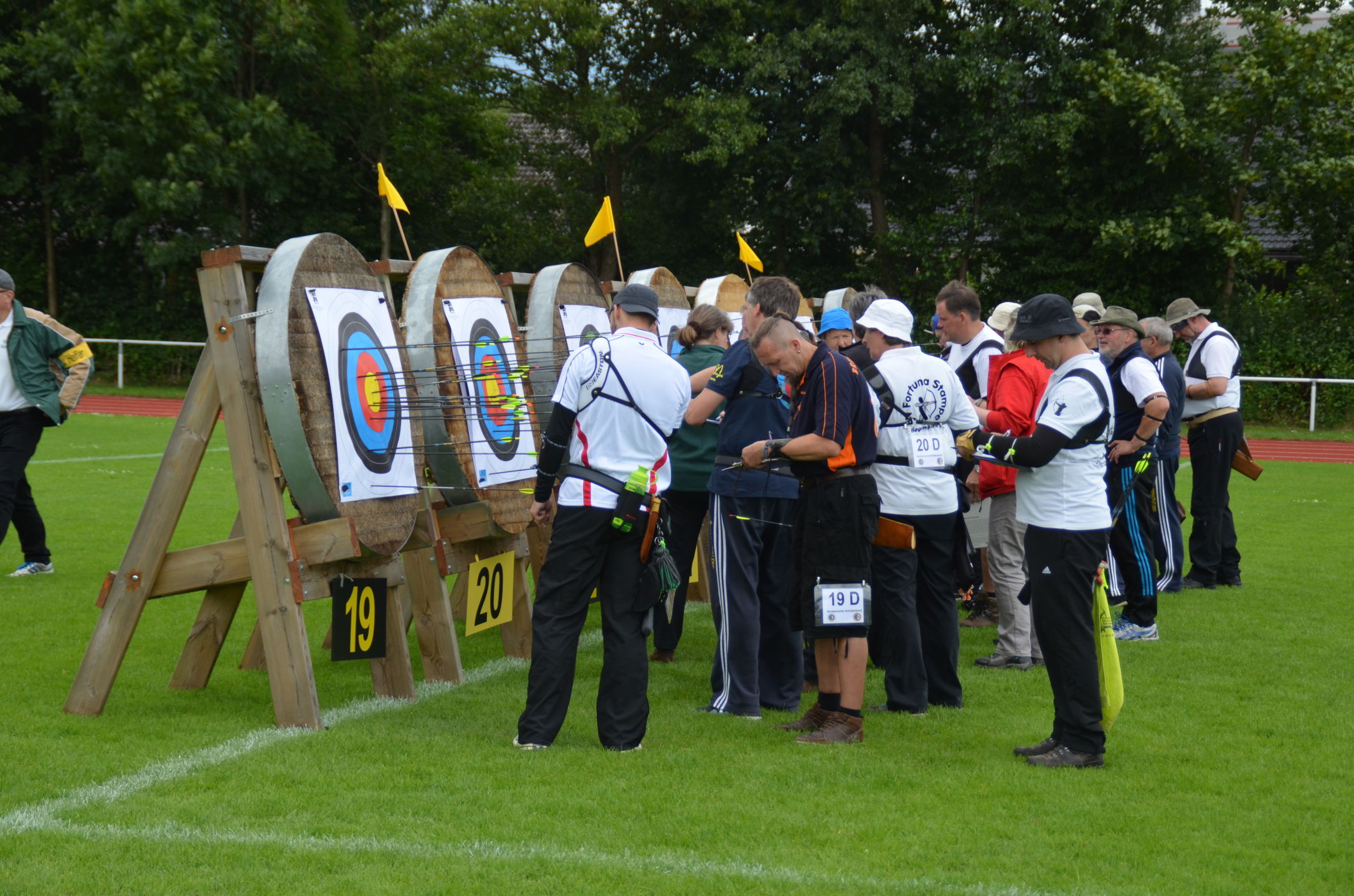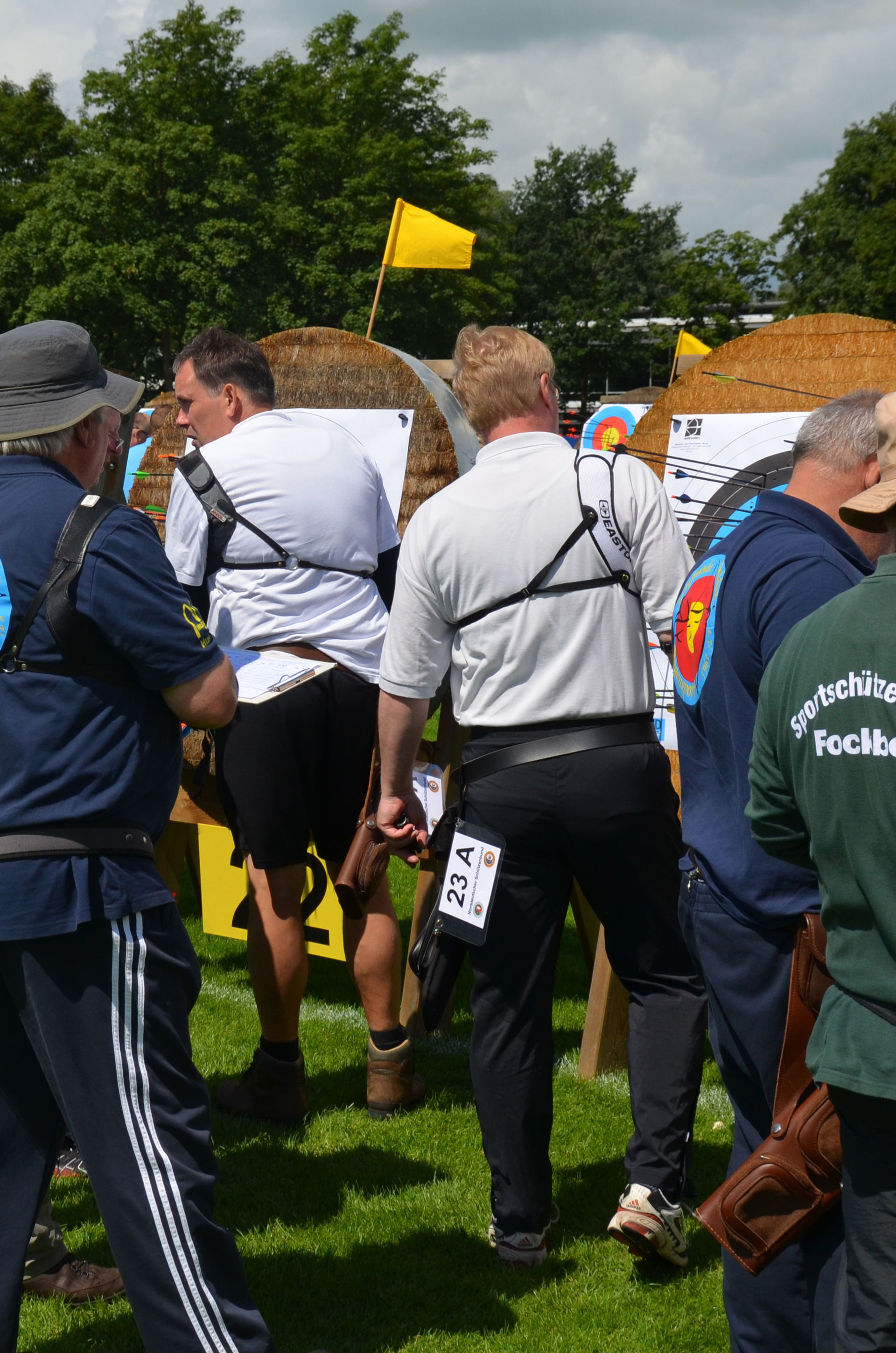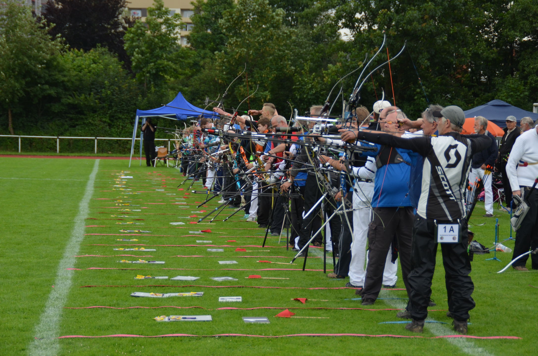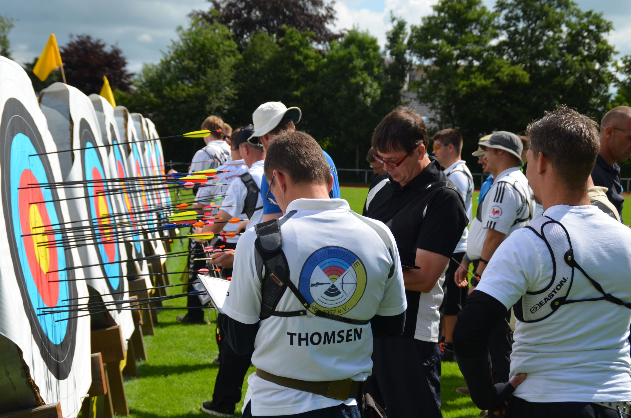Die Landesmeisterschaft (LM) Bogen im Freien sollte dieses Jahr am 2./3. Juli durch die Bogenabteilung der Elmshorner Schützengilde (ESG) ausgerichtet werden. 191 Schützen waren für die zwei Turniertage gemeldet, die auf insgesamt 25 Scheiben die Meisterschaft austragen sollten. Dieses hierfür notwendige Equipment stand der ESG nicht zur Verfügung und so war die USG und der TSV Holm gefordert, mit Material und Manpower tatkräftig zu unterstützen. |
