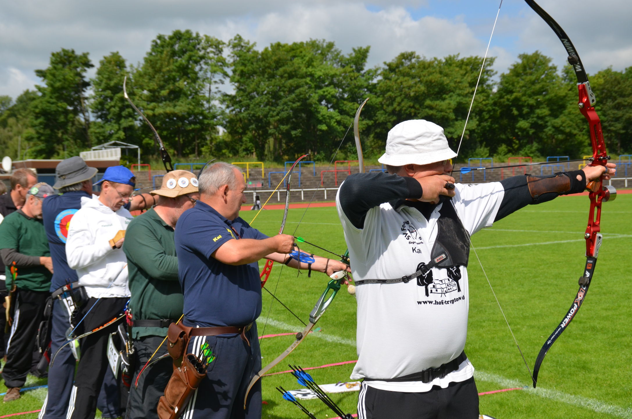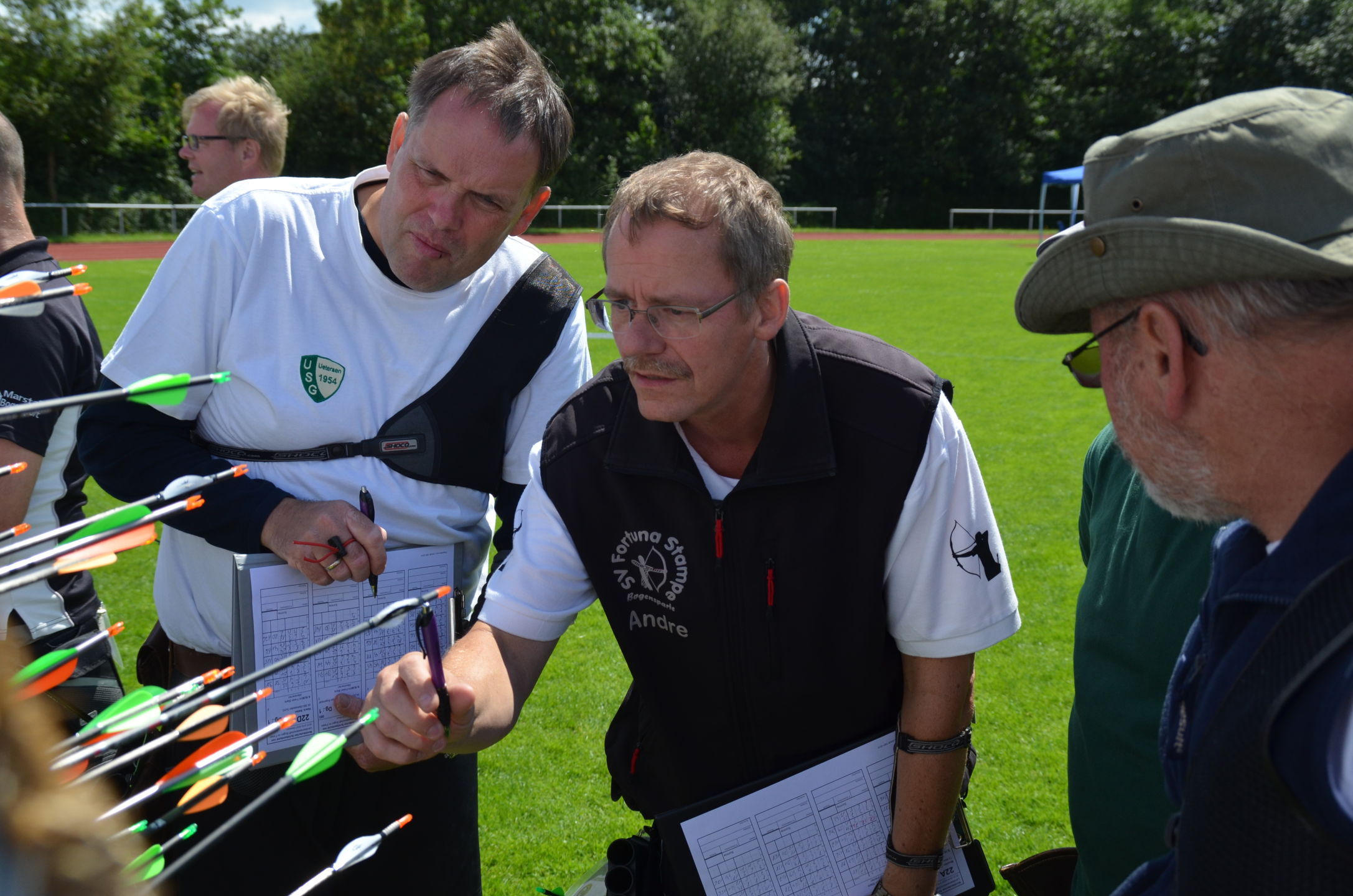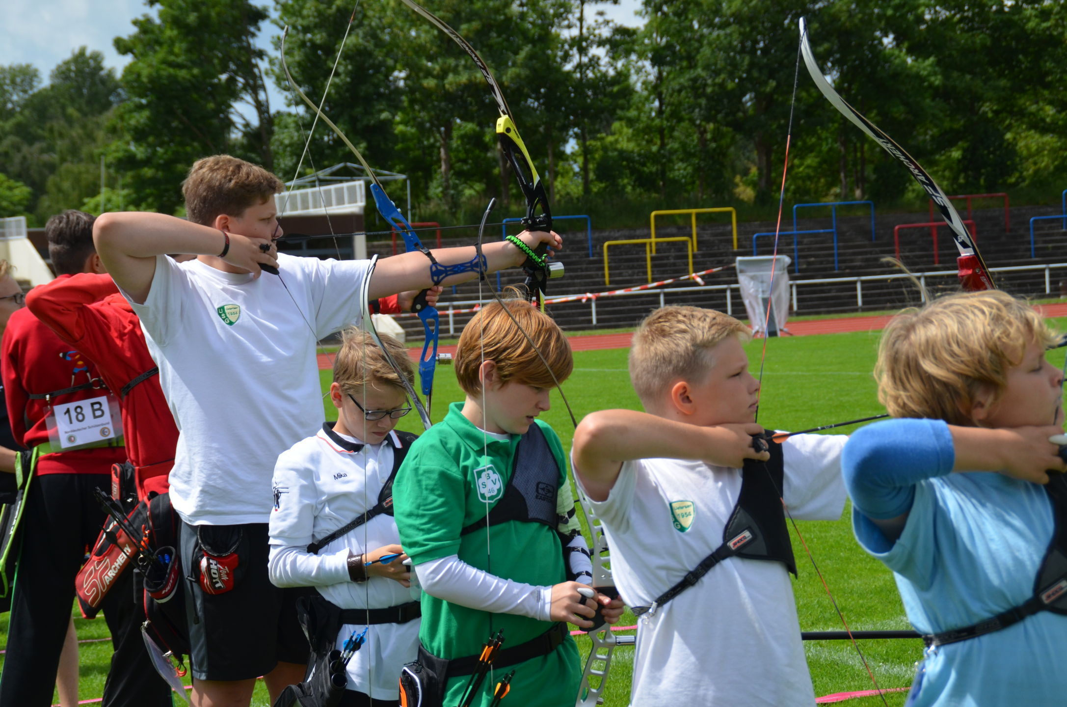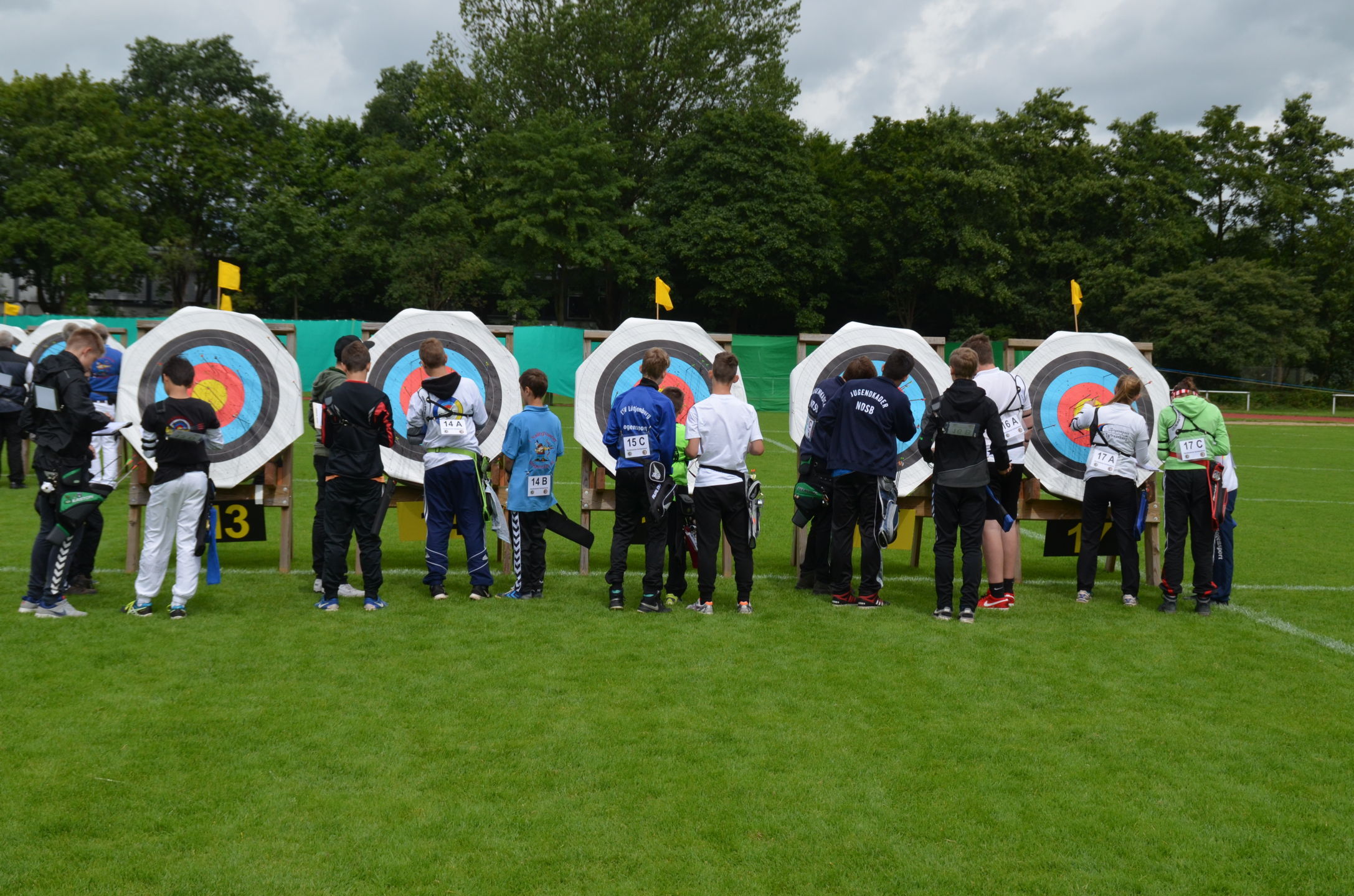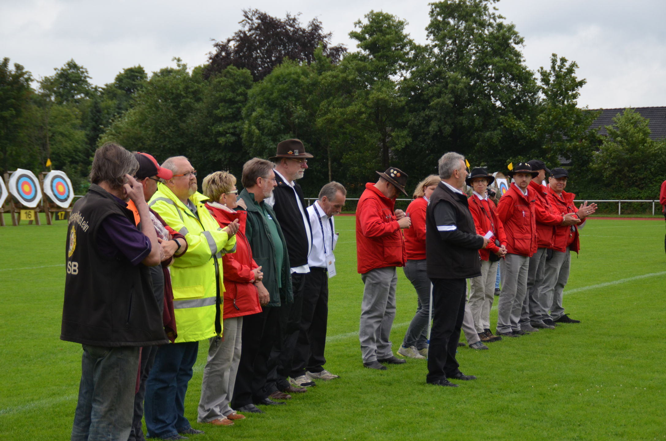 Die Landesmeisterschaft (LM) Bogen im Freien sollte dieses Jahr am 2./3. Juli durch die Bogenabteilung der Elmshorner Schützengilde (ESG) ausgerichtet werden. 191 Schützen waren für die zwei Turniertage gemeldet, die auf insgesamt 25 Scheiben die Meisterschaft austragen sollten. Dieses hierfür notwendige Equipment stand der ESG nicht zur Verfügung und so war die USG und der TSV Holm gefordert, mit Material und Manpower tatkräftig zu unterstützen. |