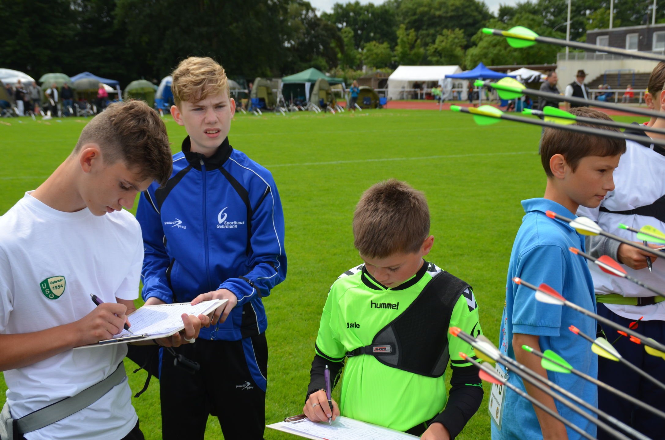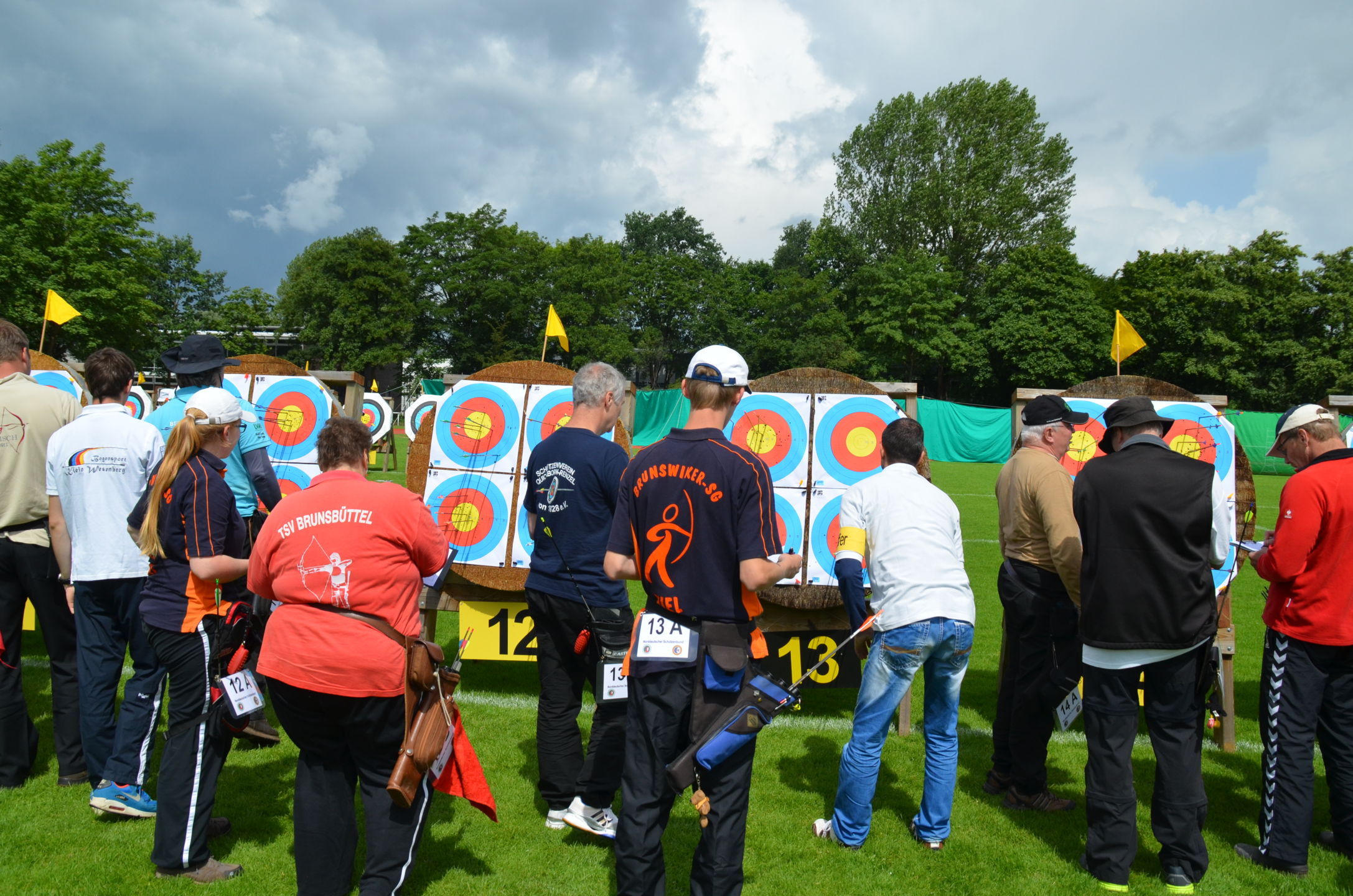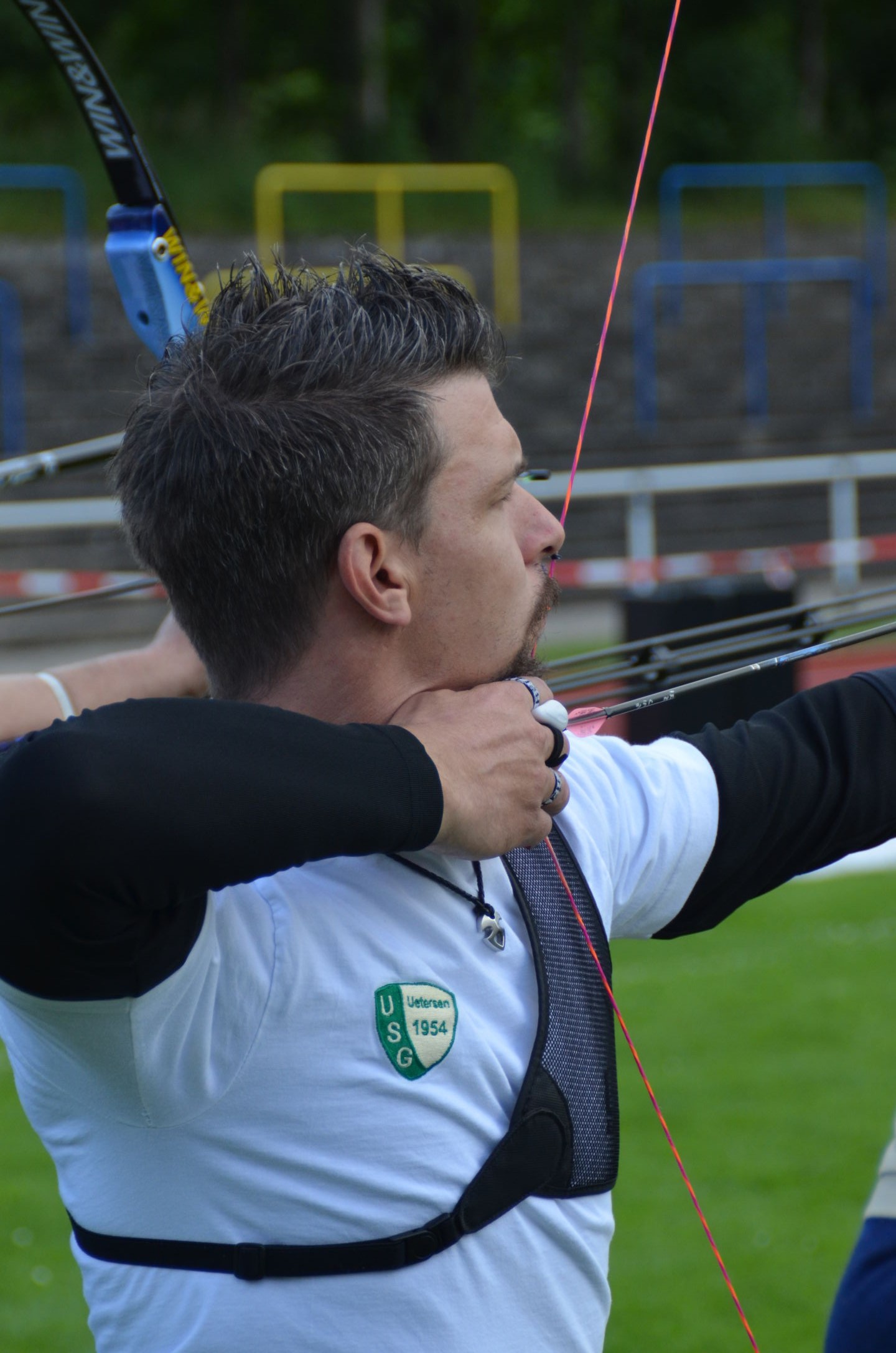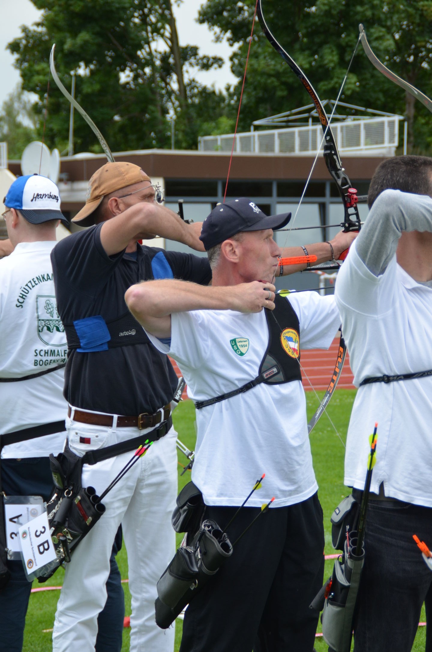 Die Landesmeisterschaft (LM) Bogen im Freien sollte dieses Jahr am 2./3. Juli durch die Bogenabteilung der Elmshorner Schützengilde (ESG) ausgerichtet werden. 191 Schützen waren für die zwei Turniertage gemeldet, die auf insgesamt 25 Scheiben die Meisterschaft austragen sollten. Dieses hierfür notwendige Equipment stand der ESG nicht zur Verfügung und so war die USG und der TSV Holm gefordert, mit Material und Manpower tatkräftig zu unterstützen. |