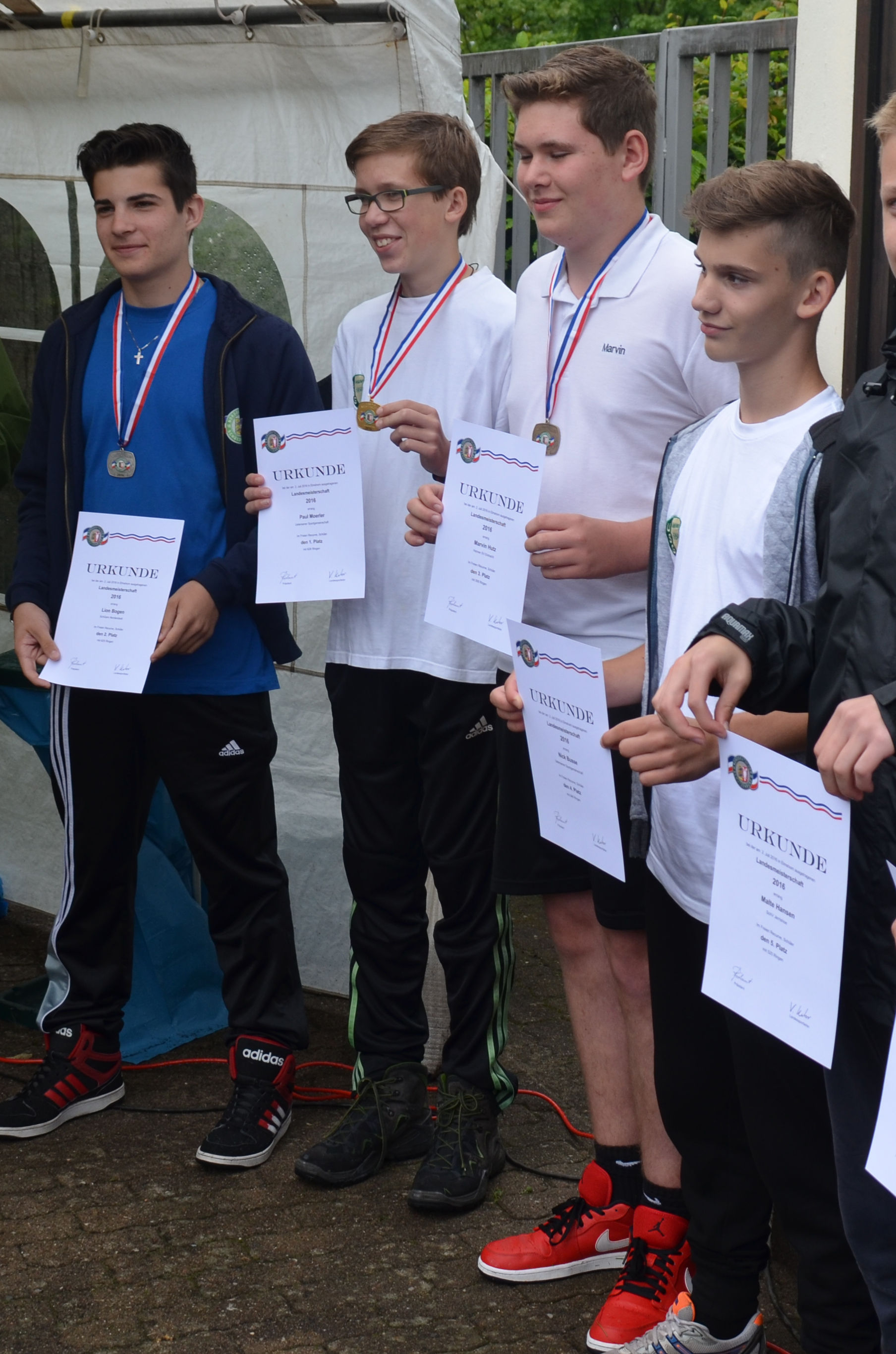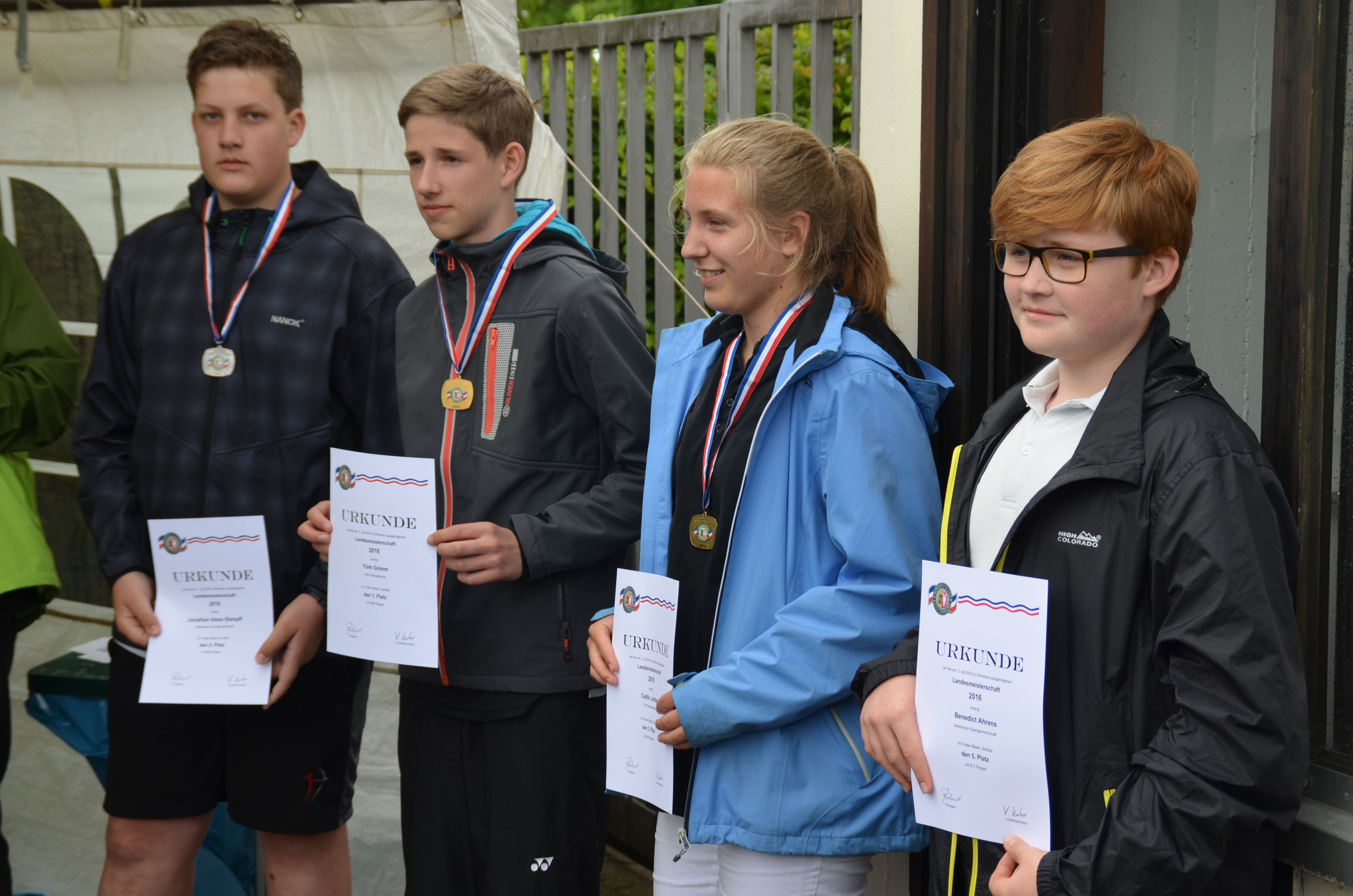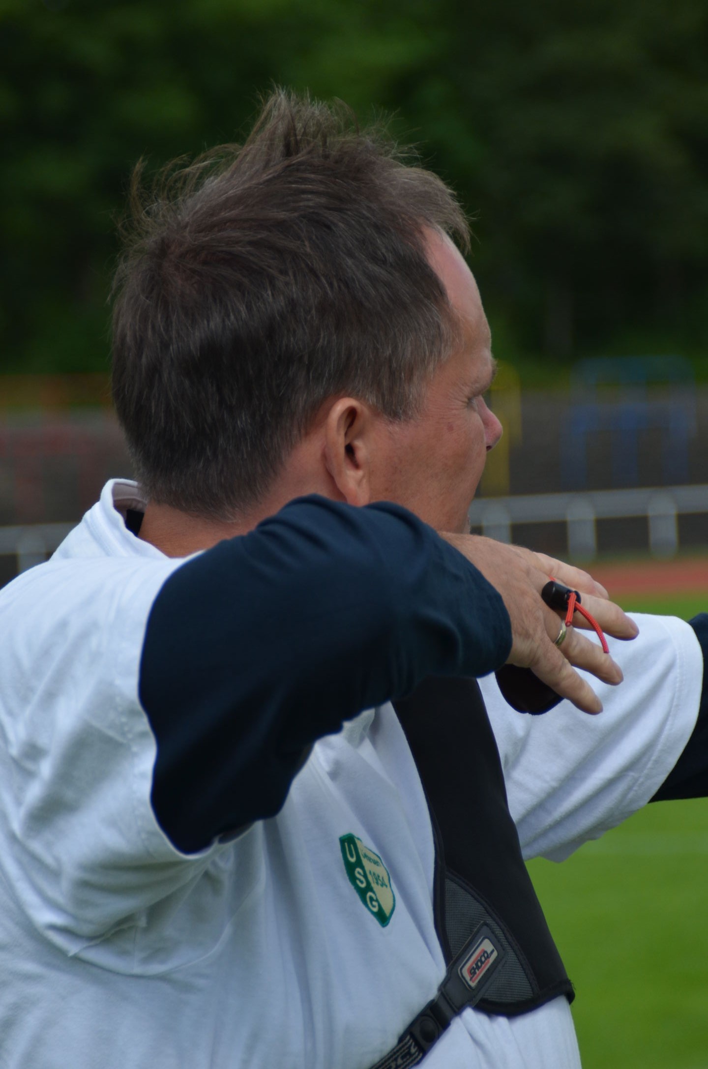Von der USG hatten sich insgesamt 12 Schützen für die Teilnahme an der LM qulifiziert. Fünf unserer jugendlichen Schützen waren am 1. Wettkampftag dabei: Benedict, Felix, Jonathan, Paul M. und Nick. Wenn auch für diesen Tag Regen und Gewitter angekündigt waren, so blieb es doch bis zum Nachmittag trocken. Nur zur letzten Passe ließ ein heftiger Regenschauer alle Schützen kräftig nass werden. Auch der böige Wind machte manch einem Schützen zu schaffen. Für Viele bedeutete das Endergebnis deutlich weniger Ringe als bei der Kreismeisterschaft (KM), aber es gab auch Ausnahmen. |