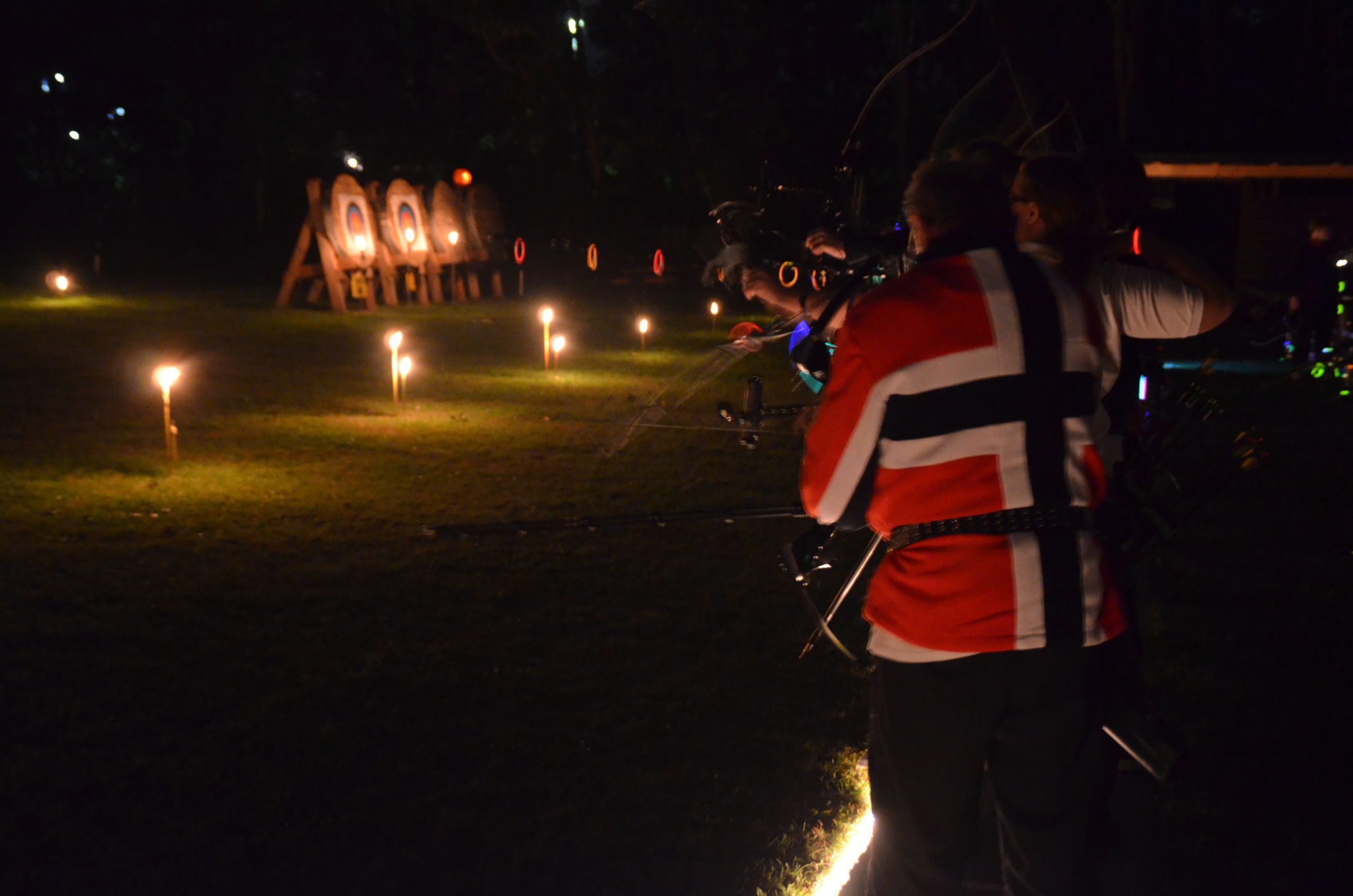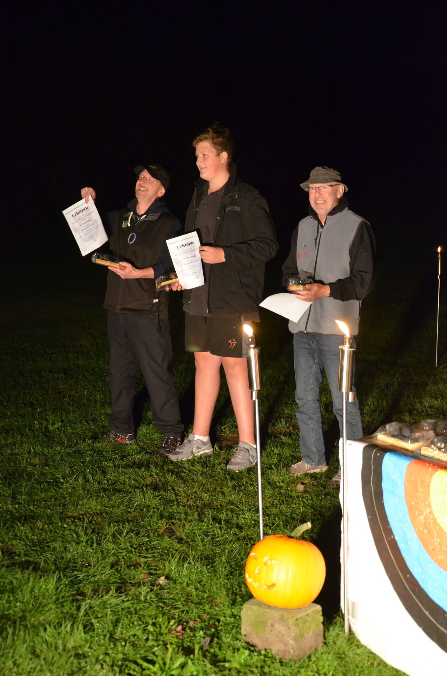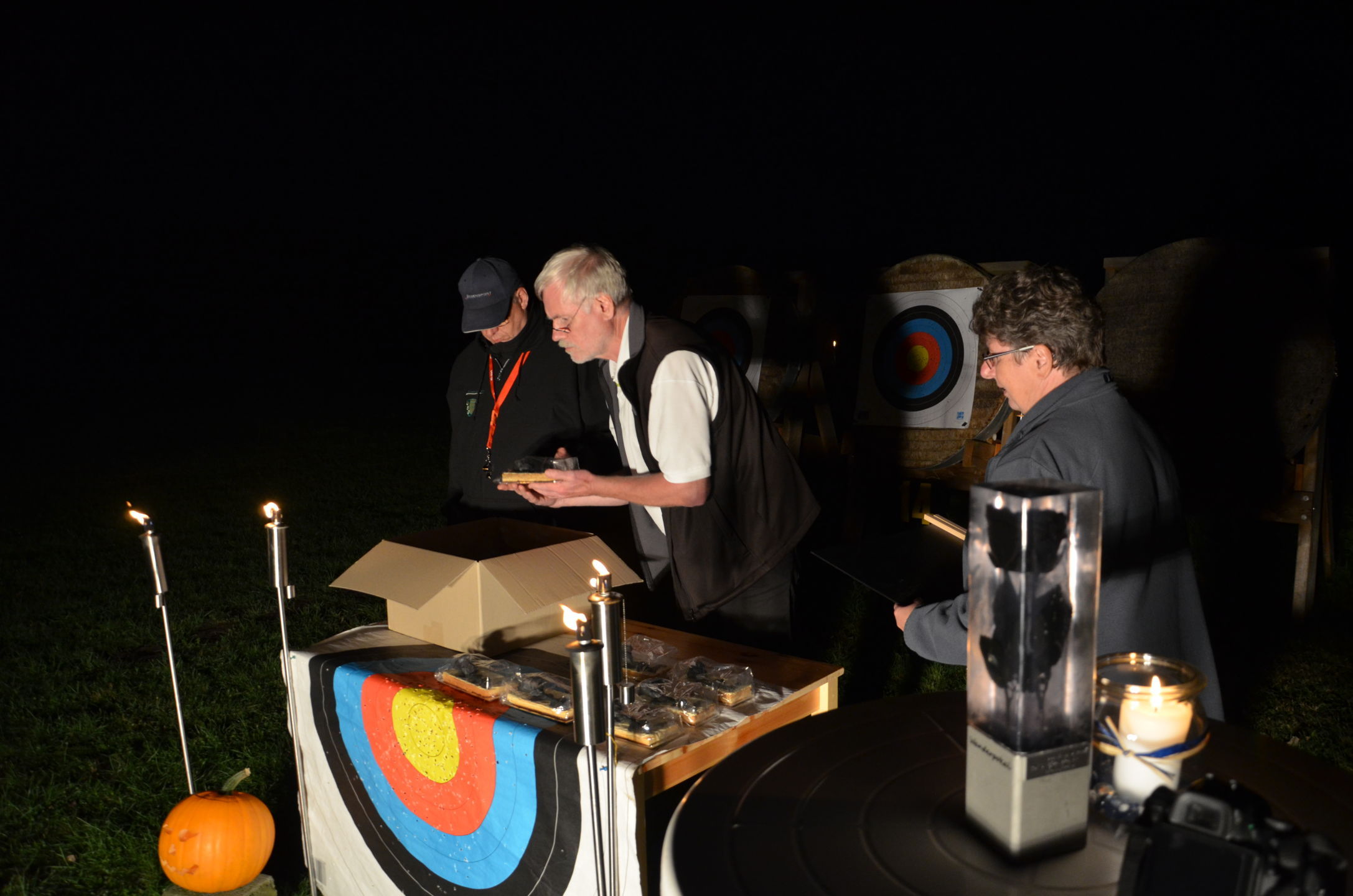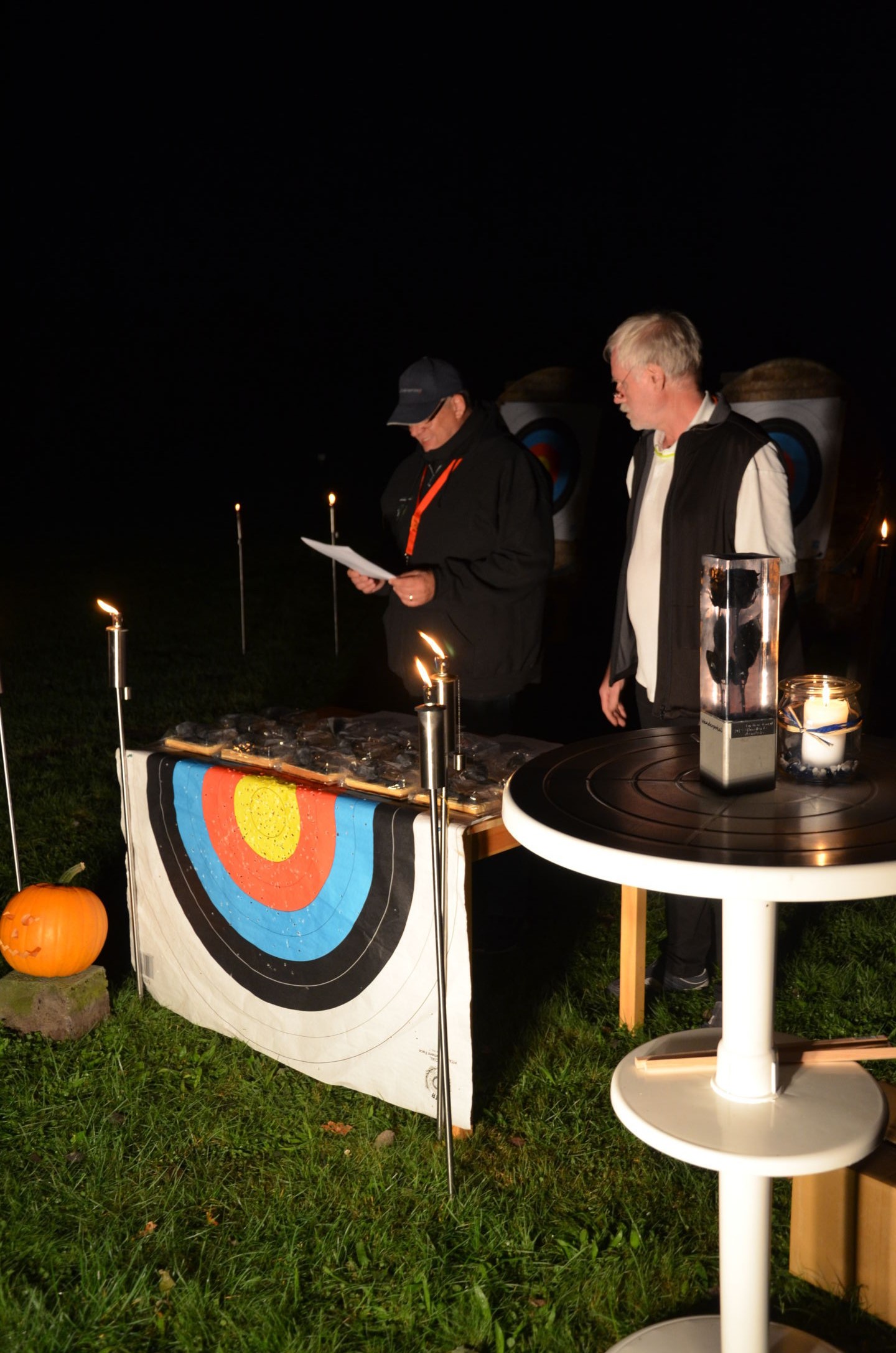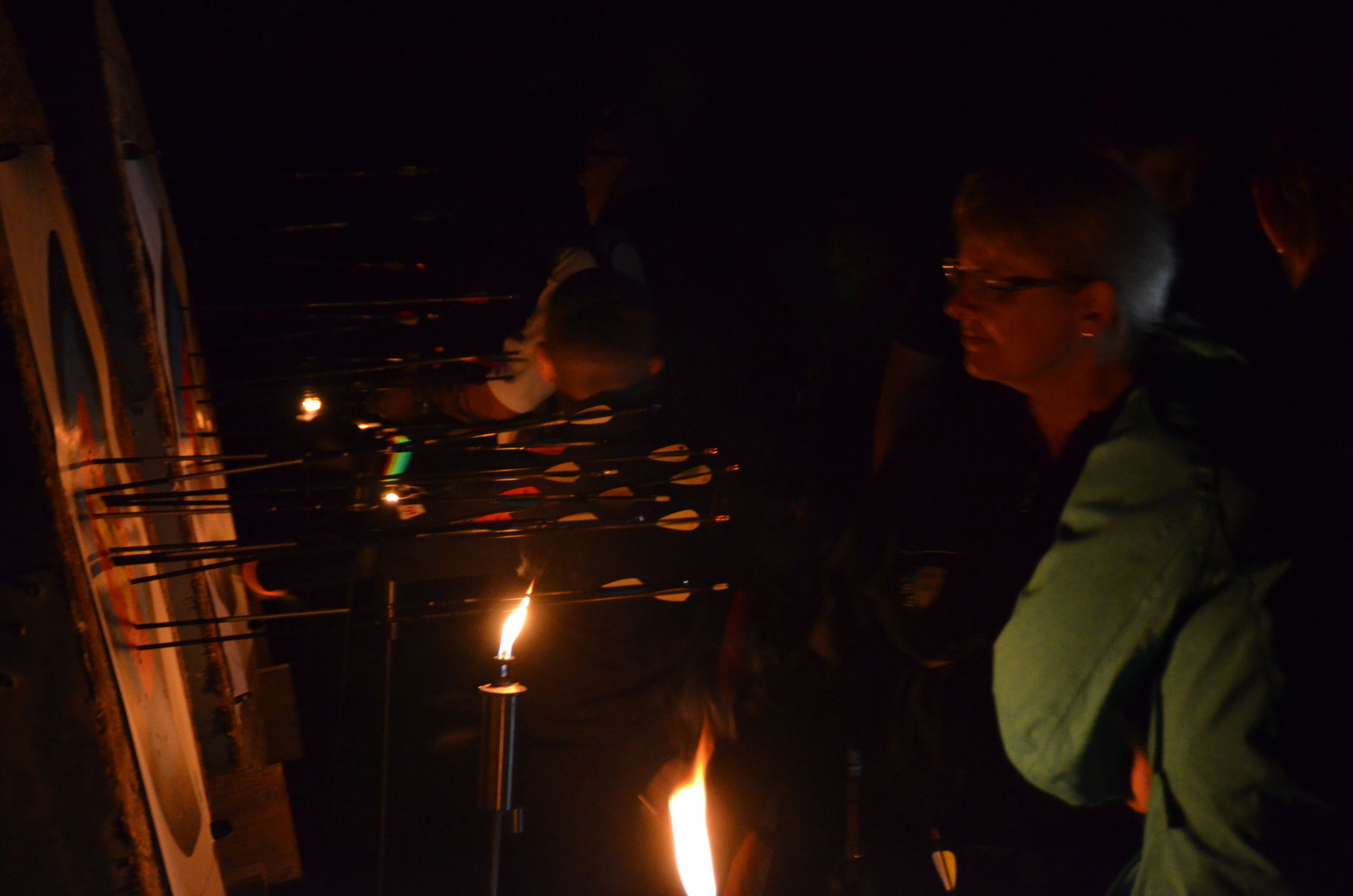 | Mit Einsetzen der Dunkelheit konnte dann das Nachtturnier beginnen, das zum 2. Mal unter dem Namen Schwarze Rose von Ueteresen ausgetragen wurde. Das Turnier wurde für manch einen Schützen zur wahren Herausforderung. Wurden die Zielscheiben doch jeweils nur durch zwei Ölfackeln beleuchtet, so trug der böige Wind dazu bei, dass einige Fackeln nur wenig unruhiges Licht auf die Auflagen fallen ließen. Dennoch war es für viele ein stimmungsvolles Erlebnis, insbesondere für die neuen Schützen, die hier ihr erstes Turnier bestritten. |