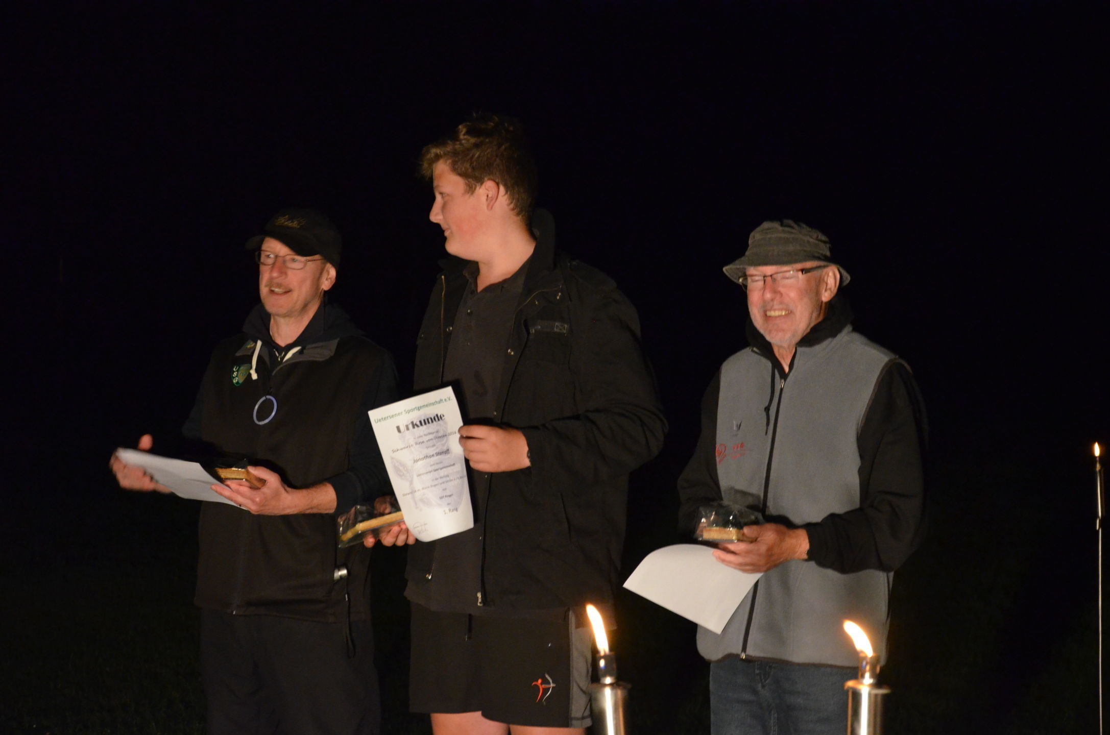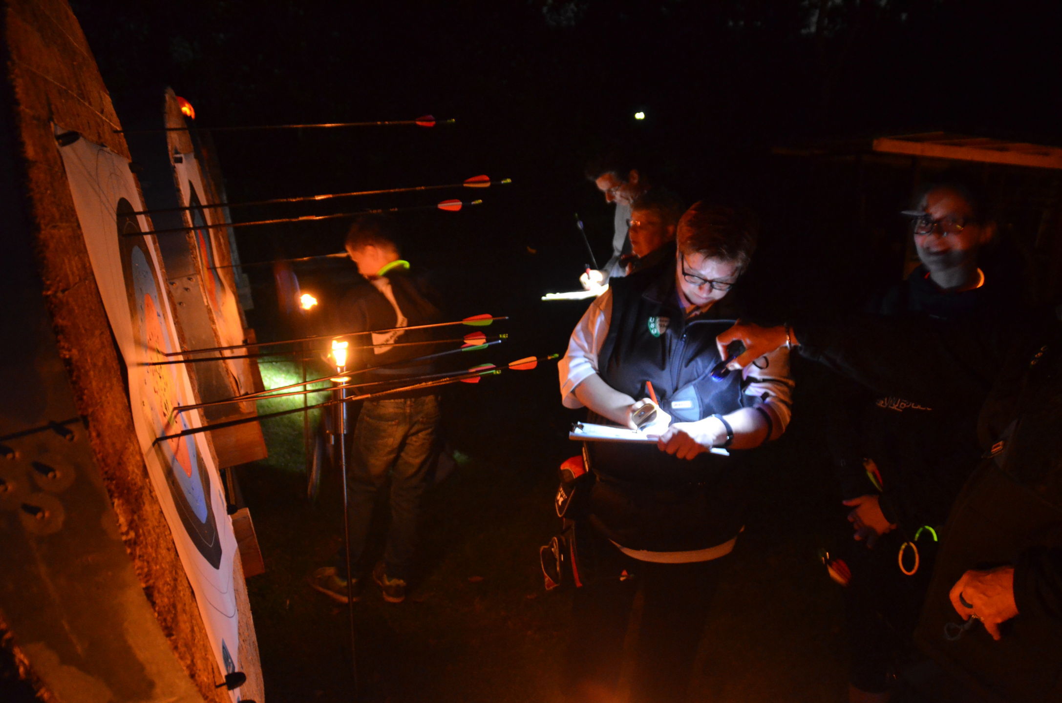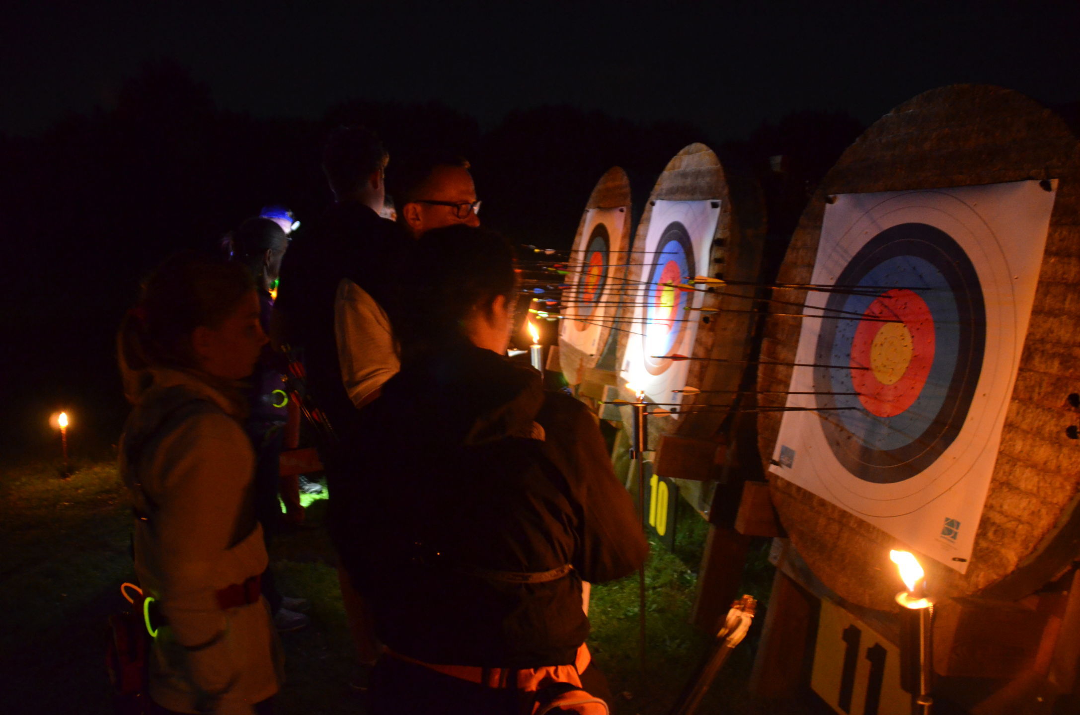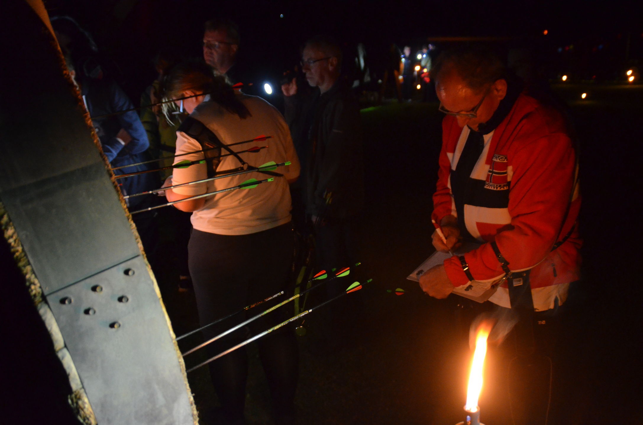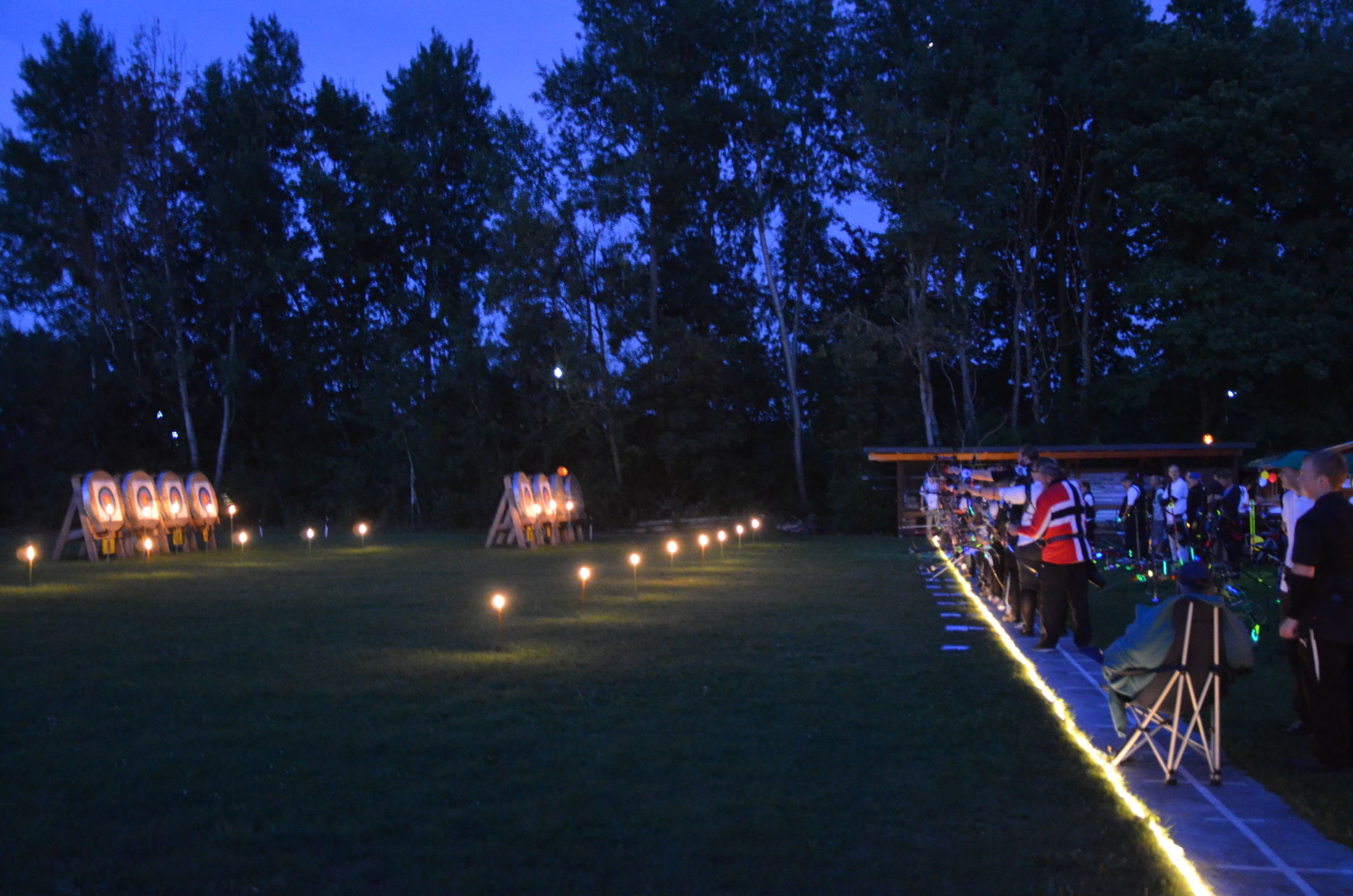 | Mit Einsetzen der Dunkelheit konnte dann das Nachtturnier beginnen, das zum 2. Mal unter dem Namen Schwarze Rose von Ueteresen ausgetragen wurde. Das Turnier wurde für manch einen Schützen zur wahren Herausforderung. Wurden die Zielscheiben doch jeweils nur durch zwei Ölfackeln beleuchtet, so trug der böige Wind dazu bei, dass einige Fackeln nur wenig unruhiges Licht auf die Auflagen fallen ließen. Dennoch war es für viele ein stimmungsvolles Erlebnis, insbesondere für die neuen Schützen, die hier ihr erstes Turnier bestritten. |
