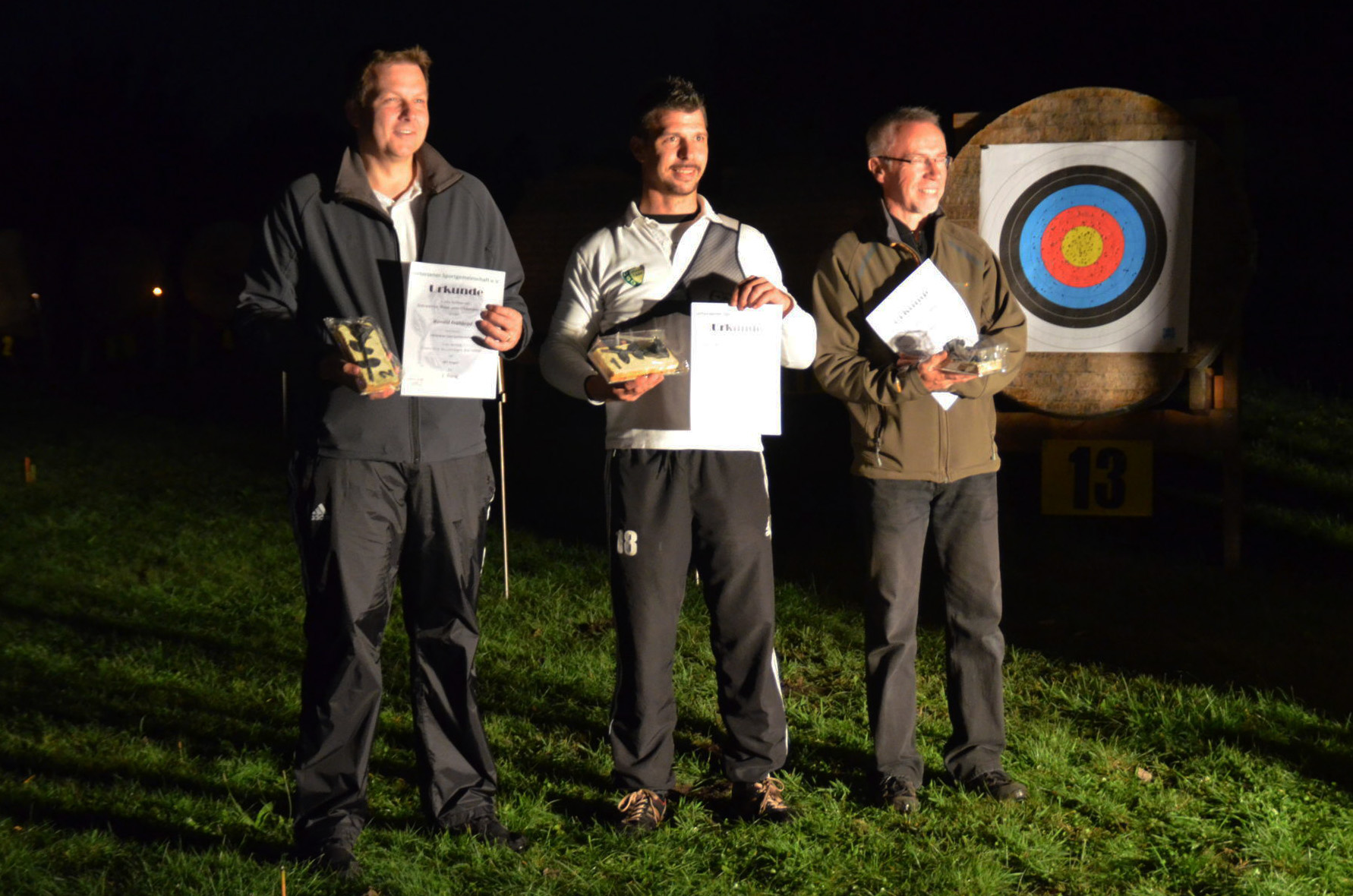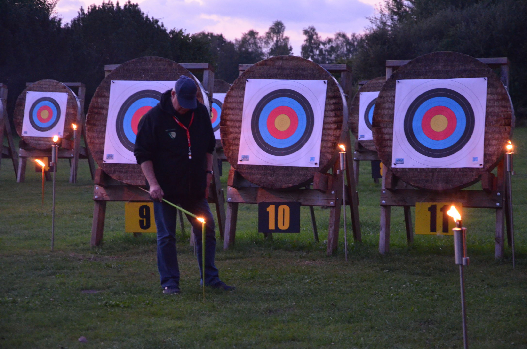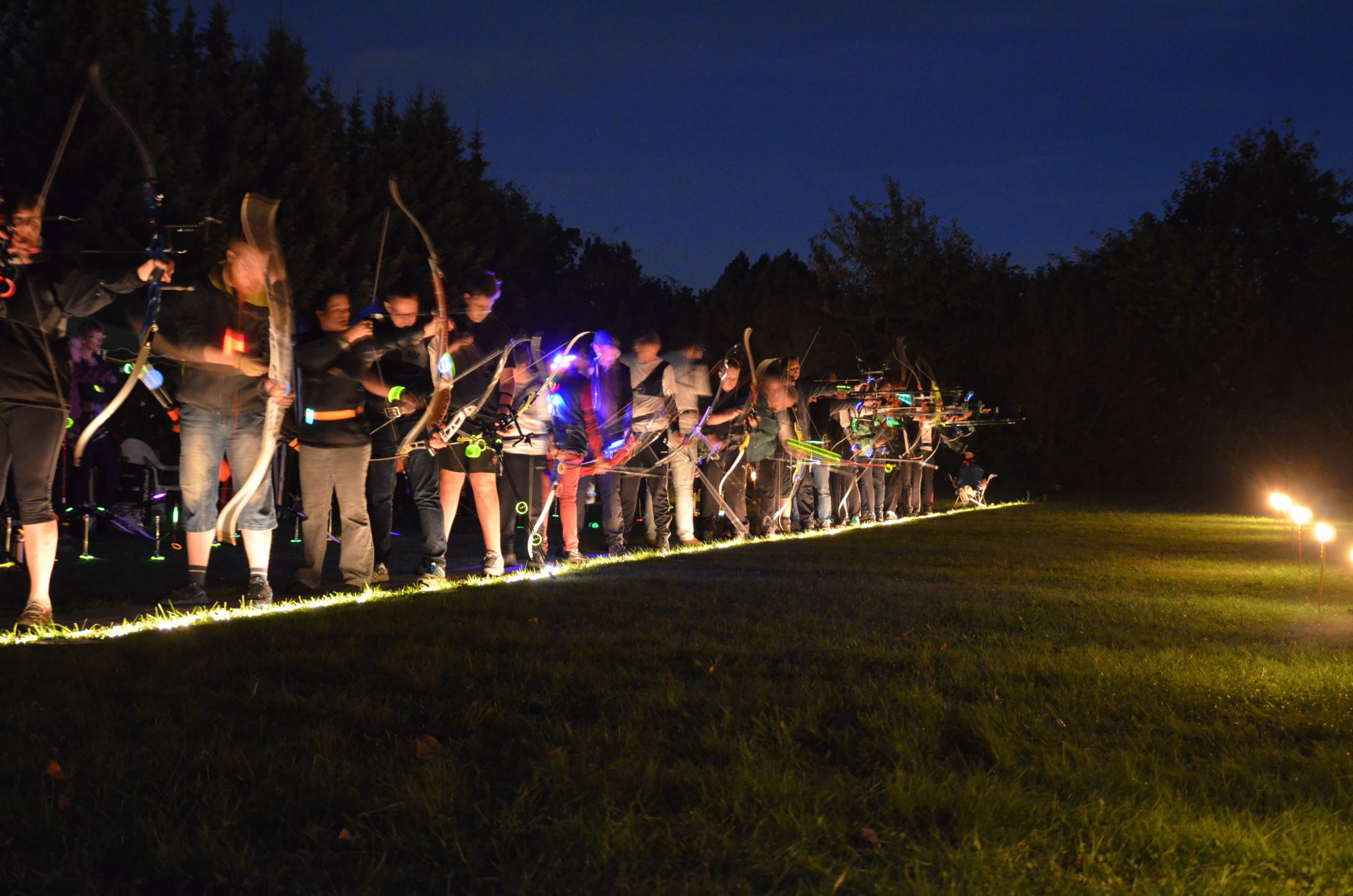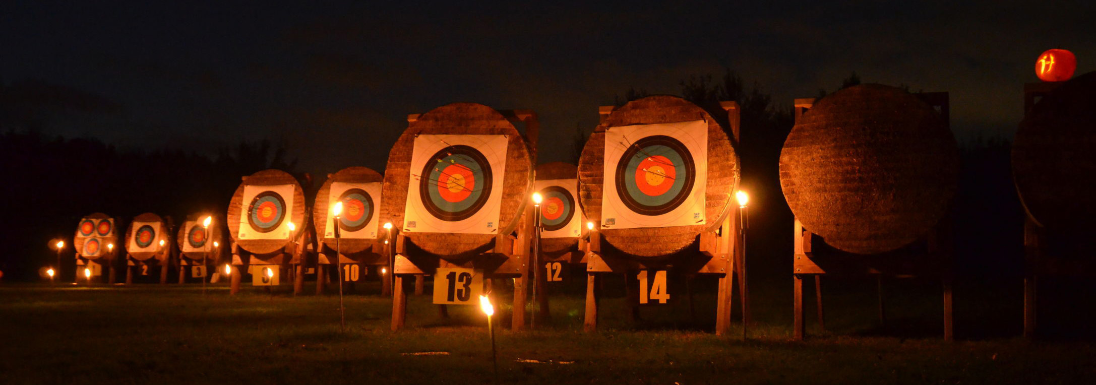 | Mit Einsetzen der Dunkelheit konnte dann das Nachtturnier beginnen, das zum 2. Mal unter dem Namen Schwarze Rose von Ueteresen ausgetragen wurde. Das Turnier wurde für manch einen Schützen zur wahren Herausforderung. Wurden die Zielscheiben doch jeweils nur durch zwei Ölfackeln beleuchtet, so trug der böige Wind dazu bei, dass einige Fackeln nur wenig unruhiges Licht auf die Auflagen fallen ließen. Dennoch war es für viele ein stimmungsvolles Erlebnis, insbesondere für die neuen Schützen, die hier ihr erstes Turnier bestritten. |