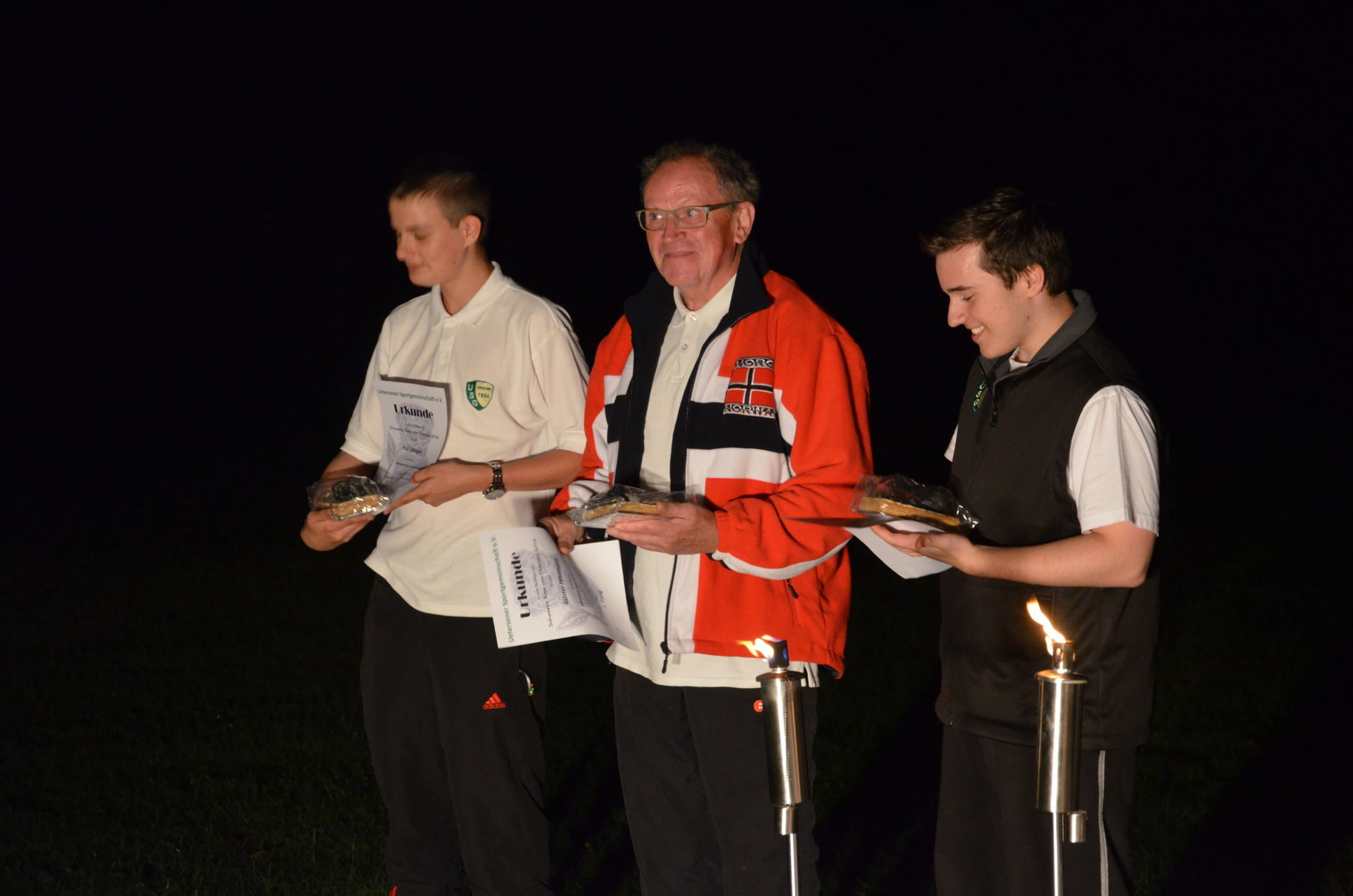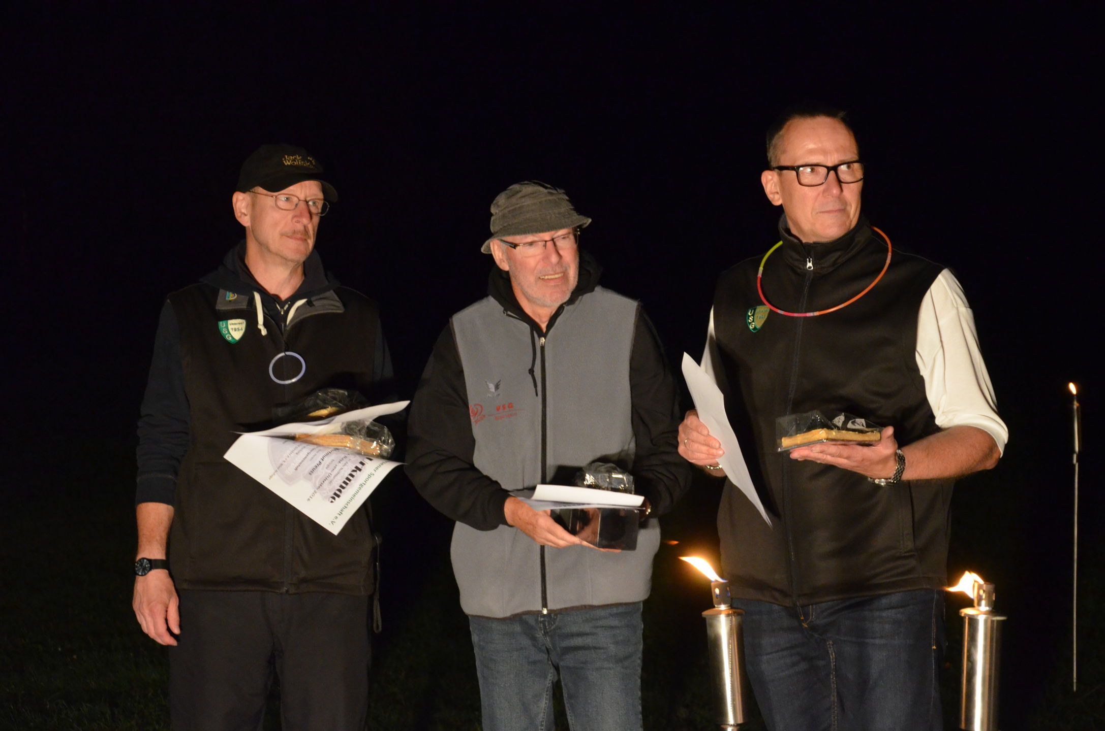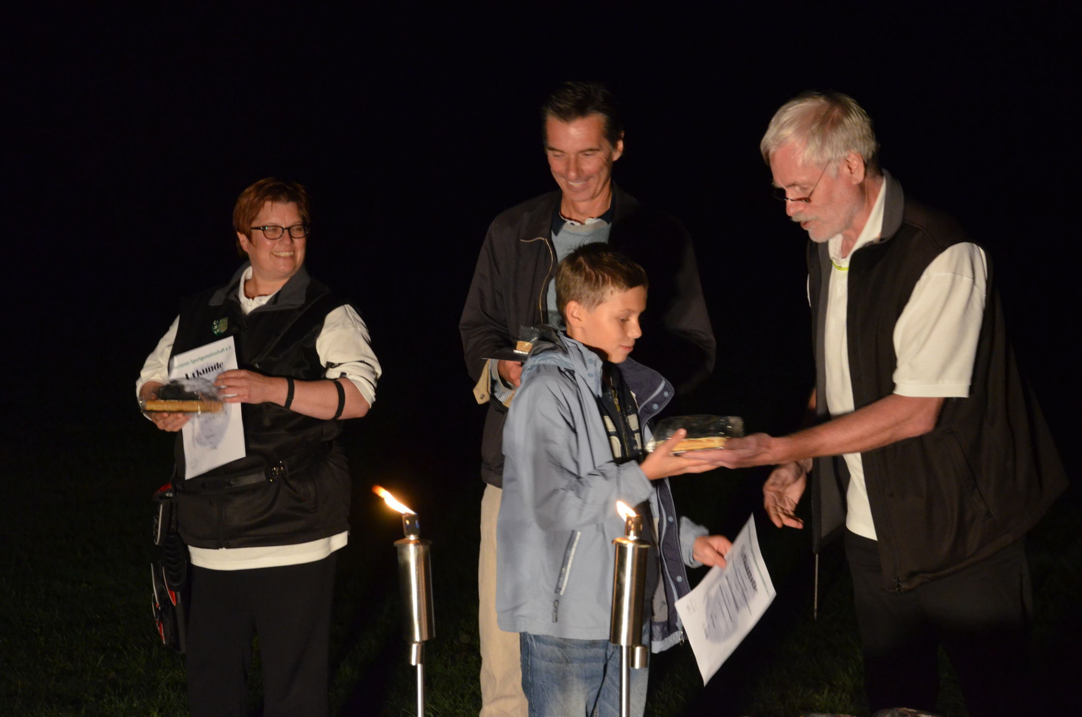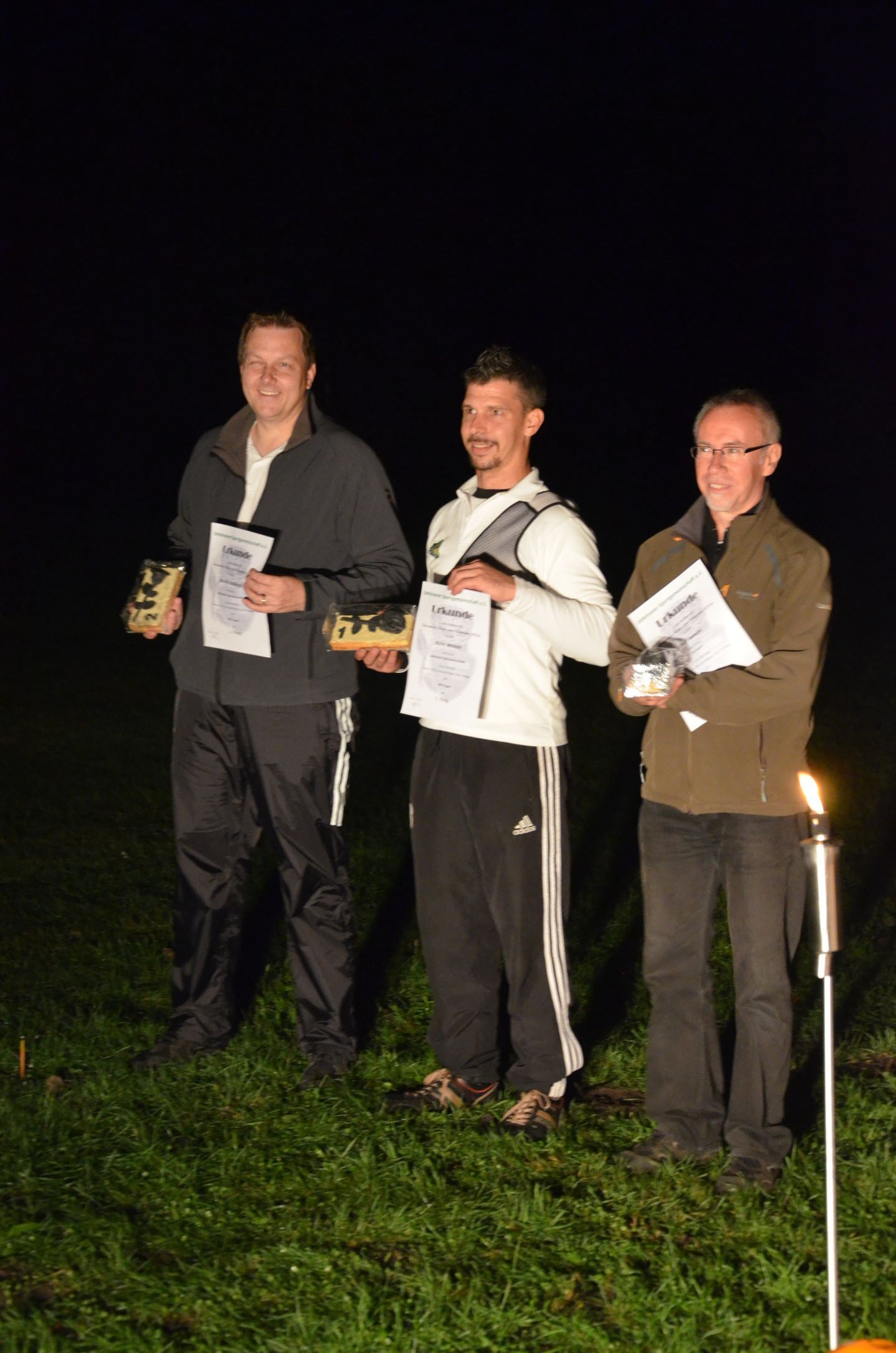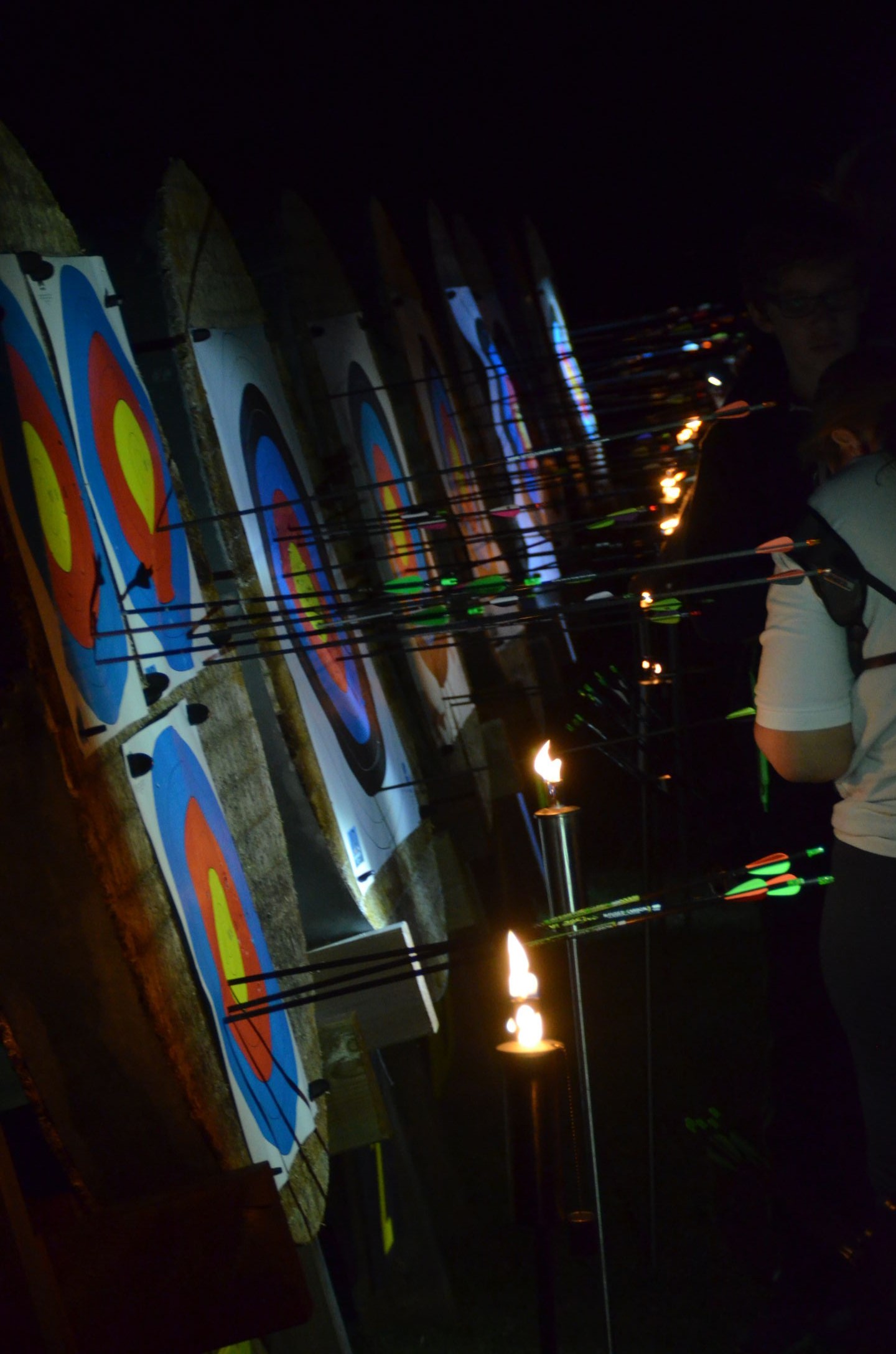 | Mit Einsetzen der Dunkelheit konnte dann das Nachtturnier beginnen, das zum 2. Mal unter dem Namen Schwarze Rose von Ueteresen ausgetragen wurde. Das Turnier wurde für manch einen Schützen zur wahren Herausforderung. Wurden die Zielscheiben doch jeweils nur durch zwei Ölfackeln beleuchtet, so trug der böige Wind dazu bei, dass einige Fackeln nur wenig unruhiges Licht auf die Auflagen fallen ließen. Dennoch war es für viele ein stimmungsvolles Erlebnis, insbesondere für die neuen Schützen, die hier ihr erstes Turnier bestritten. |