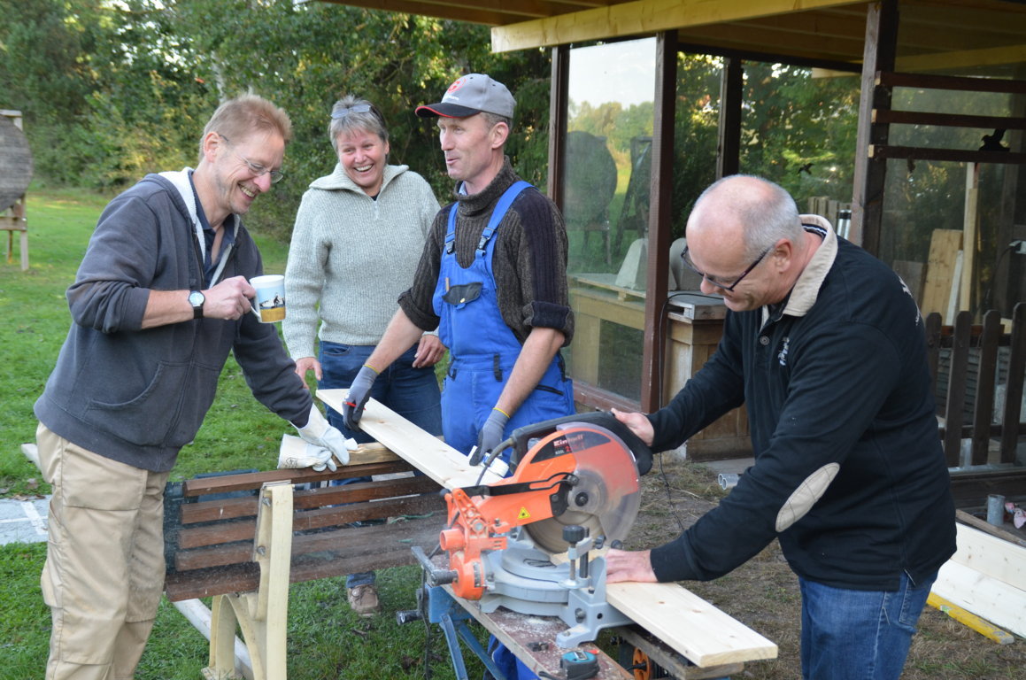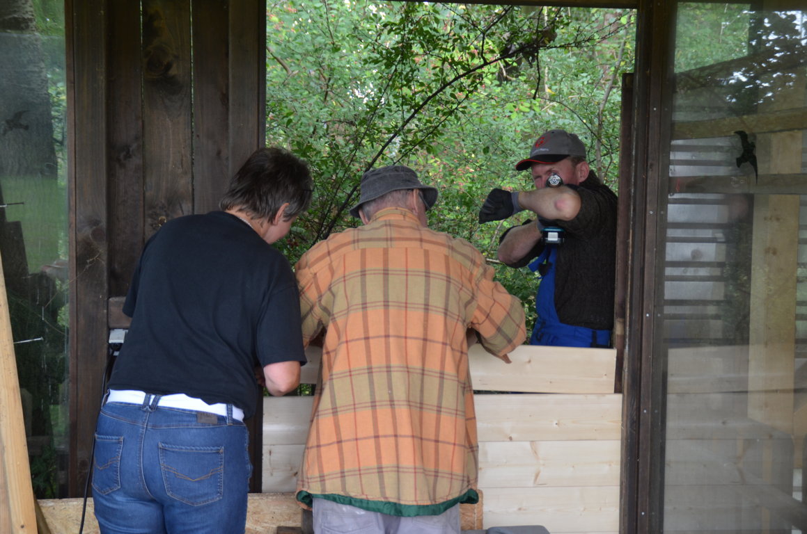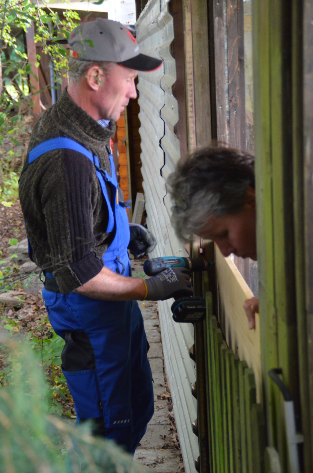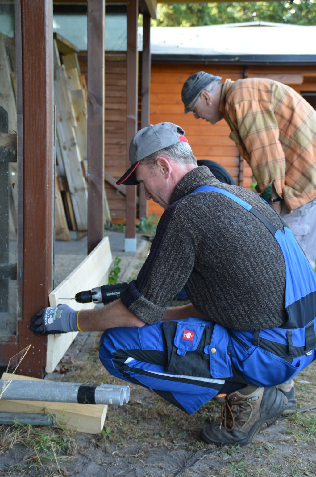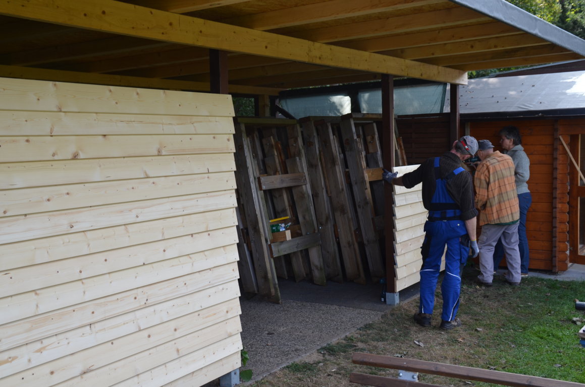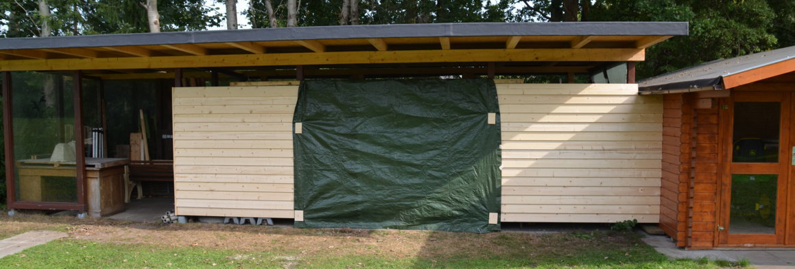 Nachdem das Schuppendach bereits im Herbst letzten Jahres erneuert und provisorisch abgedichtet worden war, hatte bereits eine kleine Helfergruppe die endgültige Dachabdichtung im Spätsommer aufgebracht. Nun wurden noch alte Seitenelemente durch schindelartig angebrachte Bretter erneuert. Das Kondenswasser aus der Heizungsanlage, das bisher in einem Eimer aufgefangen wurde, der regelmäßig zu leeren war, wird nun künftig direkt in den Abfluss geleitet, so dass eine lästige Aufgabe entfällt. Die Holzbänke wurden trocken für die Winterzeit eingelagert. |