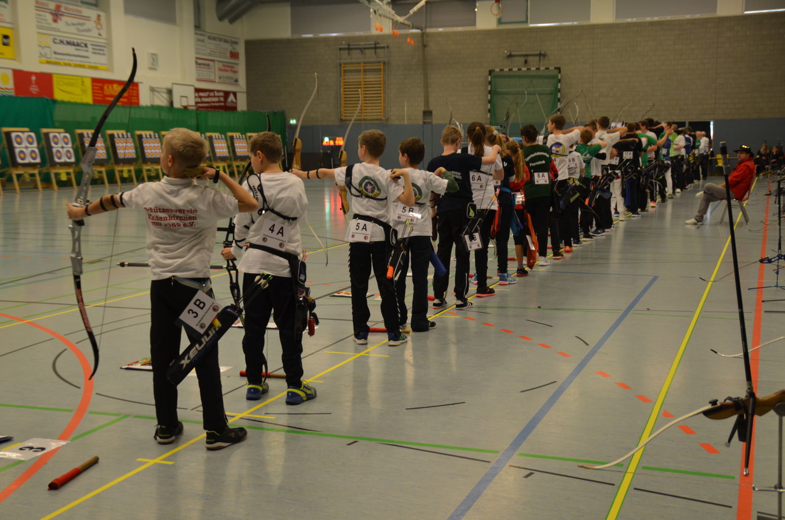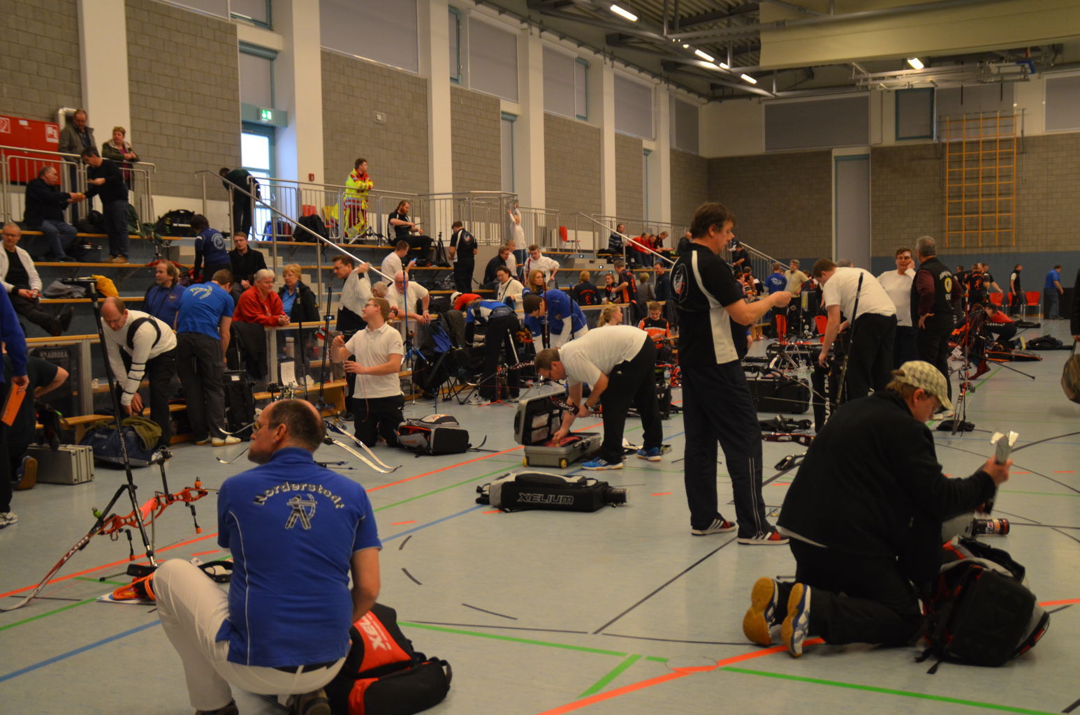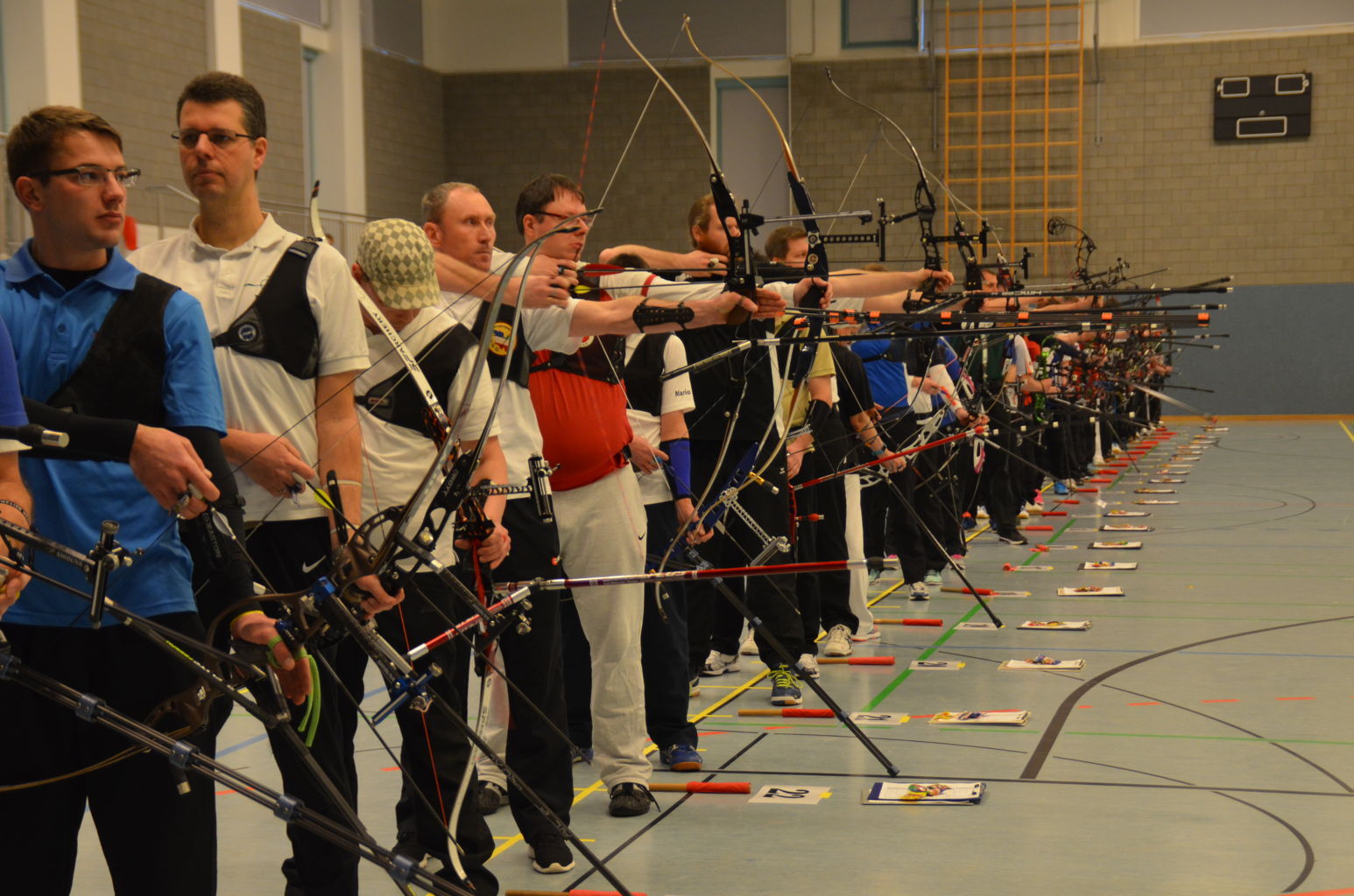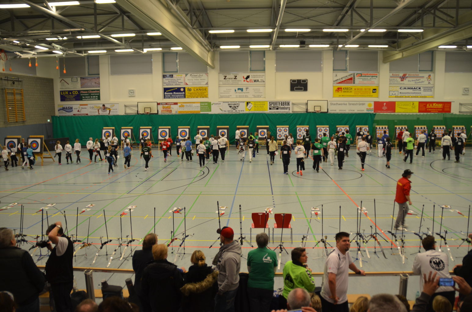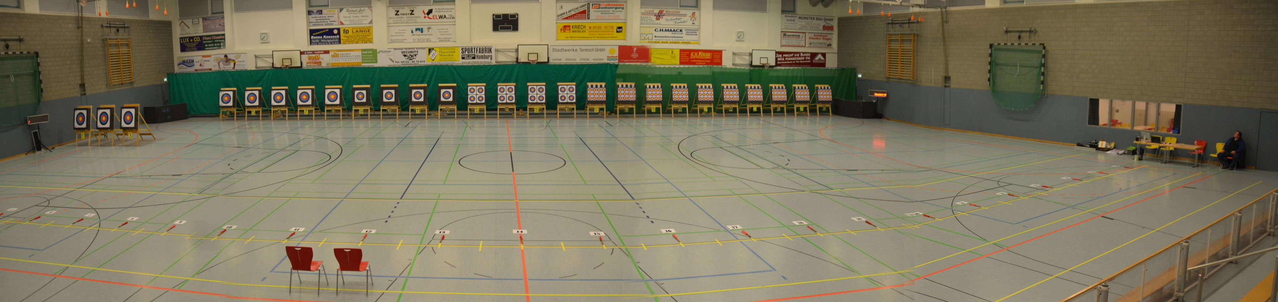 Nach 2016 stand auch für 2017 wieder die Ausrichtung der Landesmeisterschaft (LM) Bogen Halle für unseren Verein an. Sind wir mal ehrlich: Einerseits ist es jedesmal ein Kraftakt, alles Material aus den zwei Trainingssporthallen und unserer Bogenhütte zur Sporthalle der KGS Tornesch zu verbringen und alles getreu den Vorschriften der Sportordnung aufzbauen. Hier sind viele, sehr viele helfende Hände notwendig, ohne die so etwas nicht zu schaffen ist. An dieser Stelle allen Helfern einen herzlichen Dank. Andererseits spült die Ausrichtung aber auch einen finanziellen Betrag in die Kasse, ohne den wir unseren jetzigen Stand vielleicht nicht so schnell erreicht hätten. Also, in 4 Jahren 3-mal die Ausrichtung der LM und 3-mal die Ausrichtung der Kreismeisterschaft (KM) in dieser Halle, das führt zu einer Routine, so dass am Freitag auch schnell alles aufgebaut war. |