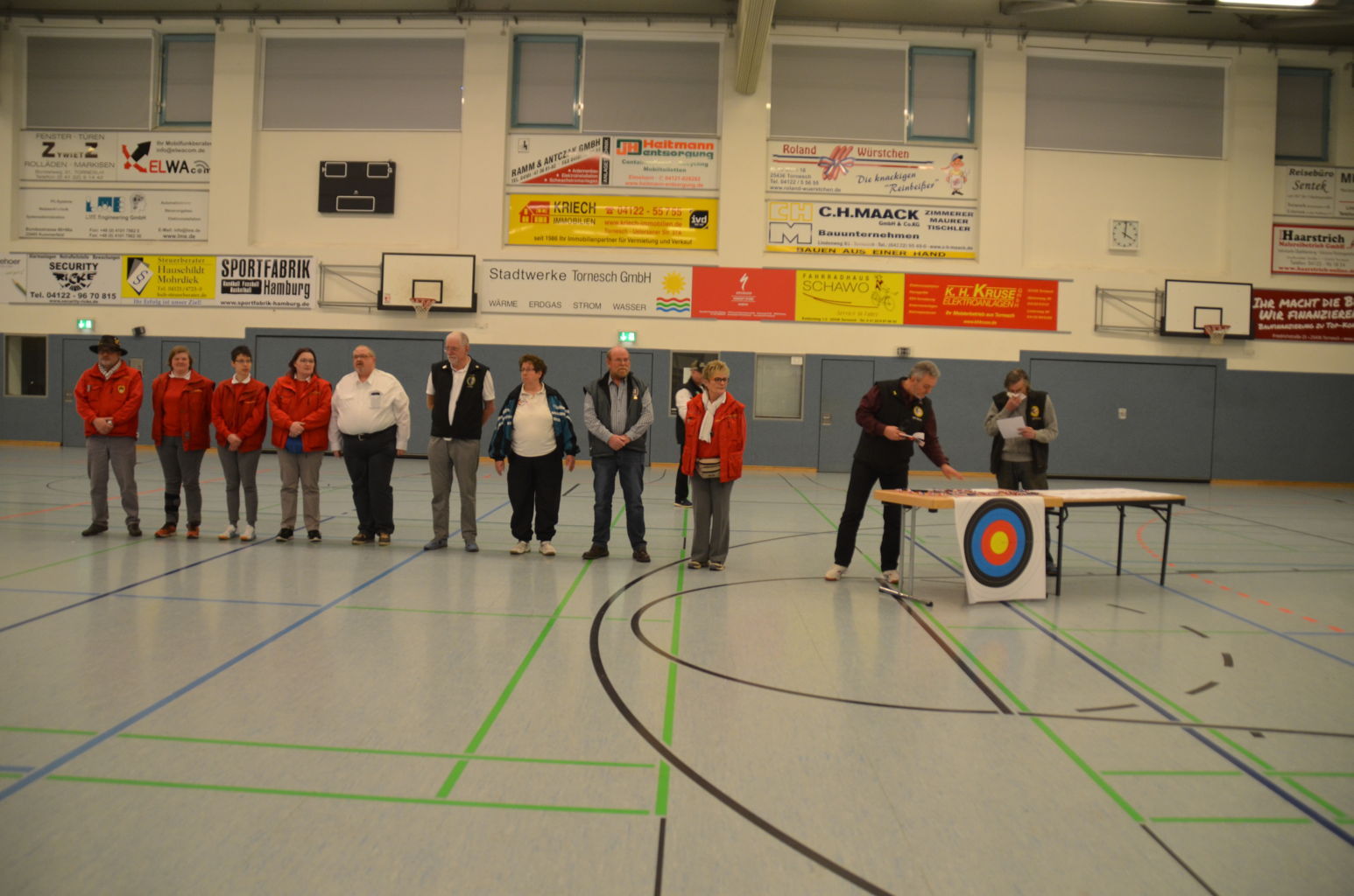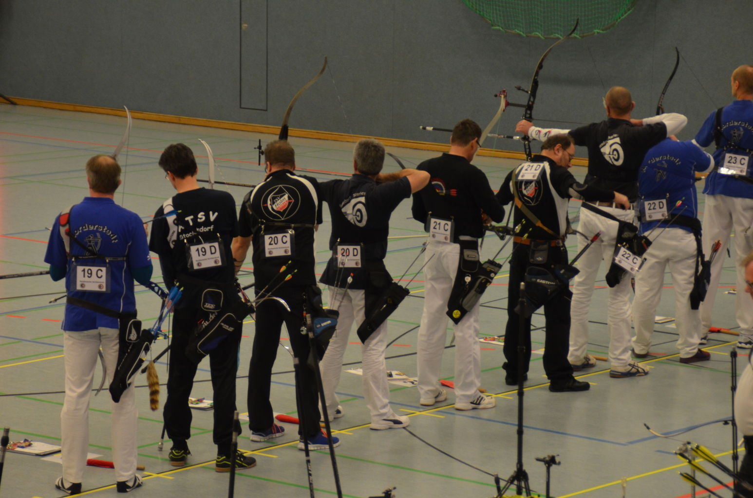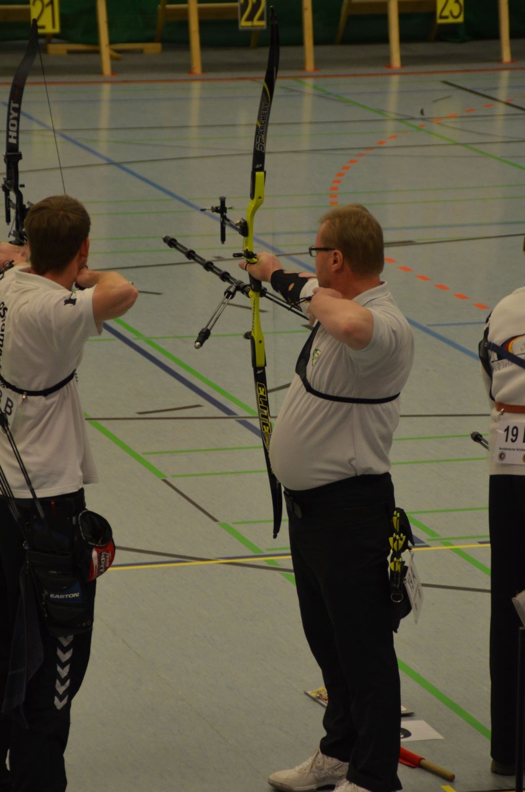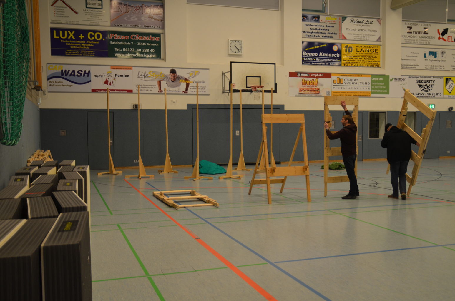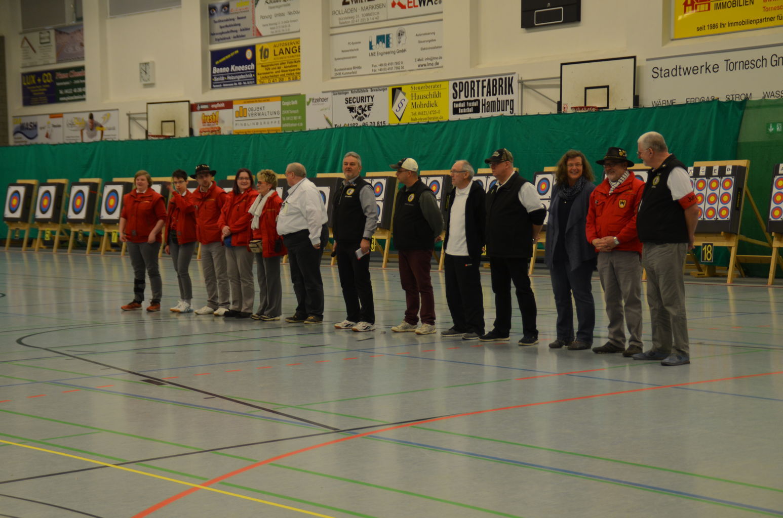 Nach 2016 stand auch für 2017 wieder die Ausrichtung der Landesmeisterschaft (LM) Bogen Halle für unseren Verein an. Sind wir mal ehrlich: Einerseits ist es jedesmal ein Kraftakt, alles Material aus den zwei Trainingssporthallen und unserer Bogenhütte zur Sporthalle der KGS Tornesch zu verbringen und alles getreu den Vorschriften der Sportordnung aufzbauen. Hier sind viele, sehr viele helfende Hände notwendig, ohne die so etwas nicht zu schaffen ist. An dieser Stelle allen Helfern einen herzlichen Dank. Andererseits spült die Ausrichtung aber auch einen finanziellen Betrag in die Kasse, ohne den wir unseren jetzigen Stand vielleicht nicht so schnell erreicht hätten. Also, in 4 Jahren 3-mal die Ausrichtung der LM und 3-mal die Ausrichtung der Kreismeisterschaft (KM) in dieser Halle, das führt zu einer Routine, so dass am Freitag auch schnell alles aufgebaut war. |