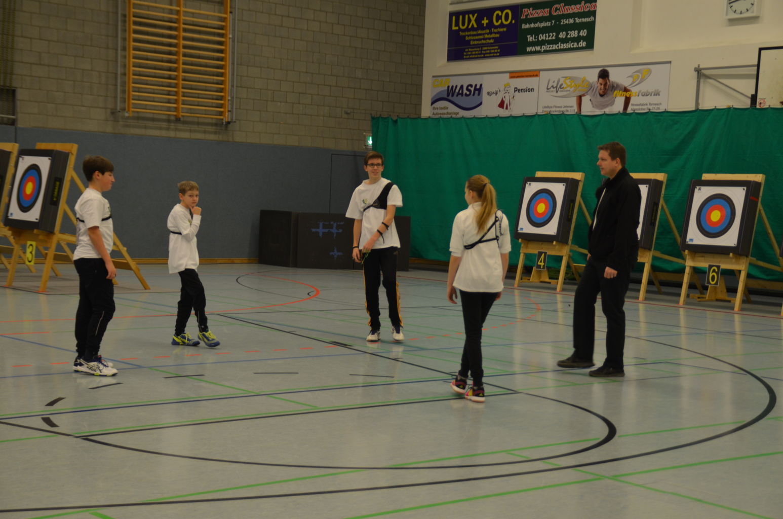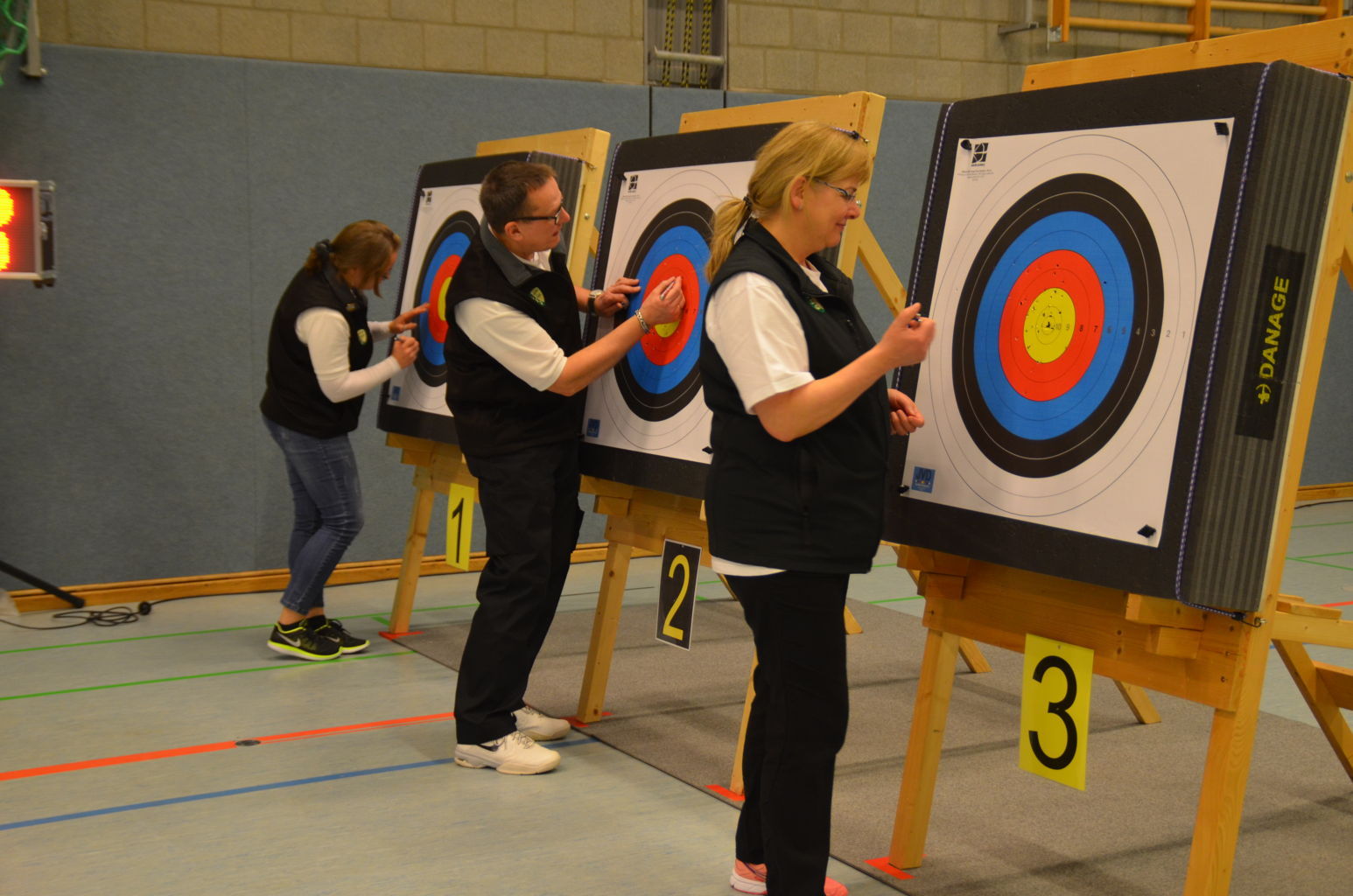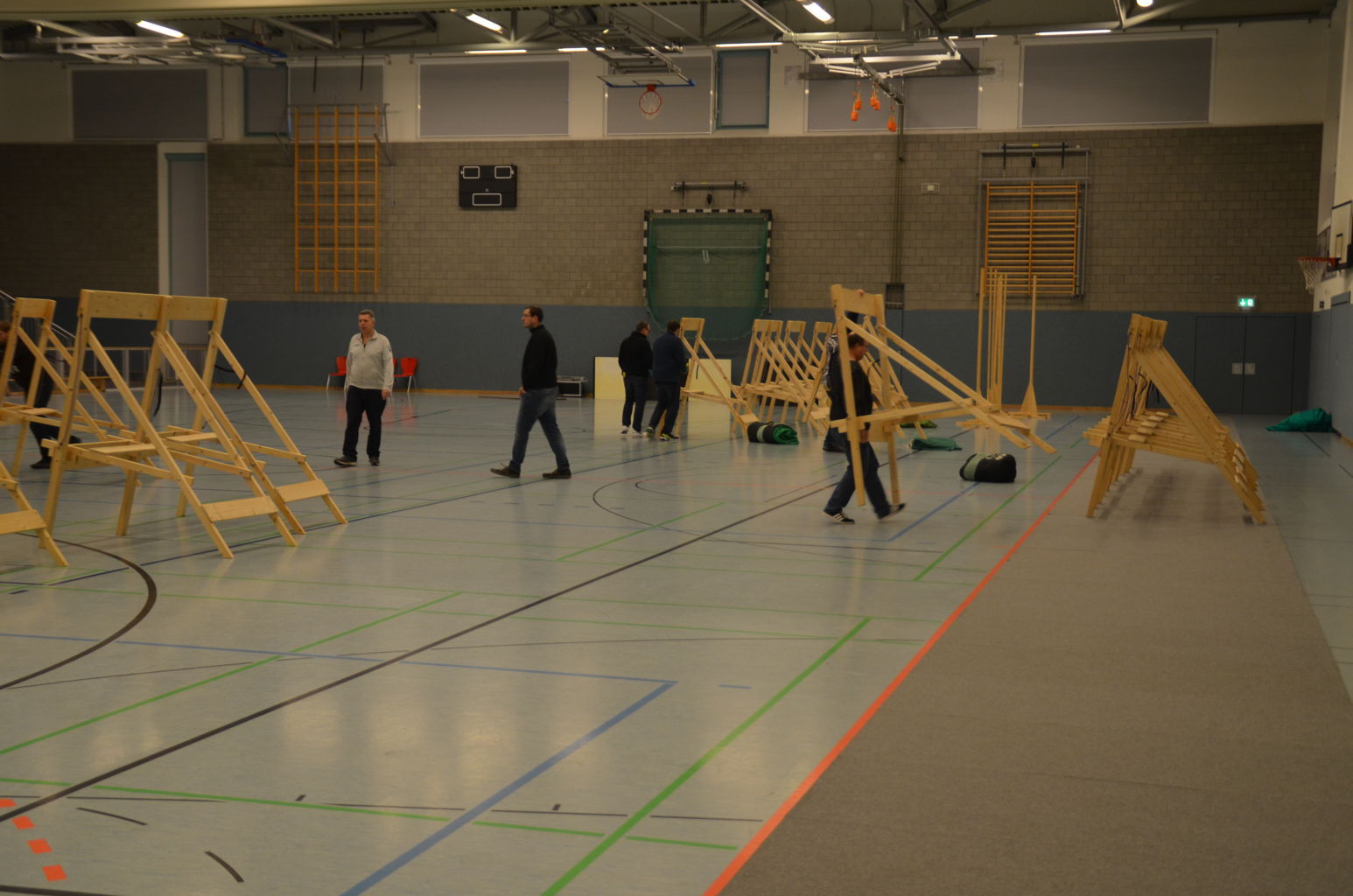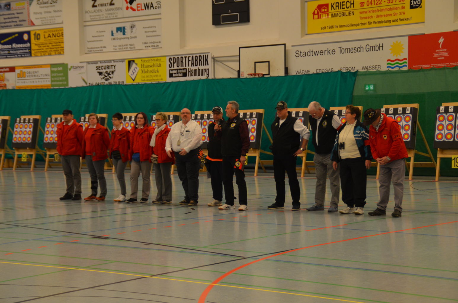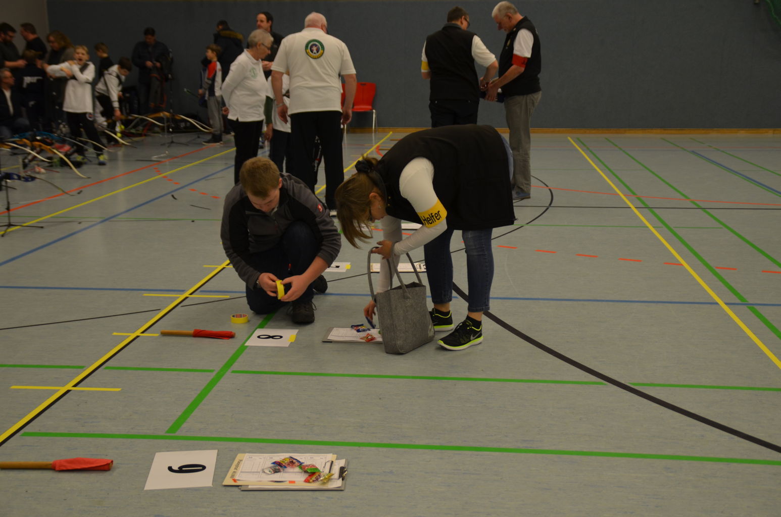 Nach 2016 stand auch für 2017 wieder die Ausrichtung der Landesmeisterschaft (LM) Bogen Halle für unseren Verein an. Sind wir mal ehrlich: Einerseits ist es jedesmal ein Kraftakt, alles Material aus den zwei Trainingssporthallen und unserer Bogenhütte zur Sporthalle der KGS Tornesch zu verbringen und alles getreu den Vorschriften der Sportordnung aufzbauen. Hier sind viele, sehr viele helfende Hände notwendig, ohne die so etwas nicht zu schaffen ist. An dieser Stelle allen Helfern einen herzlichen Dank. Andererseits spült die Ausrichtung aber auch einen finanziellen Betrag in die Kasse, ohne den wir unseren jetzigen Stand vielleicht nicht so schnell erreicht hätten. Also, in 4 Jahren 3-mal die Ausrichtung der LM und 3-mal die Ausrichtung der Kreismeisterschaft (KM) in dieser Halle, das führt zu einer Routine, so dass am Freitag auch schnell alles aufgebaut war. |