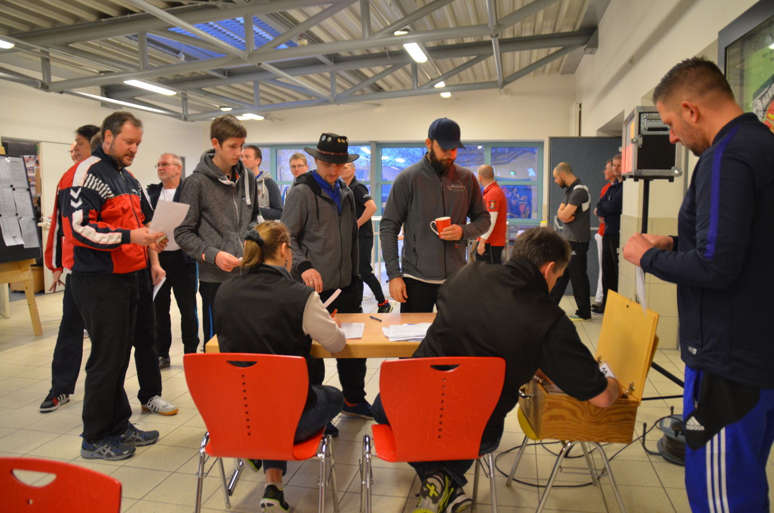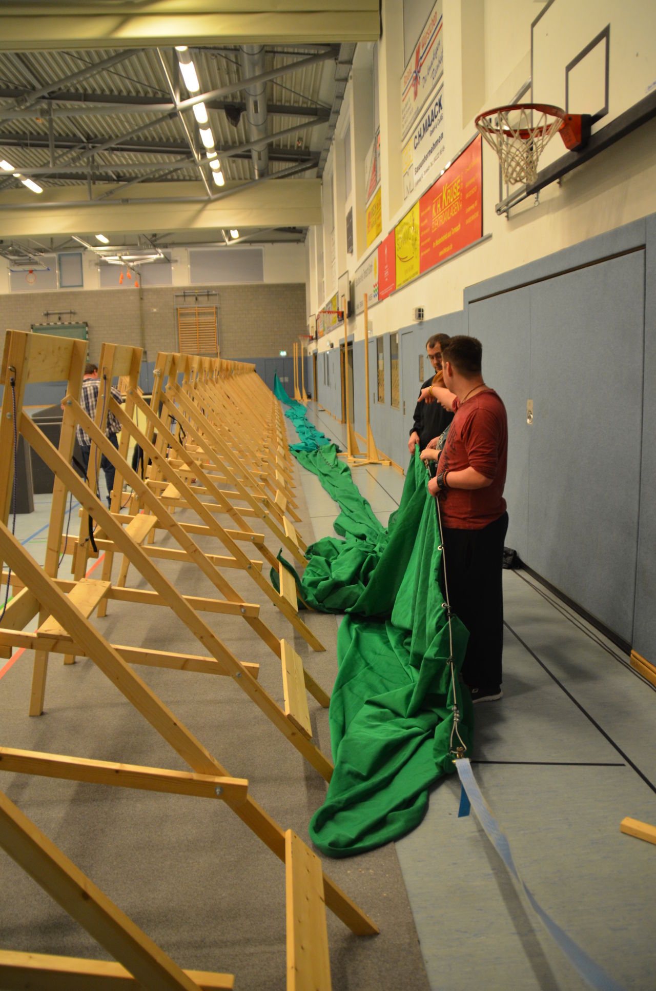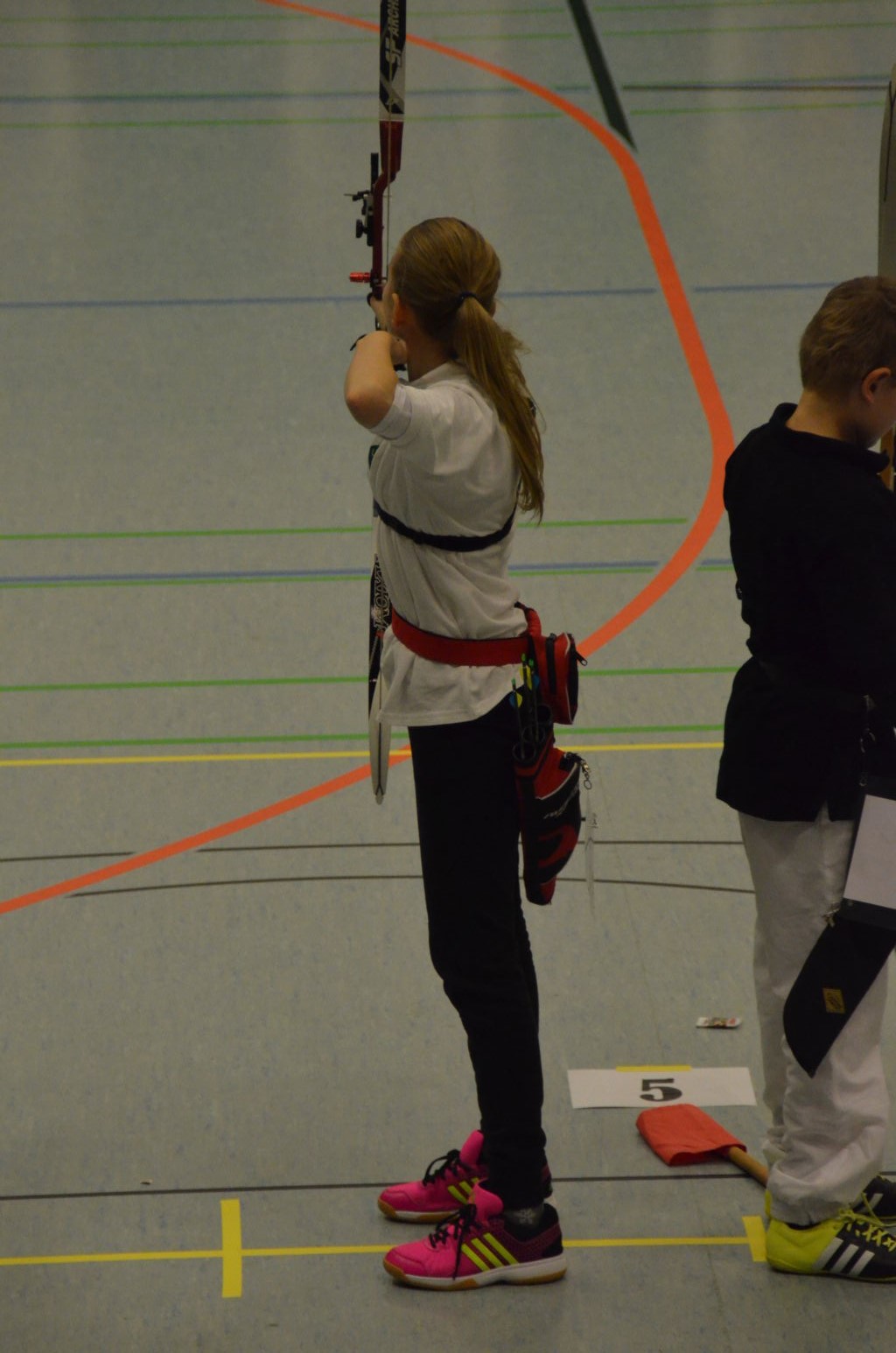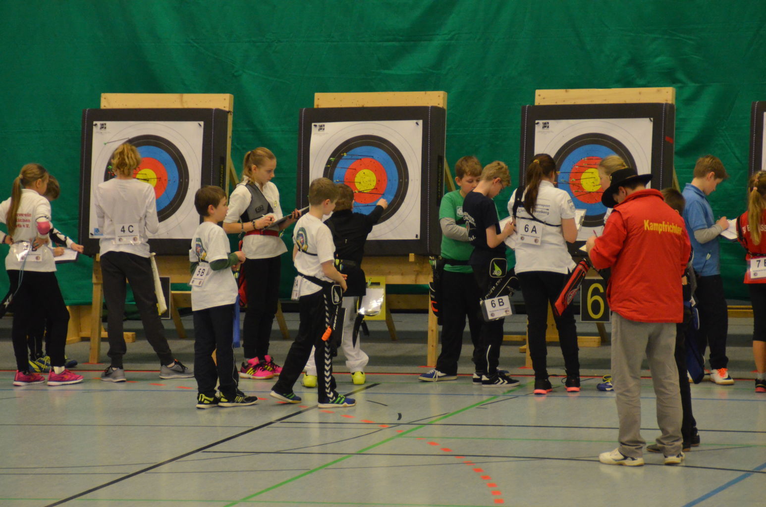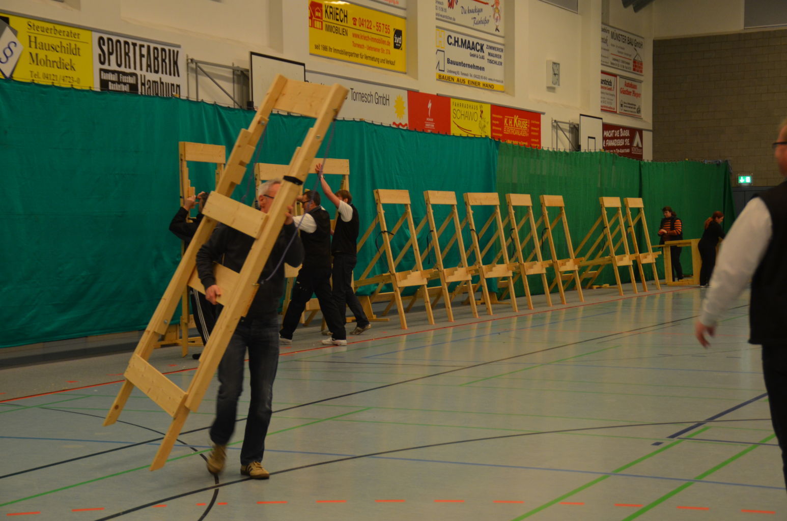 Nach 2016 stand auch für 2017 wieder die Ausrichtung der Landesmeisterschaft (LM) Bogen Halle für unseren Verein an. Sind wir mal ehrlich: Einerseits ist es jedesmal ein Kraftakt, alles Material aus den zwei Trainingssporthallen und unserer Bogenhütte zur Sporthalle der KGS Tornesch zu verbringen und alles getreu den Vorschriften der Sportordnung aufzbauen. Hier sind viele, sehr viele helfende Hände notwendig, ohne die so etwas nicht zu schaffen ist. An dieser Stelle allen Helfern einen herzlichen Dank. Andererseits spült die Ausrichtung aber auch einen finanziellen Betrag in die Kasse, ohne den wir unseren jetzigen Stand vielleicht nicht so schnell erreicht hätten. Also, in 4 Jahren 3-mal die Ausrichtung der LM und 3-mal die Ausrichtung der Kreismeisterschaft (KM) in dieser Halle, das führt zu einer Routine, so dass am Freitag auch schnell alles aufgebaut war. |