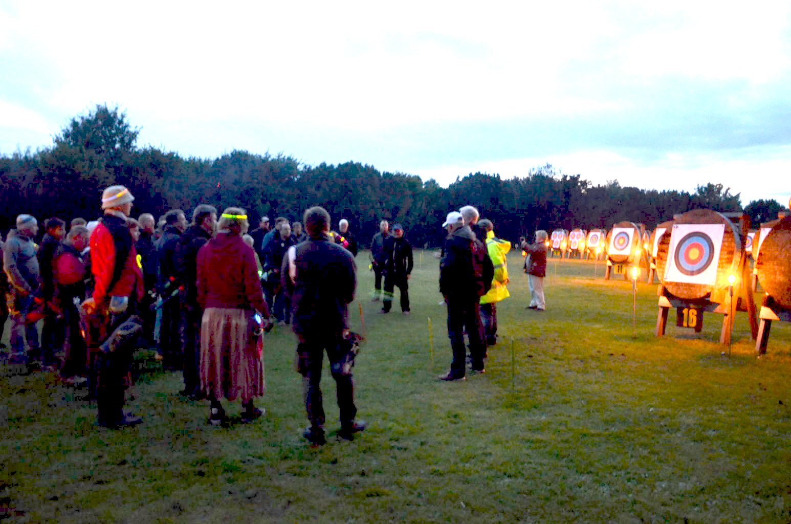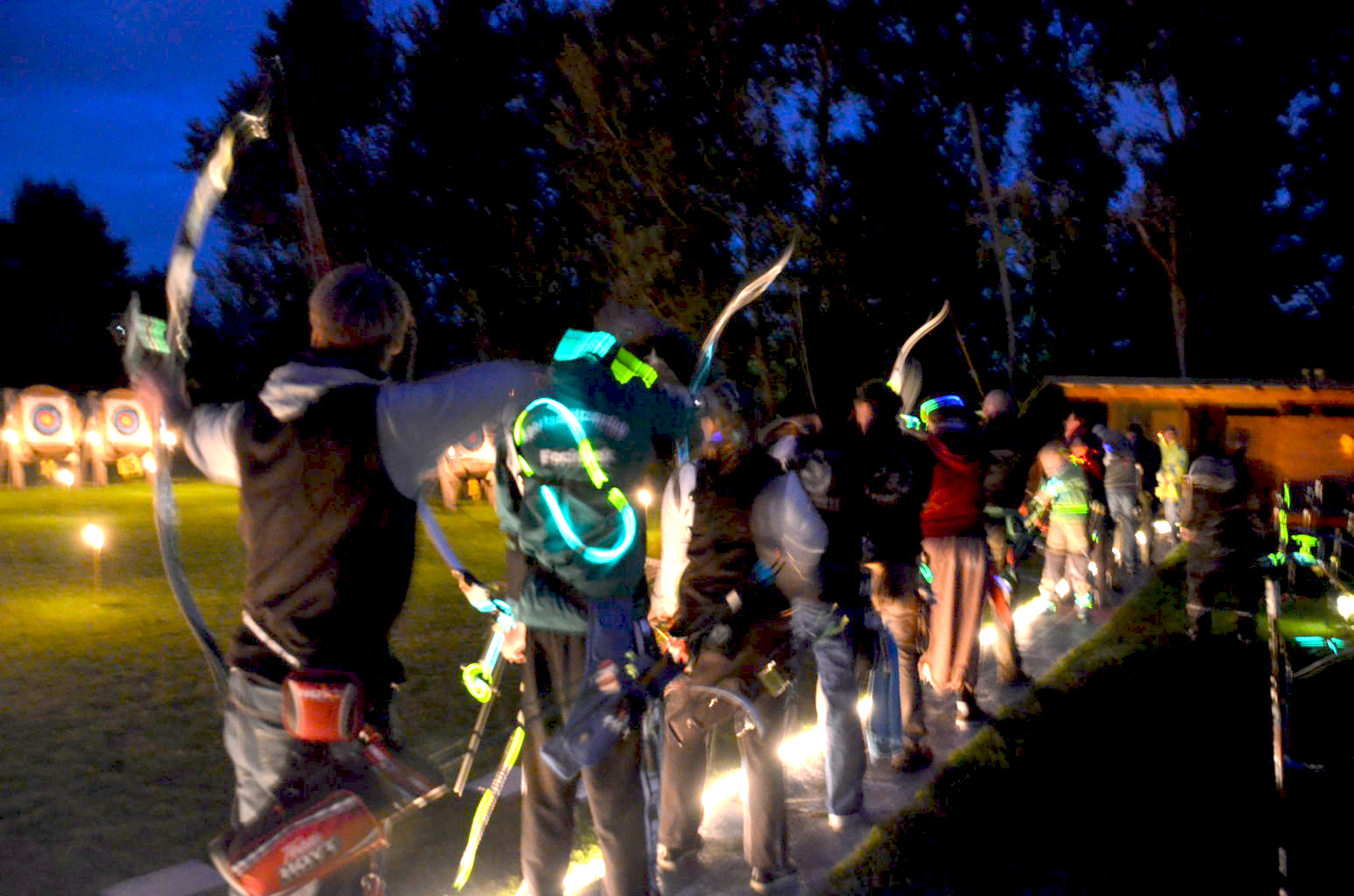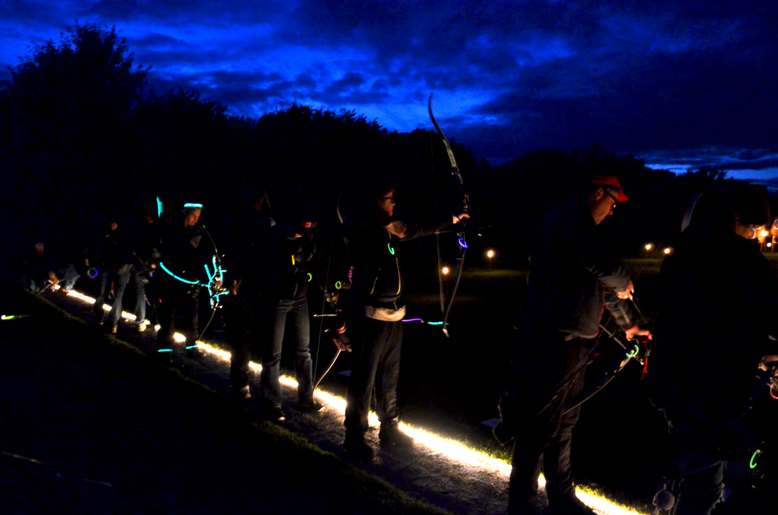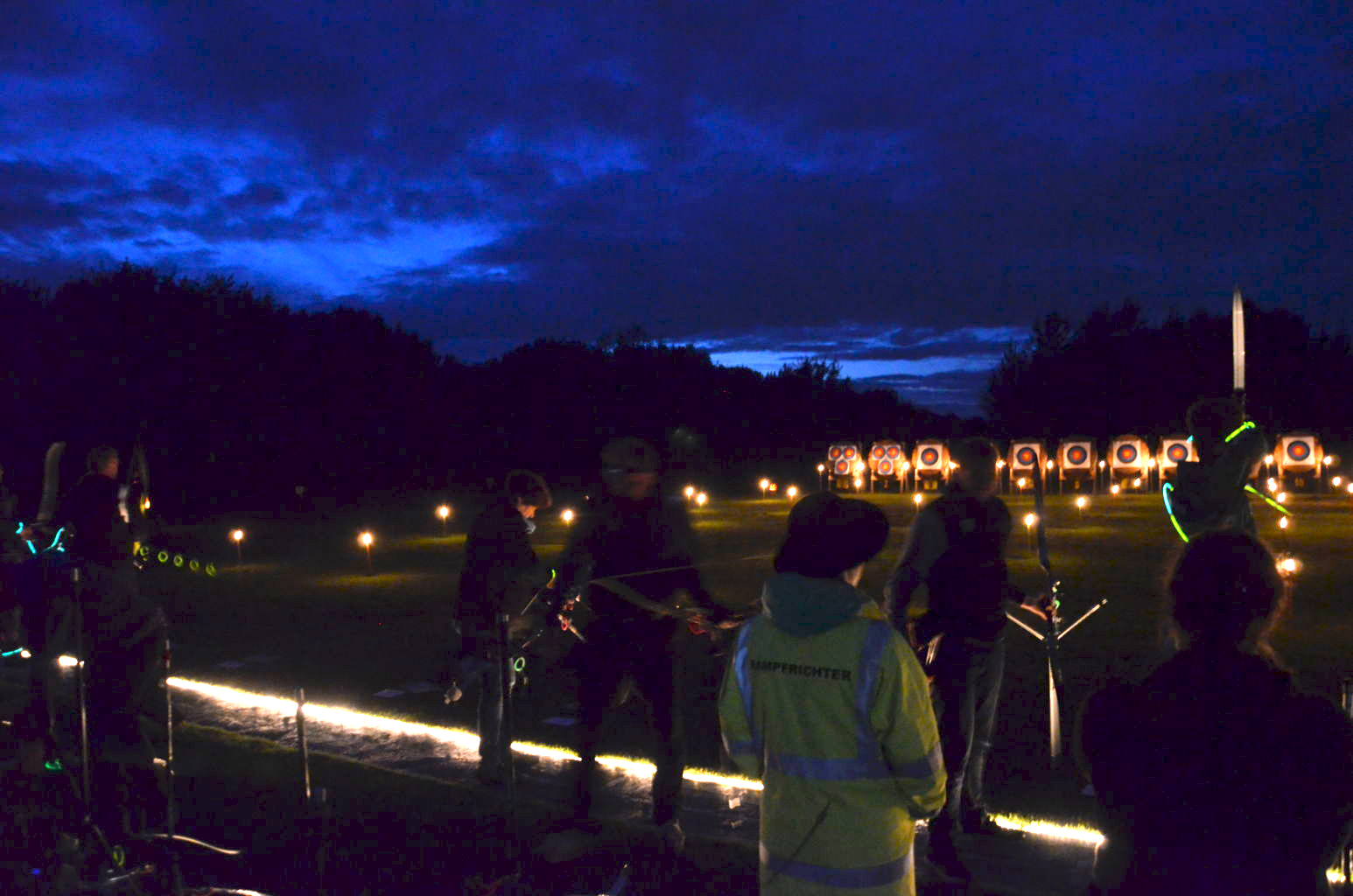 | Mit Einbruch der Dämmerung wurden die Fackeln an den Scheiben entzündet. Nach einer kurzen Begrüßung durch Thomas, unserem Spartenleiter der Bogenabteilung und Erläuterung der Regeln durch unsere Kampfrichter konnte das Einschießen und anschließend das Turnier beginnen. |