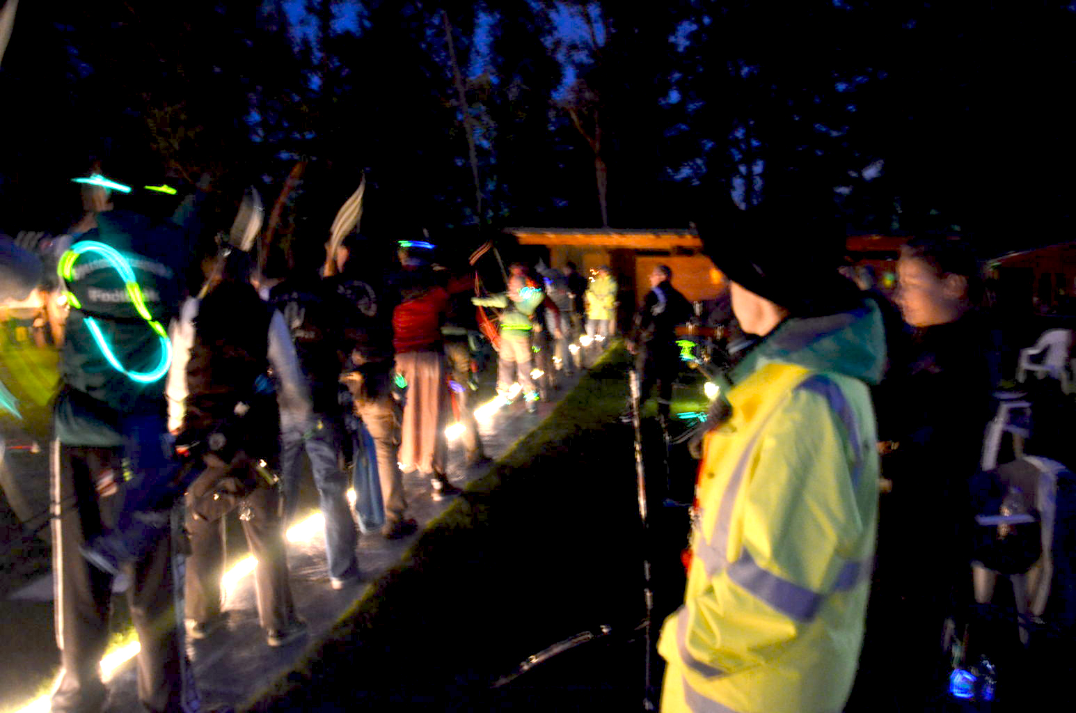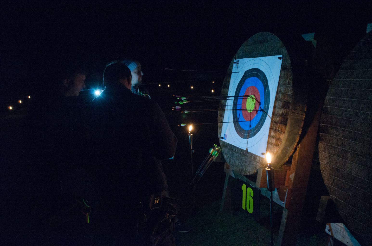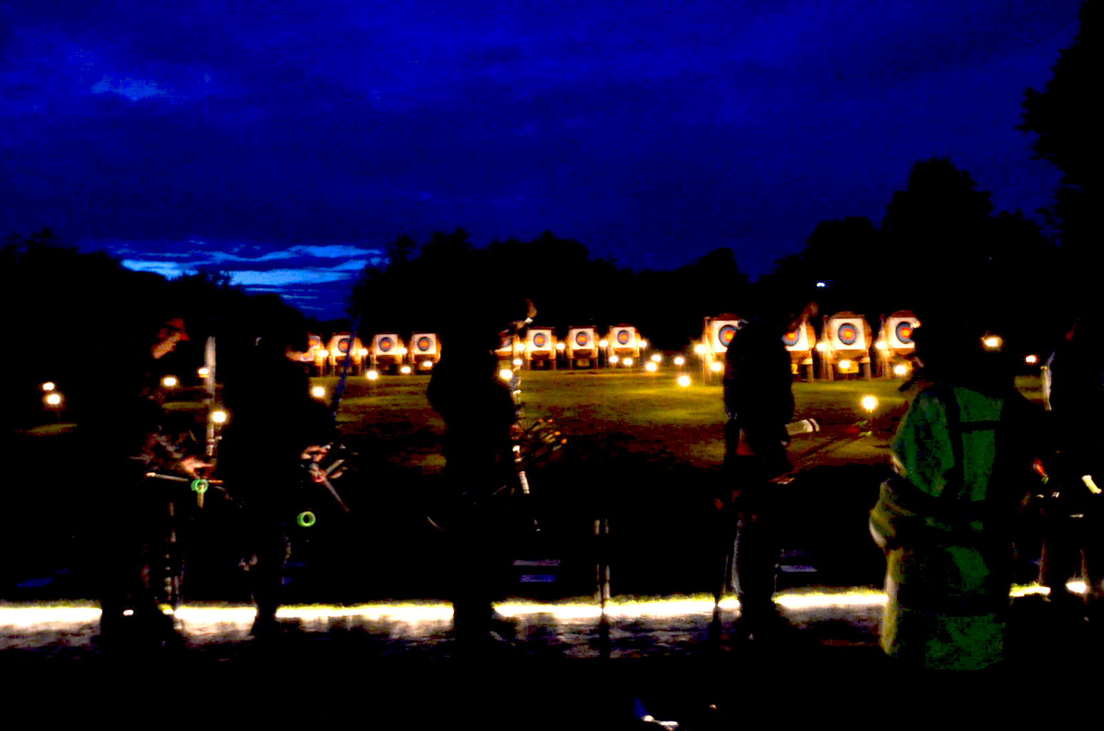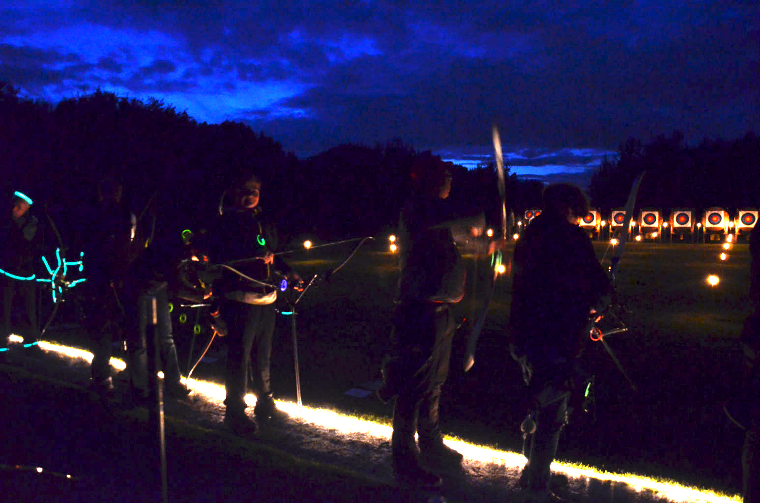 | Mit Einbruch der Dämmerung wurden die Fackeln an den Scheiben entzündet. Nach einer kurzen Begrüßung durch Thomas, unserem Spartenleiter der Bogenabteilung und Erläuterung der Regeln durch unsere Kampfrichter konnte das Einschießen und anschließend das Turnier beginnen. |