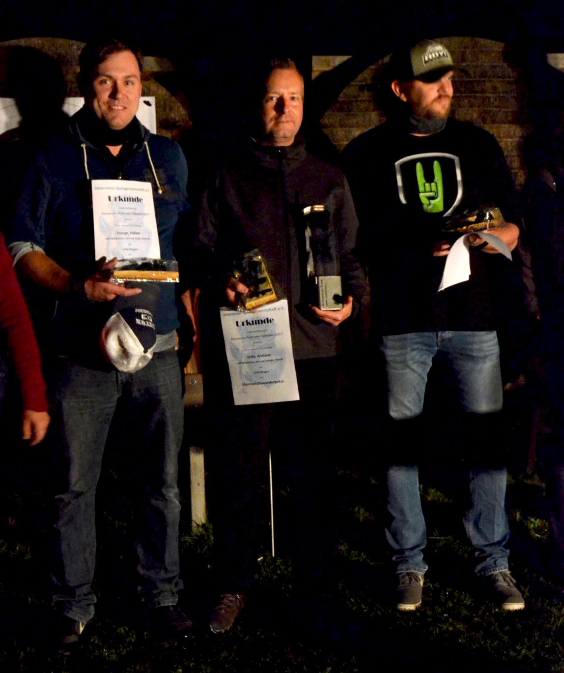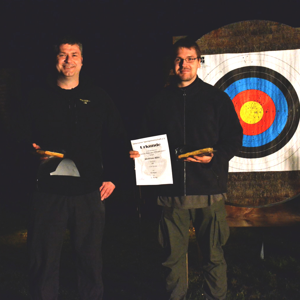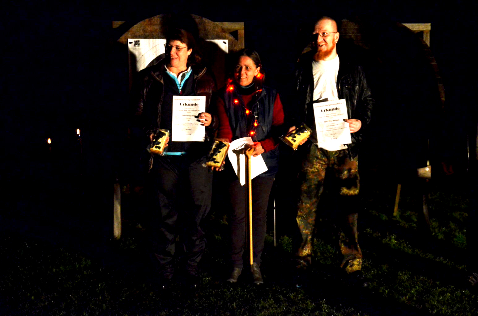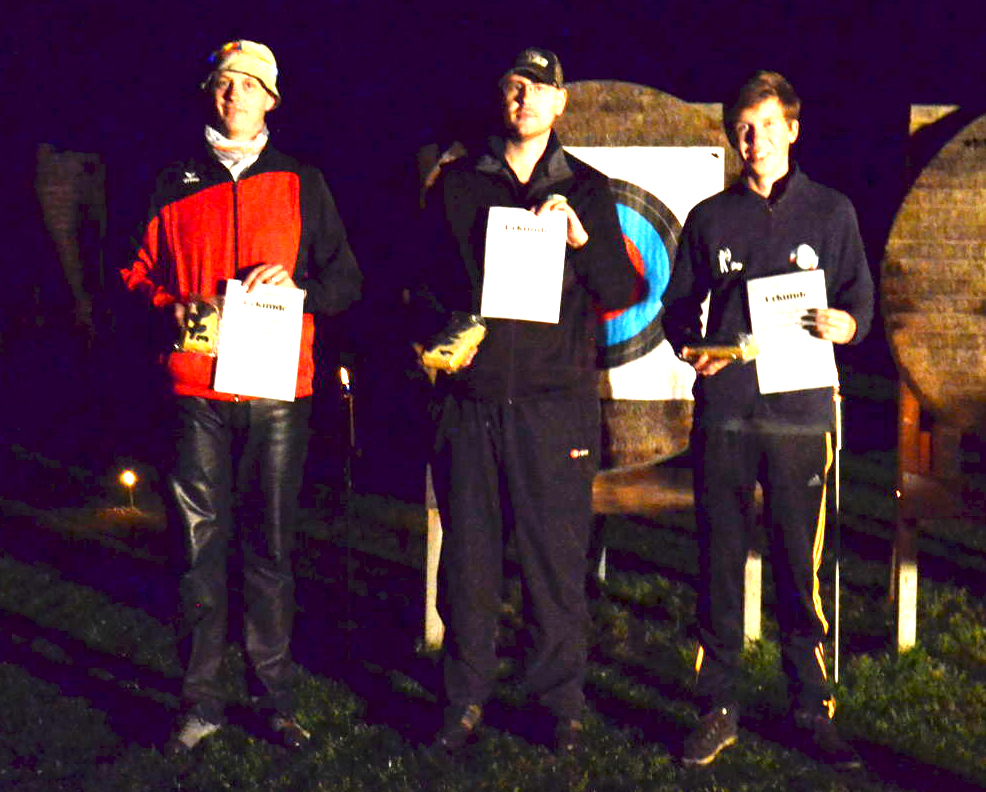 Nachdem das Turnier beendet ist, werden schnell die Ergebnisse ausgewertet und die Siegerehrung kann beginnen. 10m Distanz - Neueinsteiger: 1. Platz - Björn Modersohn, 2. Platz - Patrick Tremel, beide USG und 3. Platz - André Sell, ein Gast aus Bremen, der an diesem Tag erstmals mit einem Bogen geschossen hat. 18m Distanz - Blankschützen und Schüler A/B: 1. Platz - Claudia Meik-Pinnow, 2. Platz - Kay Michael Ebert, beide TuS Borstel-Hohenraden und 3. Platz - Heidi Liebenberg, USG. 30m Distanz - Recurveschützen: 1. Platz - Adrian Kiehn, 2. Platz - Paul Moerler, beide USG und 3. Platz - Enrico Reetz, ESV Rostock. 30m Distanz - Compoundbogen: 1. Platz - Jan Dieckmann, SV Quickborn-Renzel, 2. Platz - Paul Söhngen und 3. Platz - Sebastian Dorn, beide USG. Den Mannschafts-Wanderpokal gewannen Jan Dieckmann, Fabian Stange und Andreas Seibt, alle vom SV Quickborn-Renzel. Allen Gewinnern einen herzlichen Glückwunsch! Hier könnt ihr die Einzelergebnisse aller Teilnehmer und die Mannschaftsergebnisse nachlesen. (OLu) |