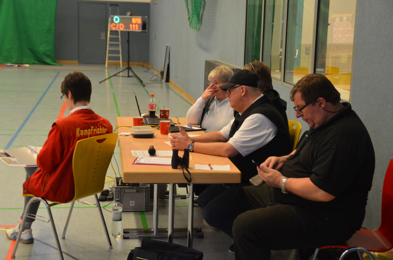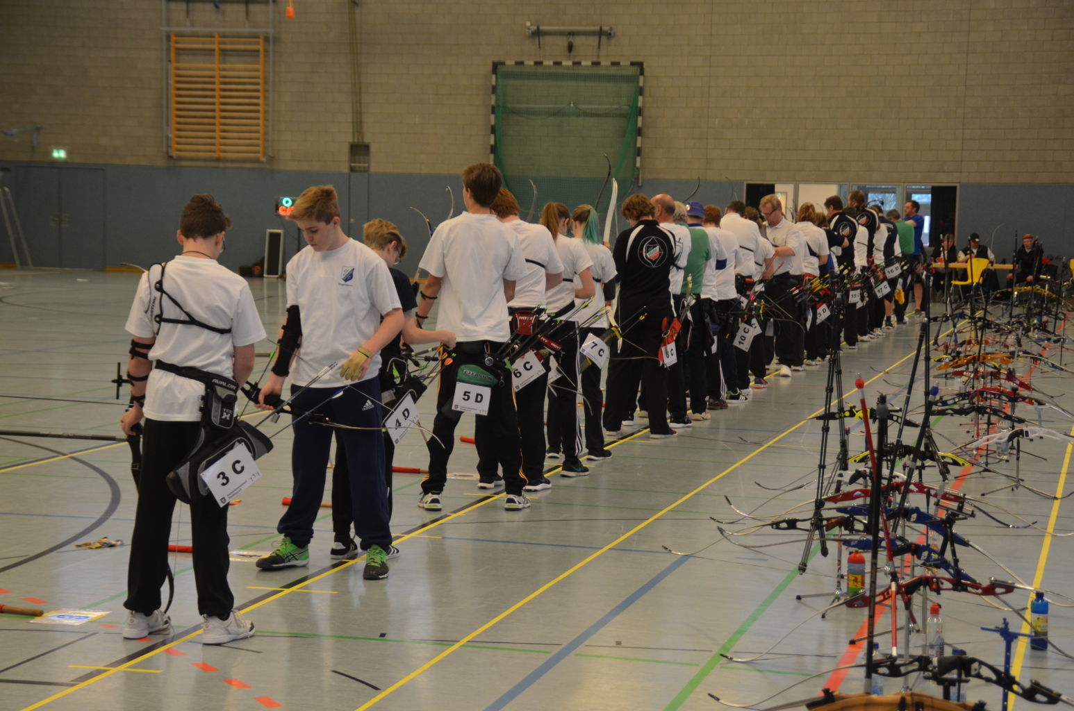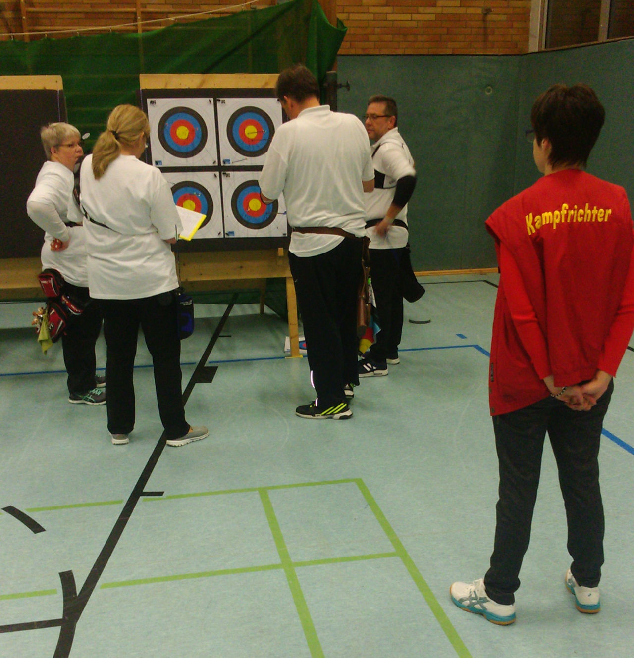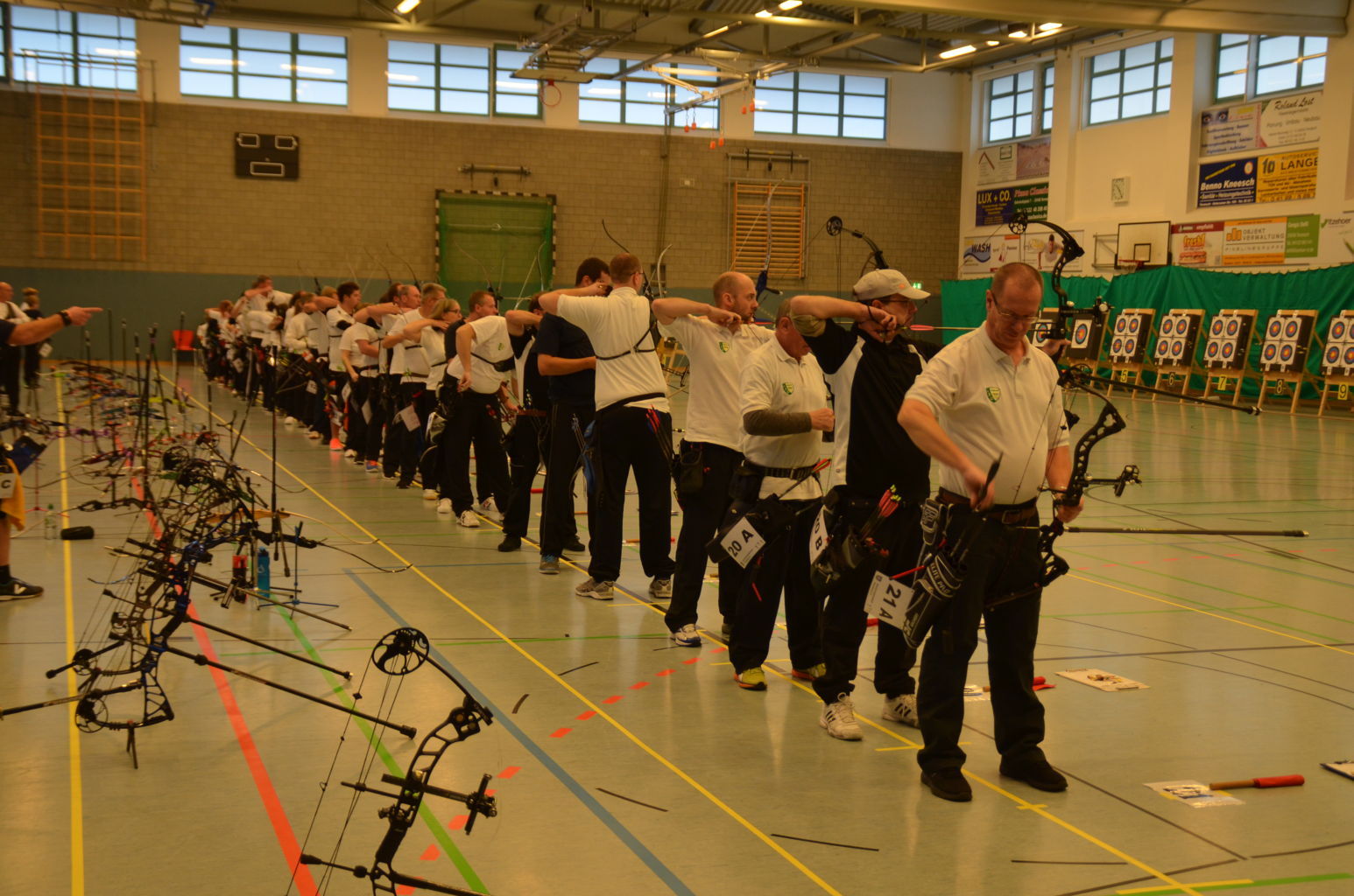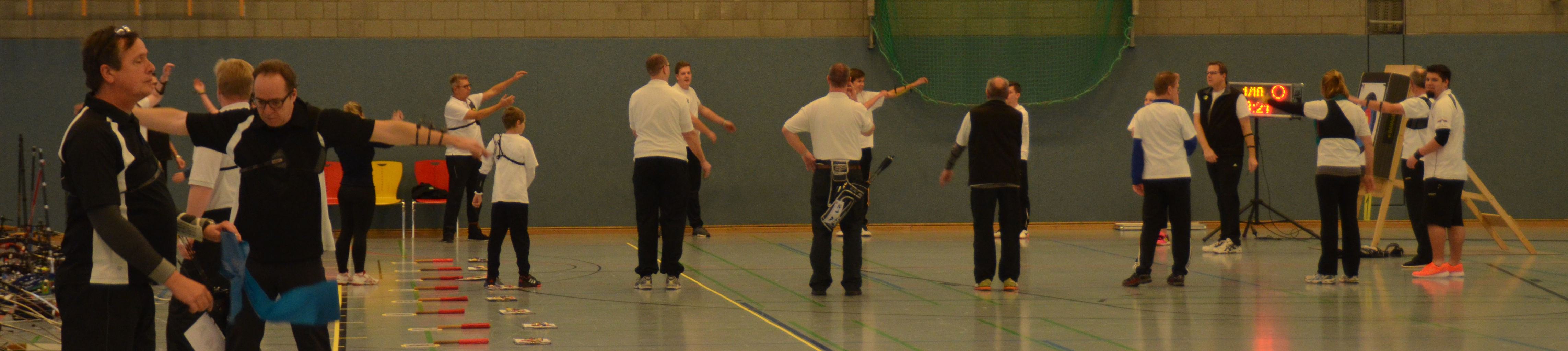 | Am Samstag wurde dann mit inzwischen viel Erfahrung der Aufbau der Scheiben und des Fangnetzes, das Markieren der Schießlinie usw. vorgenommen, nachdem das Material von der Trainingshalle und der Vereinshütte zur Sporthalle der KGST gebracht war. |