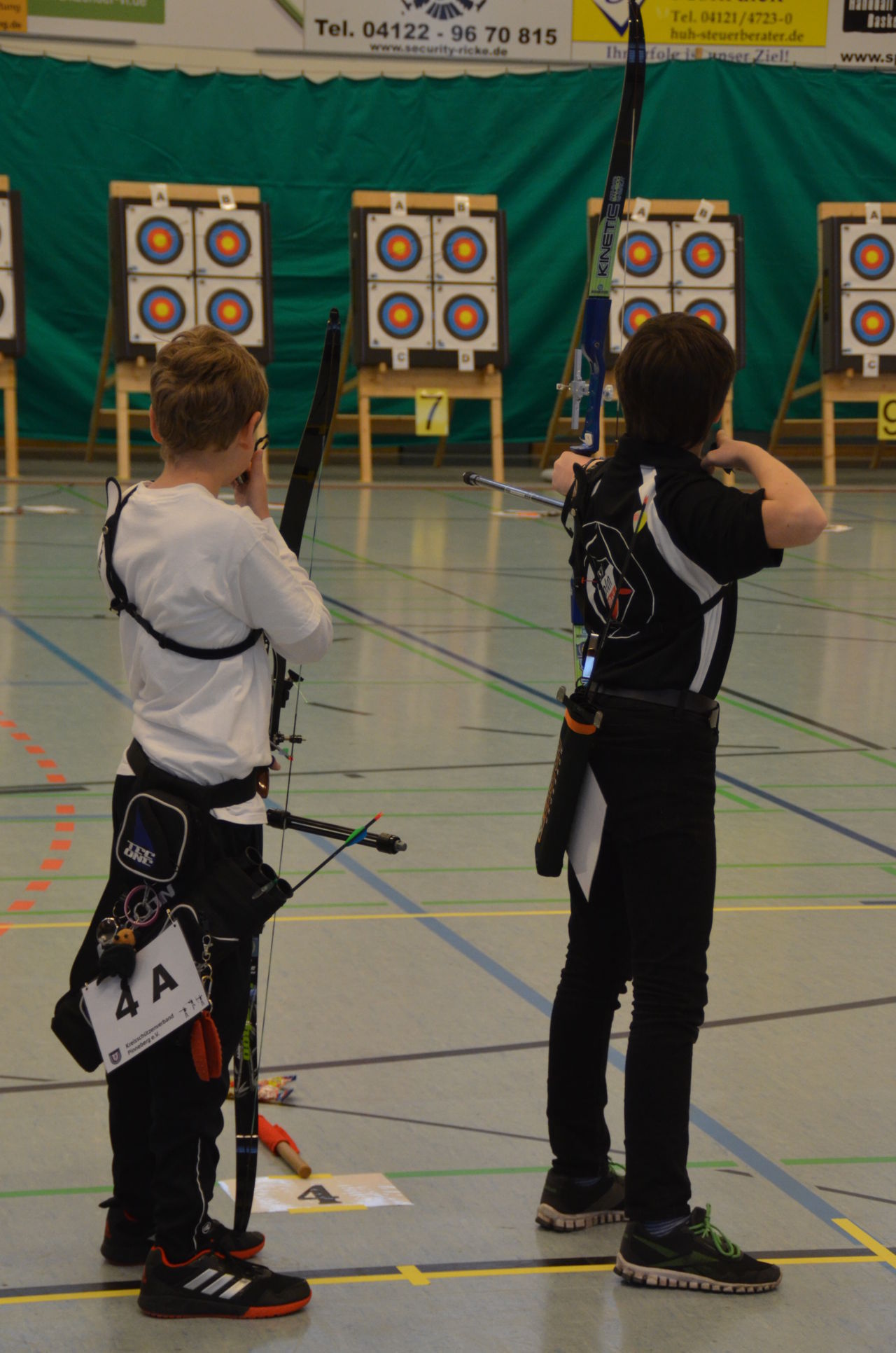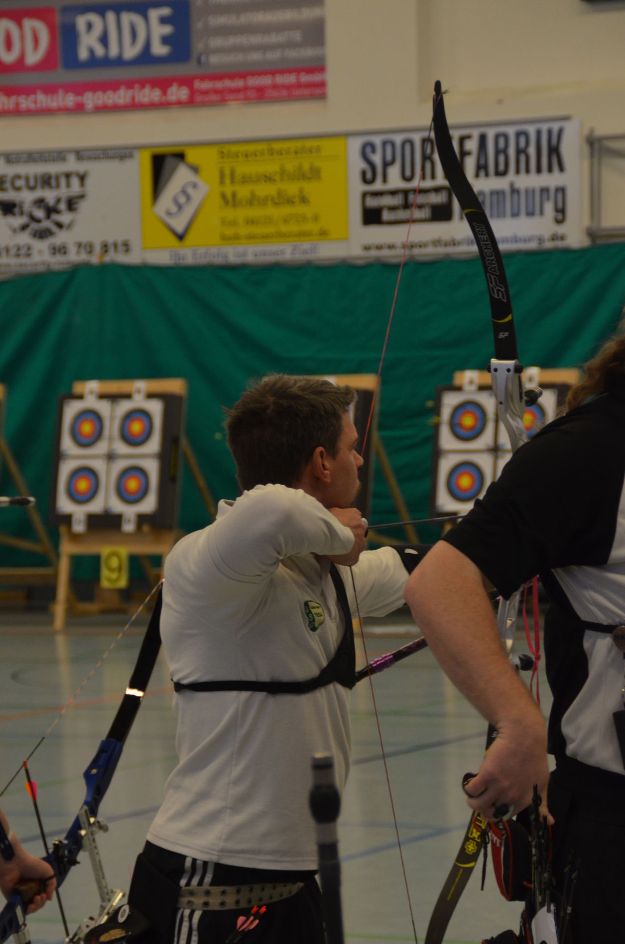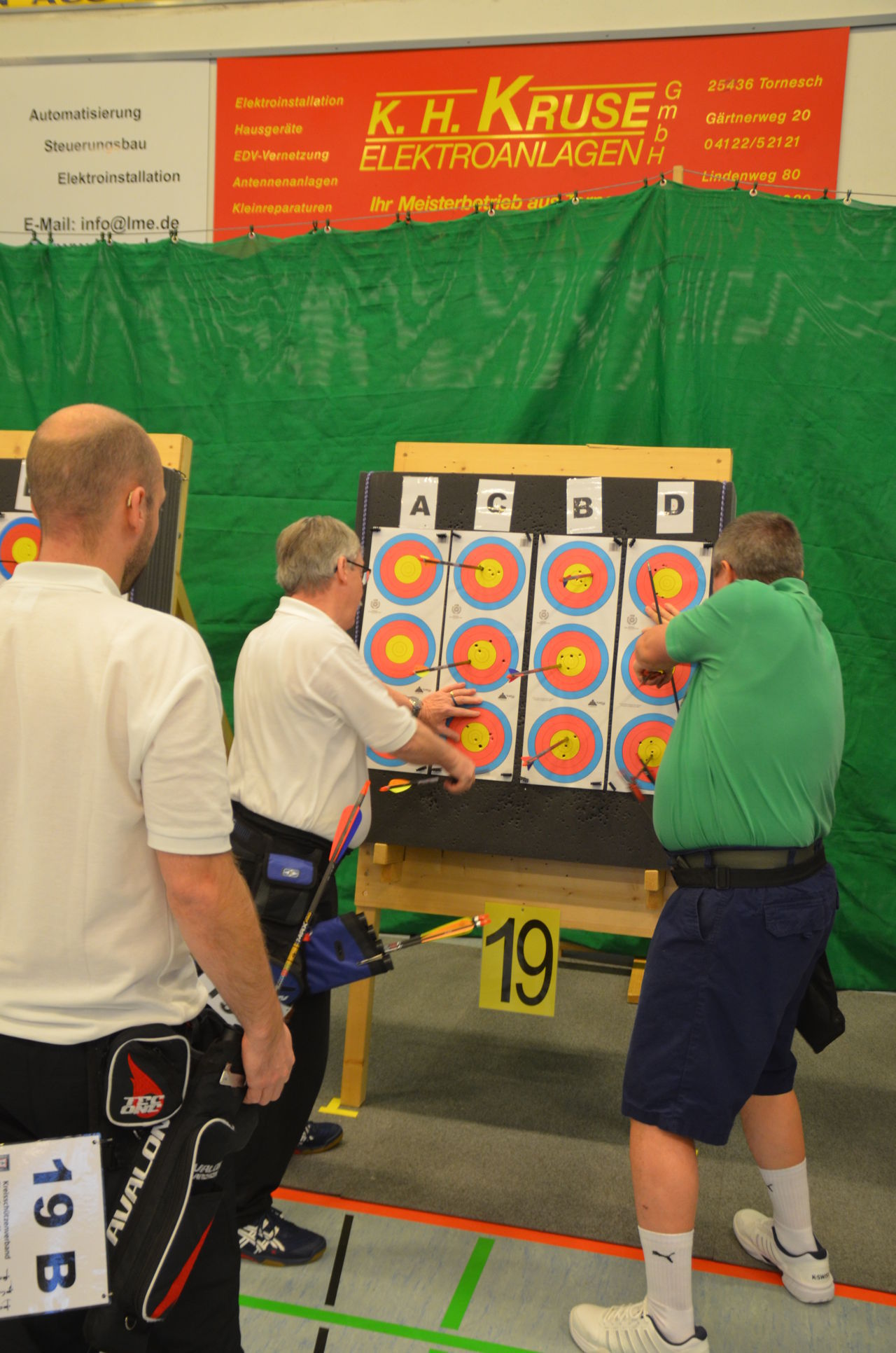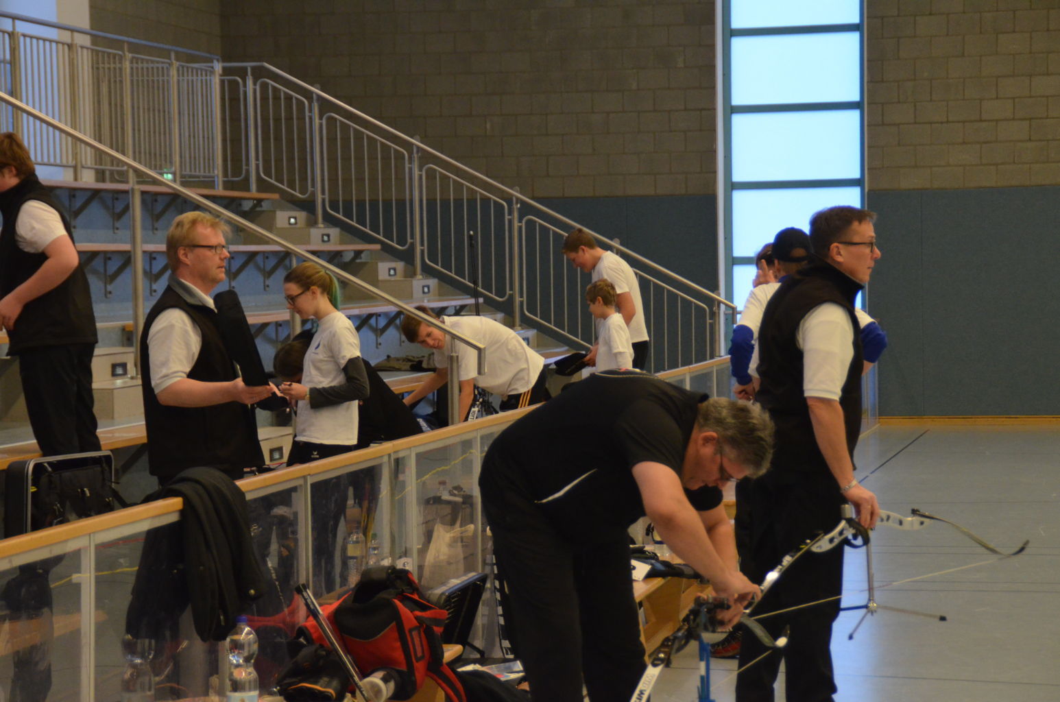 | Am Samstag wurde dann mit inzwischen viel Erfahrung der Aufbau der Scheiben und des Fangnetzes, das Markieren der Schießlinie usw. vorgenommen, nachdem das Material von der Trainingshalle und der Vereinshütte zur Sporthalle der KGST gebracht war. |