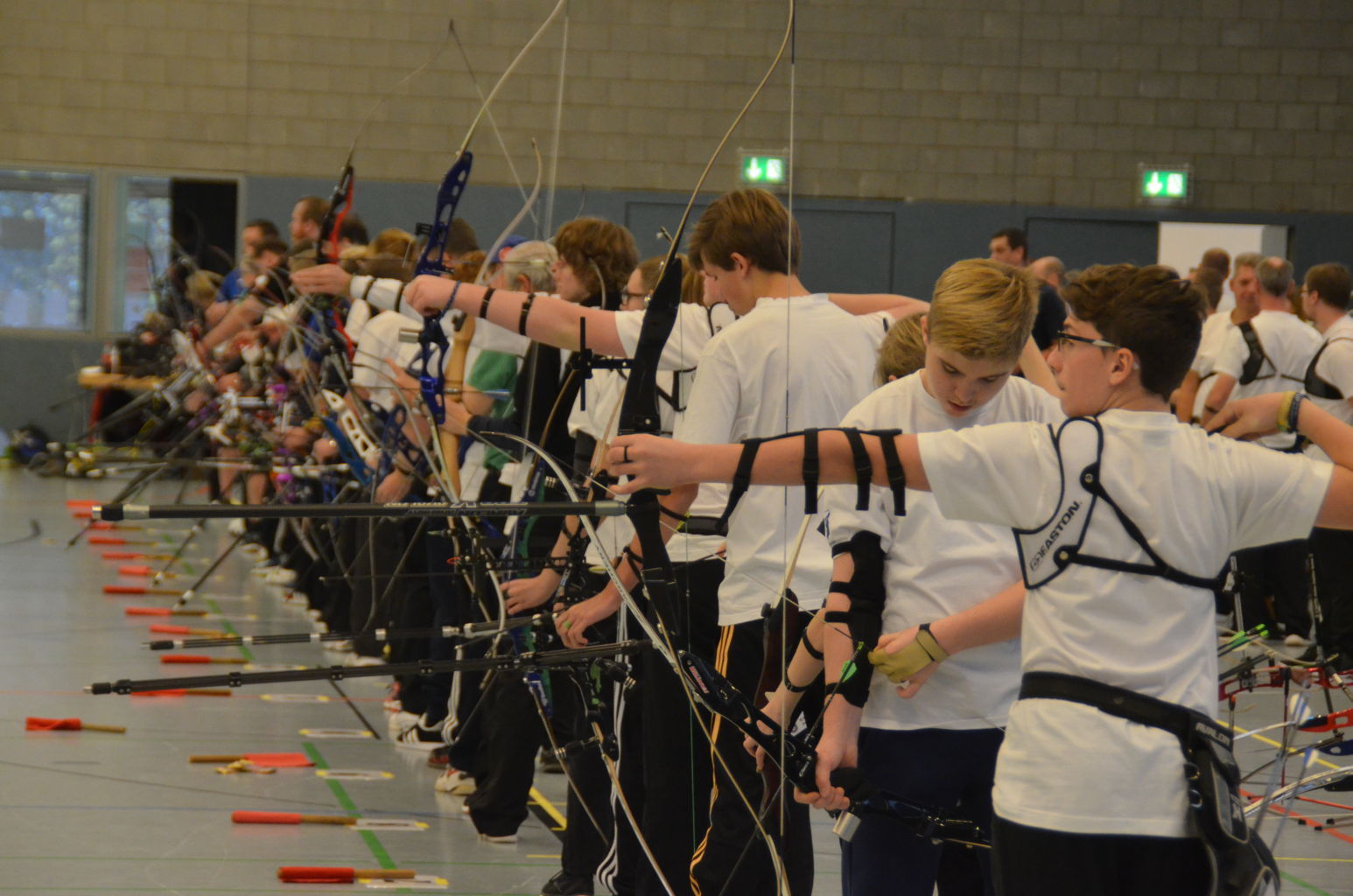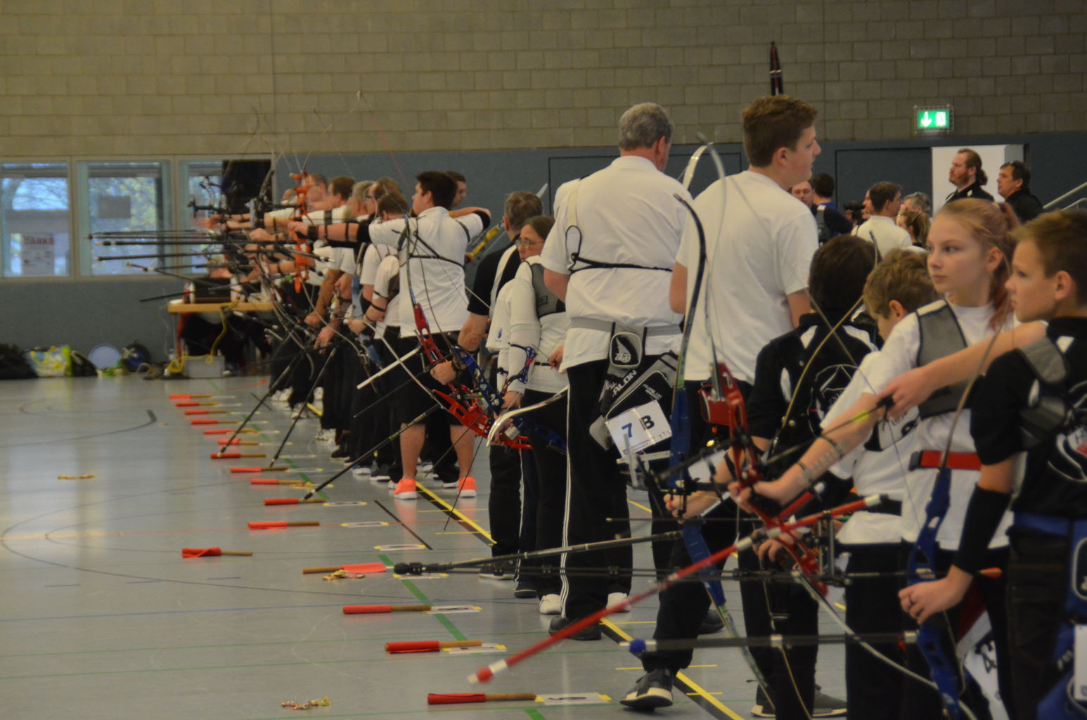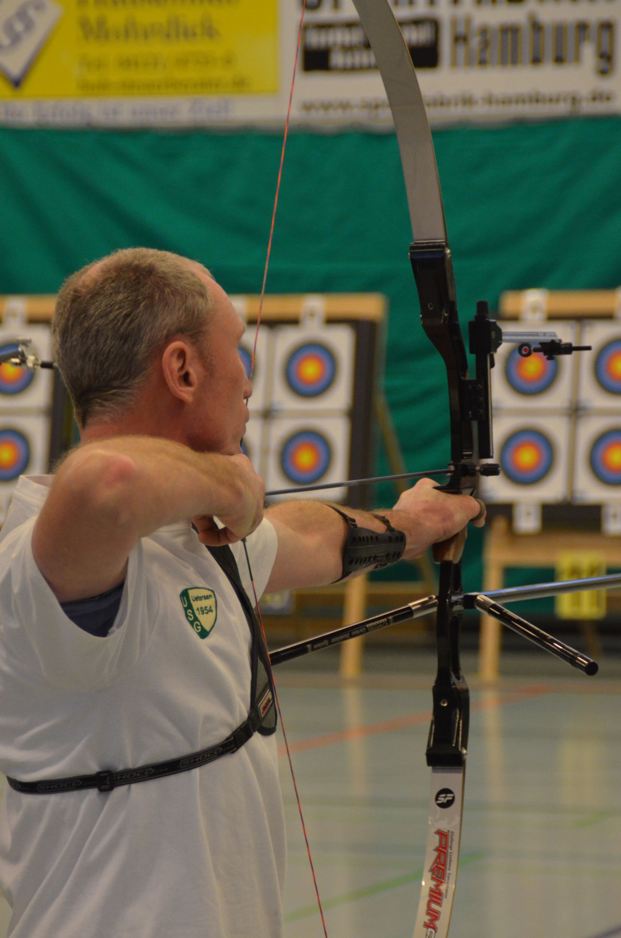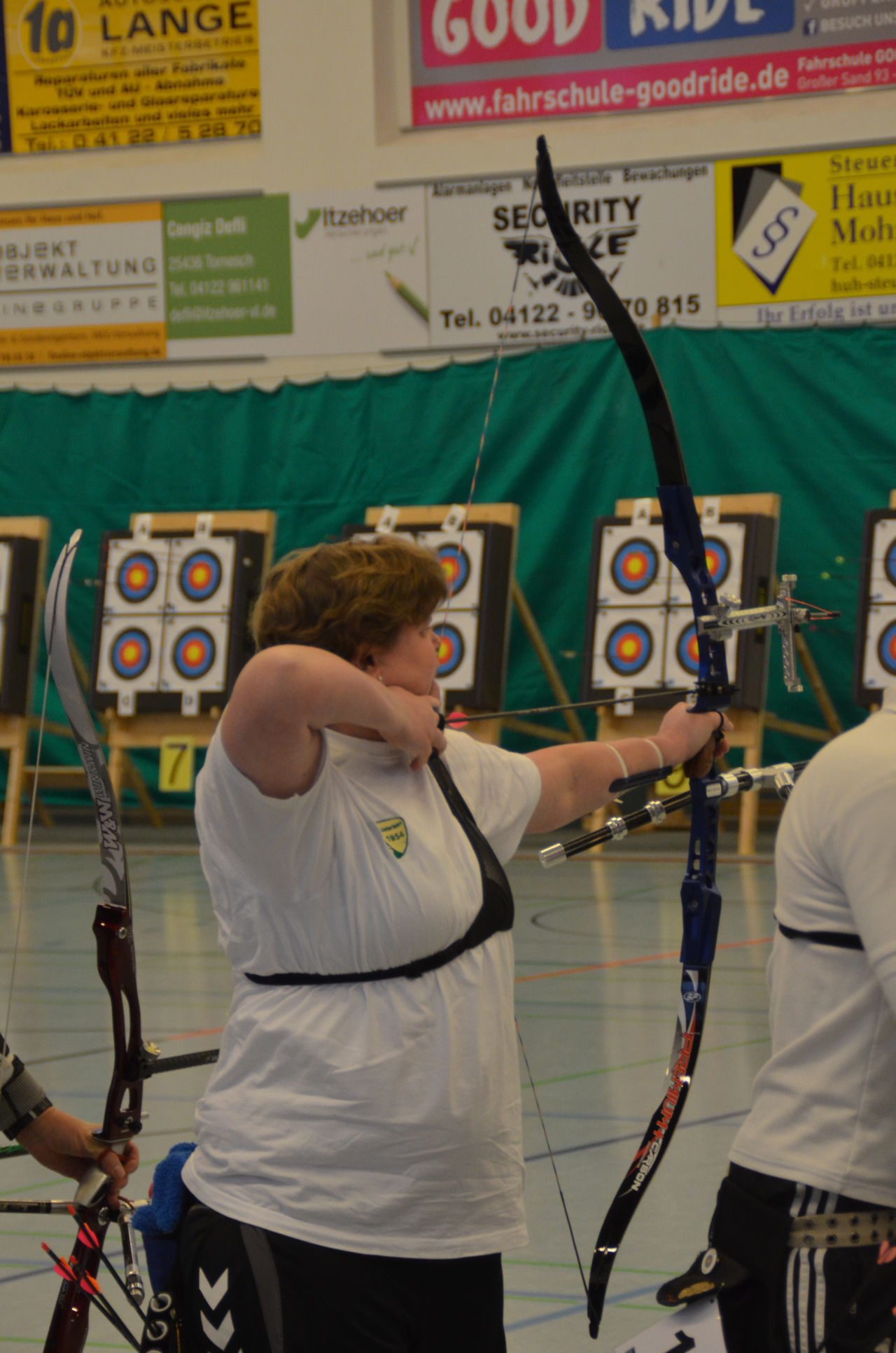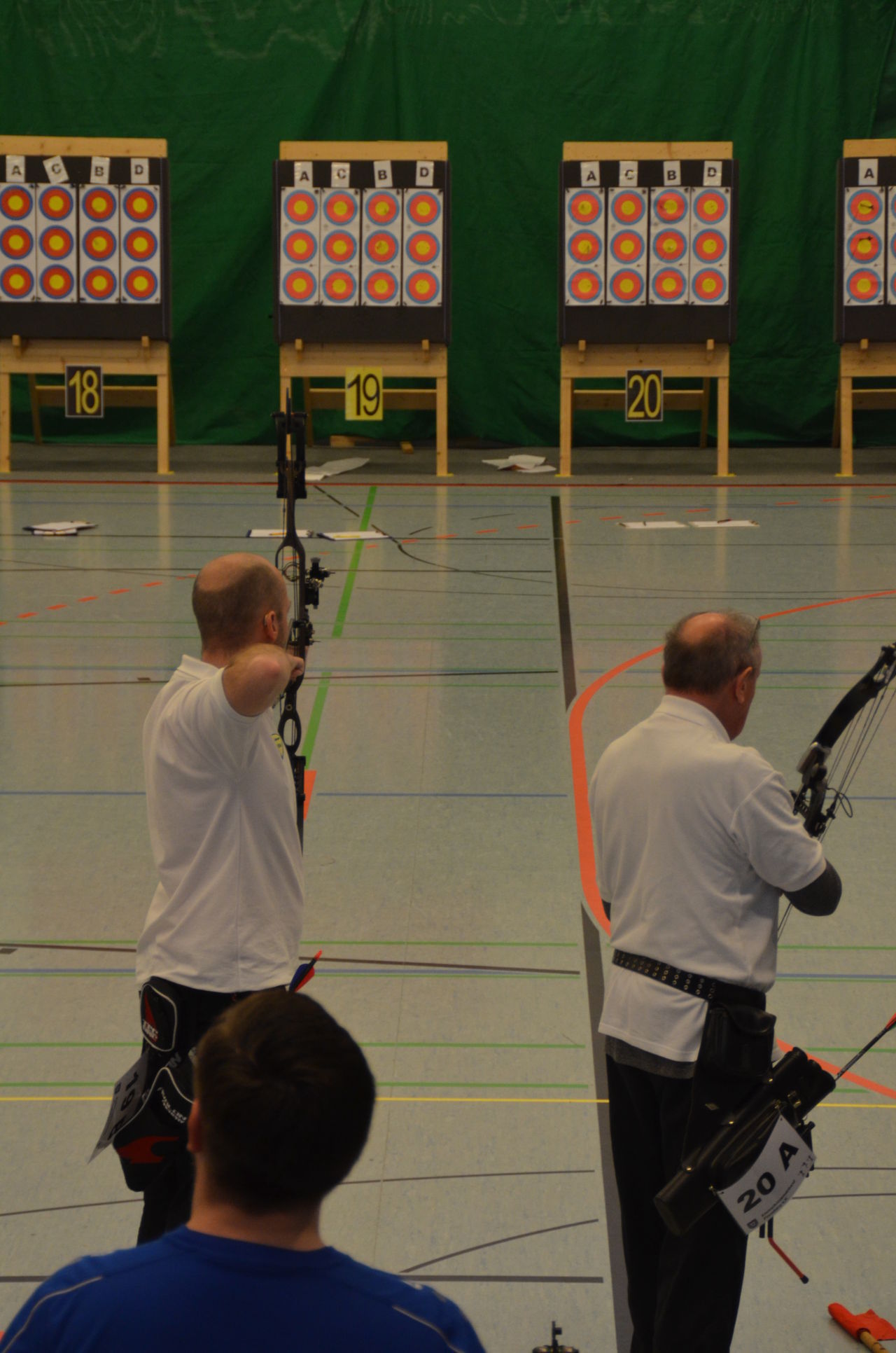 | Am Samstag wurde dann mit inzwischen viel Erfahrung der Aufbau der Scheiben und des Fangnetzes, das Markieren der Schießlinie usw. vorgenommen, nachdem das Material von der Trainingshalle und der Vereinshütte zur Sporthalle der KGST gebracht war. |