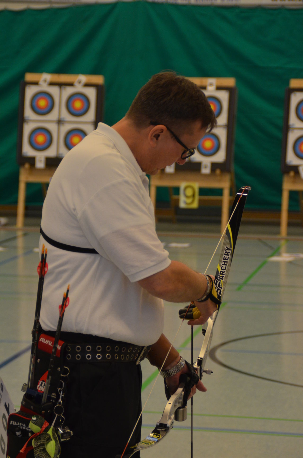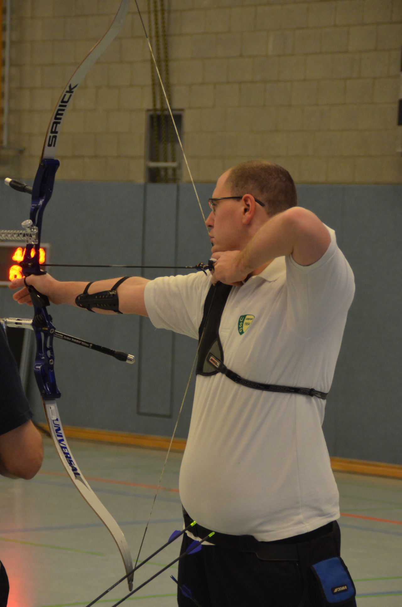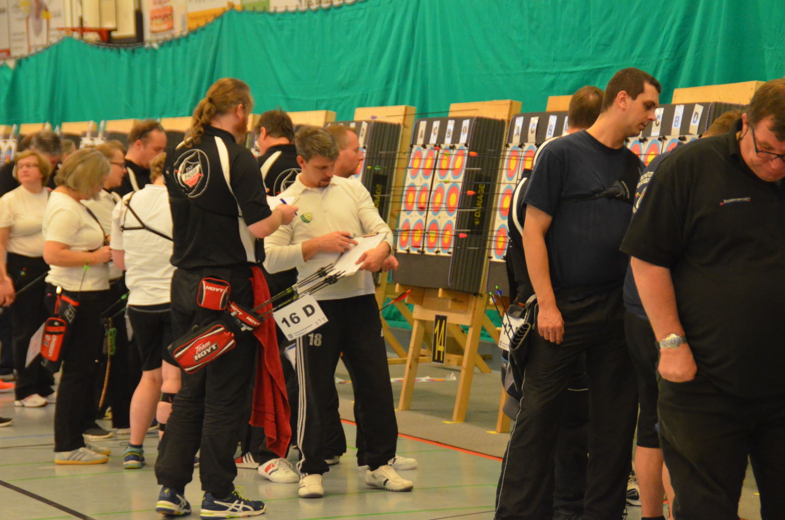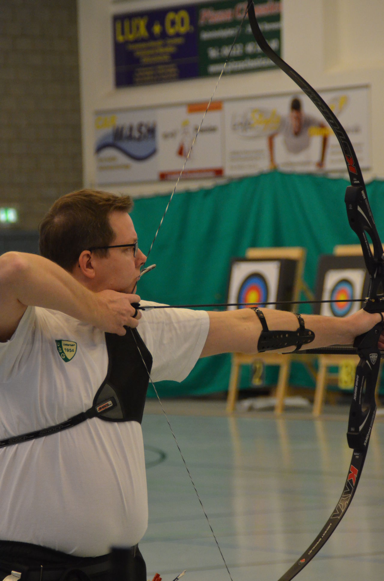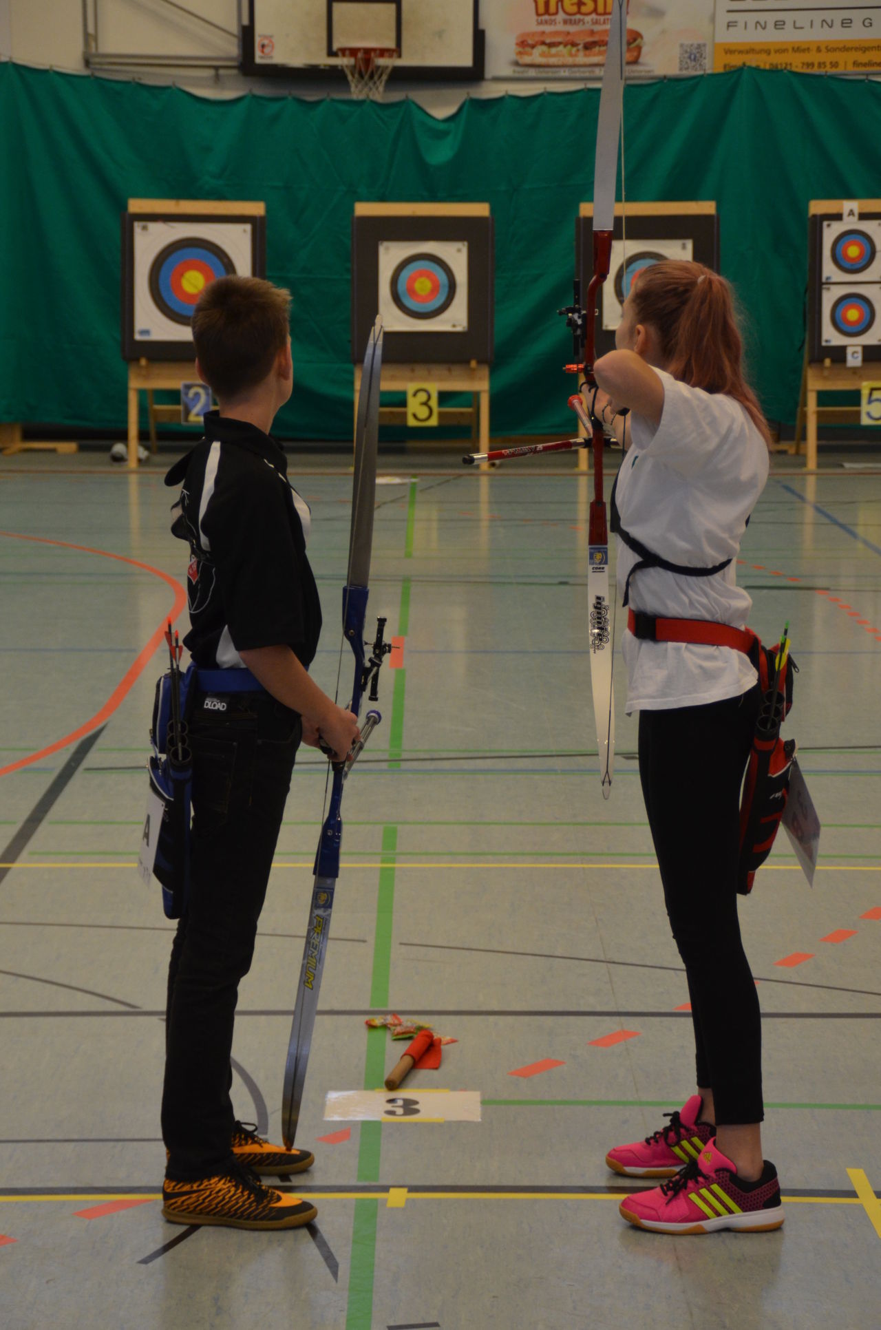 | Am Samstag wurde dann mit inzwischen viel Erfahrung der Aufbau der Scheiben und des Fangnetzes, das Markieren der Schießlinie usw. vorgenommen, nachdem das Material von der Trainingshalle und der Vereinshütte zur Sporthalle der KGST gebracht war. |
