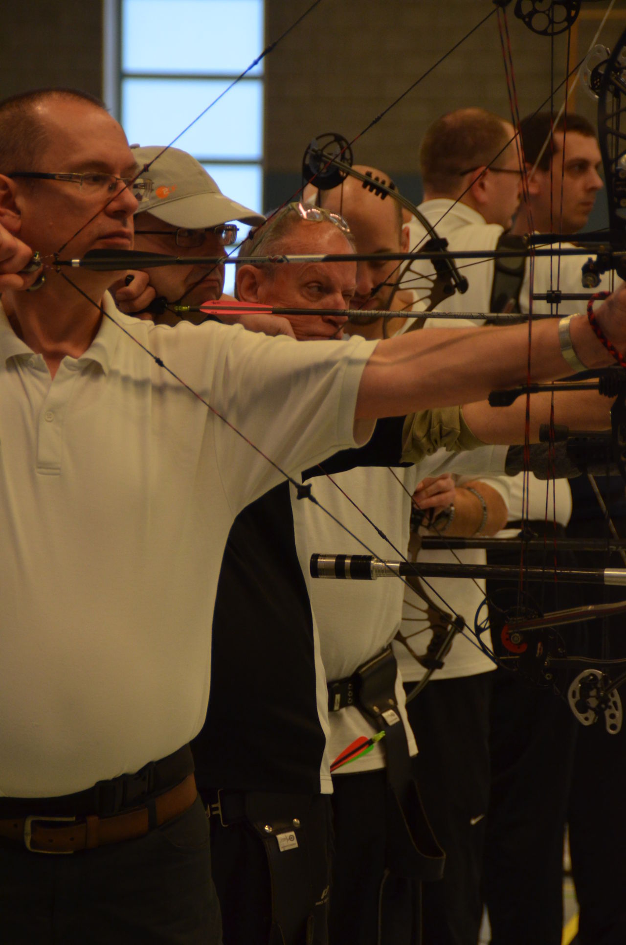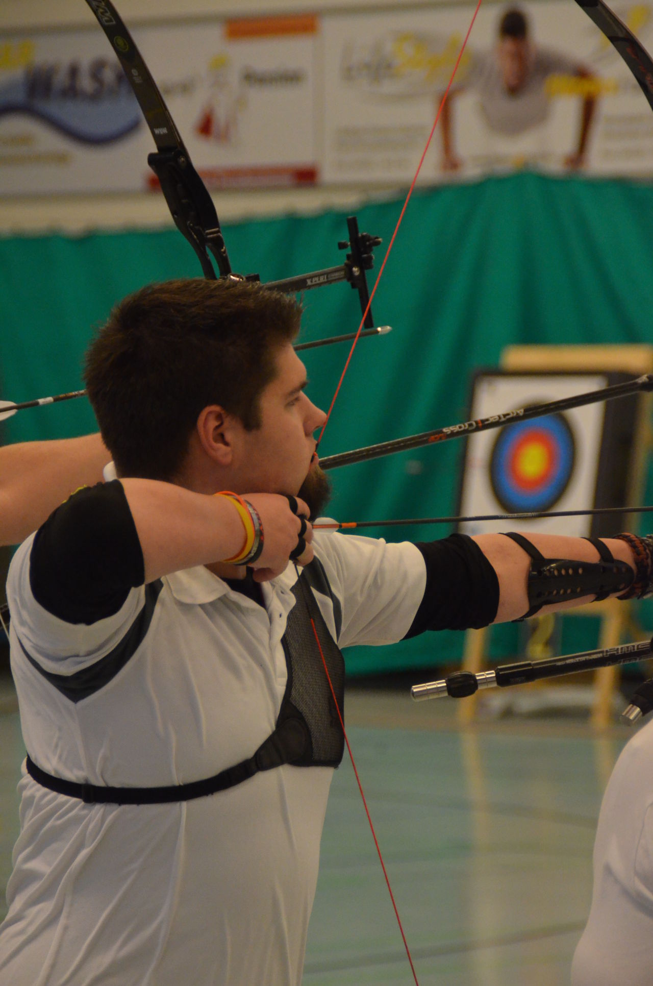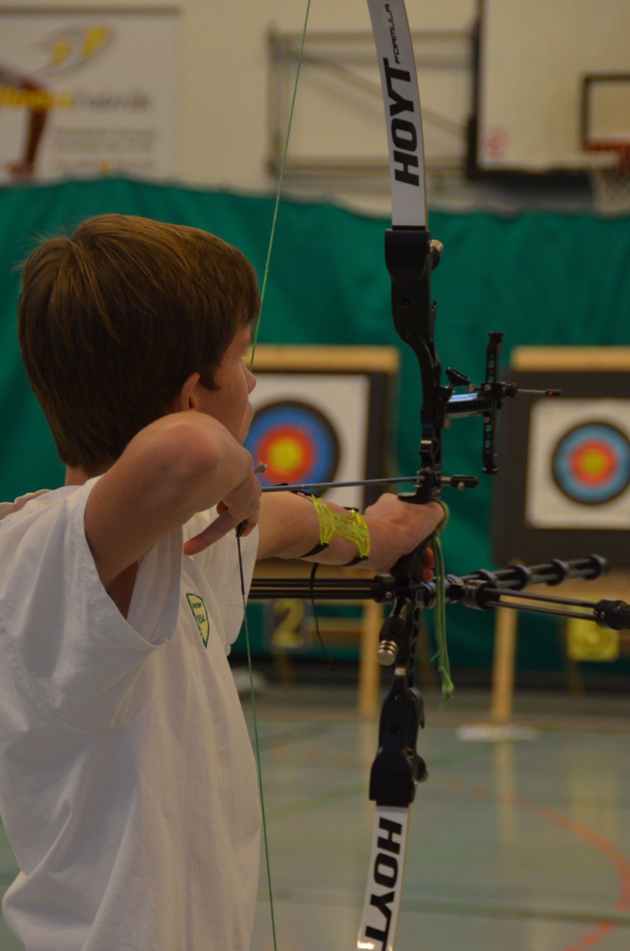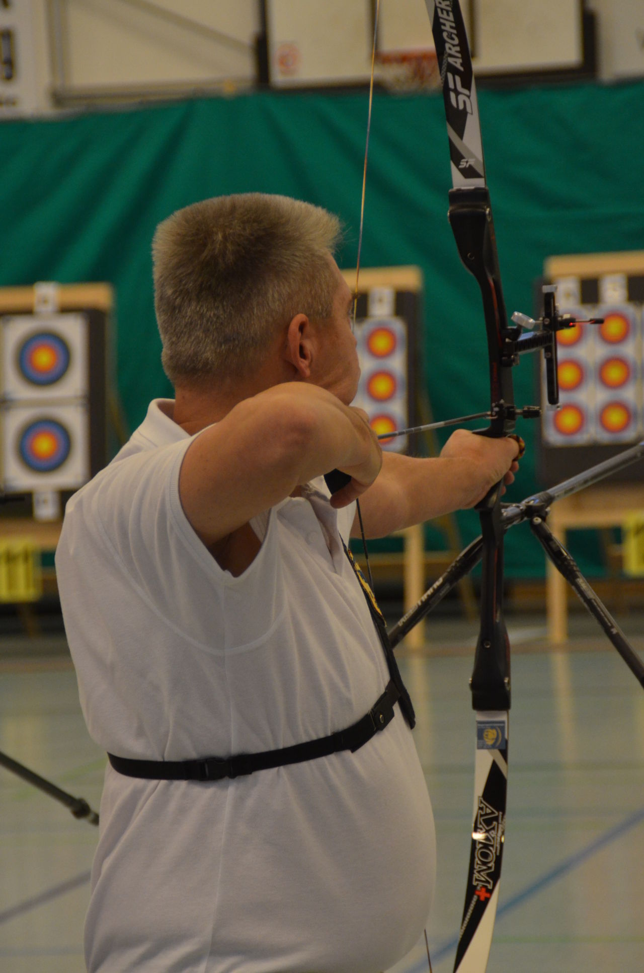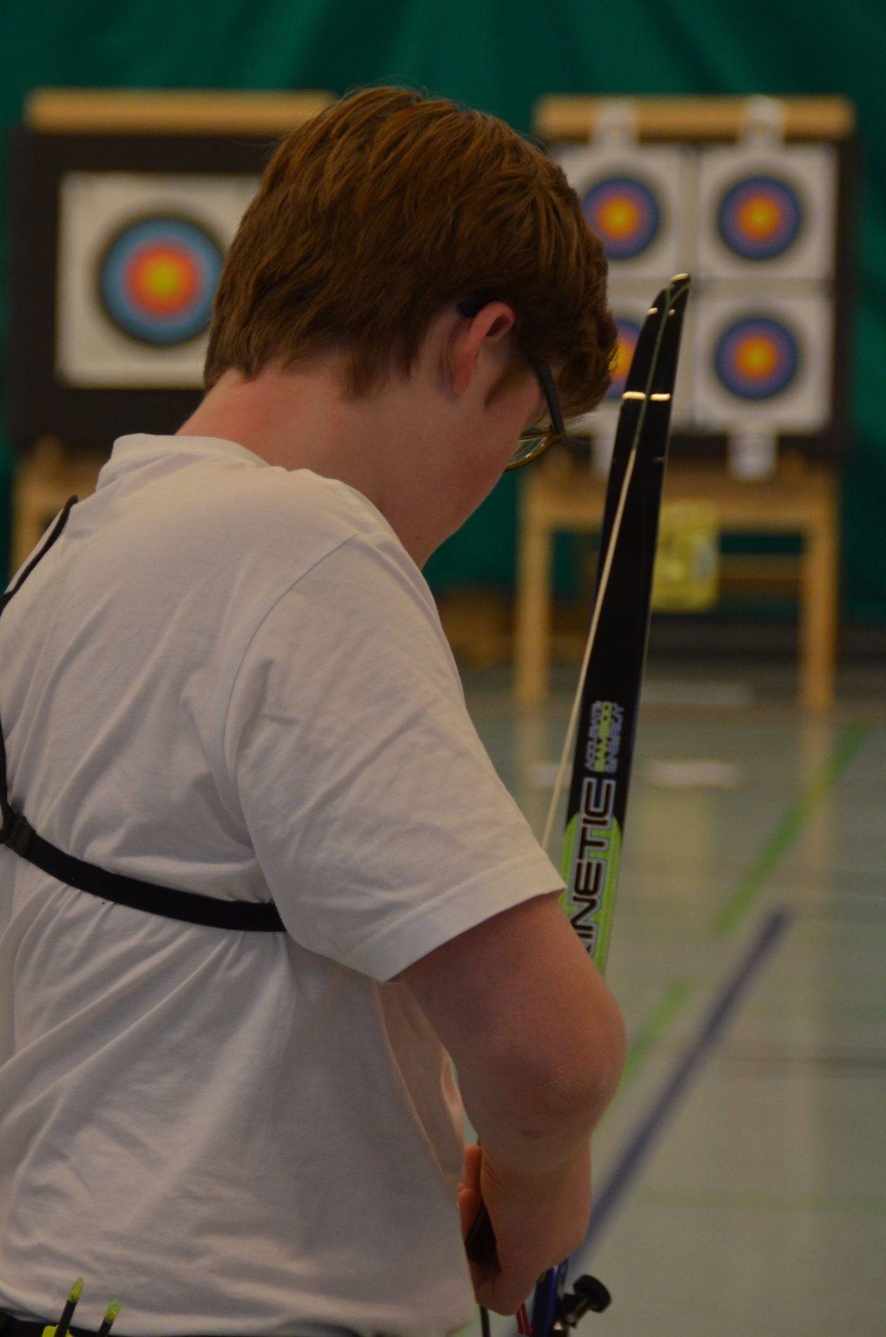 | Am Samstag wurde dann mit inzwischen viel Erfahrung der Aufbau der Scheiben und des Fangnetzes, das Markieren der Schießlinie usw. vorgenommen, nachdem das Material von der Trainingshalle und der Vereinshütte zur Sporthalle der KGST gebracht war. |