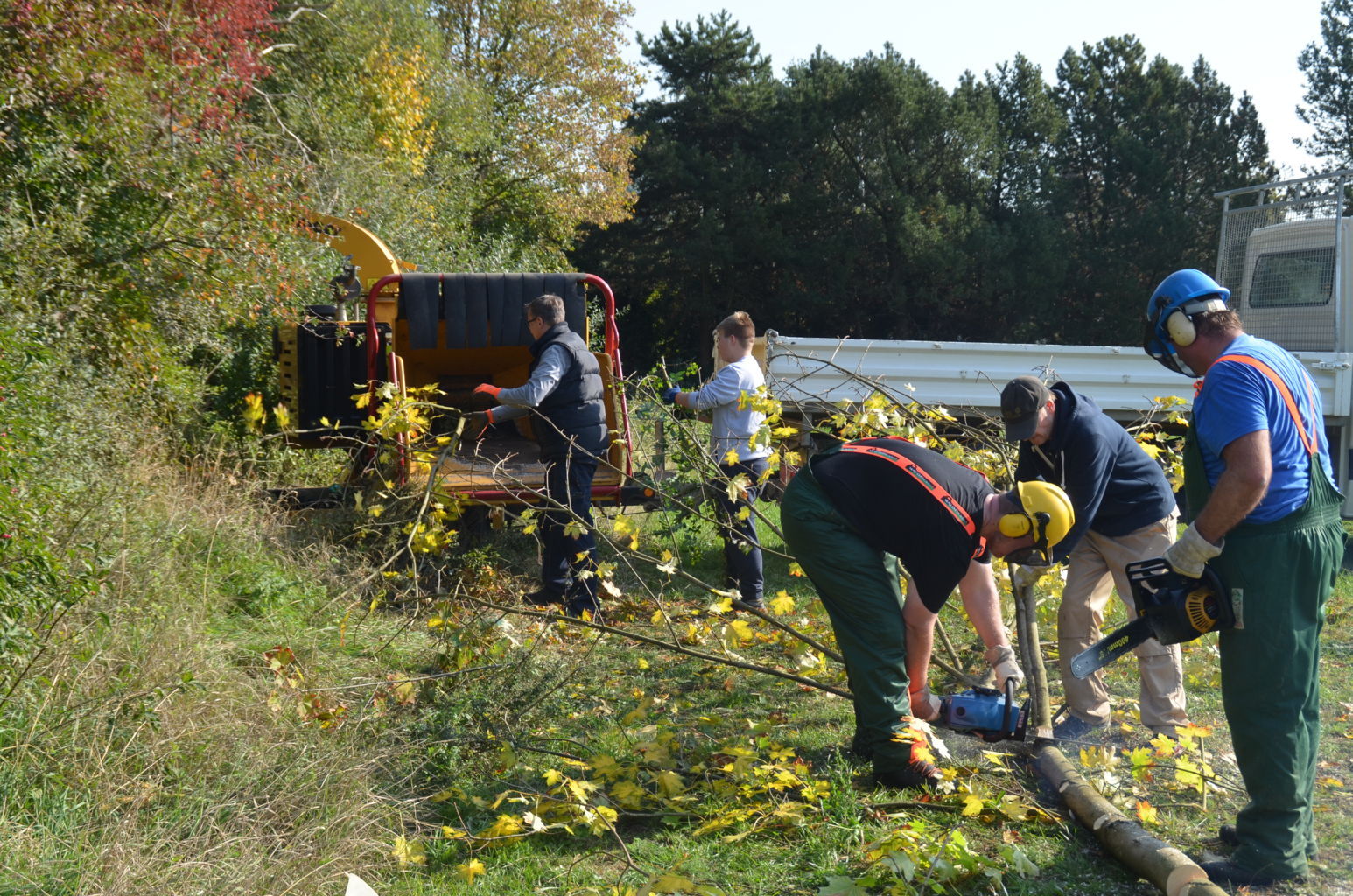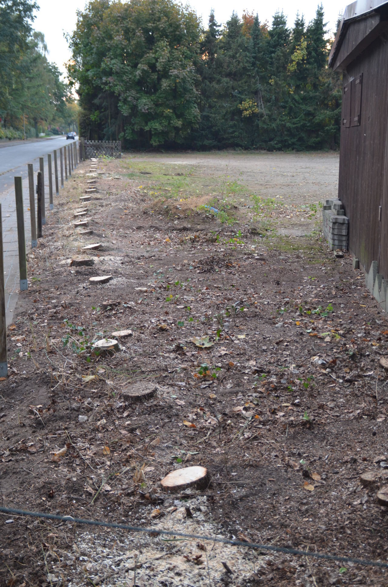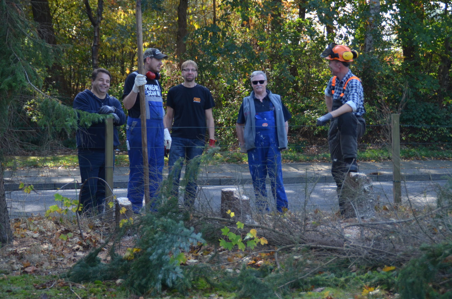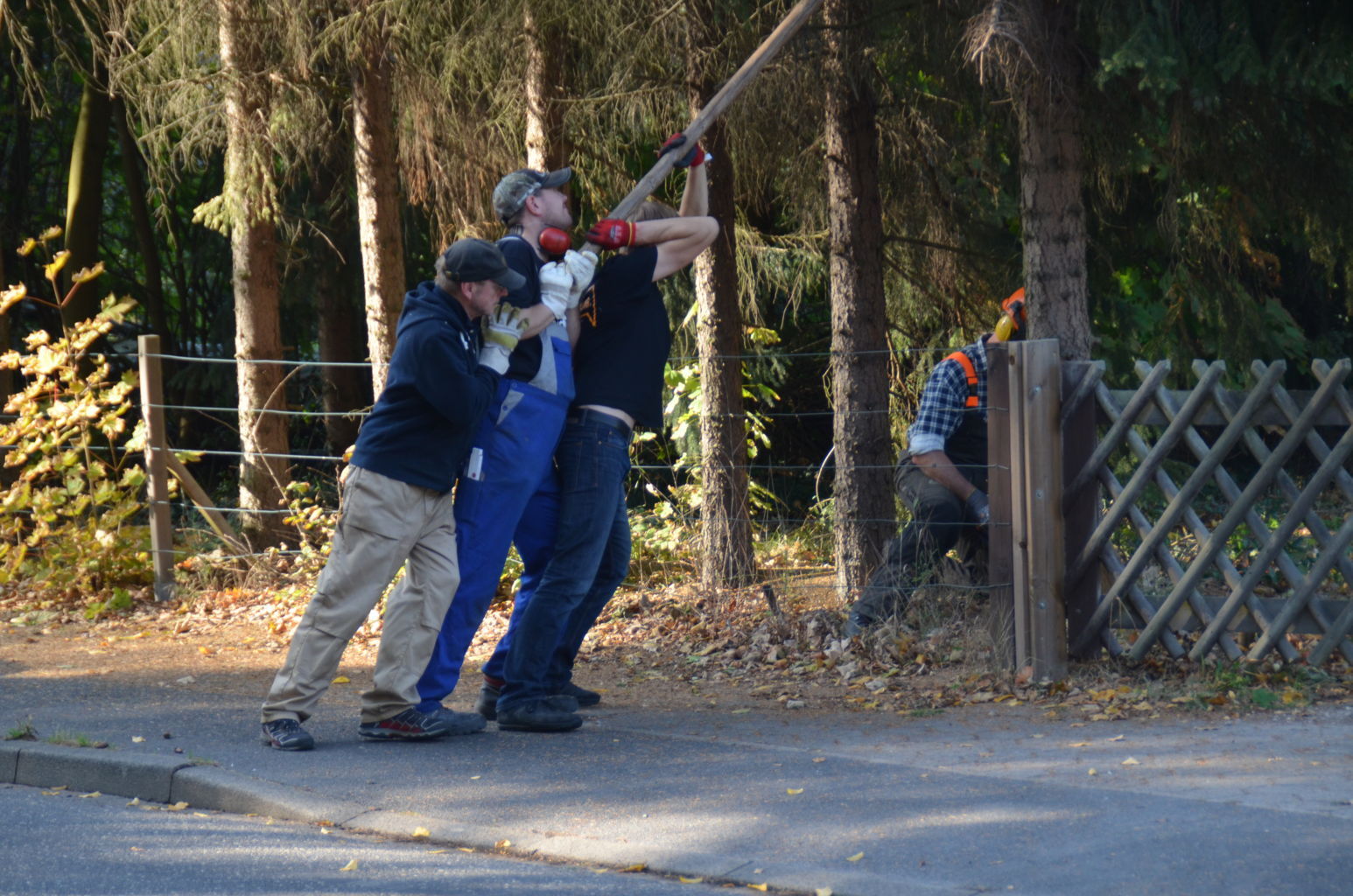 | Diesmal gab es neben dem Wegräumen der Scheiben etc. aber noch einiges mehr an Arbeit: alle Bäume an der Straßenseite sollten gefällt werden. Viktor ließ gekonnt alle Bäume in die richtige Richtung auf den Parkplatz fallen. Mit schwerem Gerät (ein Lamborghini) schaffte Bernd die Stämme samt Äste zum Ende des Platzes, wo sie entastet und geschreddert wurden. 41 Bäume straßenseitig und vier abgestorbene Bäume seitlich des Parkplatzes wurden so entfernt. Nun sind noch die Stumpen zu entfernen, damit Ende Oktober die Neuanpflanzung einer Hecke erfolgen kann. (OLu) |