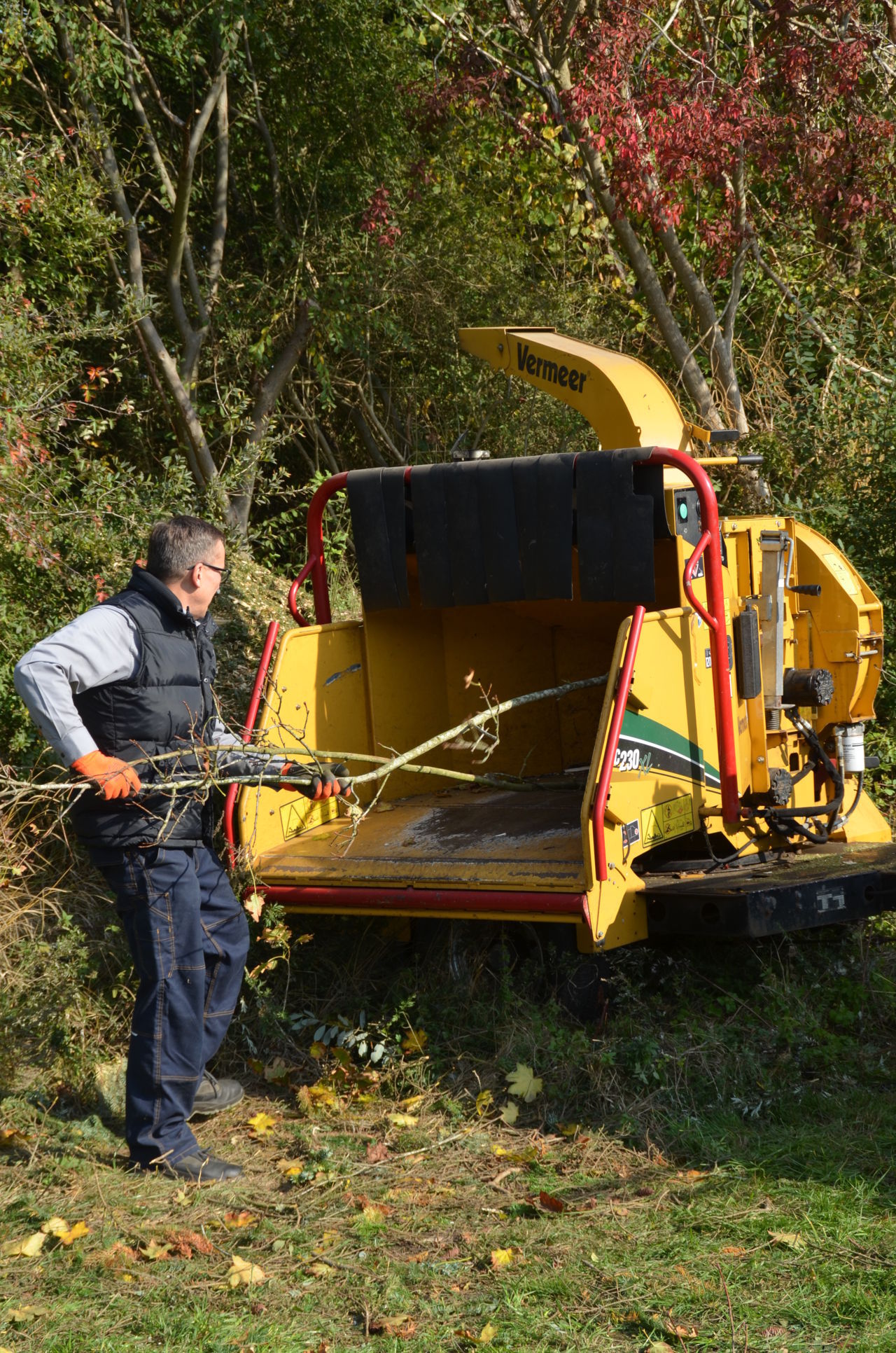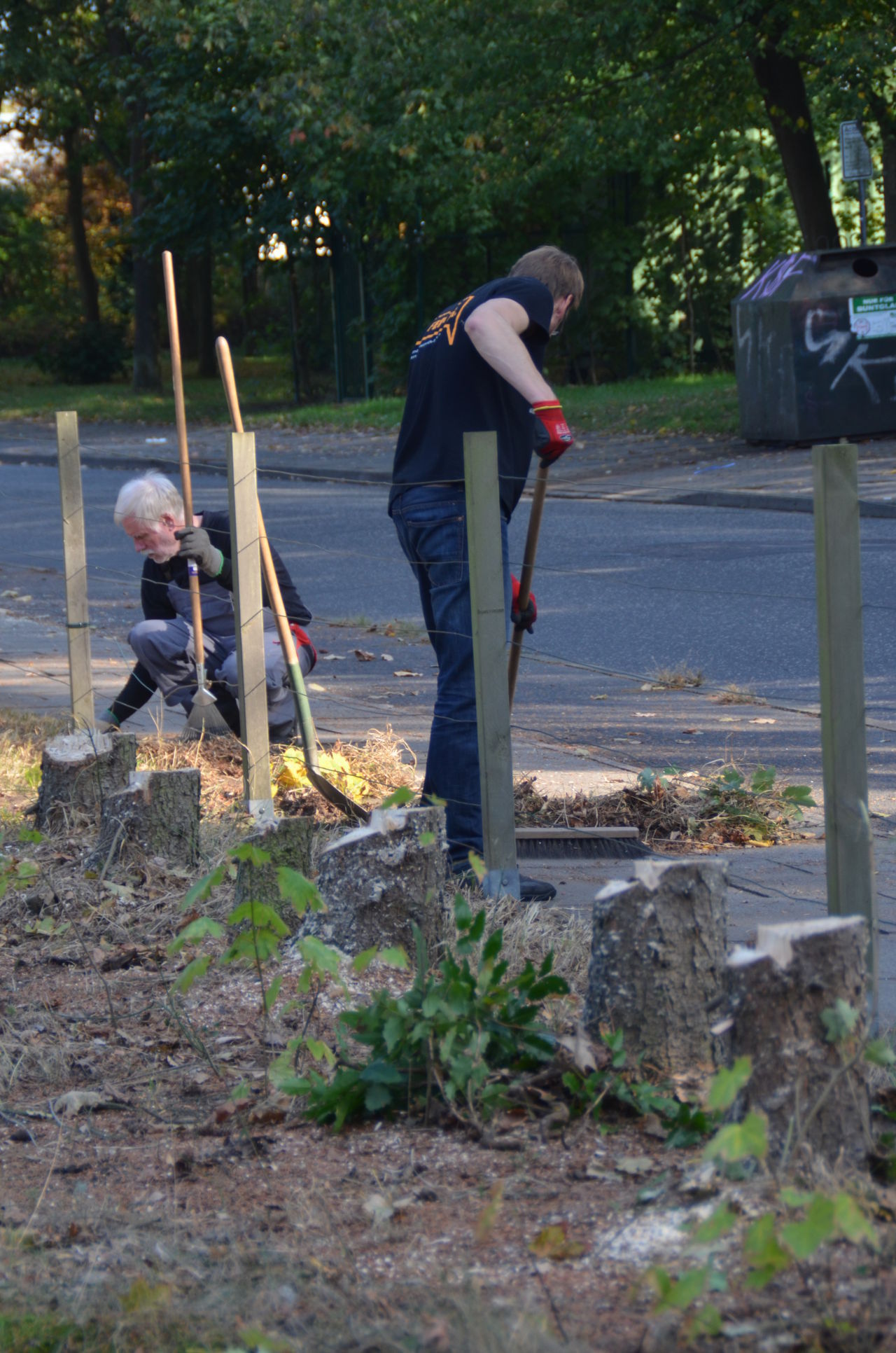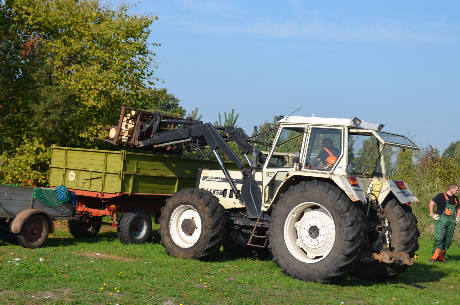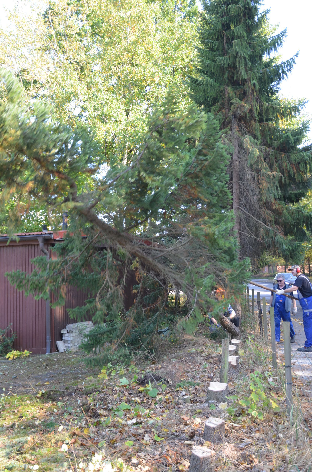 | Diesmal gab es neben dem Wegräumen der Scheiben etc. aber noch einiges mehr an Arbeit: alle Bäume an der Straßenseite sollten gefällt werden. Viktor ließ gekonnt alle Bäume in die richtige Richtung auf den Parkplatz fallen. Mit schwerem Gerät (ein Lamborghini) schaffte Bernd die Stämme samt Äste zum Ende des Platzes, wo sie entastet und geschreddert wurden. 41 Bäume straßenseitig und vier abgestorbene Bäume seitlich des Parkplatzes wurden so entfernt. Nun sind noch die Stumpen zu entfernen, damit Ende Oktober die Neuanpflanzung einer Hecke erfolgen kann. (OLu) |
