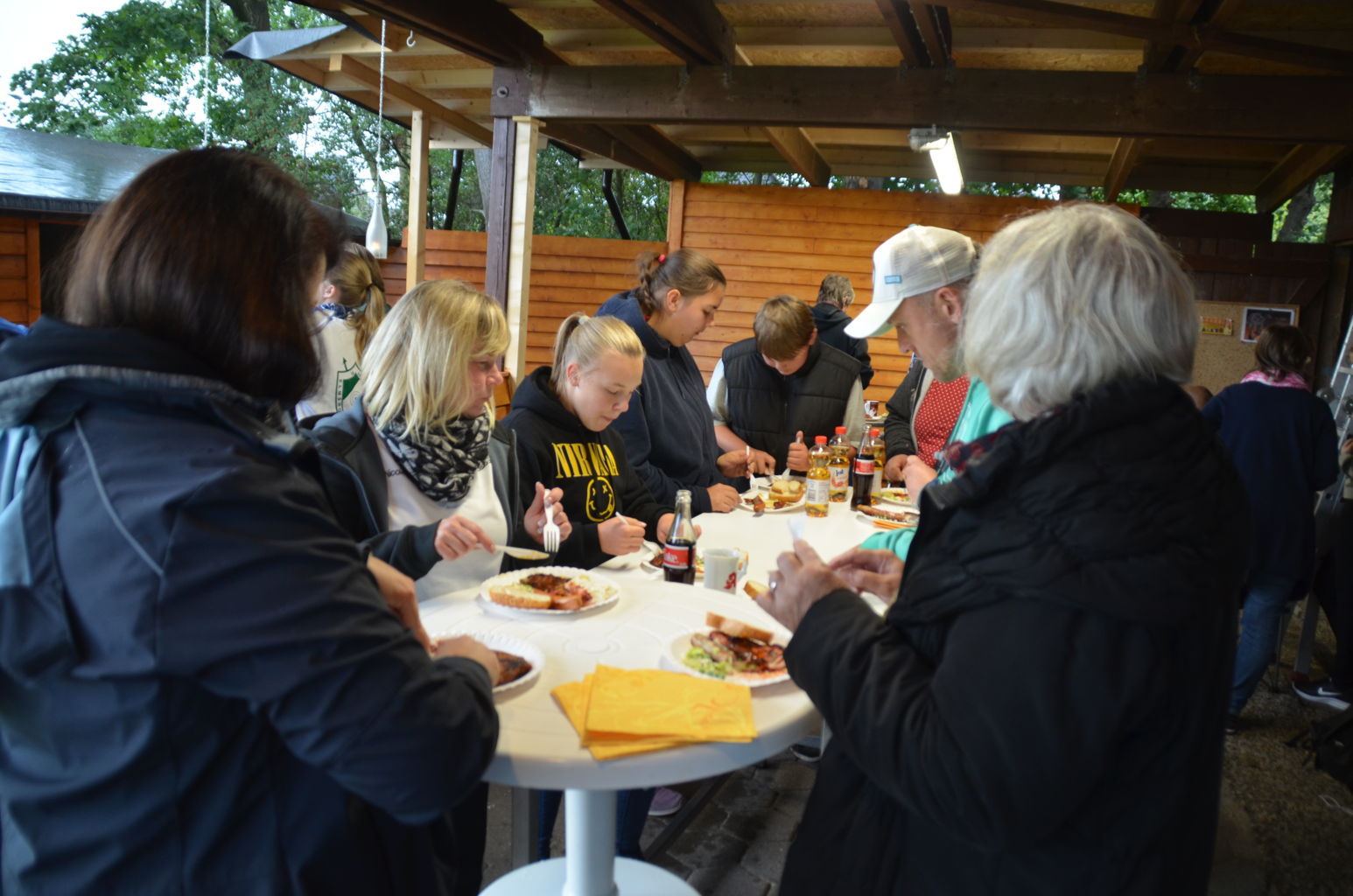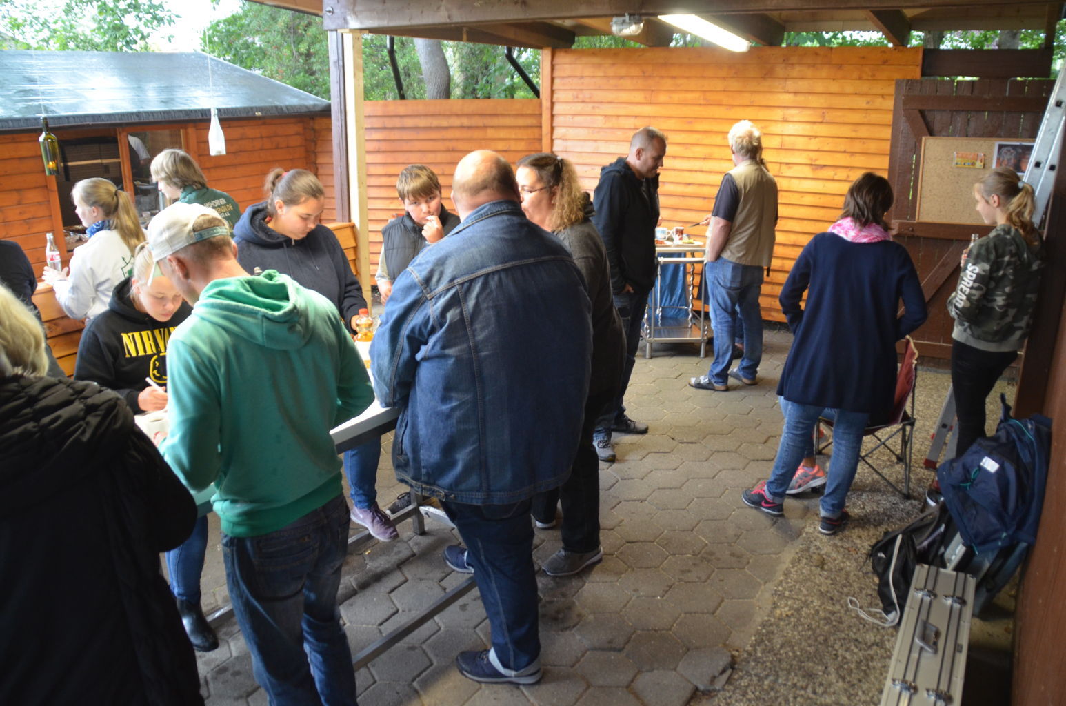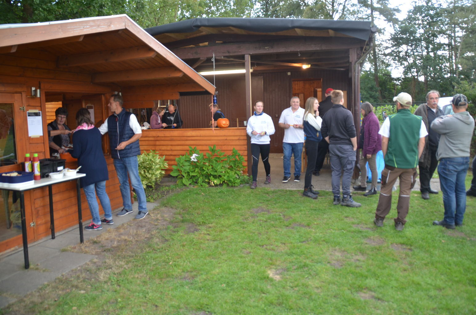 | Ganz blieben wir aber vom Regen nicht verschont. Zum Grillen verzogen sich dann alle Schützen und Besucher unter die schützenden Dächer von Pavillions oder der Vereinshütte. |