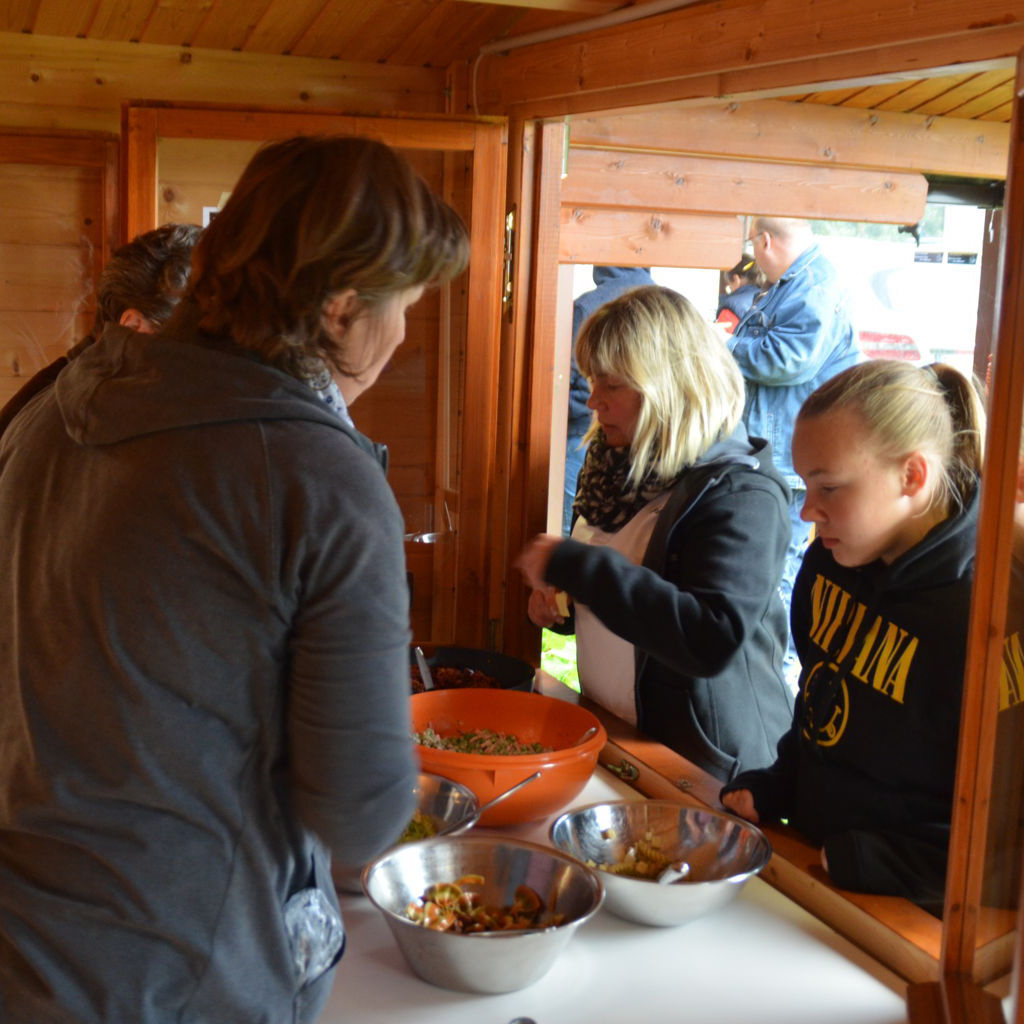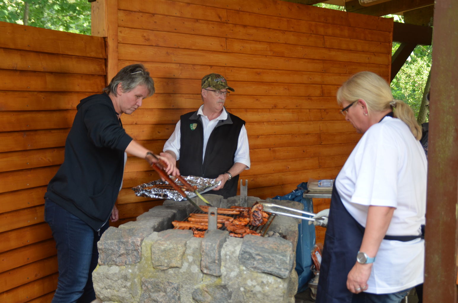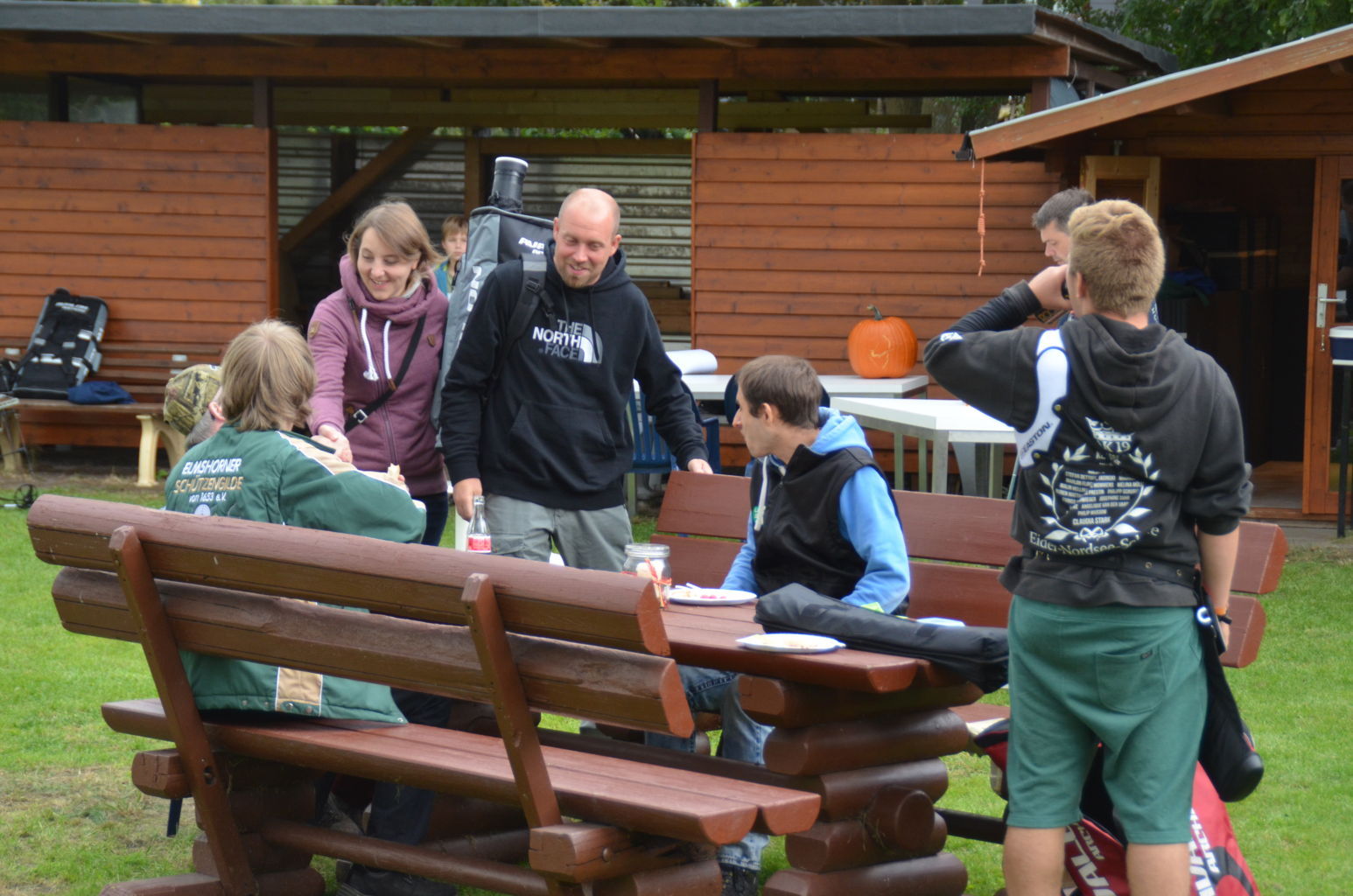 | Ganz blieben wir aber vom Regen nicht verschont. Zum Grillen verzogen sich dann alle Schützen und Besucher unter die schützenden Dächer von Pavillions oder der Vereinshütte. |