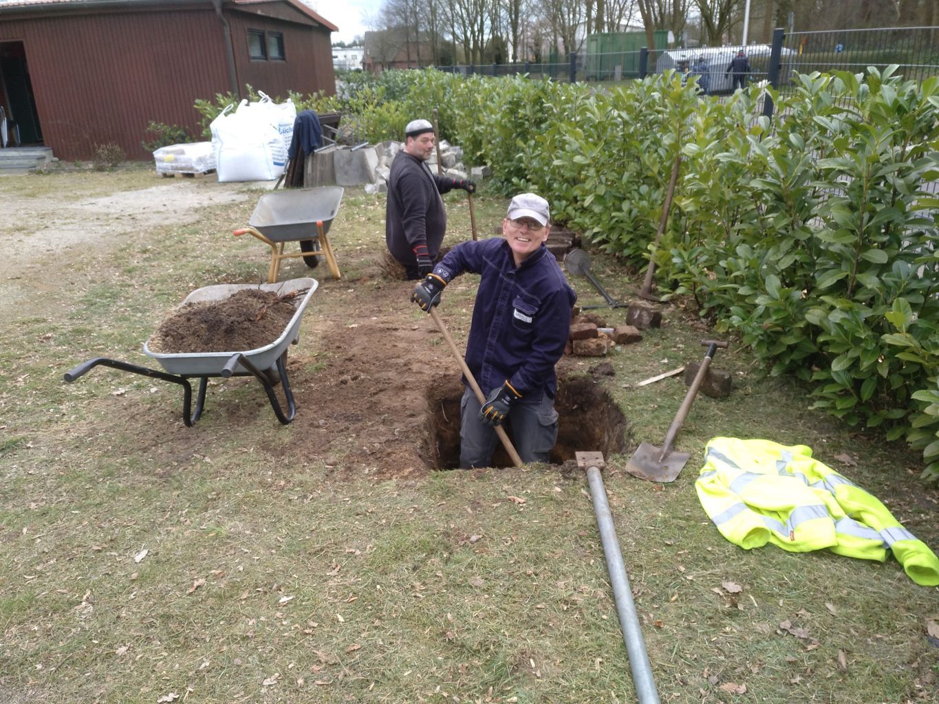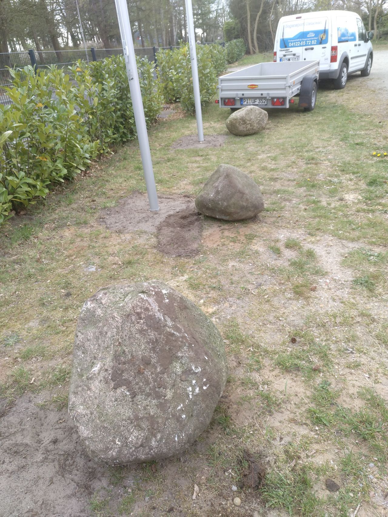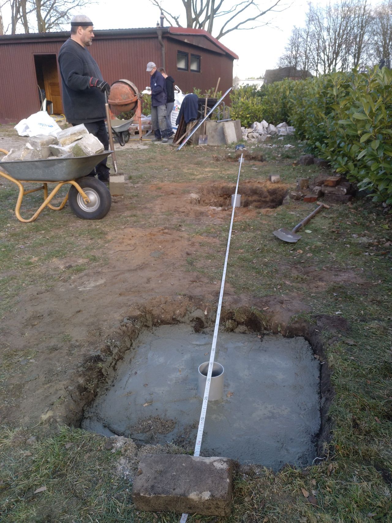 Drei Fahnenmaste an der Straßenfront sollen das Erscheinungsbild des Vereins bei Veranstaltungen hervorheben. Mit 1,7 m³ Beton sollte die Sturmsicherheit der 8 m hohen Masten hergestellt werden. Wir benötigten weniger Beton, galt es doch den Abbruch des alten Grills mit in die Masse einzuarbeiten.